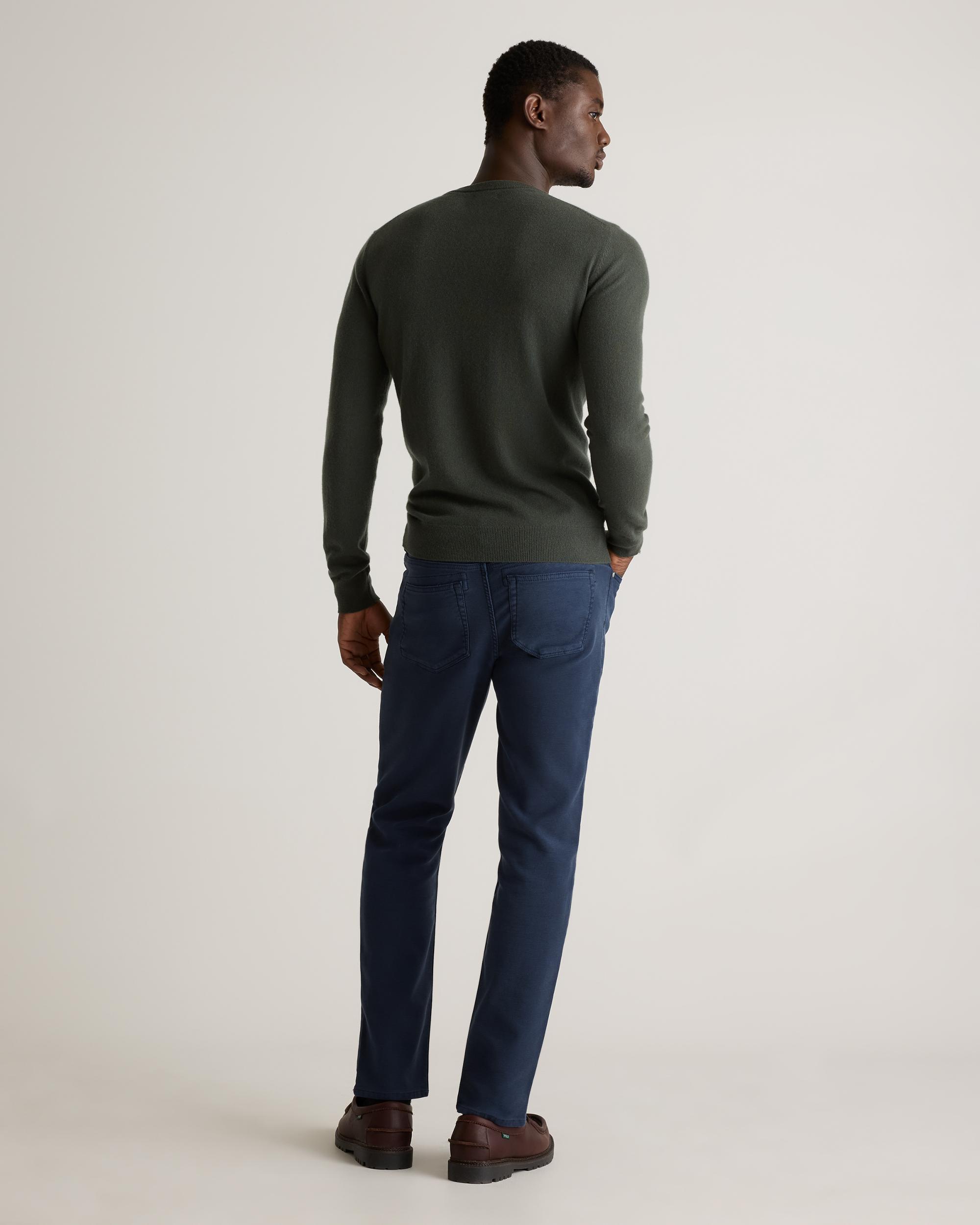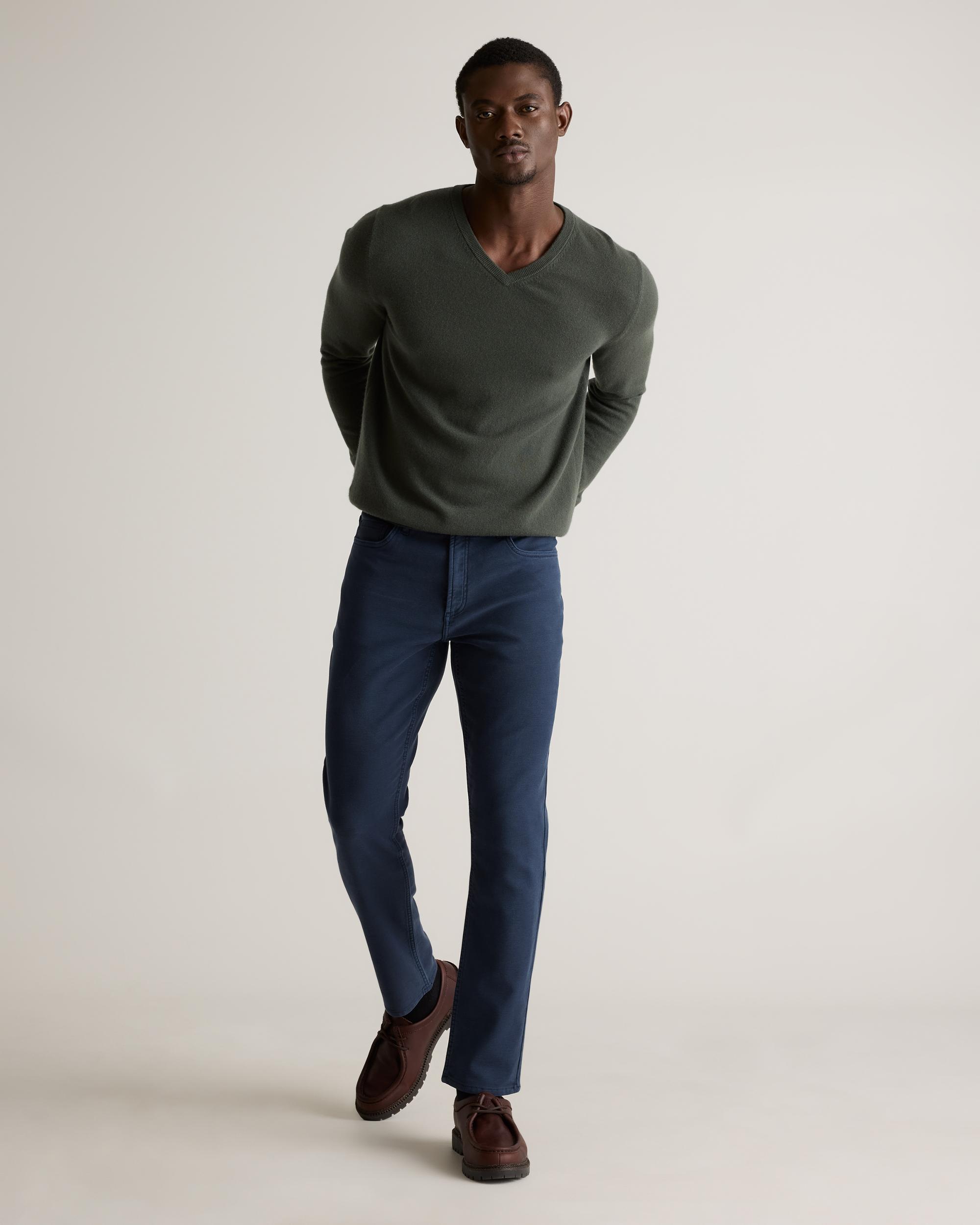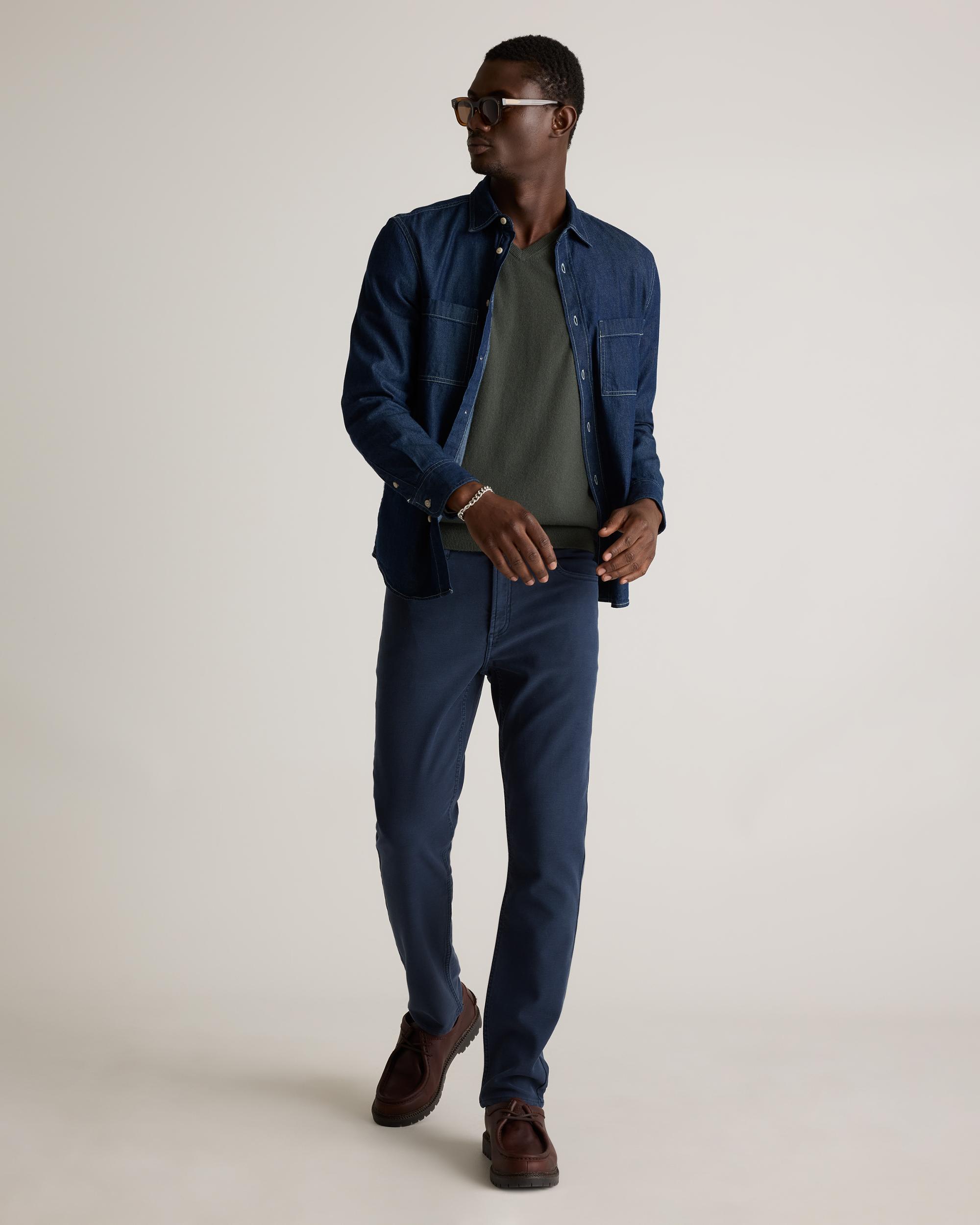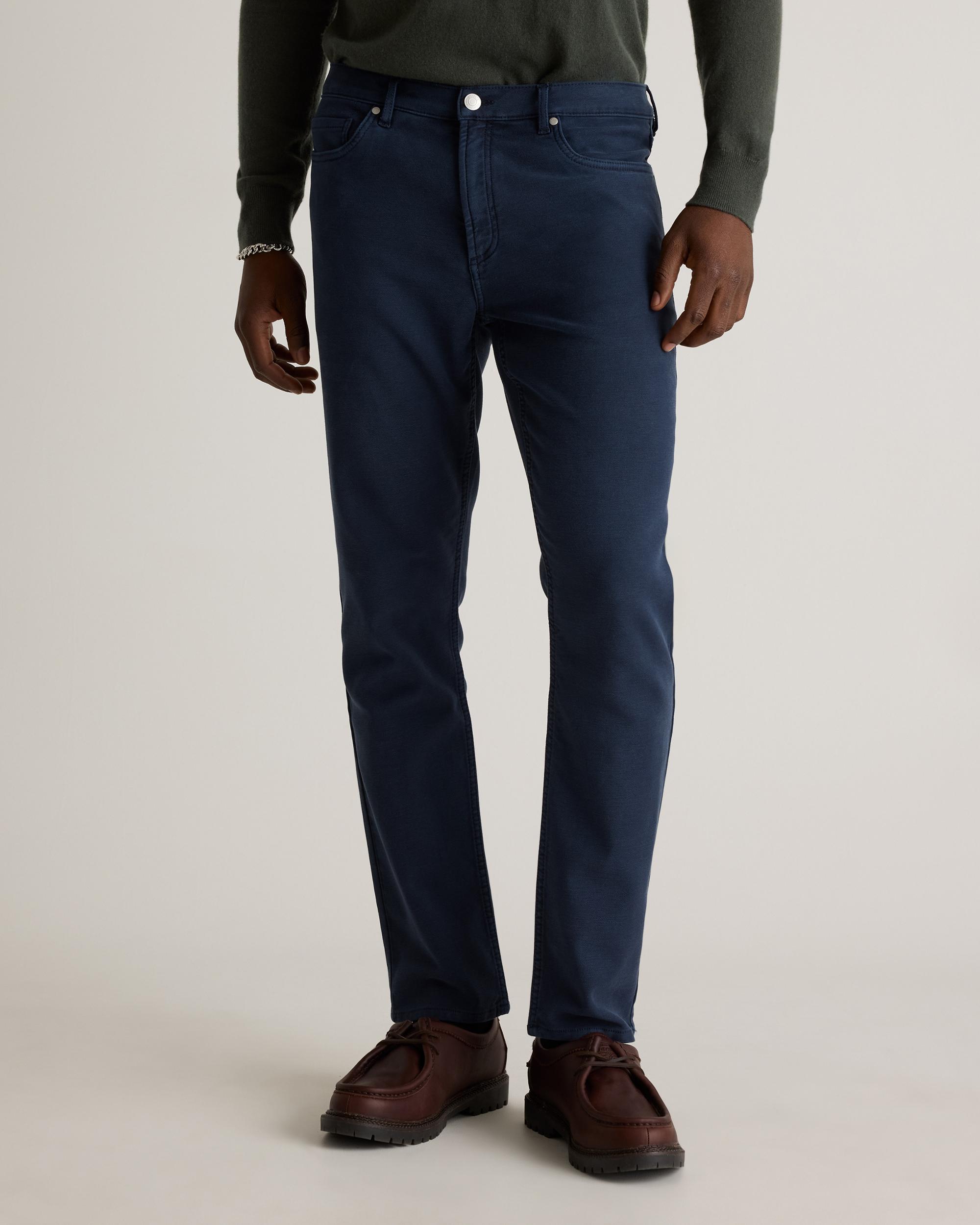 Built for versatility, our French Terry 5-Pocket Pants combine rugged durability with all-day comfort, delivering a straight-fit silhouette that balances modern style with dependable wearability. The classic 5-pocket design enhances functionality, while the stretch knit construction offers effortless movement. Garment-dyed for an authentic denim look with the comfort of a sweatpants, these pants are a go-to for a refined yet laid-back style perfect for workdays and weekends alike. | Quince | Men's French Terry 5-Pocket Pants in Deep Navy, Size 30X30, Organic Cotton
