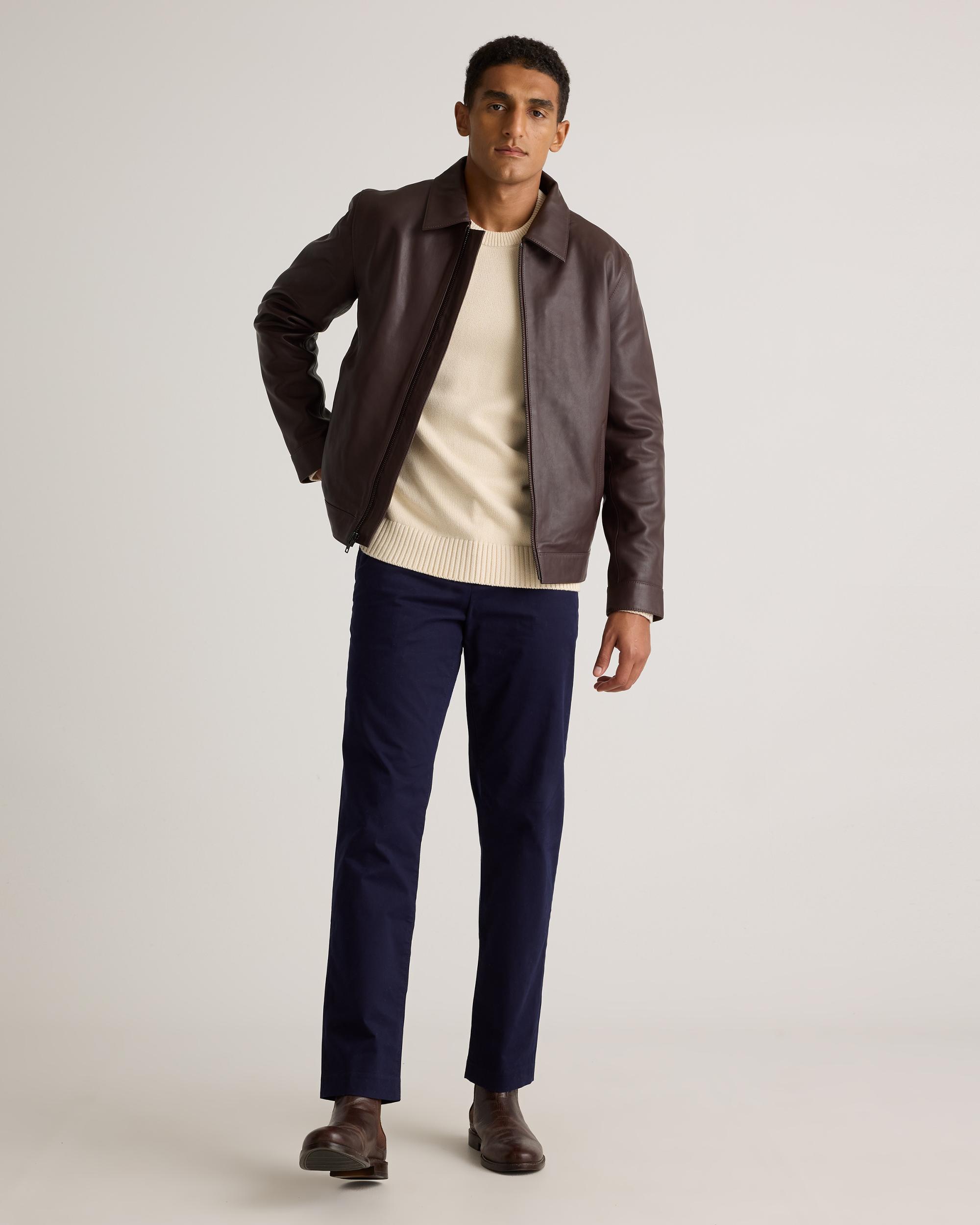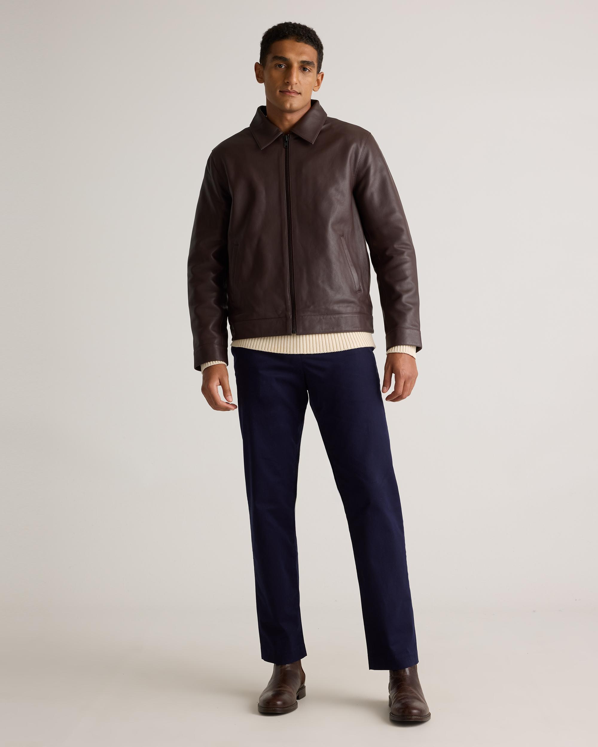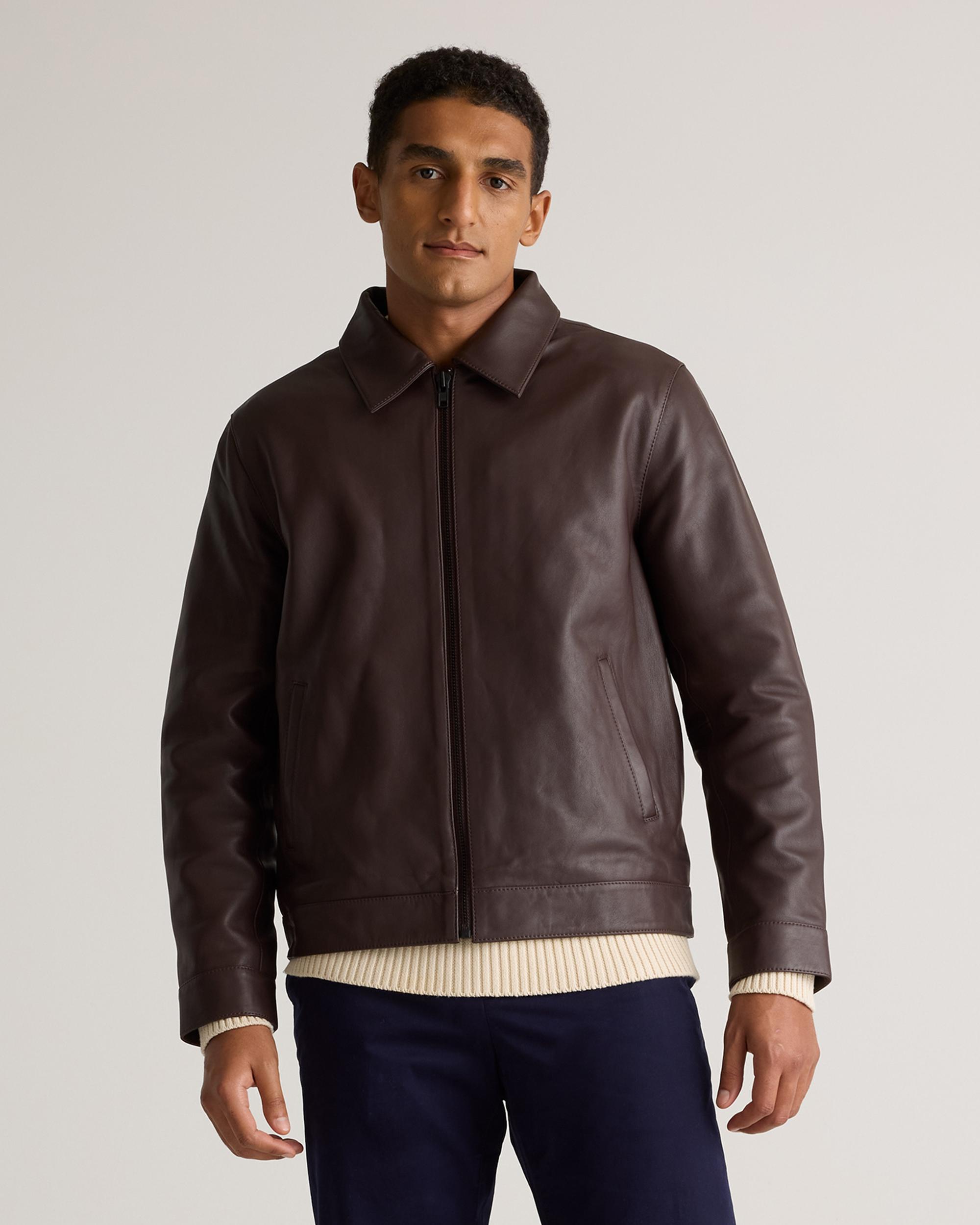 Prefer your style straightforward? Check out our 100% Leather Harrington Jacket, a sleek layer with a classic point collar and matte black zipper for the most effortlessly cool look. It's a timeless investment piece—minus the investment. Read more about what makes our leather special in our Leather 101 guide. | Quince | Men's Harrington Jacket in Brown, Size XXL, Leather
