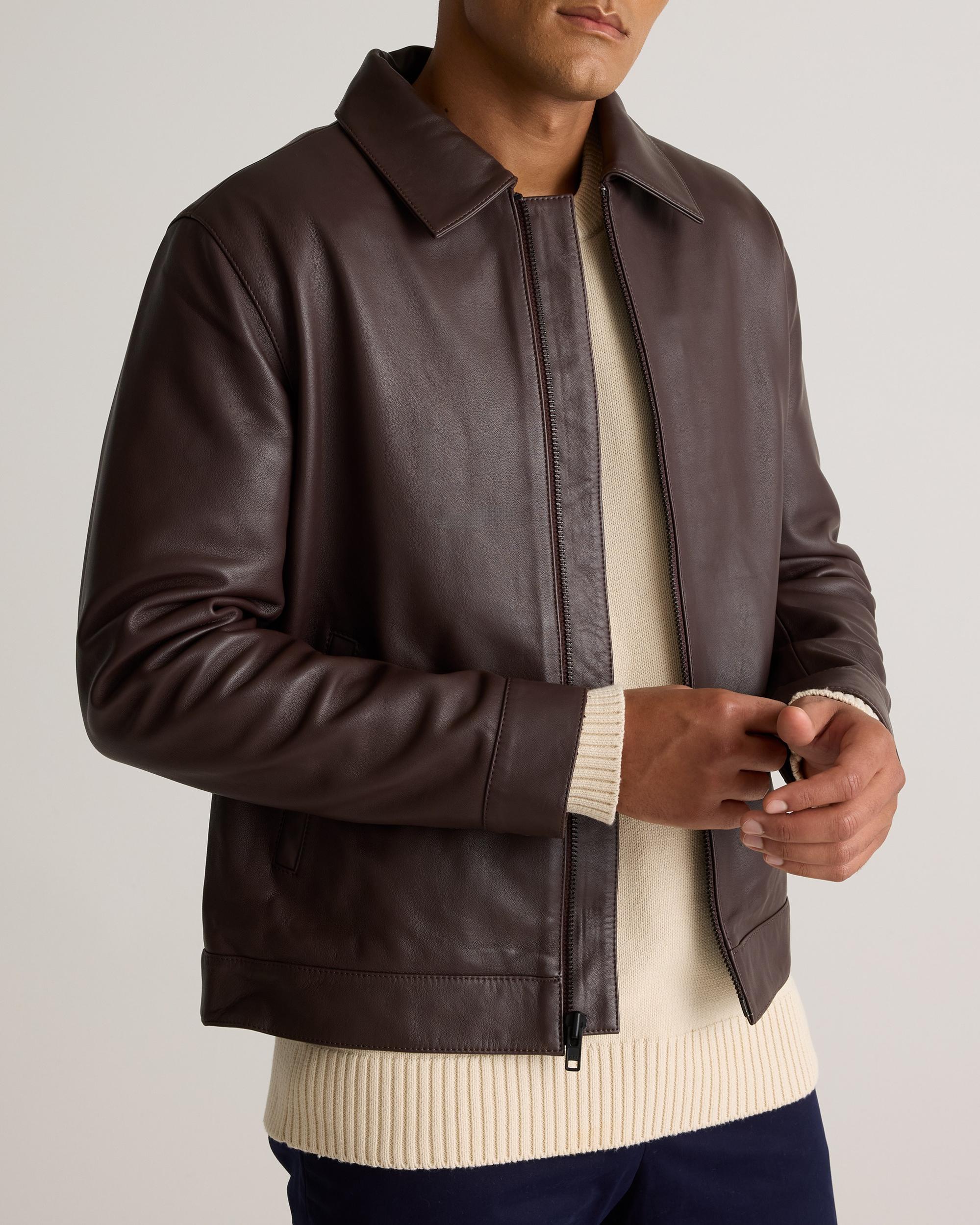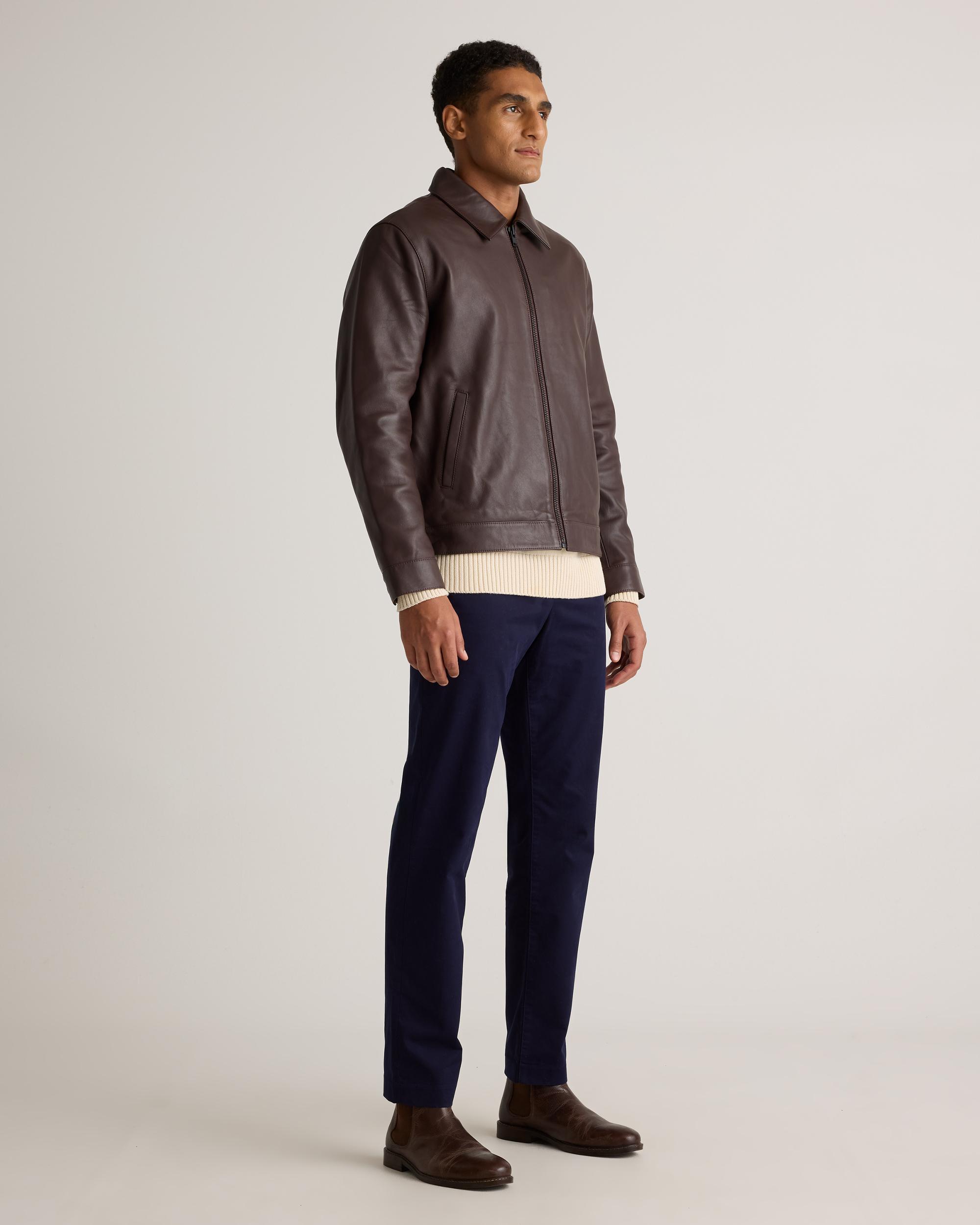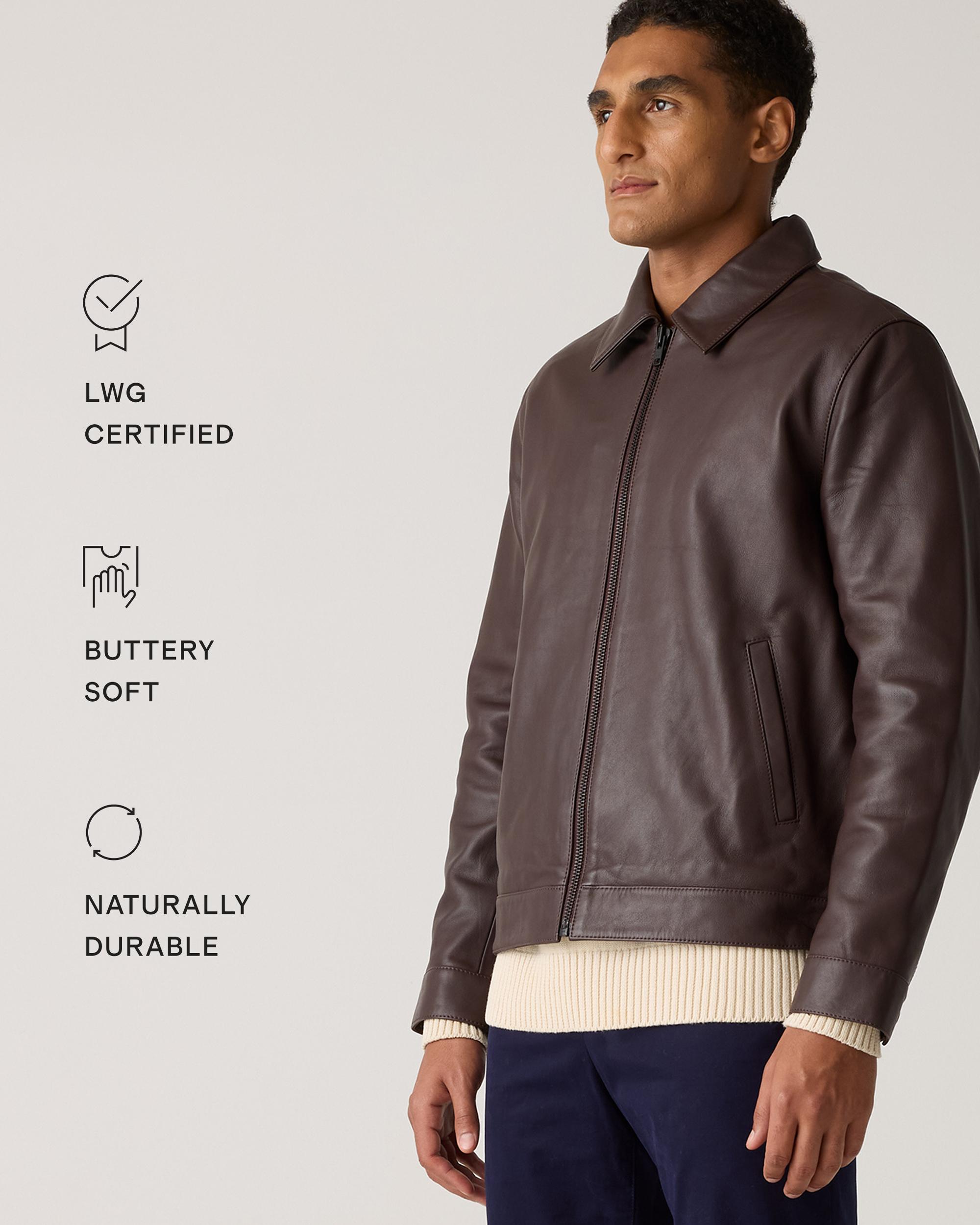 Prefer your style straightforward? Check out our 100% Leather Harrington Jacket, a sleek layer with a classic point collar and matte black zipper for the most effortlessly cool look. It's a timeless investment piece—minus the investment. Read more about what makes our leather special in our Leather 101 guide. | Quince | Men's Harrington Jacket in Brown, Size XXL, Leather