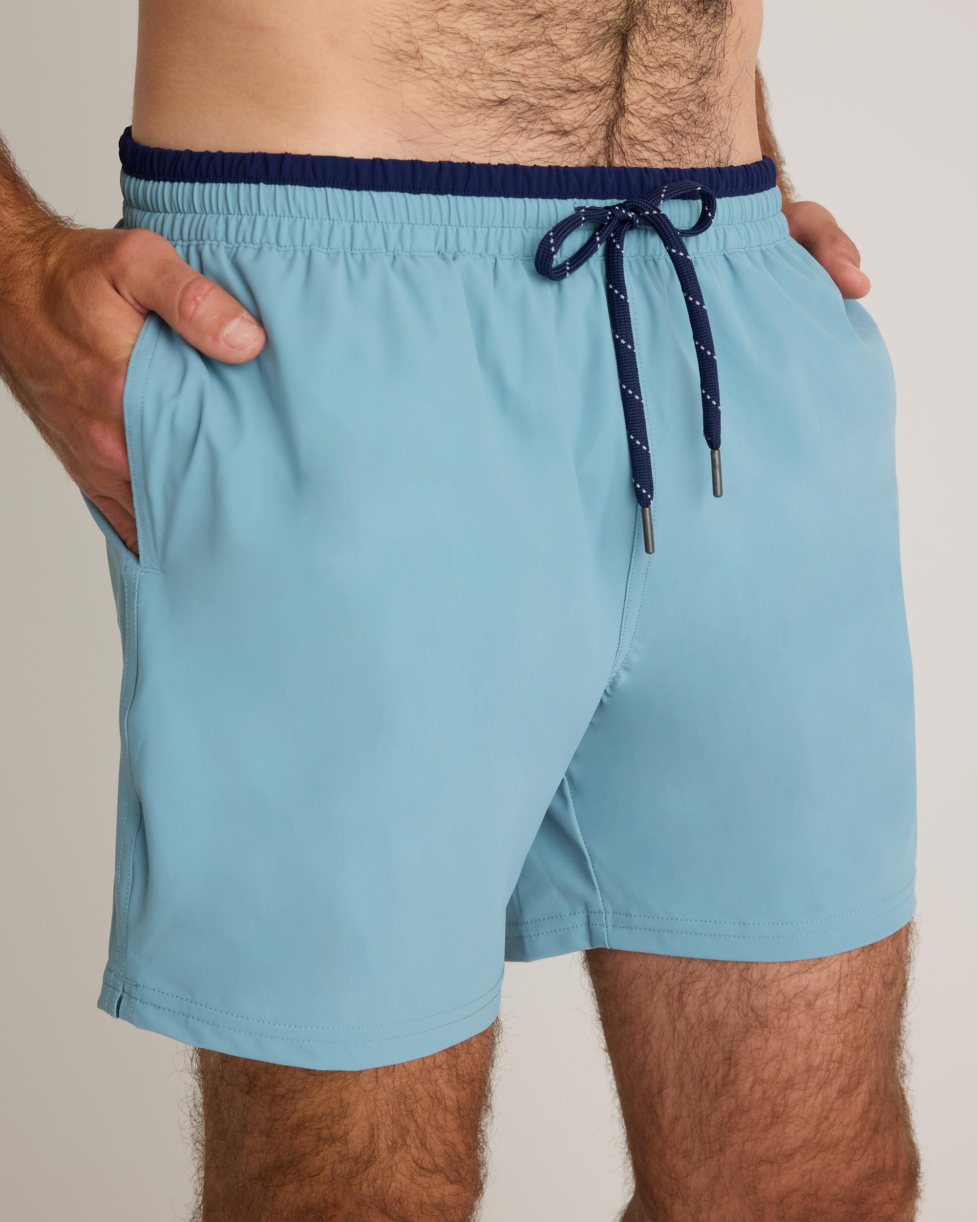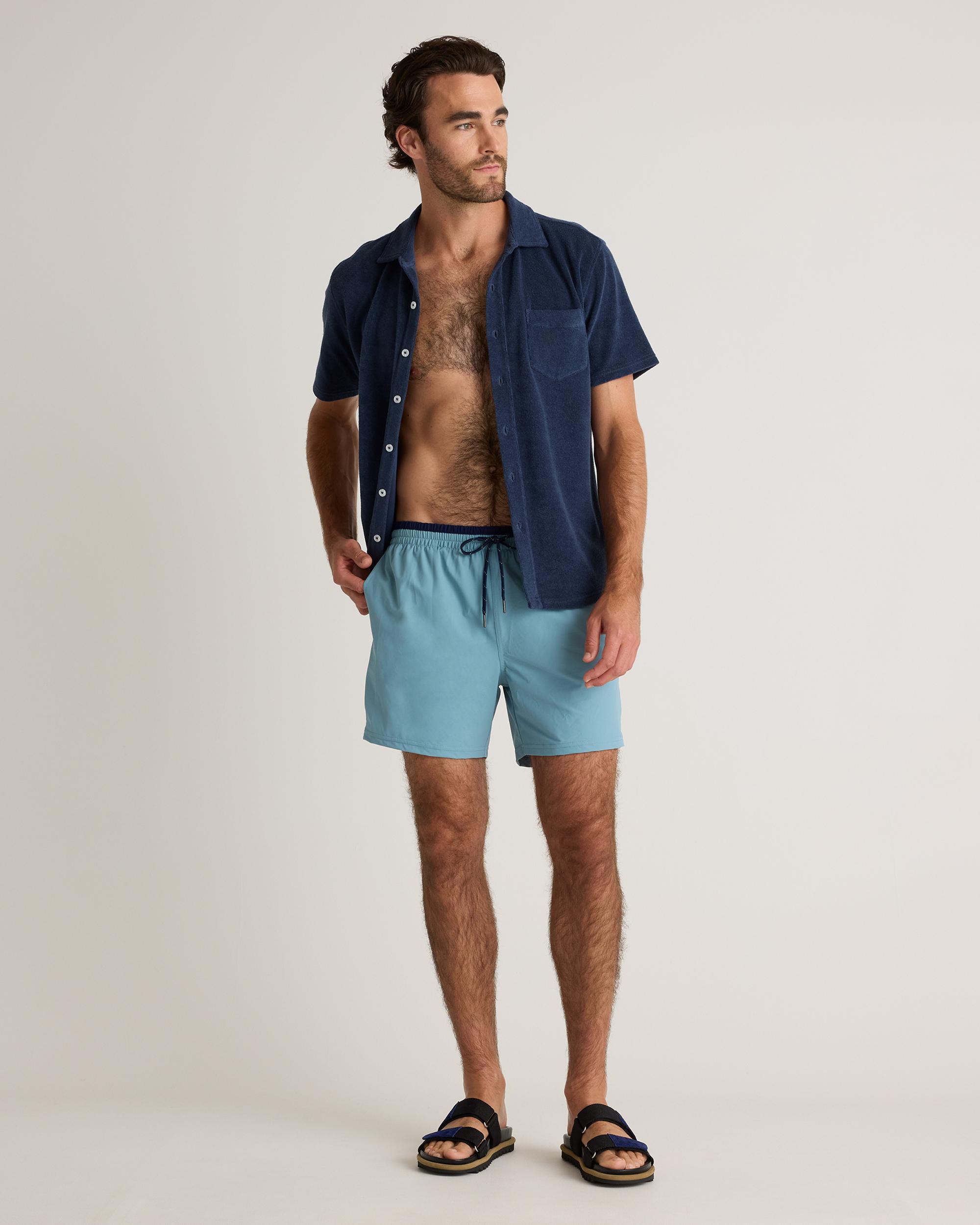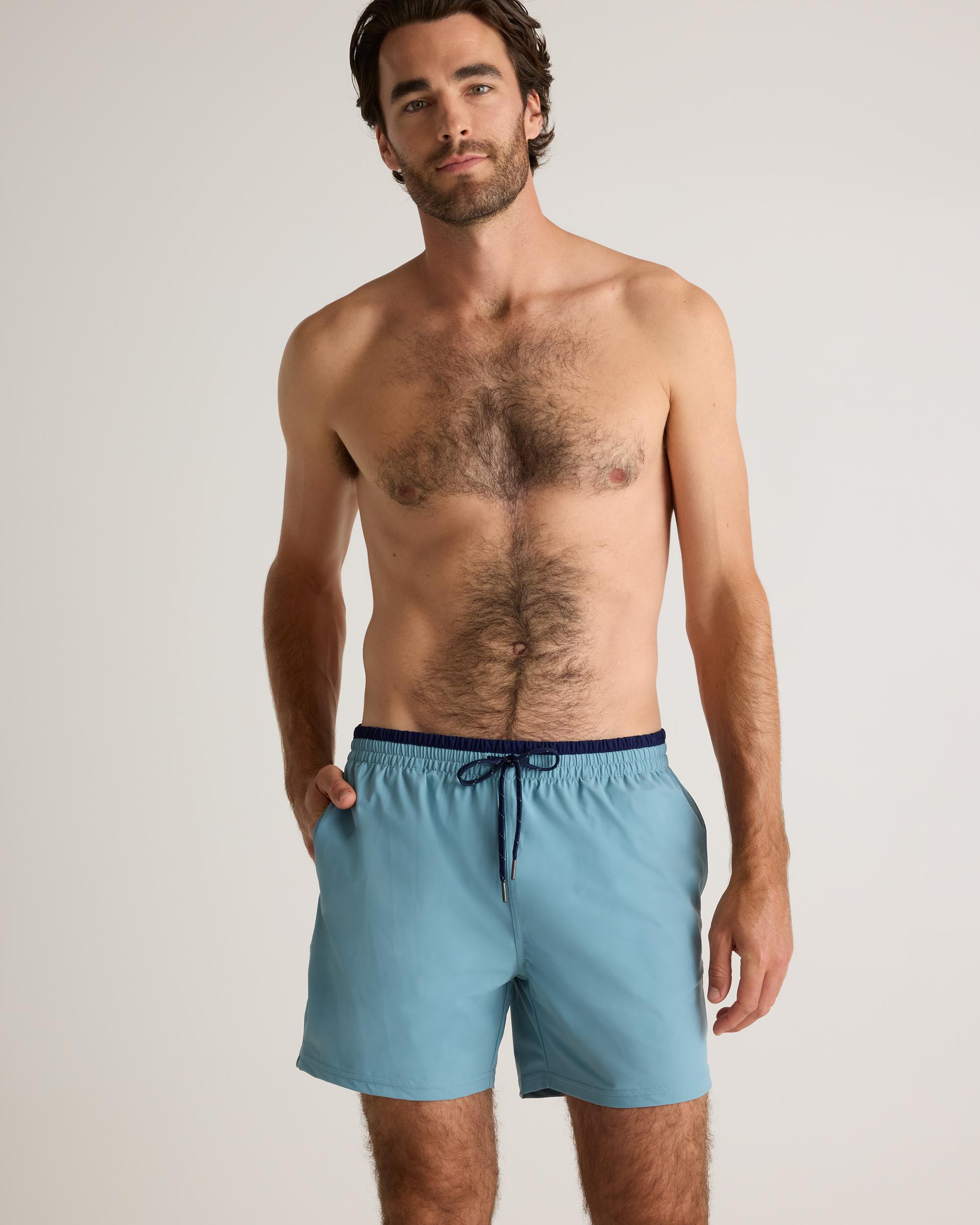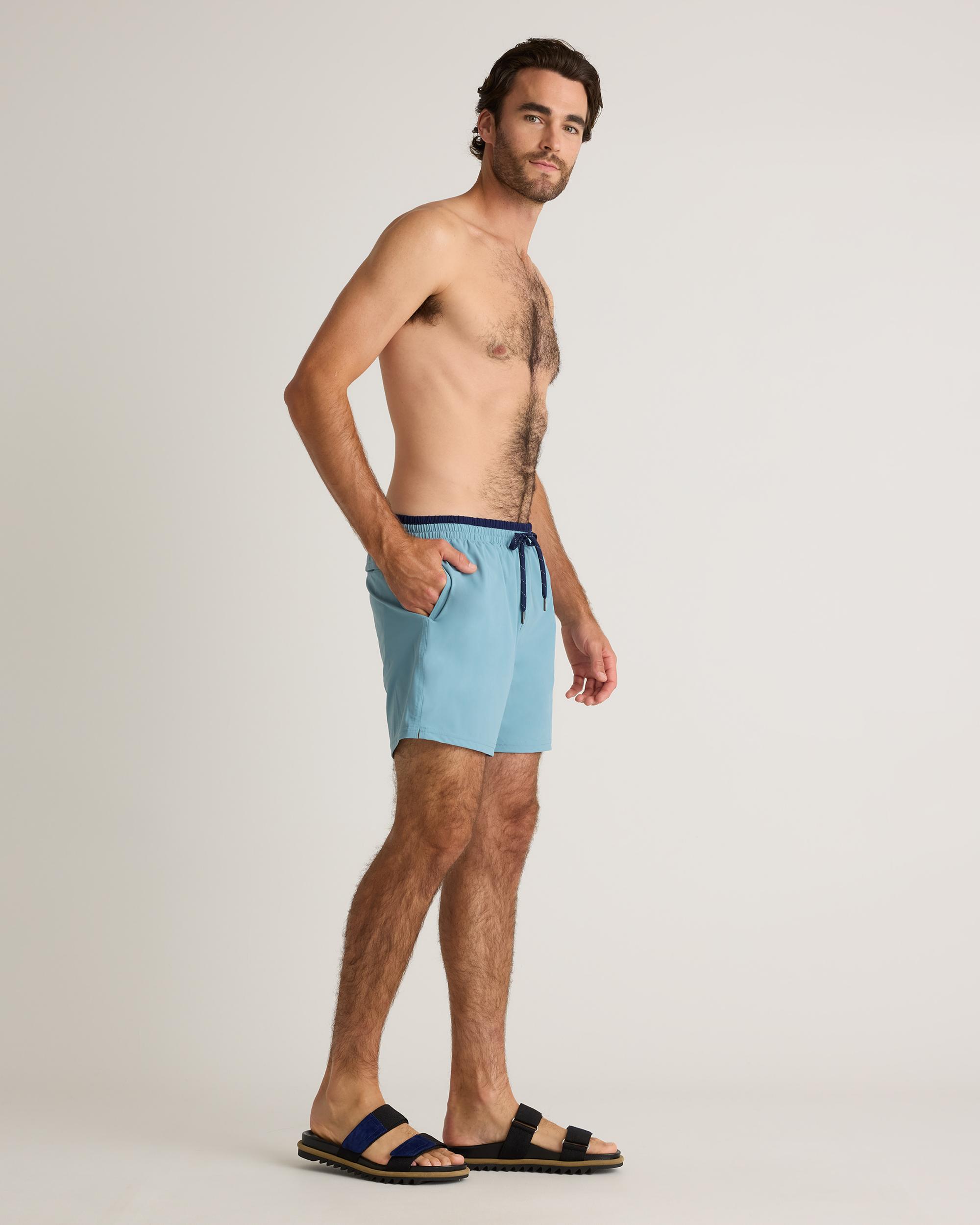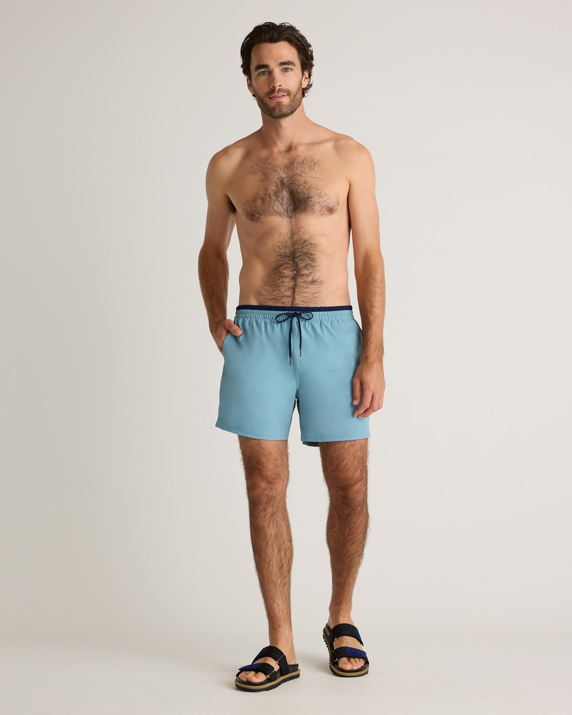 Our Italian Swim Trunk is the ultimate summer essential for the active man. Made from quick-drying, sun screen and oil resistant material, this swim trunk offers UPF50 protection for all-day wear. The Italian fabrication ensures durability, resisting fading, pilling, and snagging for long-lasting use. Whether you're hitting the beach, pool, or backyard BBQ, this brief-lined swim trunk will keep you looking and feeling your best. | Quince | Men's Italian Swim Trunk in Lake Blue/Deep Navy, Size Small, Nylon/Spandex