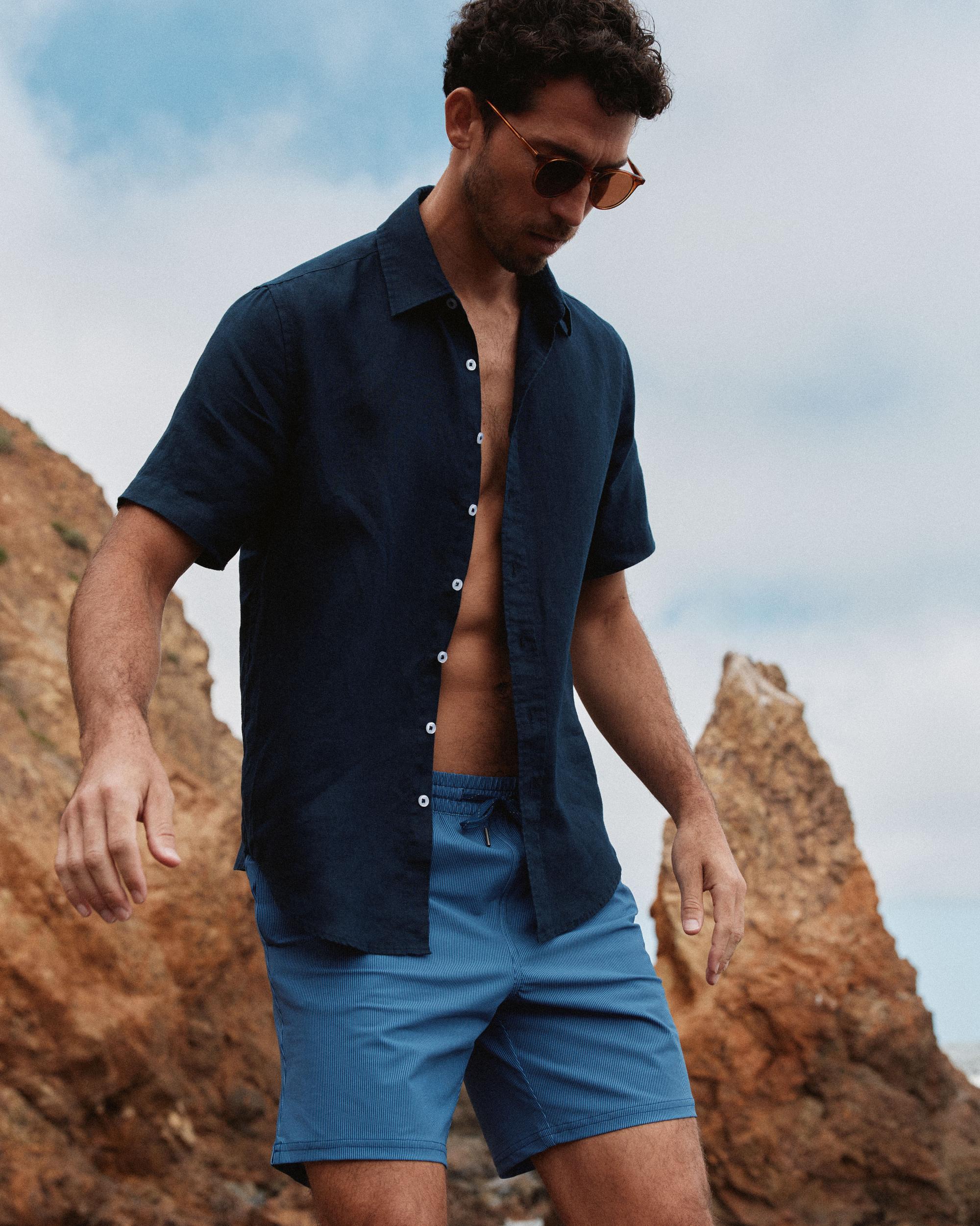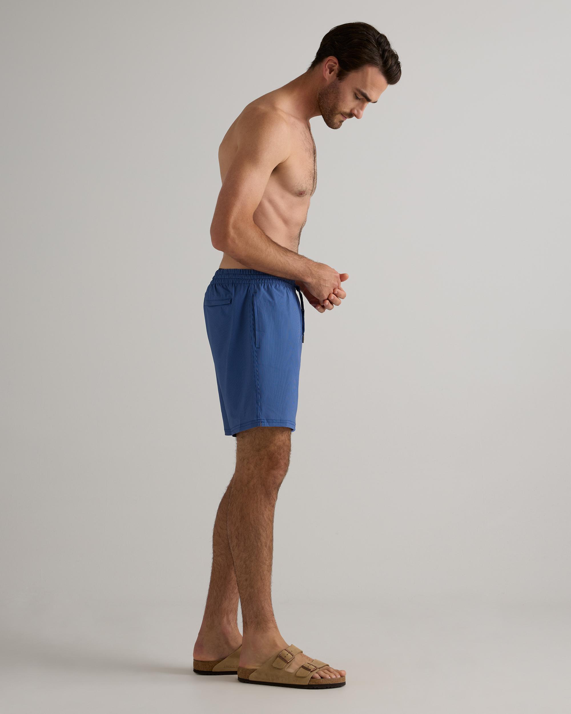 The Italian Swim Trunk is the ultimate summer essential for the active man. Made from quick-drying, sun screen and oil resistant material, this swim trunk offers UPF50 protection for all-day wear. The Italian fabrication ensures durability, resisting fading, pilling, and snagging for long-lasting use. Whether you're hitting the beach, pool, or backyard BBQ, this brief-lined swim trunk will keep you looking and feeling your best. | Quince | Men's Italian Swim Trunk in Navy Tonal Stripe, Size XL, Nylon