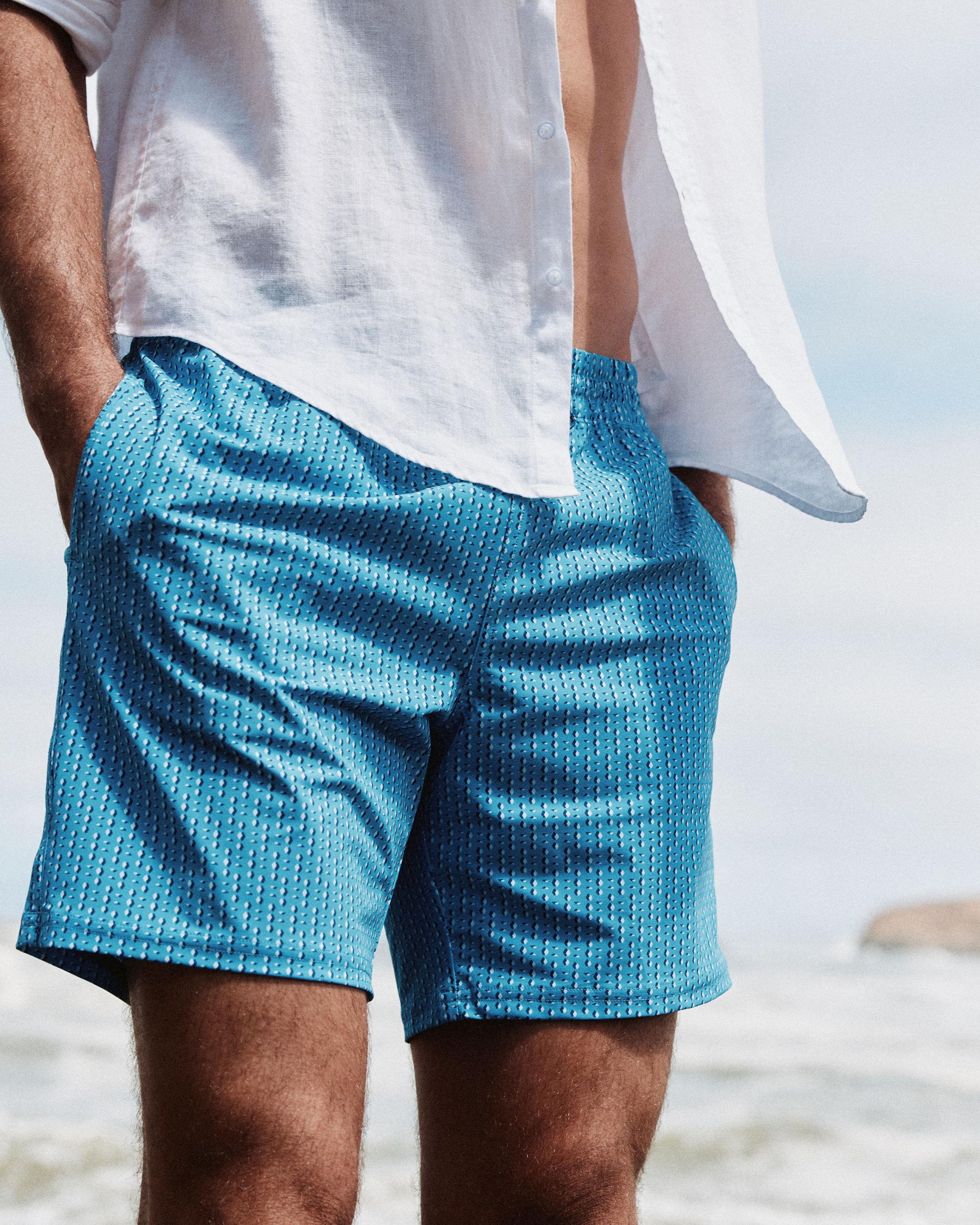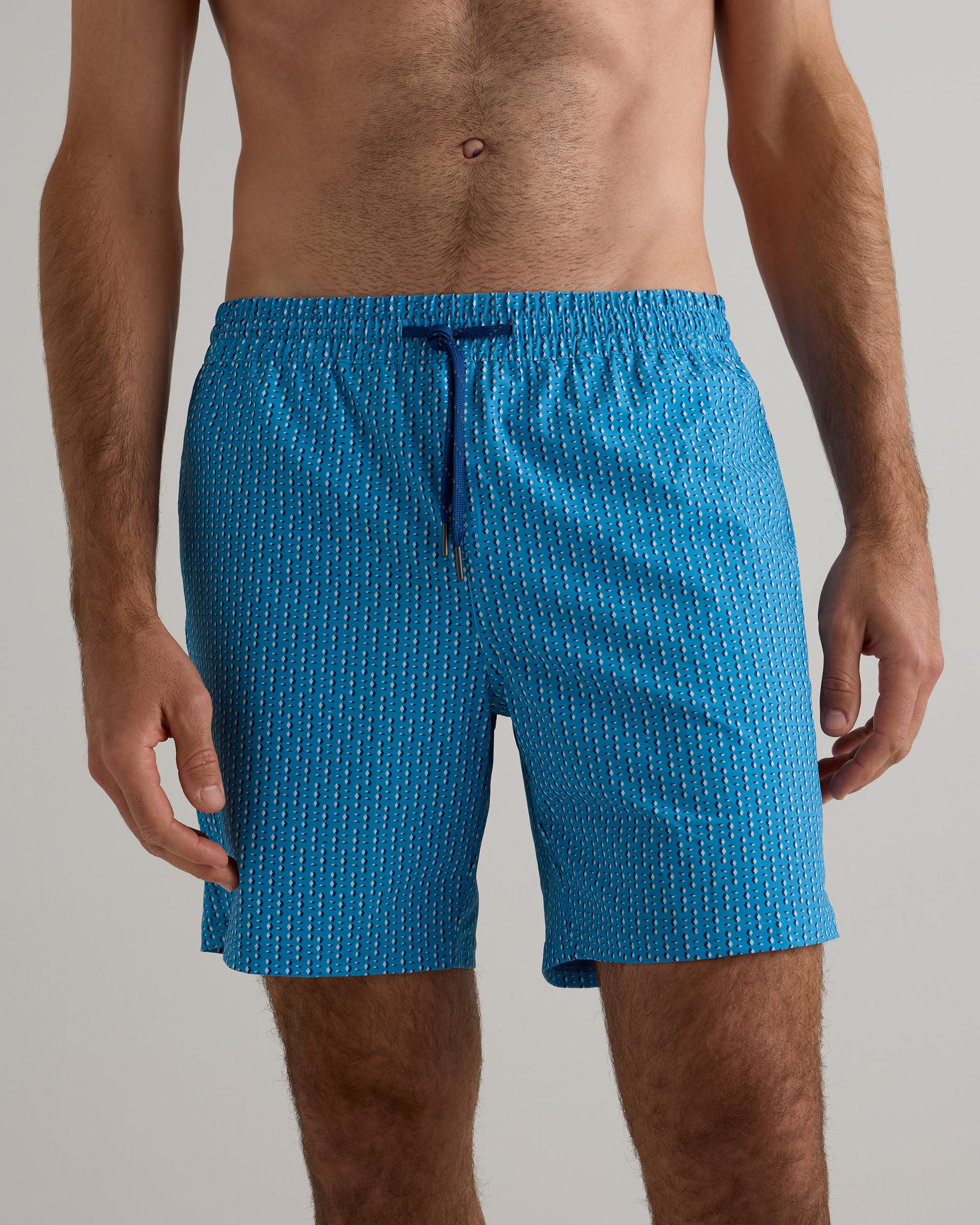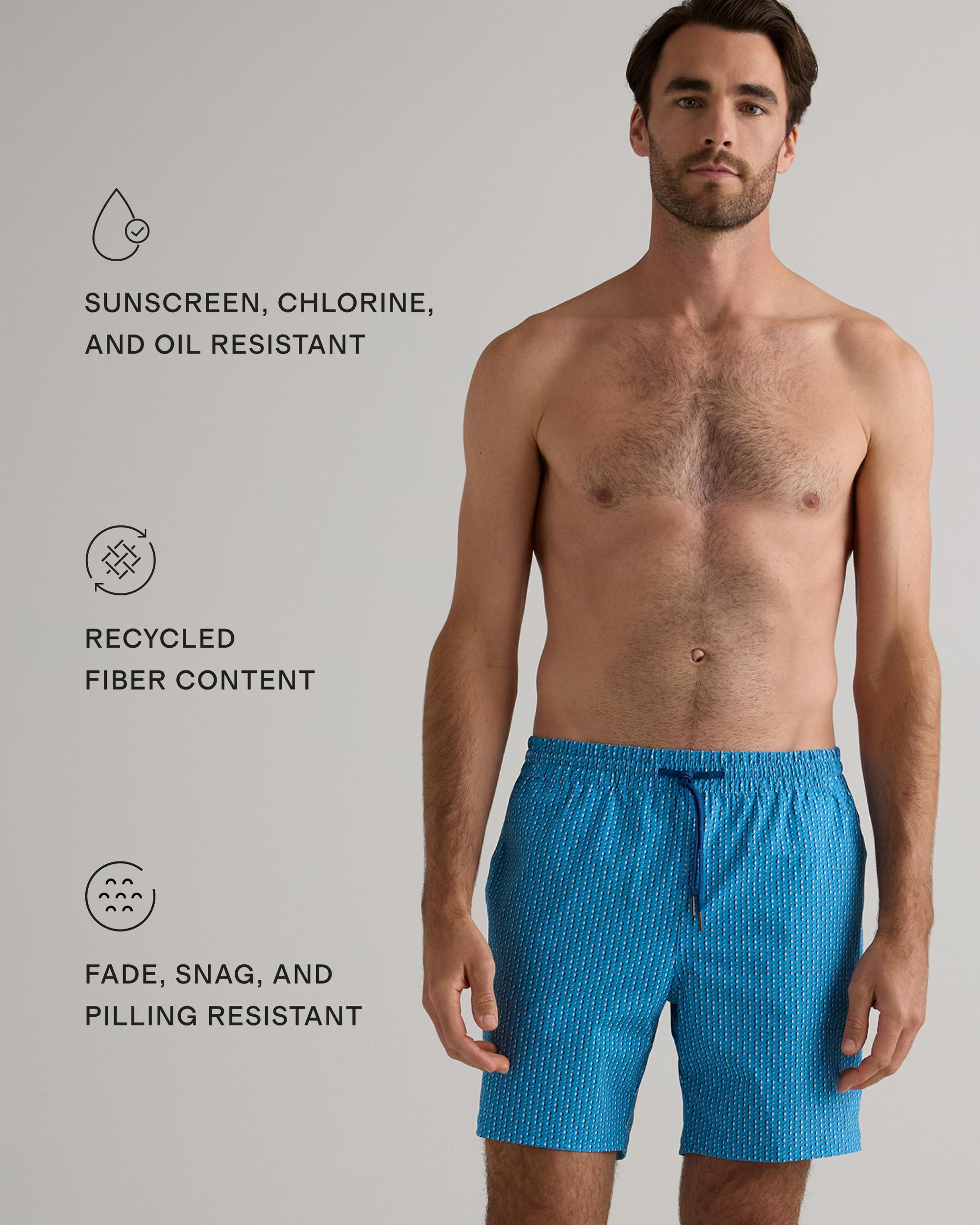 The Italian Swim Trunk is the ultimate summer essential for the active man. Made from quick-drying, sun screen and oil resistant material, this swim trunk offers UPF50 protection for all-day wear. The Italian fabrication ensures durability, resisting fading, pilling, and snagging for long-lasting use. Whether you're hitting the beach, pool, or backyard BBQ, this brief-lined swim trunk will keep you looking and feeling your best. | Quince | Men's Italian Swim Trunk in Mini Diamond Geo, Size XXL, Nylon