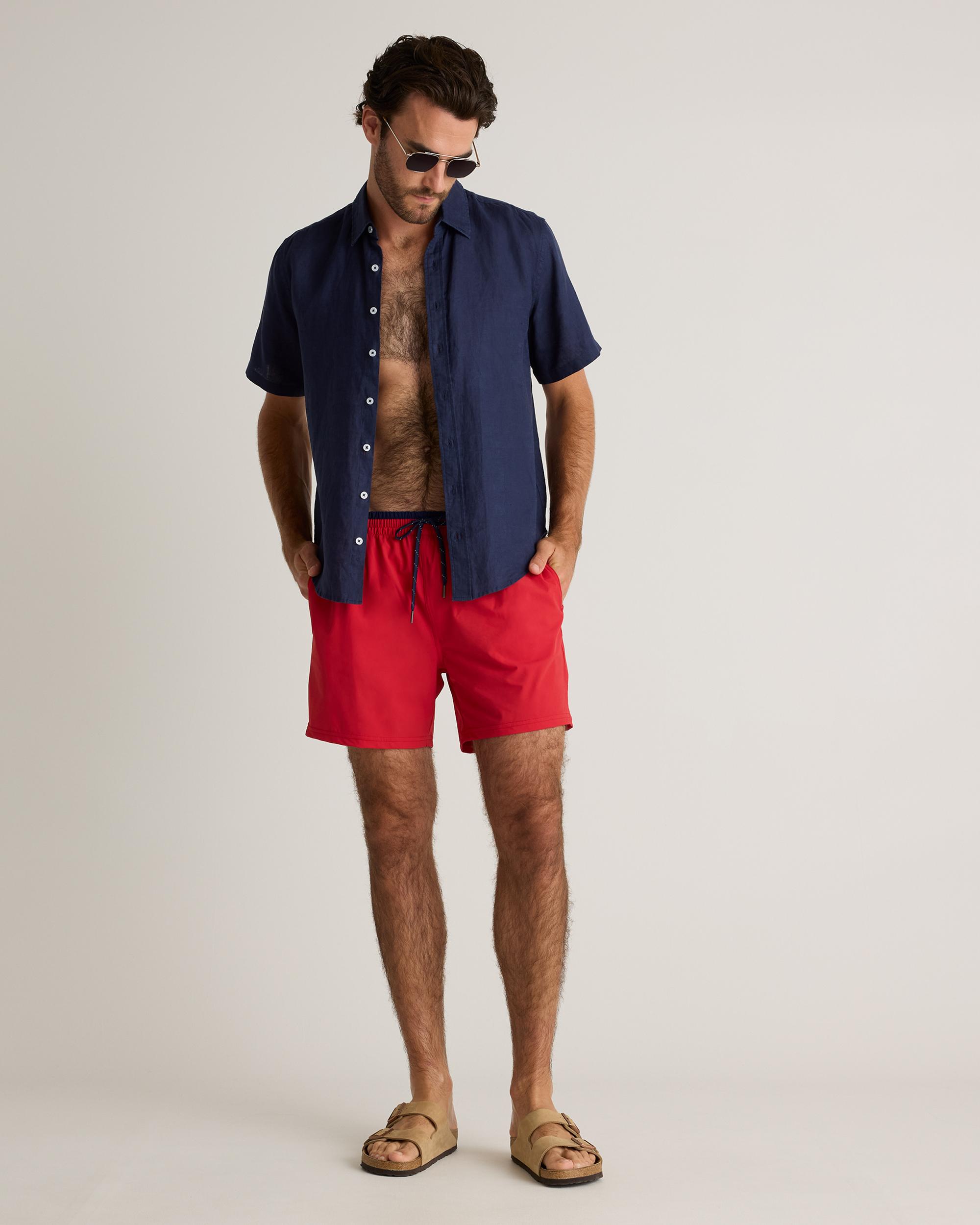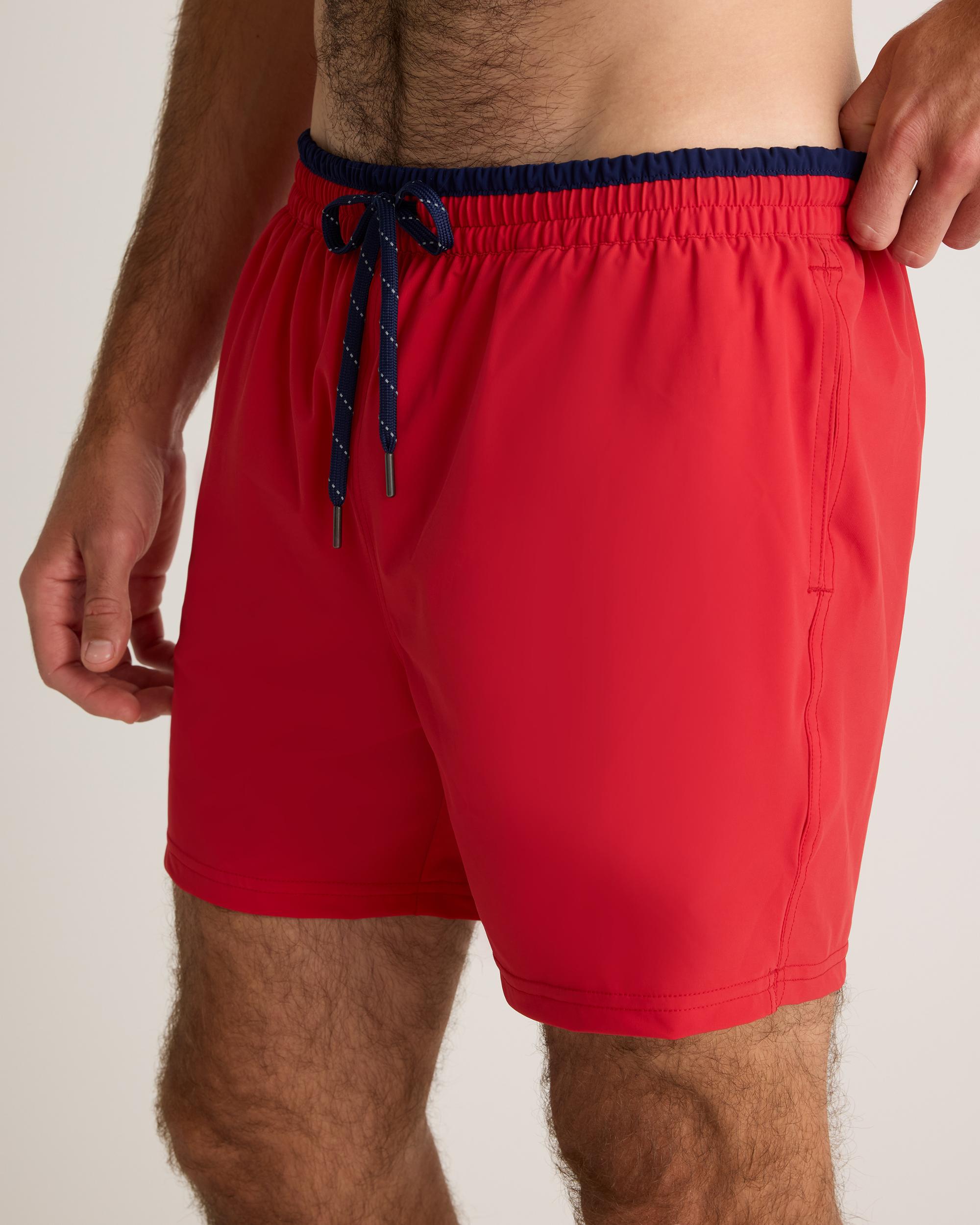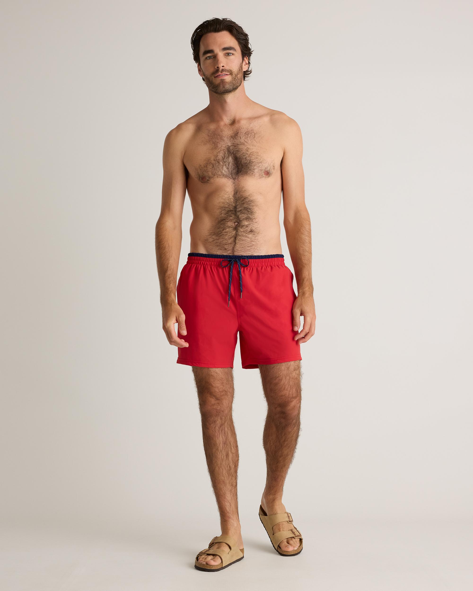 Our Italian Swim Trunk is the ultimate summer essential for the active man. Made from quick-drying, sun screen and oil resistant material, this swim trunk offers UPF50 protection for all-day wear. The Italian fabrication ensures durability, resisting fading, pilling, and snagging for long-lasting use. Whether you're hitting the beach, pool, or backyard BBQ, this brief-lined swim trunk will keep you looking and feeling your best. | Quince | Men's Italian Swim Trunk in Cherry/Deep Navy, Size XL, Nylon/Spandex