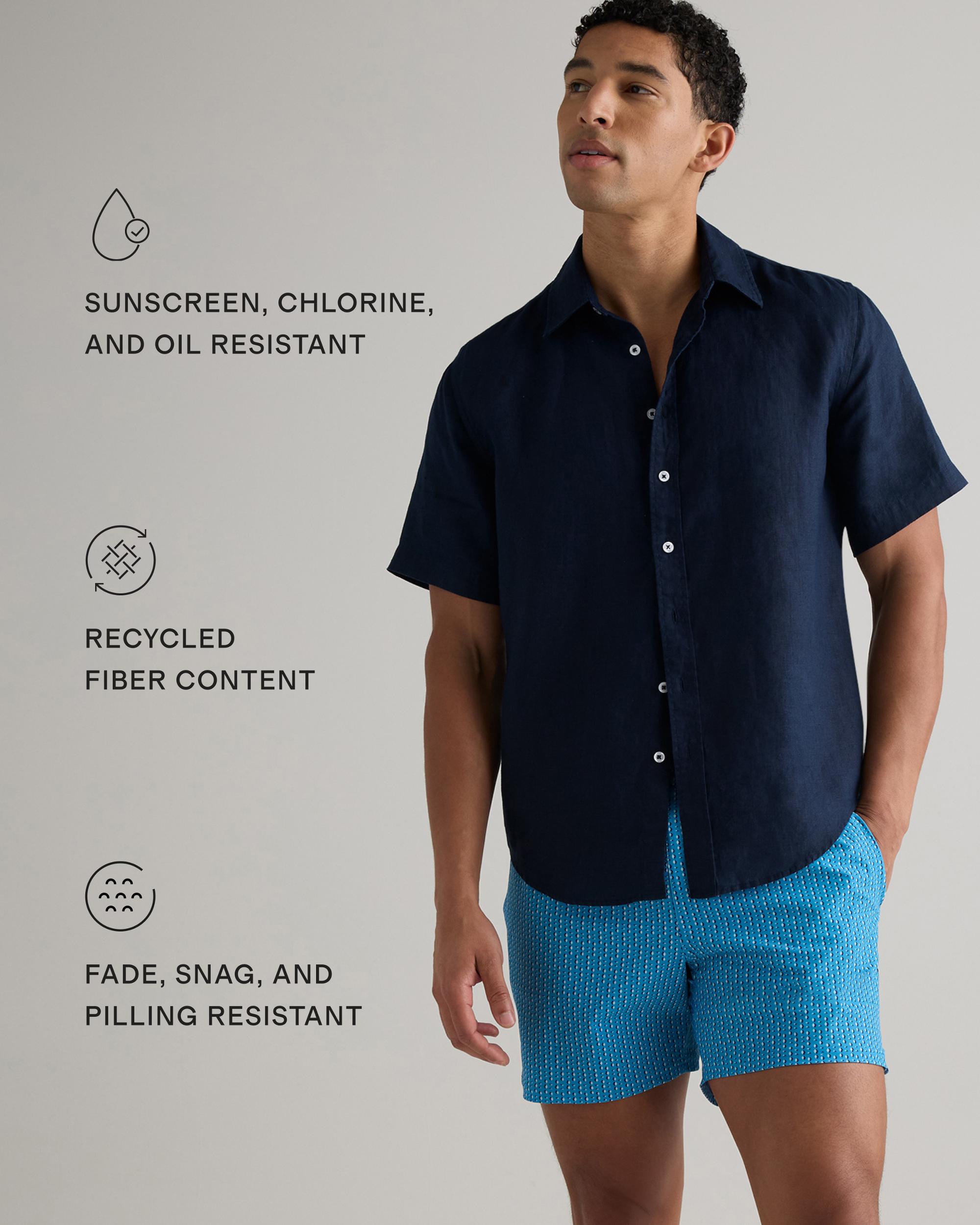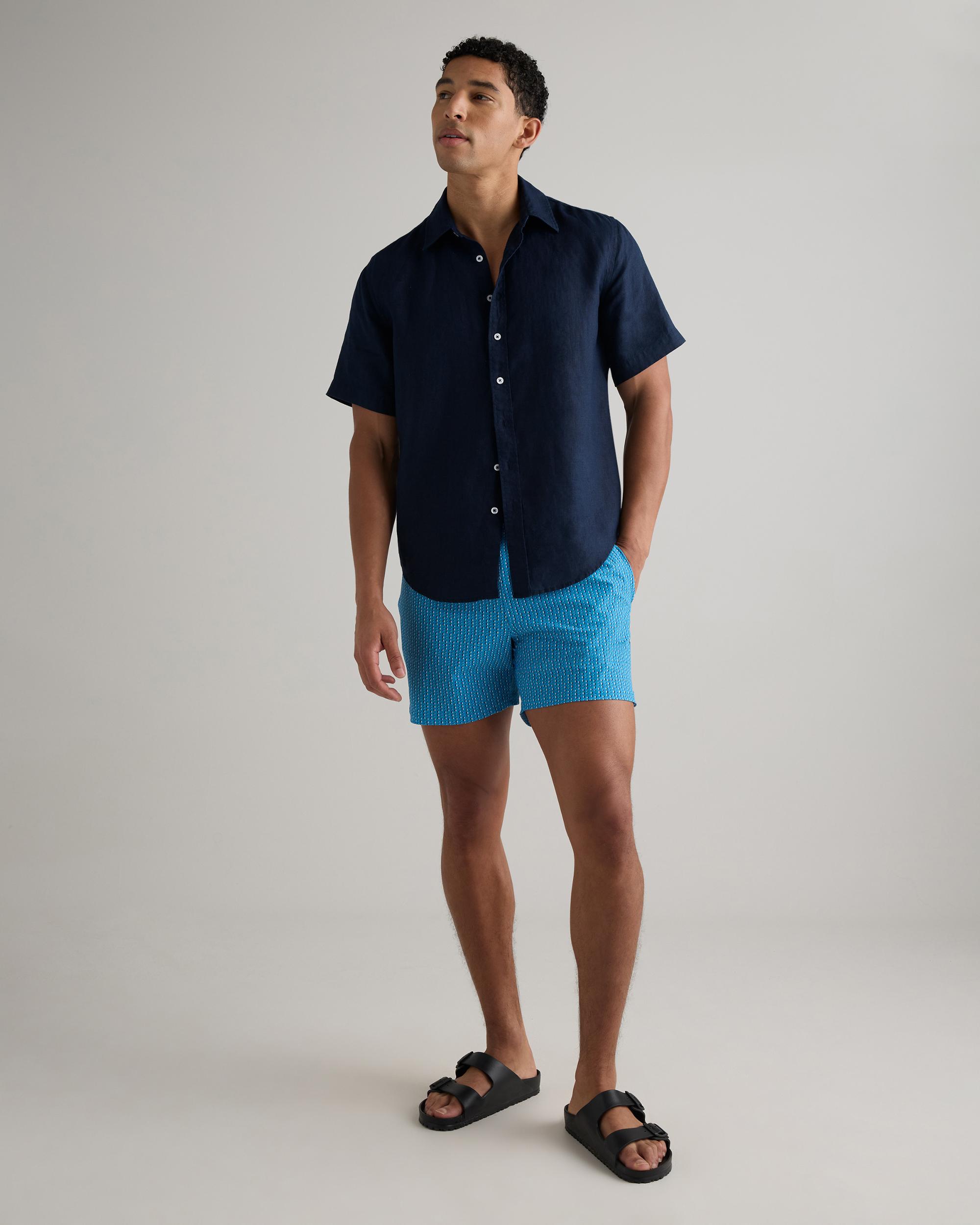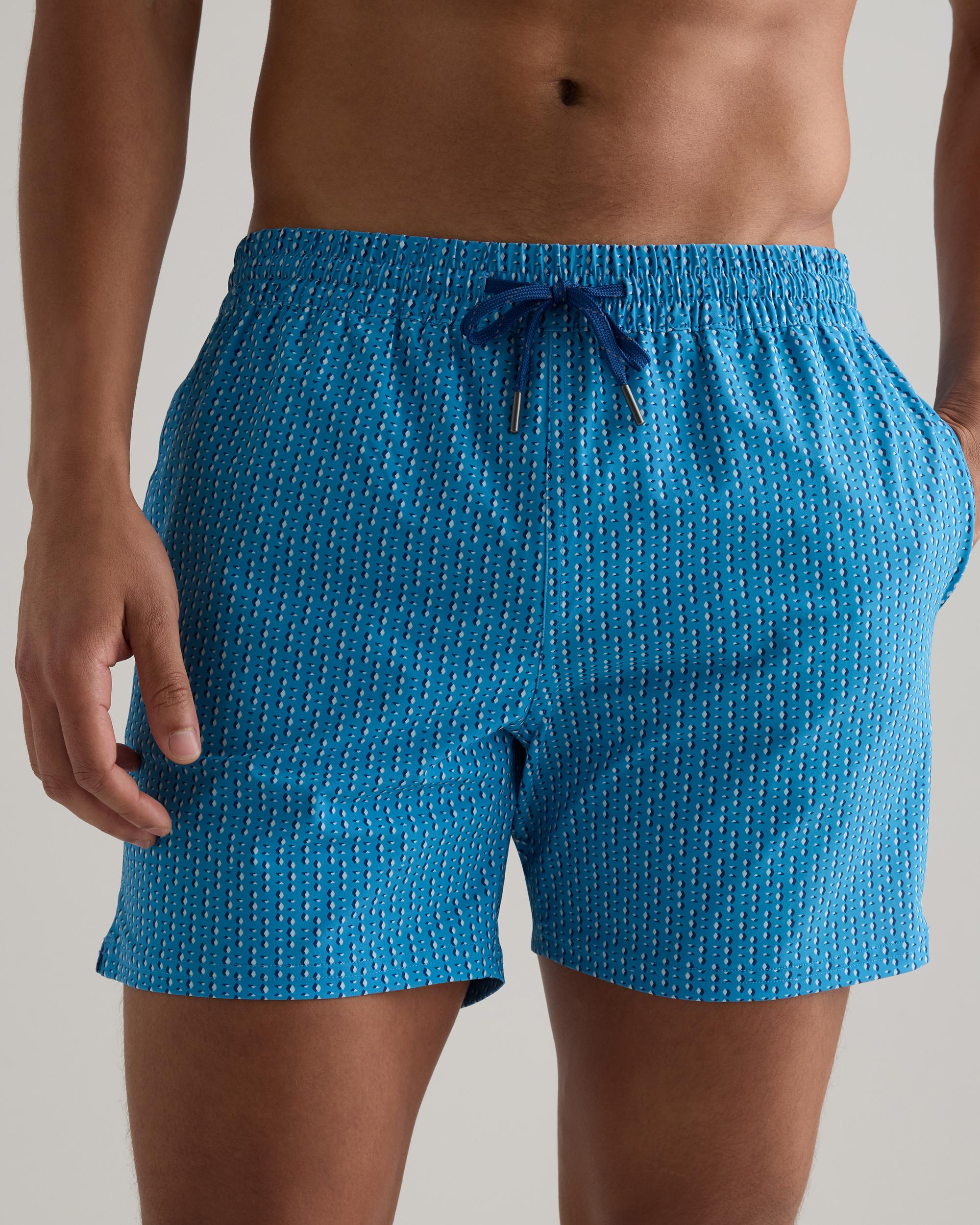 Our Italian Swim Trunk is the ultimate summer essential for the active man. Made from quick-drying, sun screen and oil resistant material, this swim trunk offers UPF50 protection for all-day wear. The Italian fabrication ensures durability, resisting fading, pilling, and snagging for long-lasting use. Whether you're hitting the beach, pool, or backyard BBQ, this brief-lined swim trunk will keep you looking and feeling your best. | Quince | Men's Italian Swim Trunk in Mini Diamond Geo, Size XXL, Nylon/Spandex
