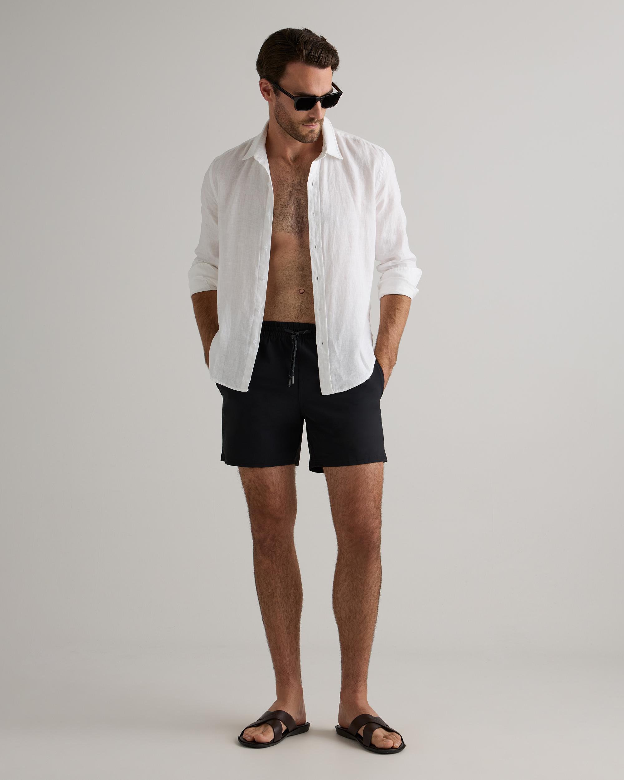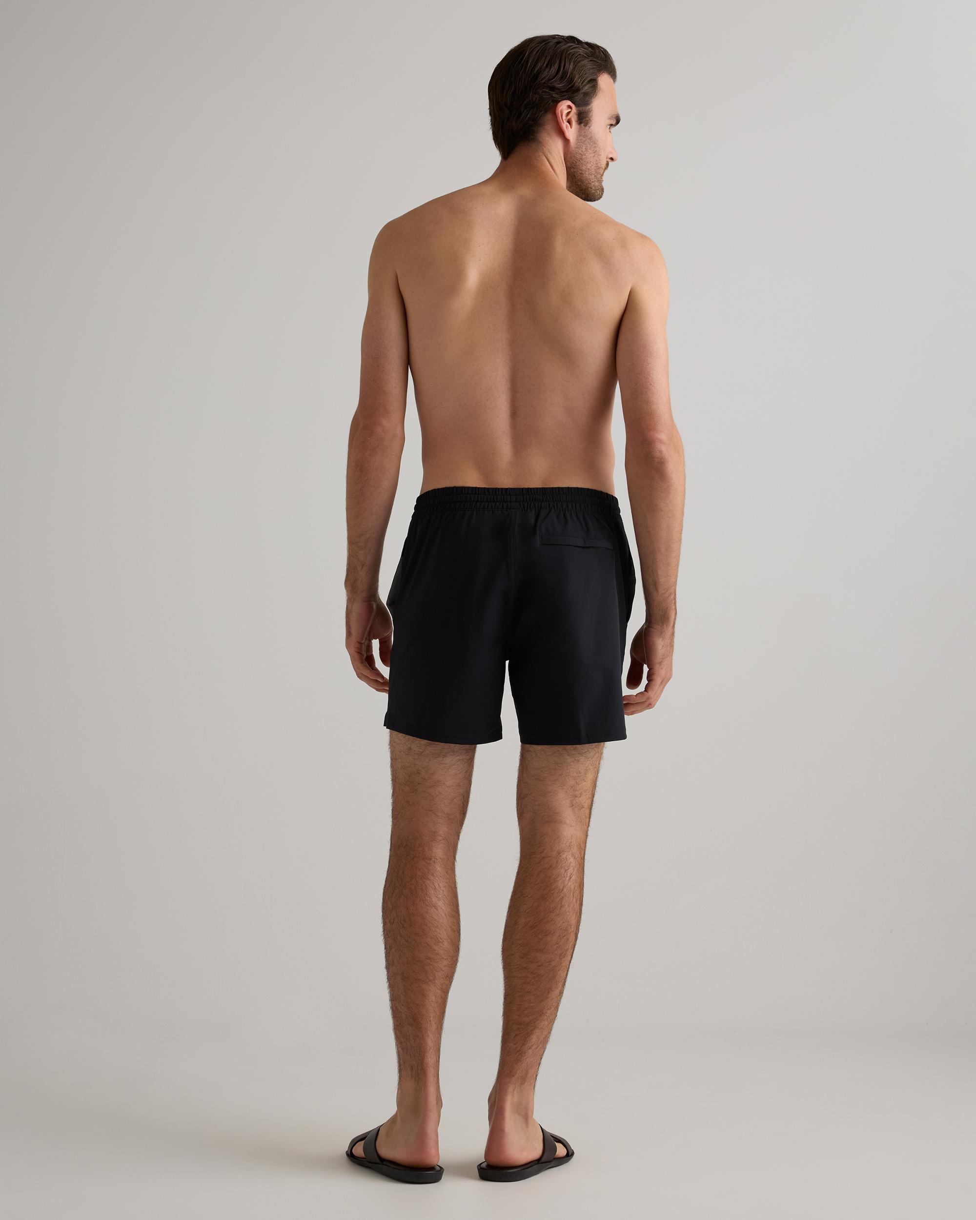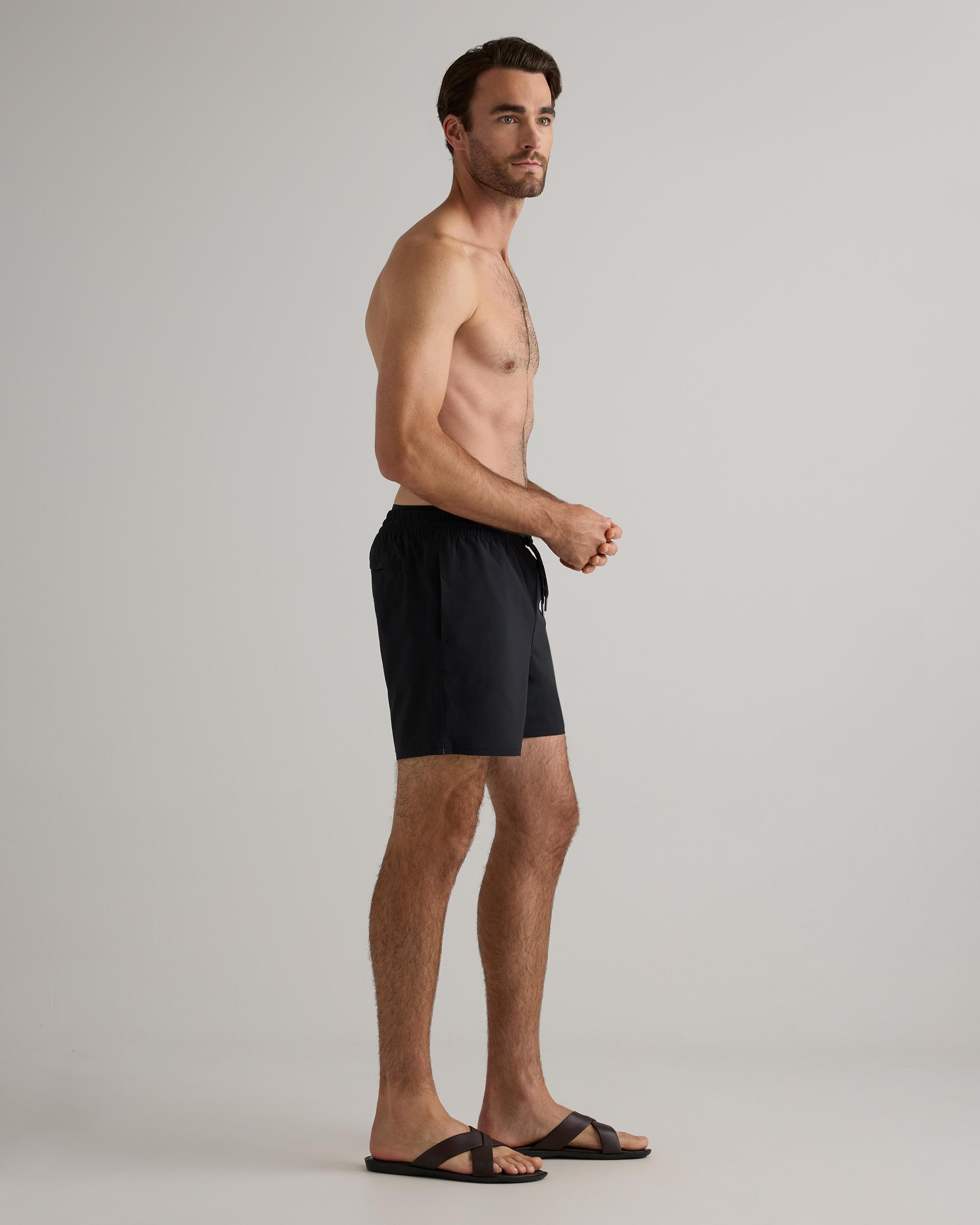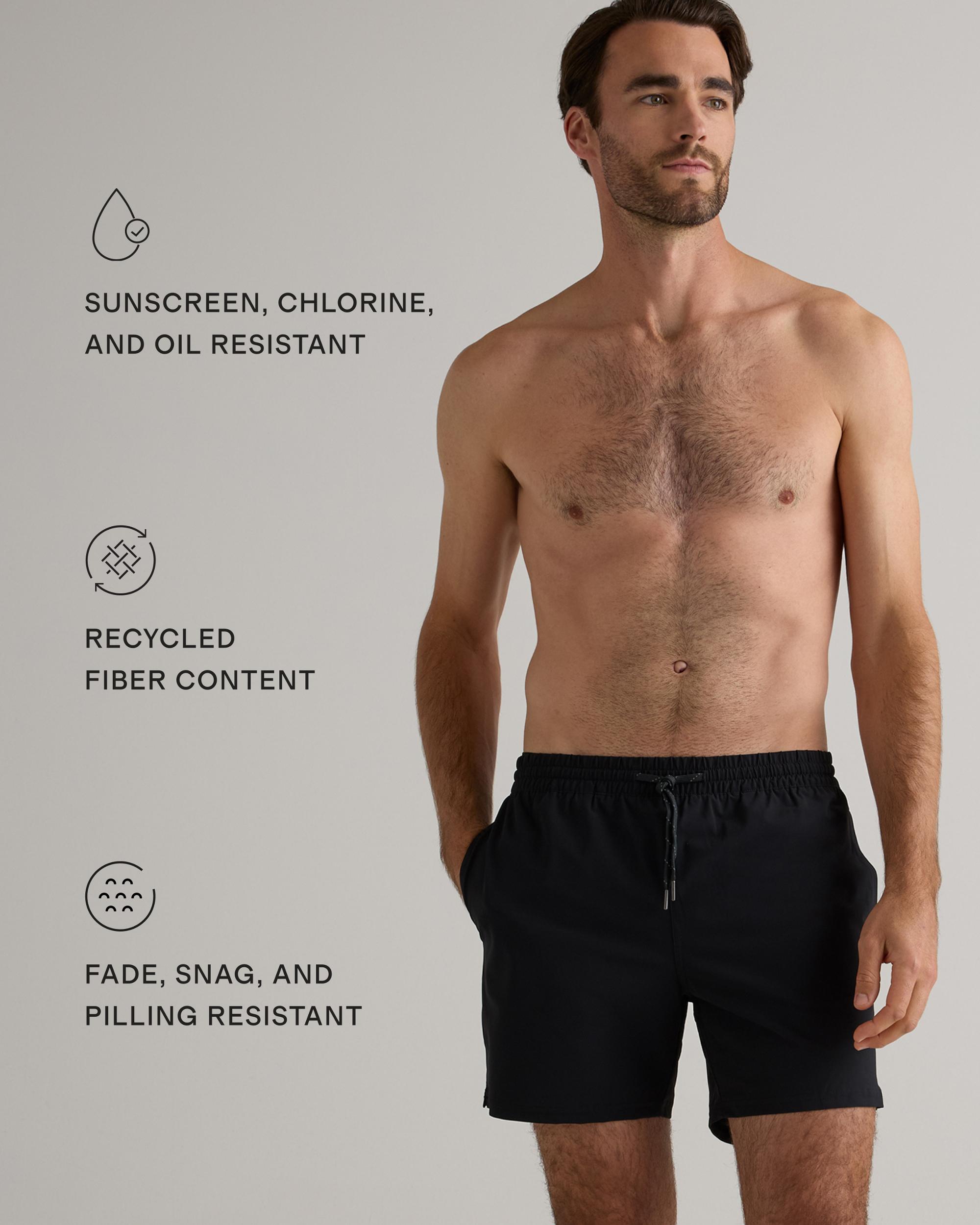 Our Italian Swim Trunk is the ultimate summer essential for the active man. Made from quick-drying, sun screen and oil resistant material, this swim trunk offers UPF50 protection for all-day wear. The Italian fabrication ensures durability, resisting fading, pilling, and snagging for long-lasting use. Whether you're hitting the beach, pool, or backyard BBQ, this brief-lined swim trunk will keep you looking and feeling your best. | Quince | Men's Italian Swim Trunk in Black, Size XXL, Nylon/Spandex