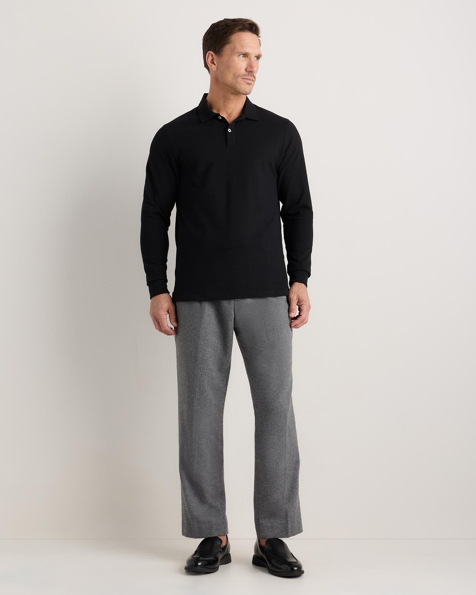 The classic polo shirt, with a major upgrade. Featuring luxe organic cotton for the classic polo look, we added spandex and fabric recovery to provide the same maximum comfort as an active shirt. The custom no-crease collar ensures your polo will continue to look new wash-after-wash. Meet your new go-to WFH staple. | Quince | Men's Long Sleeve Pique Polo in Black, Size XXL, Organic Cotton