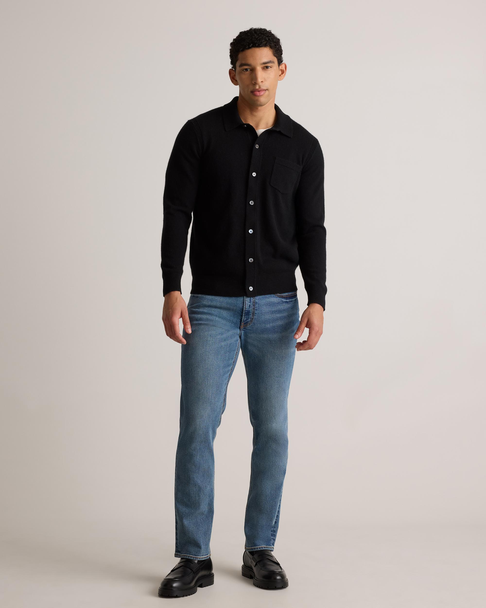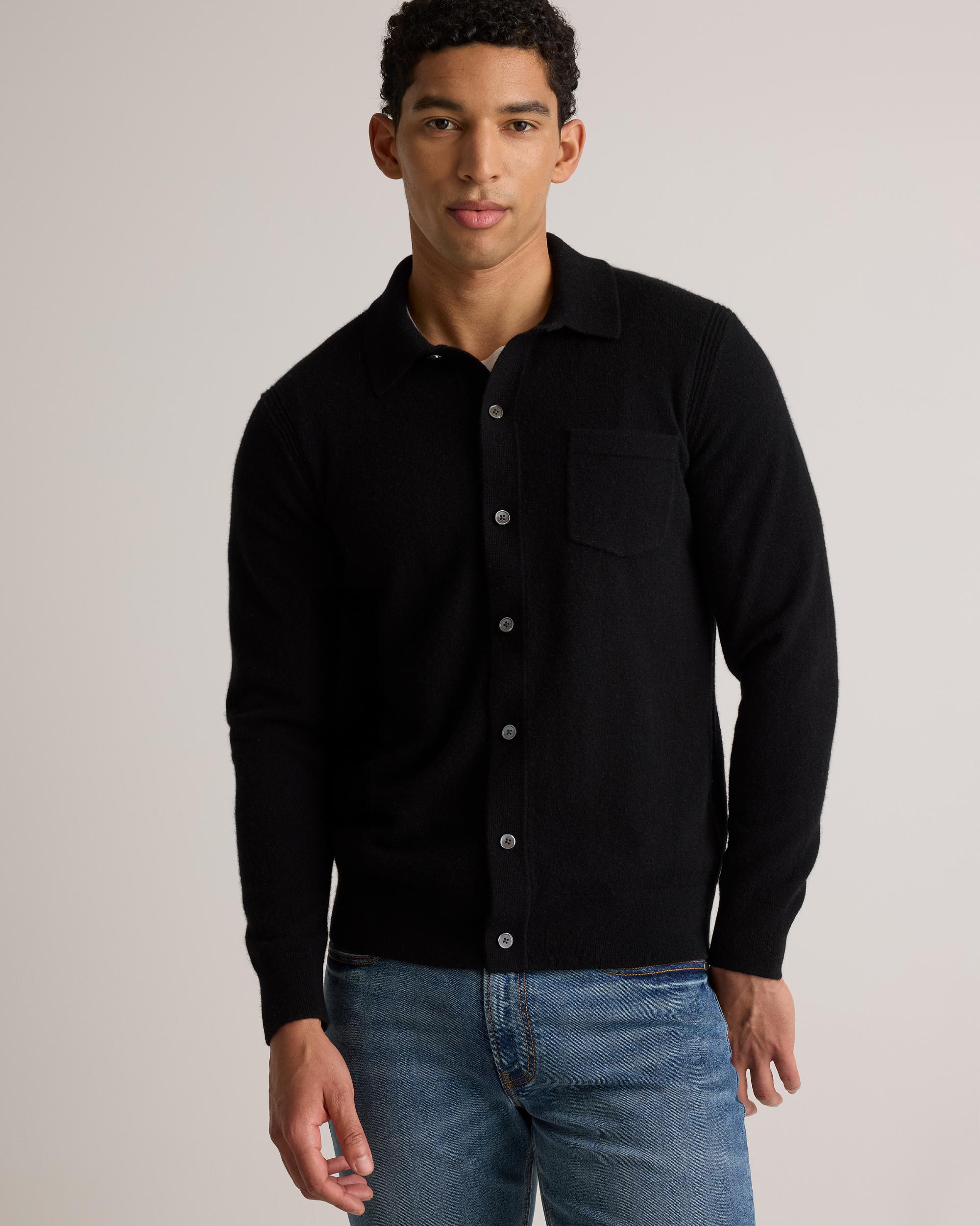 The perfect hybrid of a classic button down shirt and a soft cashmere sweater. With a relaxed, straight fit that makes this style perfect for layering, try wearing it open, like an overshirt, paired with your favorite tee, or fully buttoned under a jacket as the temperature starts to drop. Crafted with a denser, more substantial knit, our Signature cashmere offers unmatched warmth and softness for cooler weather. Designed to last and feels smoother and richer with every wear. | Quince | Men's Mongolian Cashmere Button Down Sweater in Black, Size Large