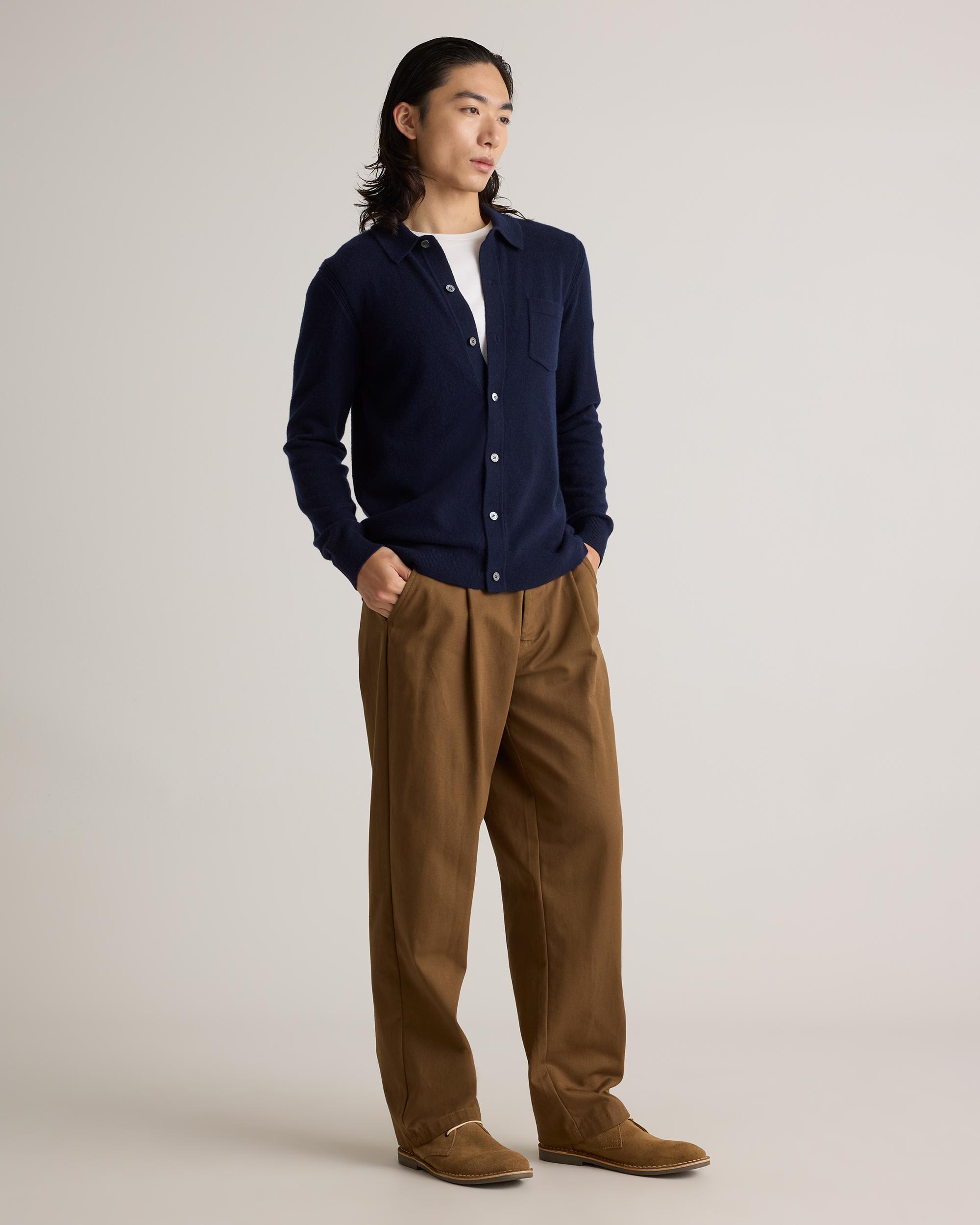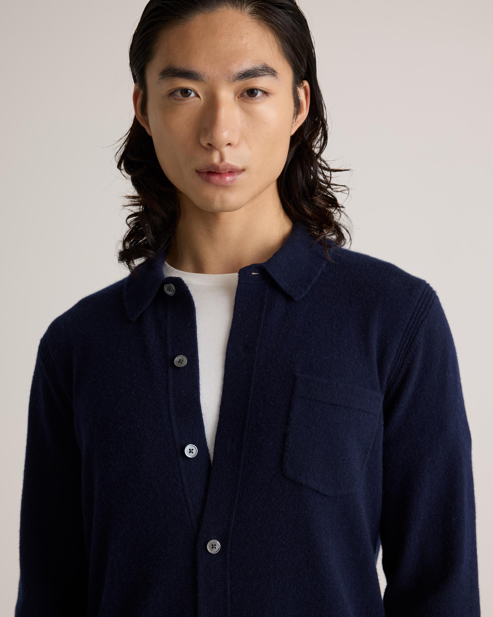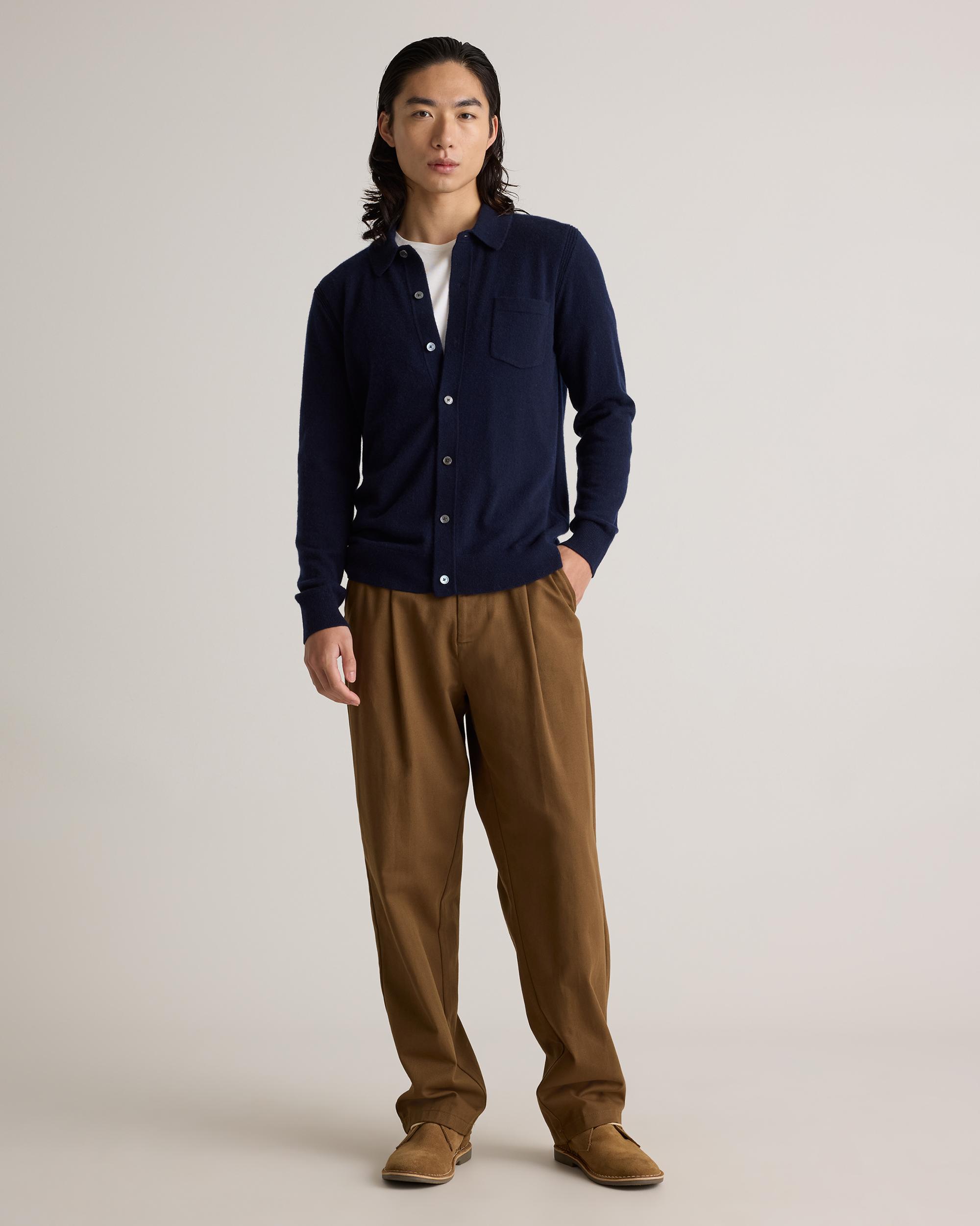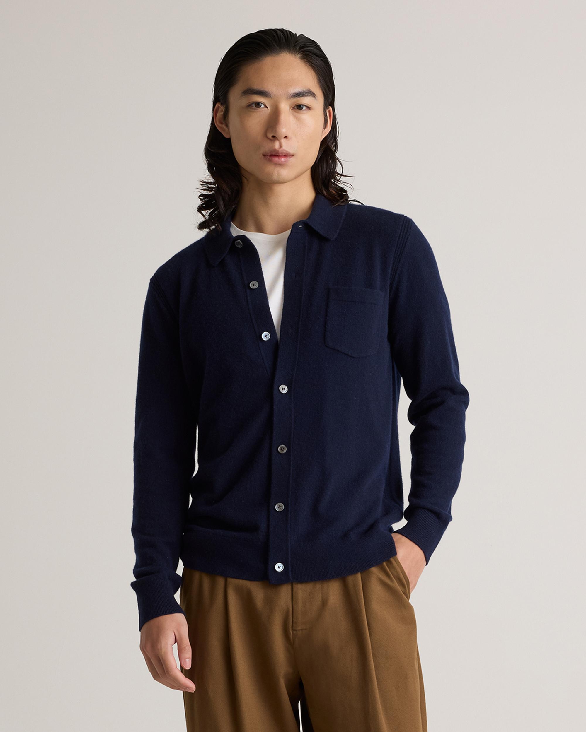 The perfect hybrid of a classic button down shirt and a soft cashmere sweater. With a relaxed, straight fit that makes this style perfect for layering, try wearing it open, like an overshirt, paired with your favorite tee, or fully buttoned under a jacket as the temperature starts to drop. Crafted with a denser, more substantial knit, our Signature cashmere offers unmatched warmth and softness for cooler weather. Designed to last and feels smoother and richer with every wear. | Quince | Men's Mongolian Cashmere Button Down Sweater in True Navy, Size XL