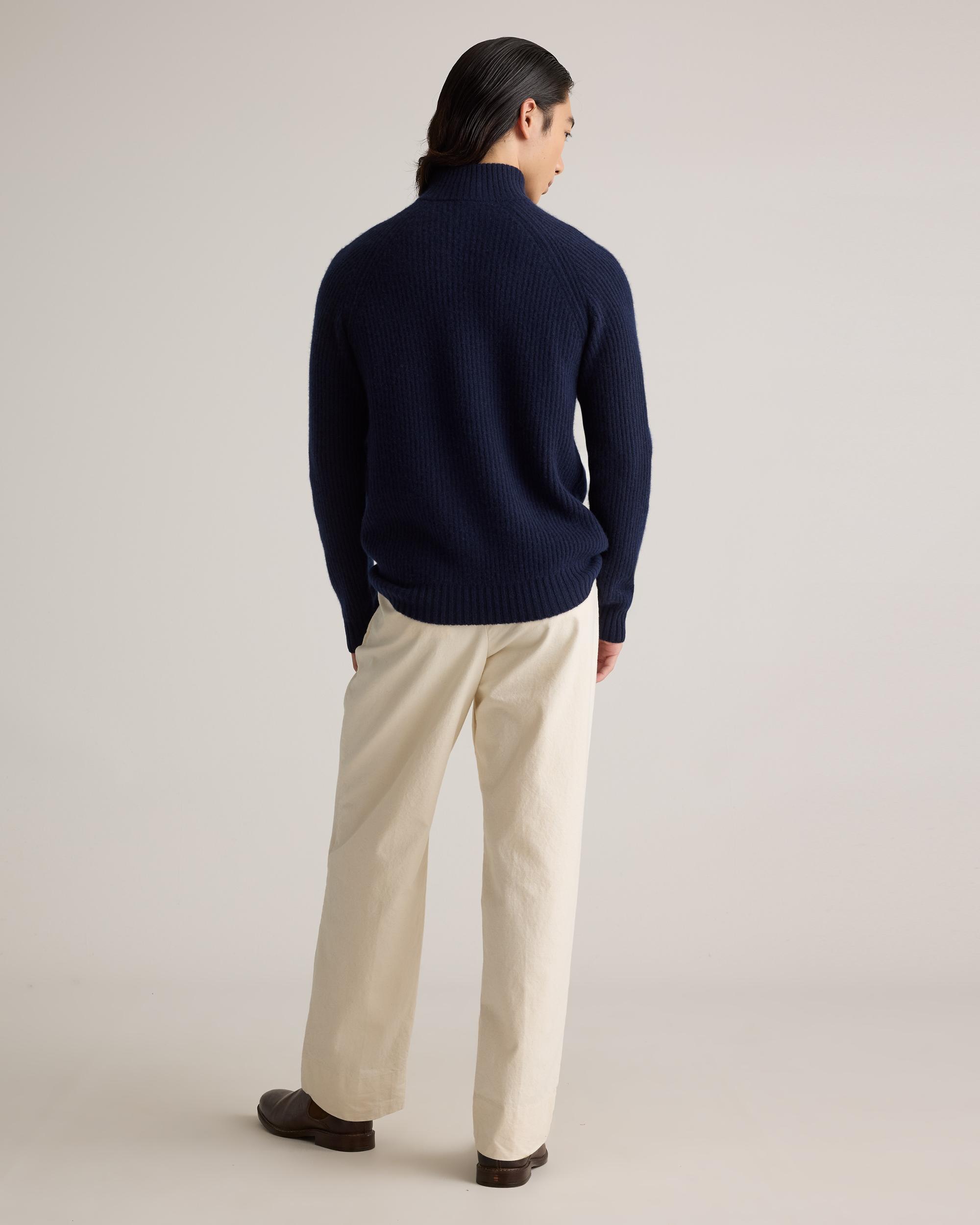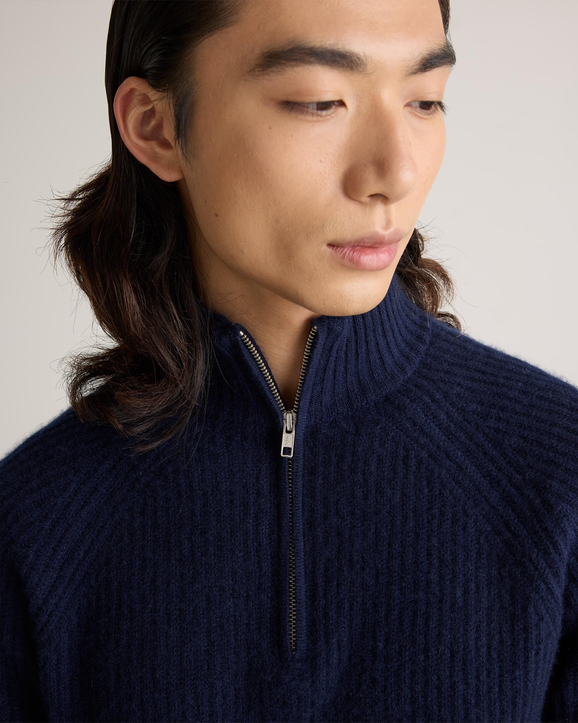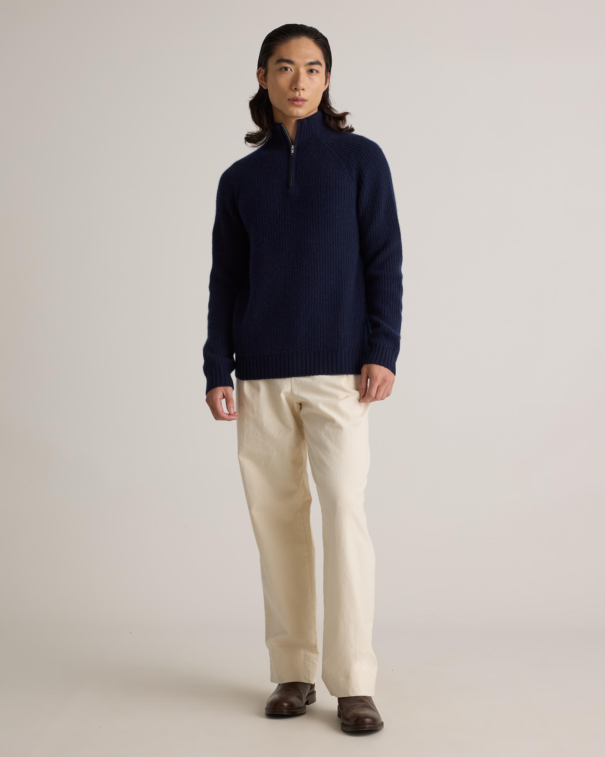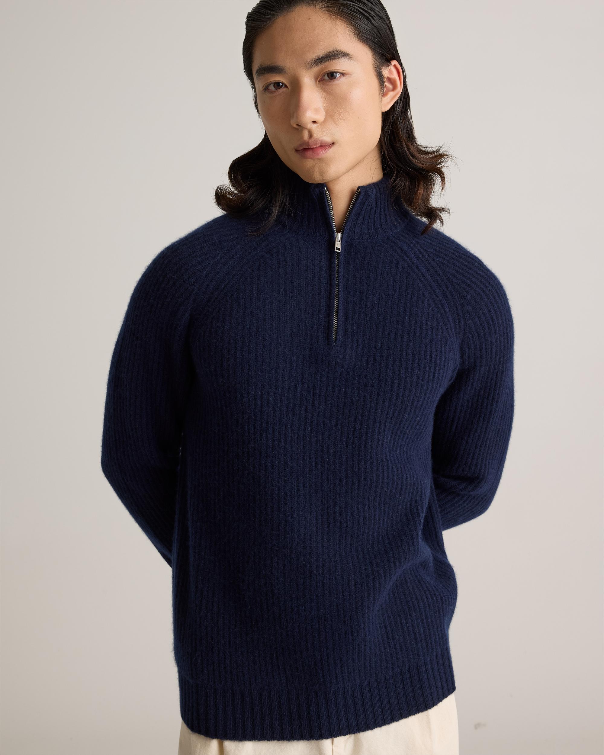 Channel a coastal classic vibe with our Mongolian Cashmere Fisherman Quarter Zip Sweater—it's ultra soft, cozy, and made to last. Plus it's just right over your favorite t-shirt or under a jacket when the temps starts to drop. We've upgraded our signature cashmere to be smoother, cozier, and more substantial than ever, with less pilling. Designed with that timeless fisherman ribbed texture, this thick-gauge knit will be your go-to all season long. | Quince | Men's Mongolian Cashmere Fisherman Quarter Zip Sweater in True Navy, Size Large