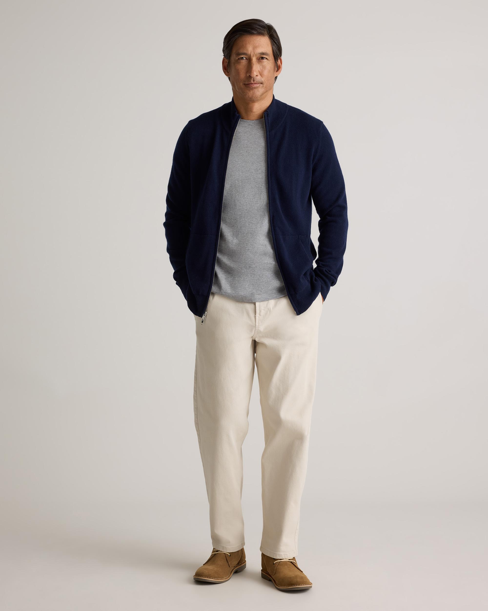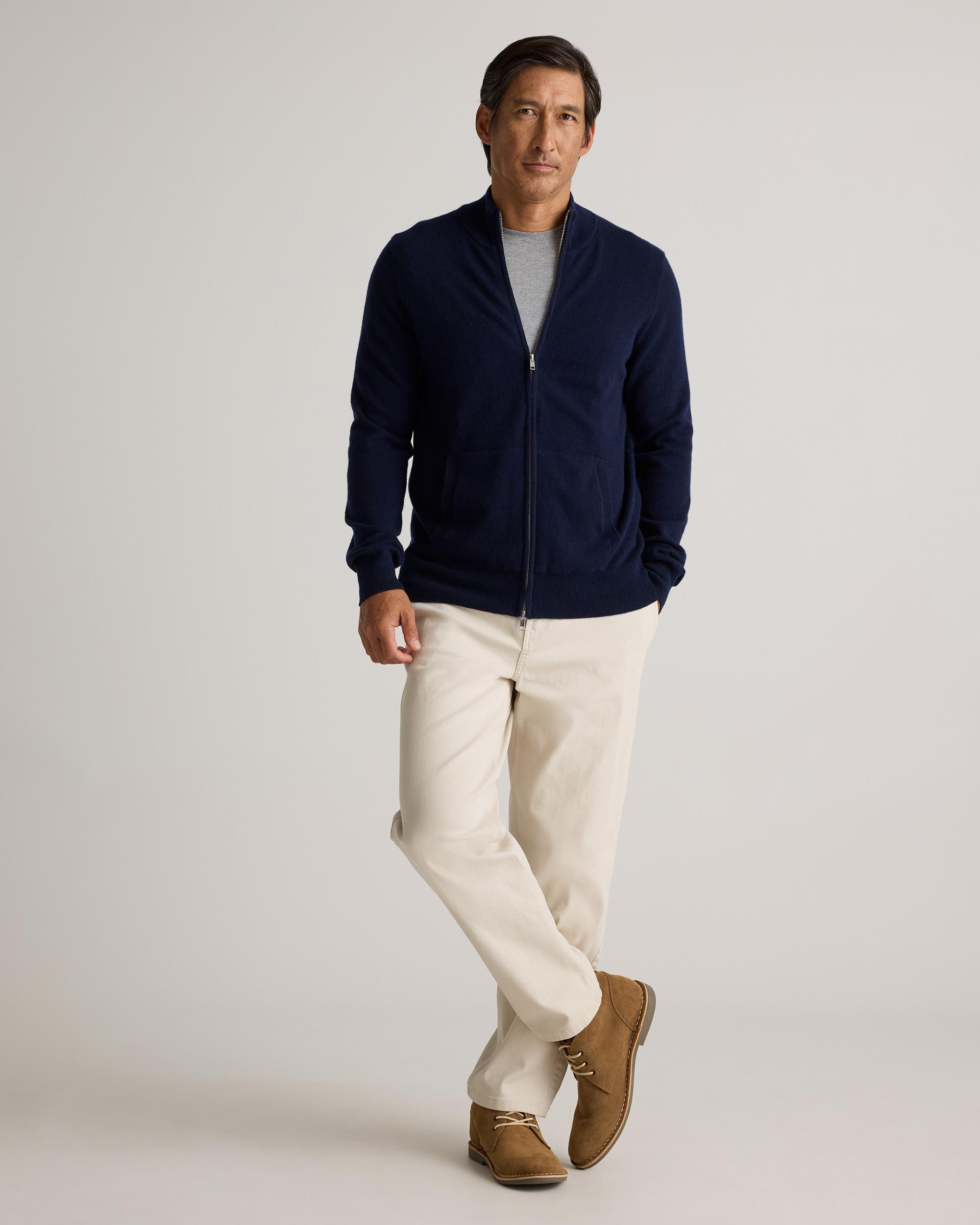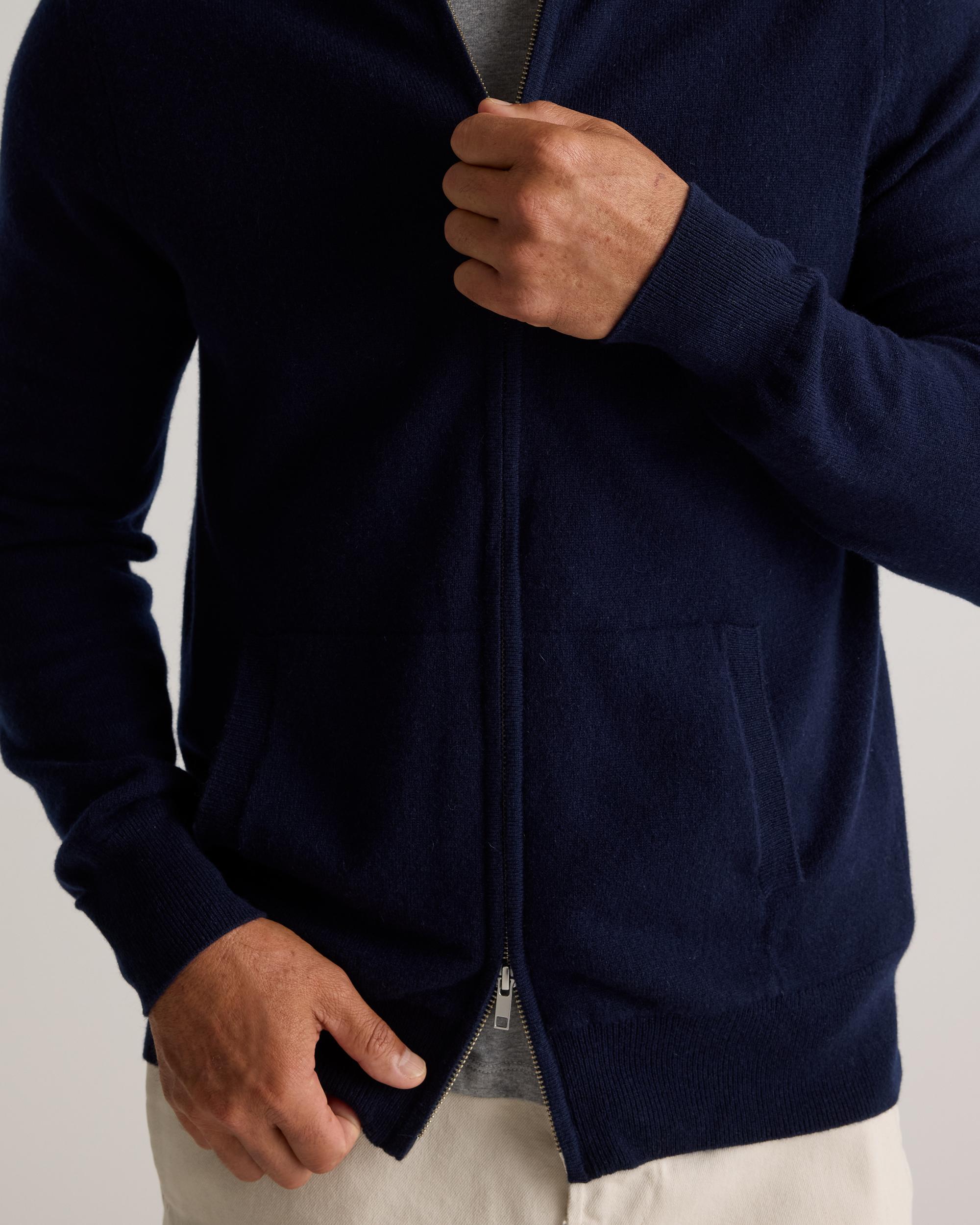 Our Mongolian Cashmere Full Zip Sweater is a timeless piece that blends classic style with modern versatility. We've upgraded it to be smoother, cozier, and more substantial than ever, with less pilling. Crafted from 100% premium Mongolian cashmere, this sweater offers unparalleled softness and warmth without adding bulk. The full-zip design allows for effortless layering, whether you’re dressing it up for a night out or keeping it casual for a relaxed day. Ribbed cuffs and hem provide a tailored fit, while the sleek zipper adds a touch of sophistication. Explore what makes it special and how to care for it in our Cashmere 101 guide. | Quince | Men's Mongolian Cashmere Full Zip Sweater in True Navy, Size XL