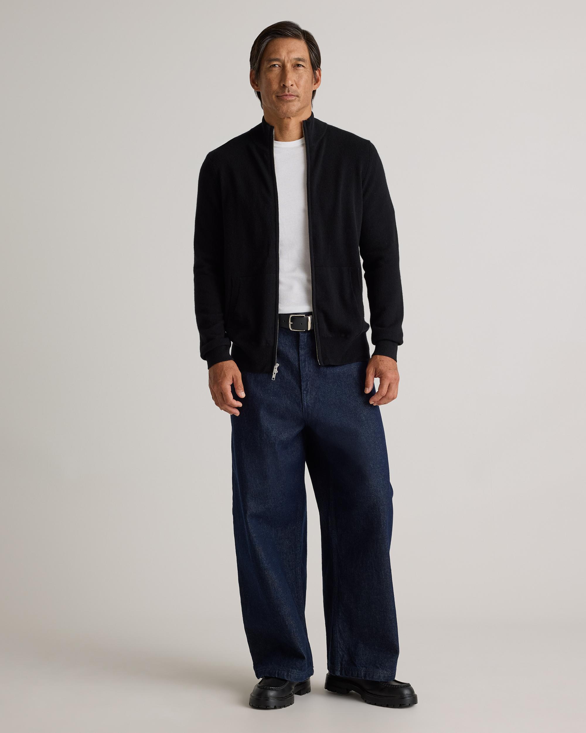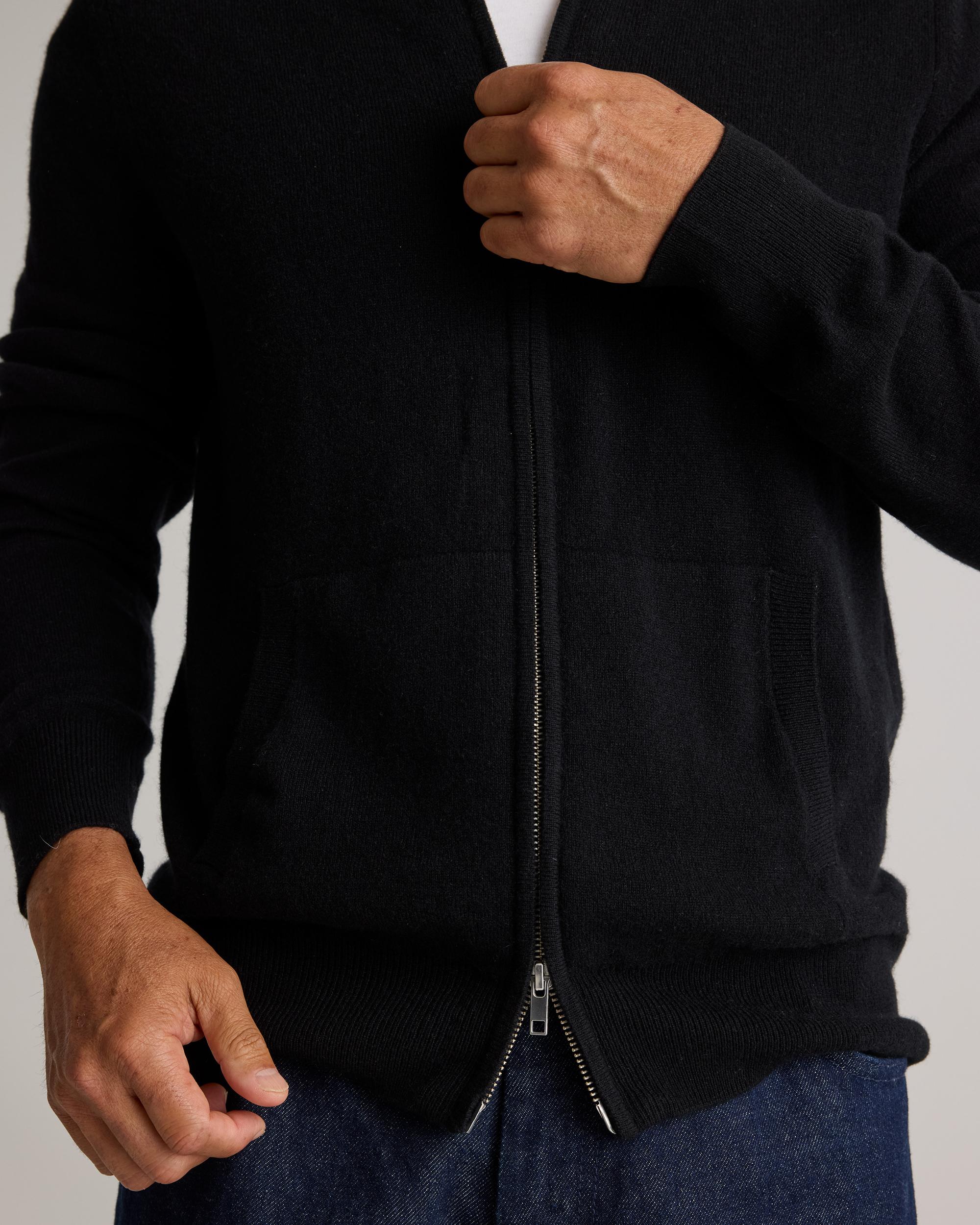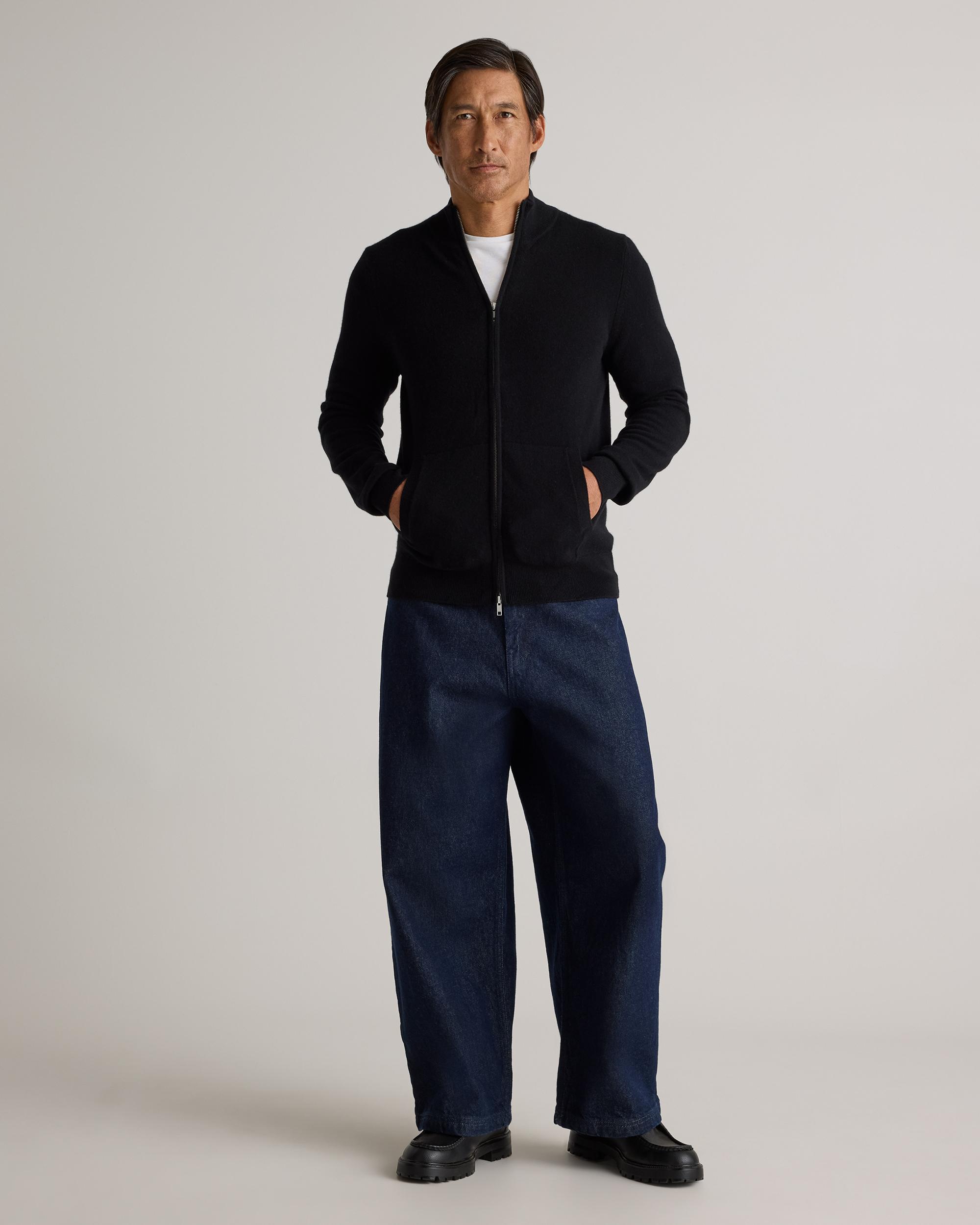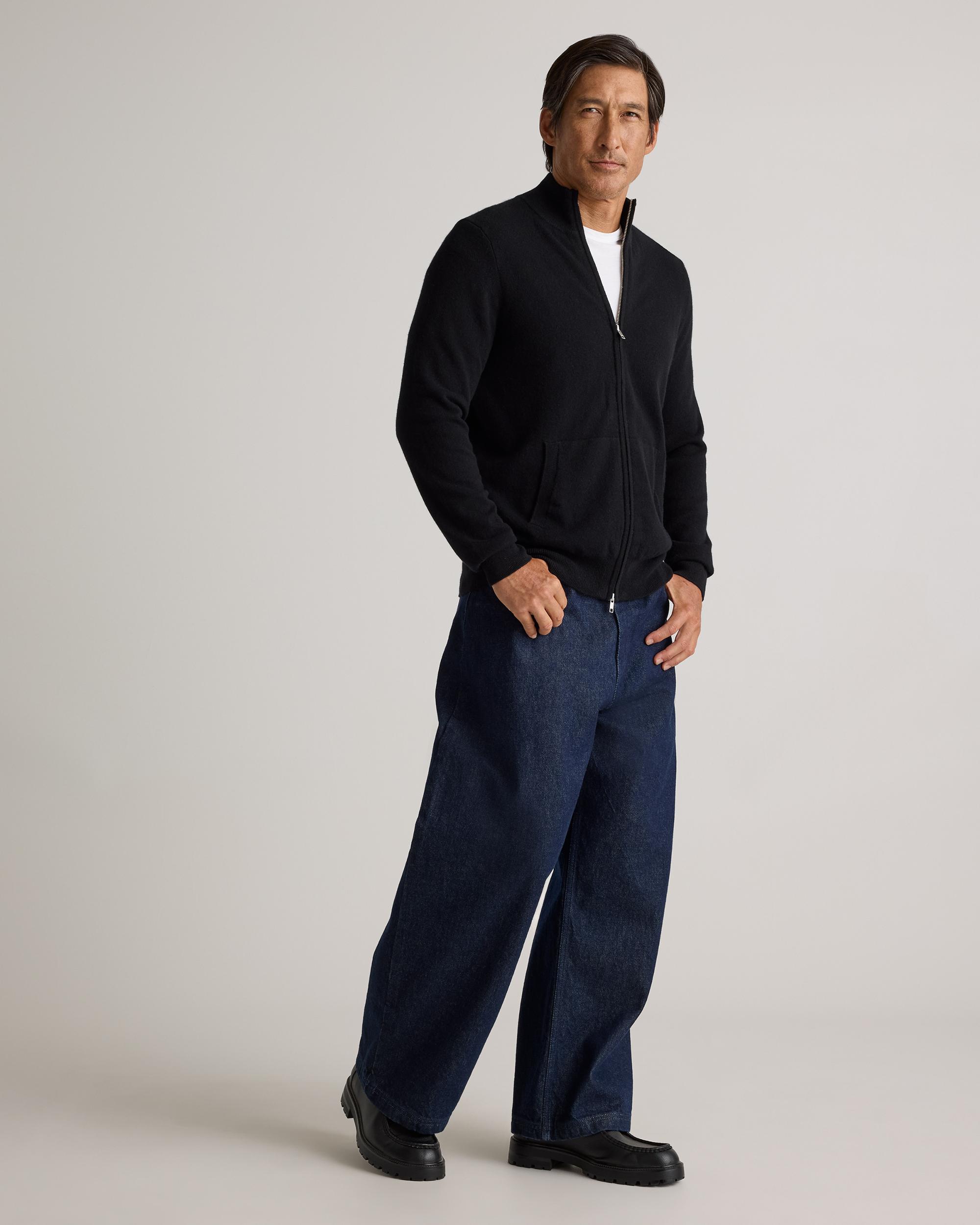 Our Mongolian Cashmere Full Zip Sweater is a timeless piece that blends classic style with modern versatility. We've upgraded it to be smoother, cozier, and more substantial than ever, with less pilling. Crafted from 100% premium Mongolian cashmere, this sweater offers unparalleled softness and warmth without adding bulk. The full-zip design allows for effortless layering, whether you’re dressing it up for a night out or keeping it casual for a relaxed day. Ribbed cuffs and hem provide a tailored fit, while the sleek zipper adds a touch of sophistication. Explore what makes it special and how to care for it in our Cashmere 101 guide. | Quince | Men's Mongolian Cashmere Full Zip Sweater in Black, Size XL
