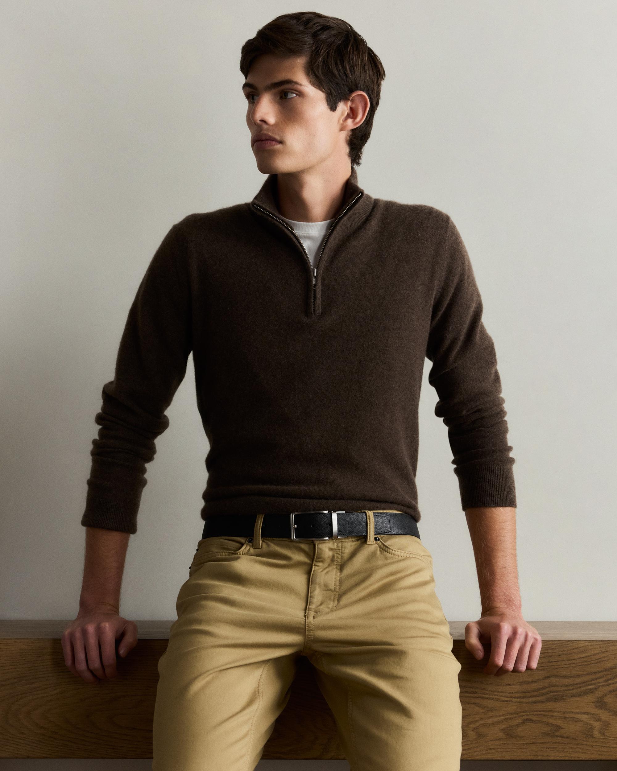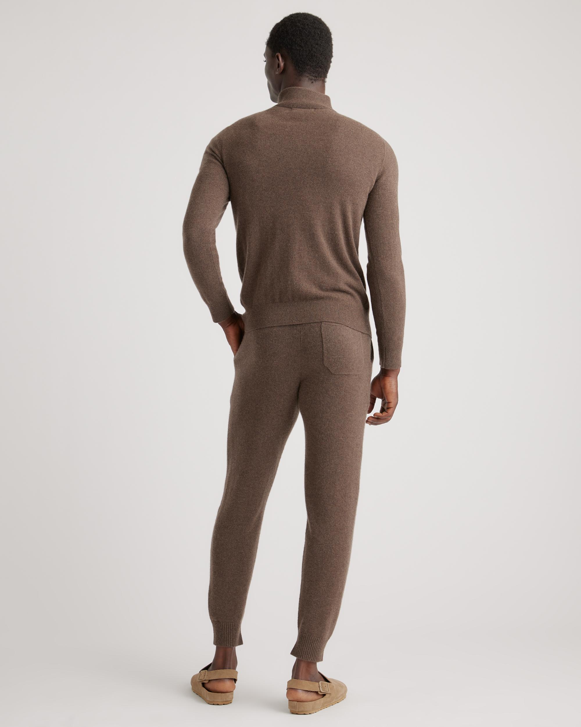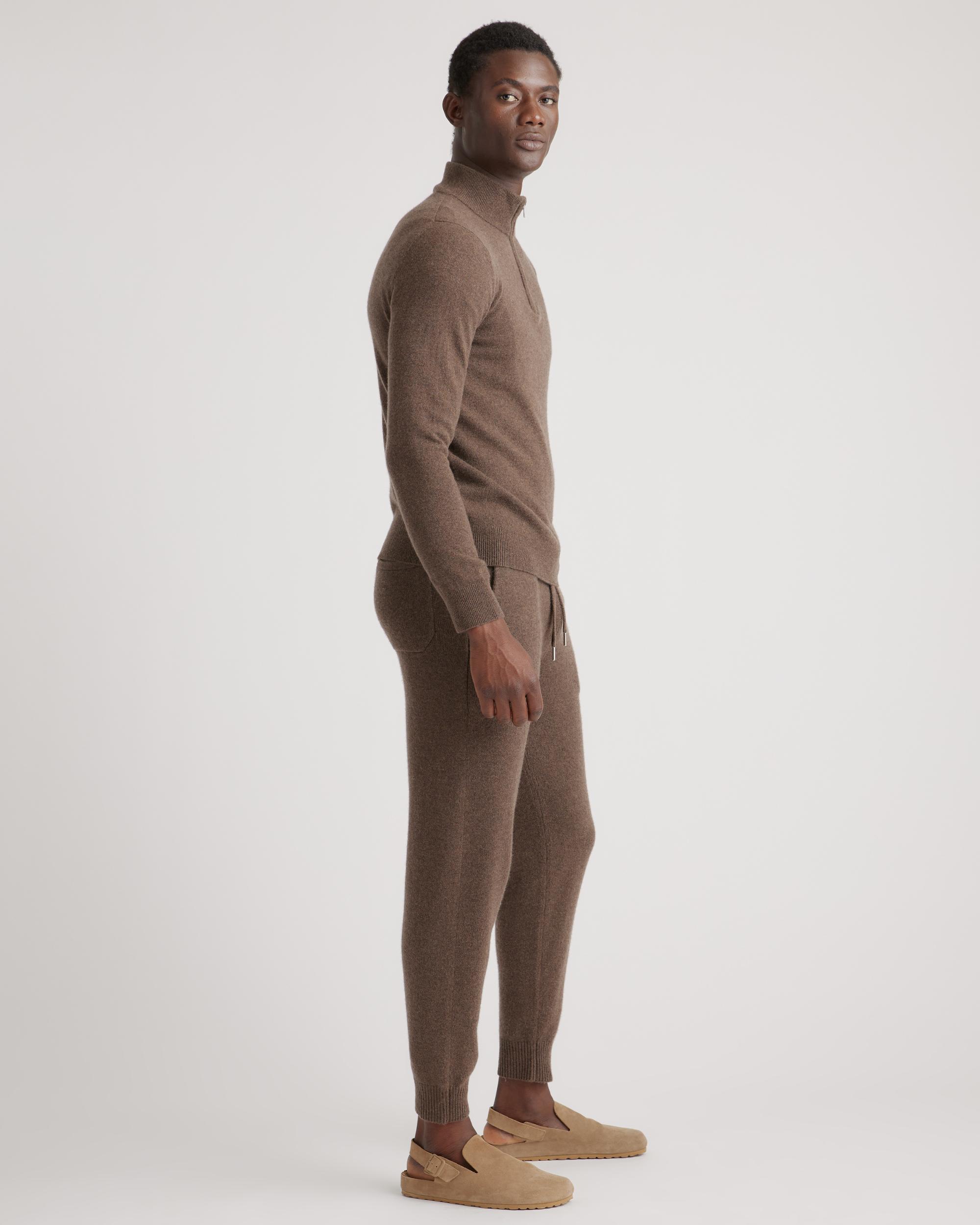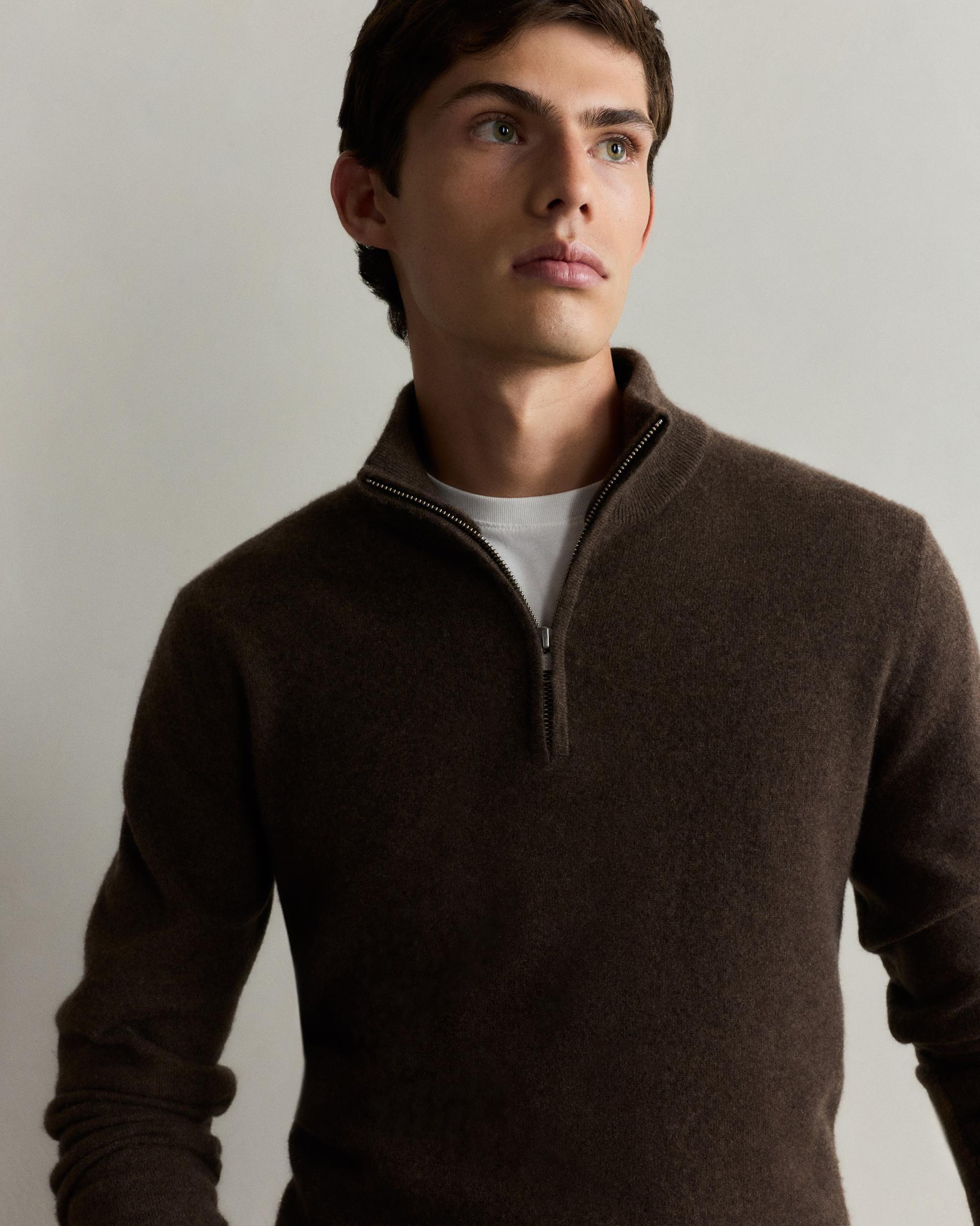 Our Mongolian Cashmere Quarter Zip Sweater is designed for ultimate comfort—cozy yet lightweight, ideal for layering. Featuring ribbed cuffs and a structured collar, it’s made from sustainably sourced cashmere that’s three times warmer than wool. We’ve upgraded our cashmere to be our softest yet, with an irresistibly smooth feel, a thicker, cozier texture, and enhanced durability that keeps it looking fresh season after season. | Quince | Men's Mongolian Cashmere Quarter Zip Sweater in Brown, Size Medium