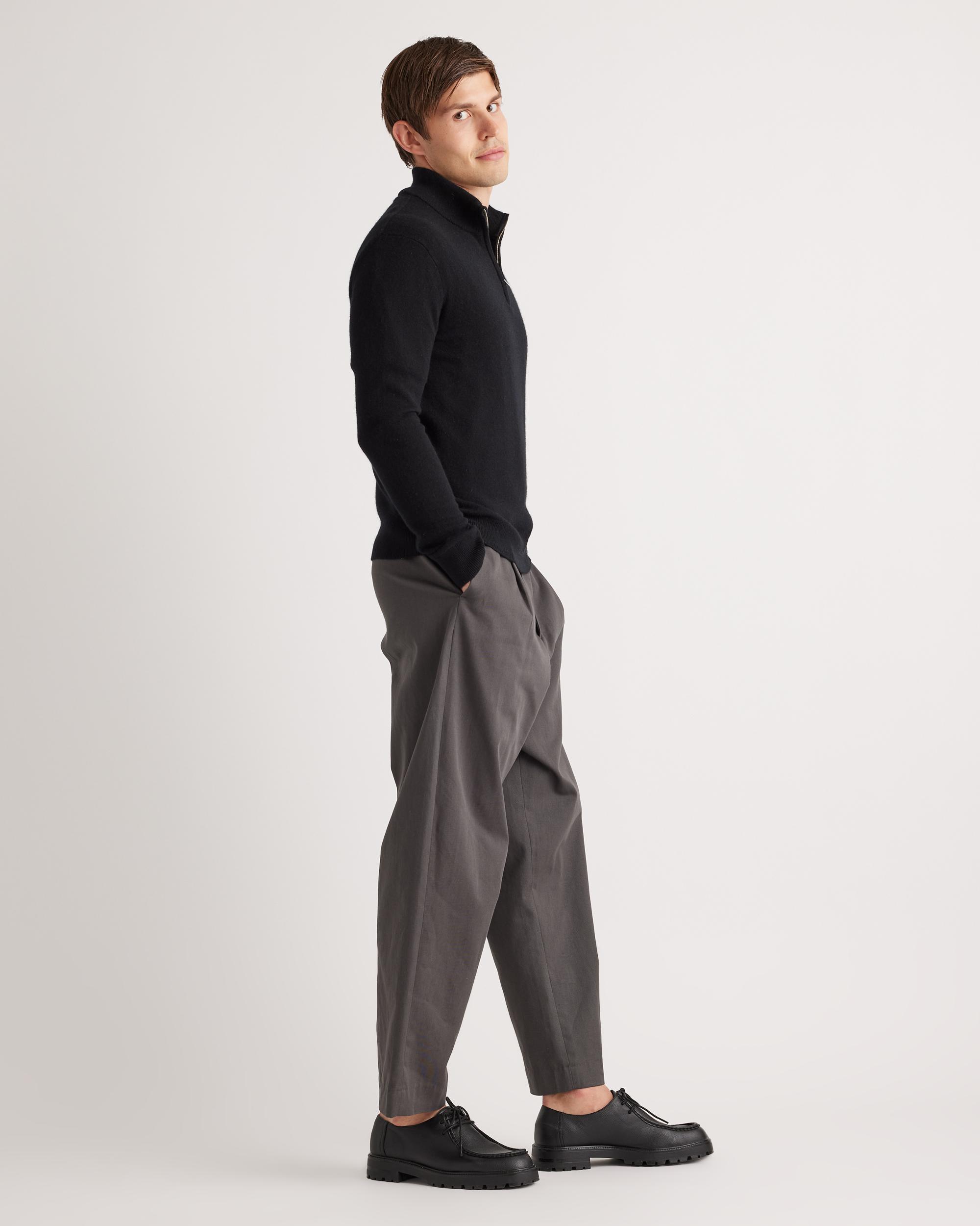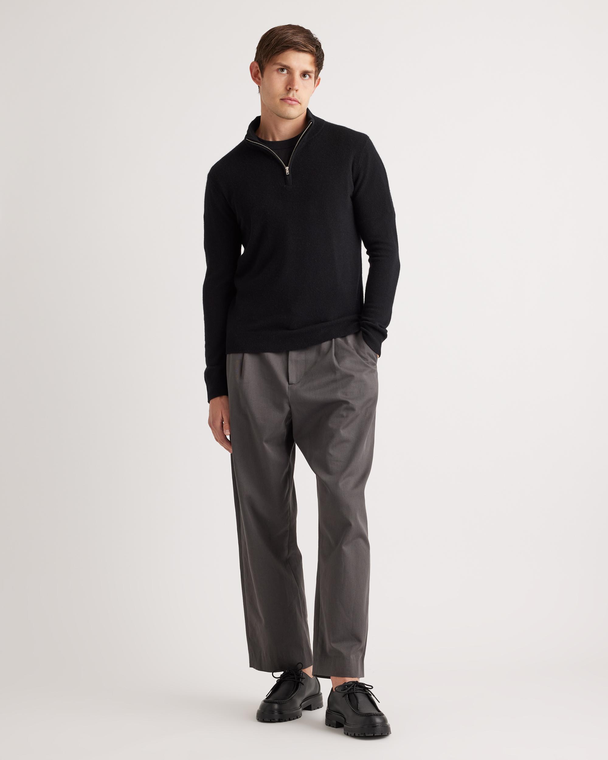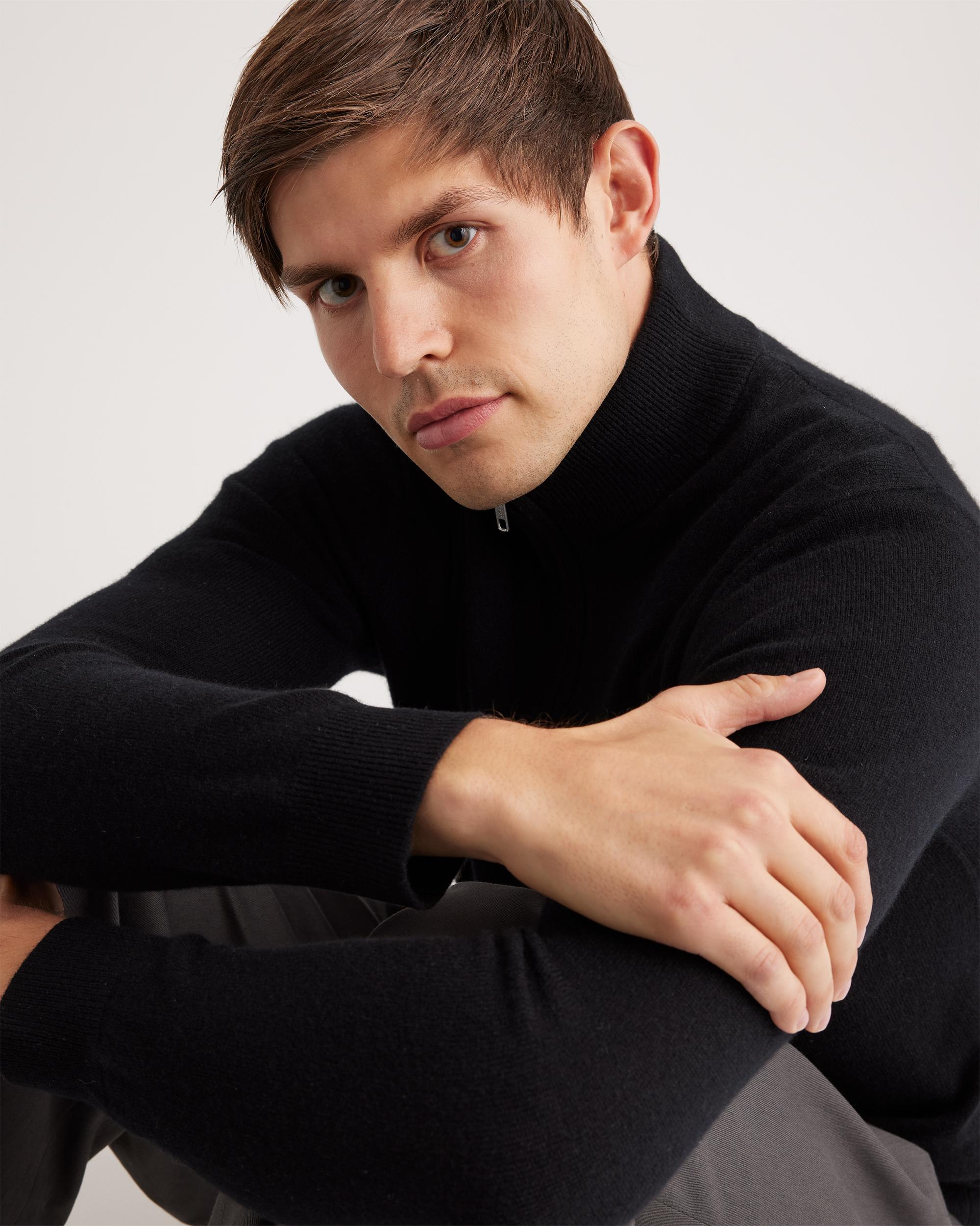 Our Mongolian Cashmere Quarter Zip Sweater is designed for ultimate comfort—cozy yet lightweight, ideal for layering. Featuring ribbed cuffs and a structured collar, it’s made from sustainably sourced cashmere that’s three times warmer than wool. We’ve upgraded our cashmere to be our softest yet, with an irresistibly smooth feel, a thicker, cozier texture, and enhanced durability that keeps it looking fresh season after season. | Quince | Men's Mongolian Cashmere Quarter Zip Sweater in Black, Size XXL