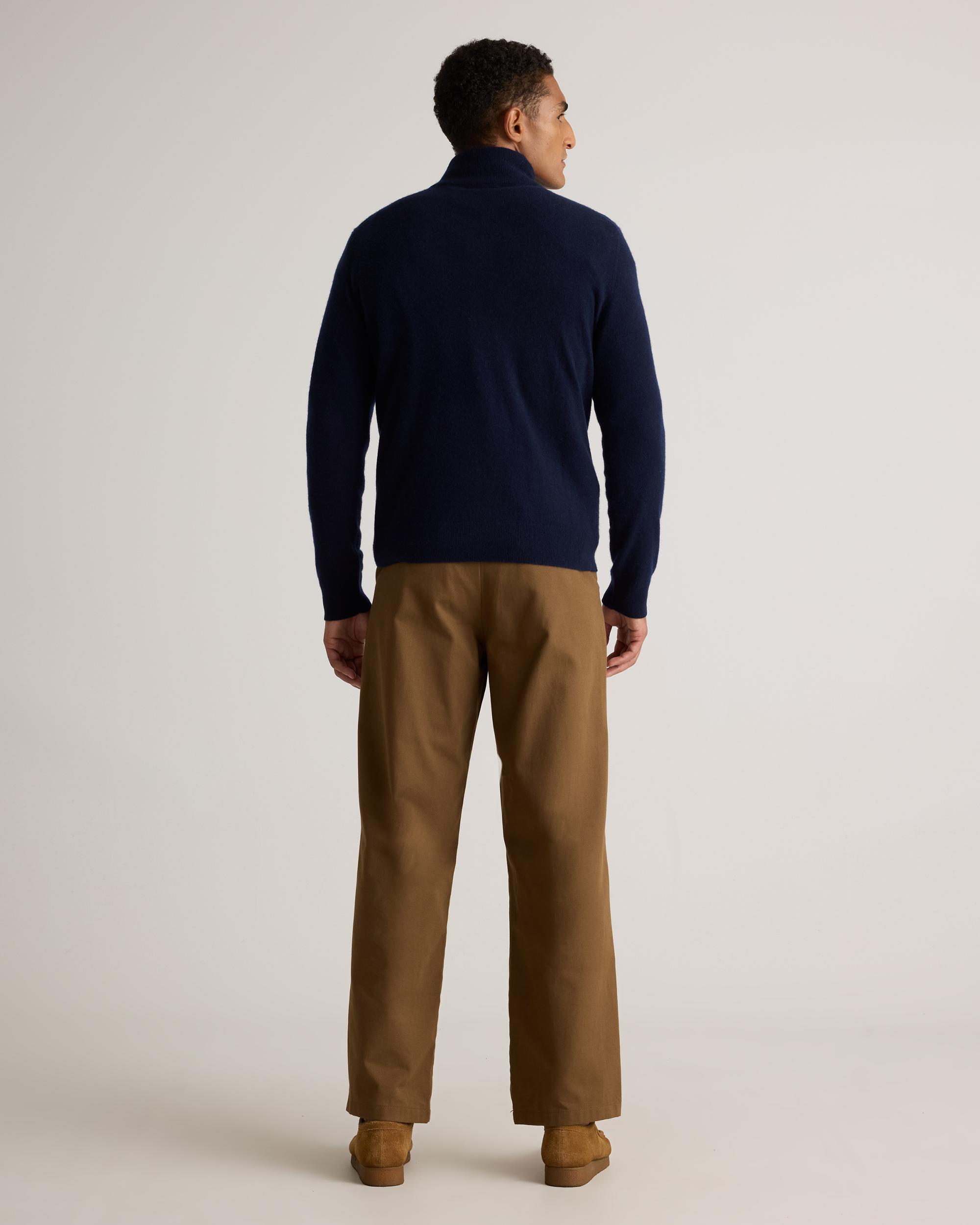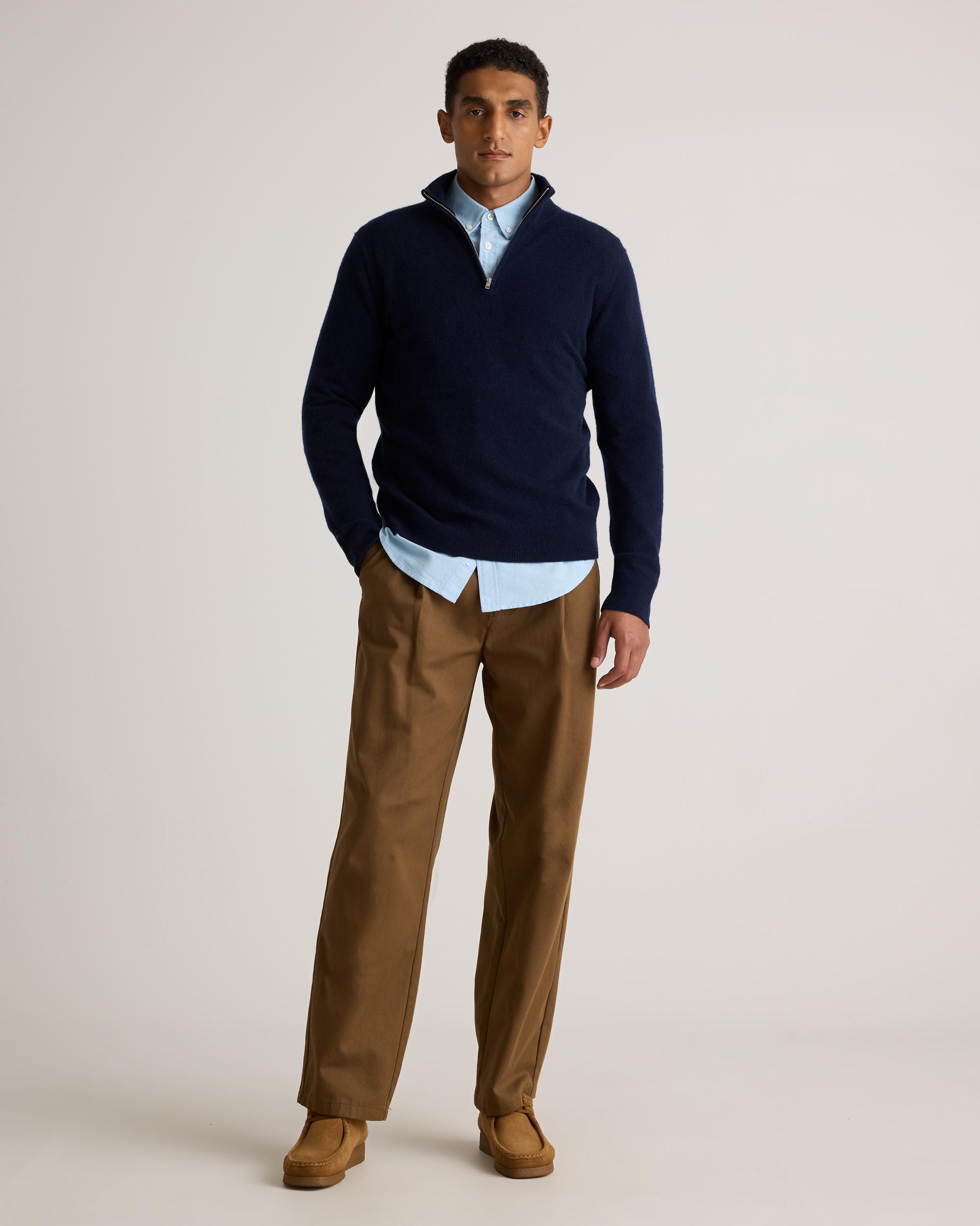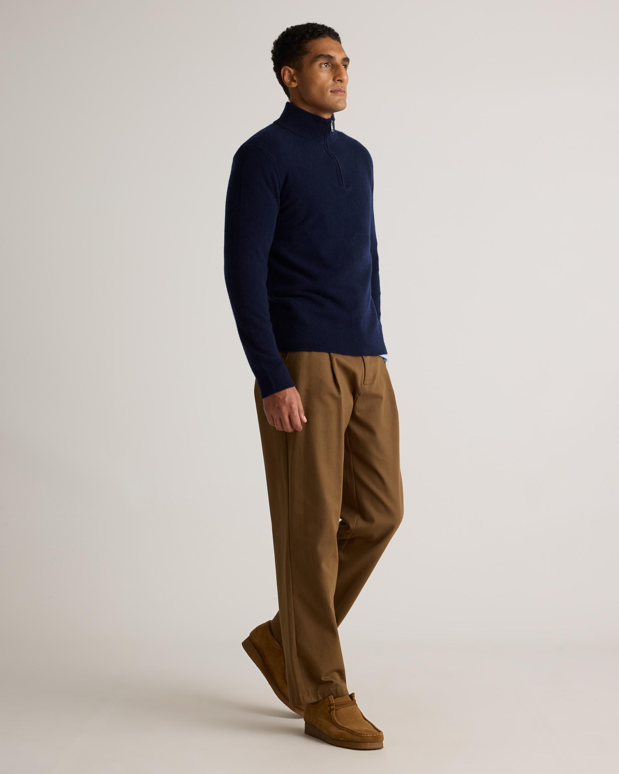 Our Mongolian Cashmere Quarter Zip Sweater is designed for ultimate comfort—cozy yet lightweight, ideal for layering. Featuring ribbed cuffs and a structured collar, it’s made from sustainably sourced cashmere that’s three times warmer than wool. We’ve upgraded our cashmere to be our softest yet, with an irresistibly smooth feel, a thicker, cozier texture, and enhanced durability that keeps it looking fresh season after season. | Quince | Men's Mongolian Cashmere Quarter Zip Sweater in True Navy, Size Small