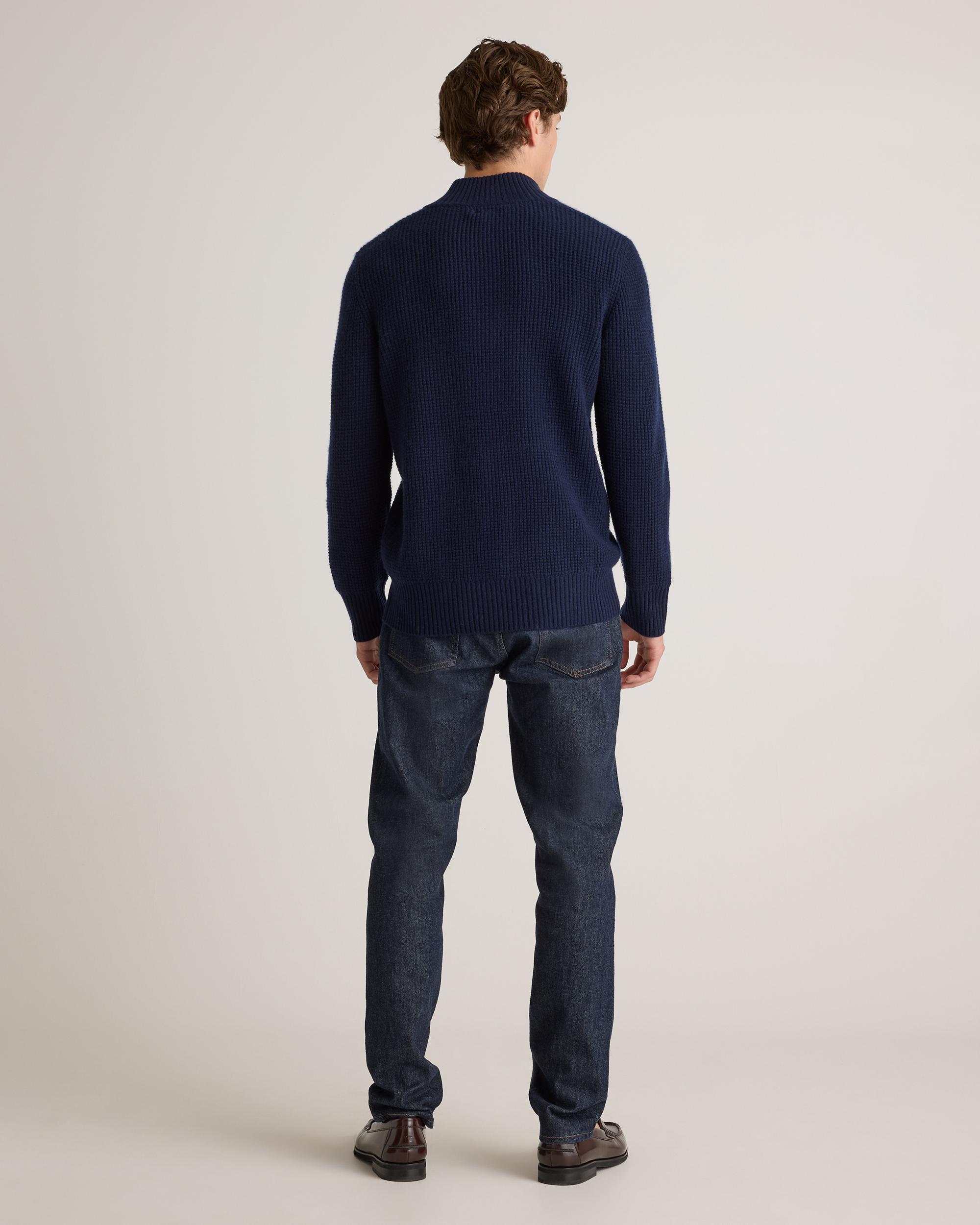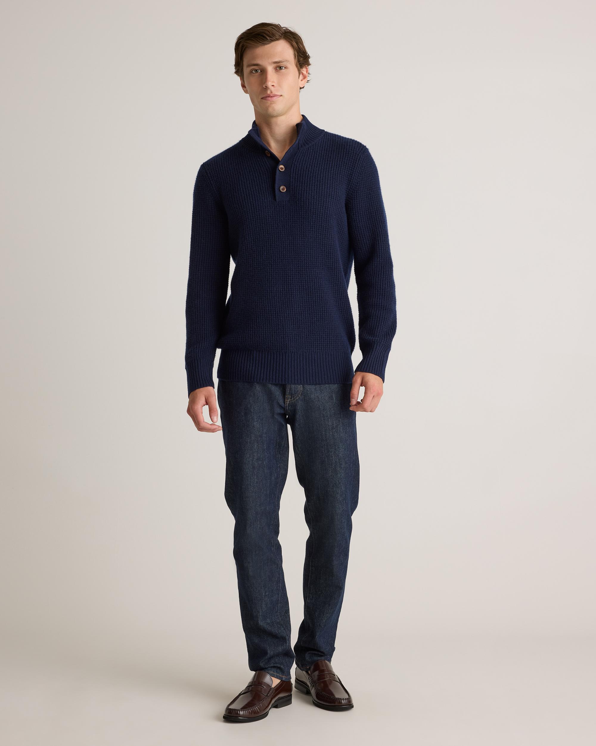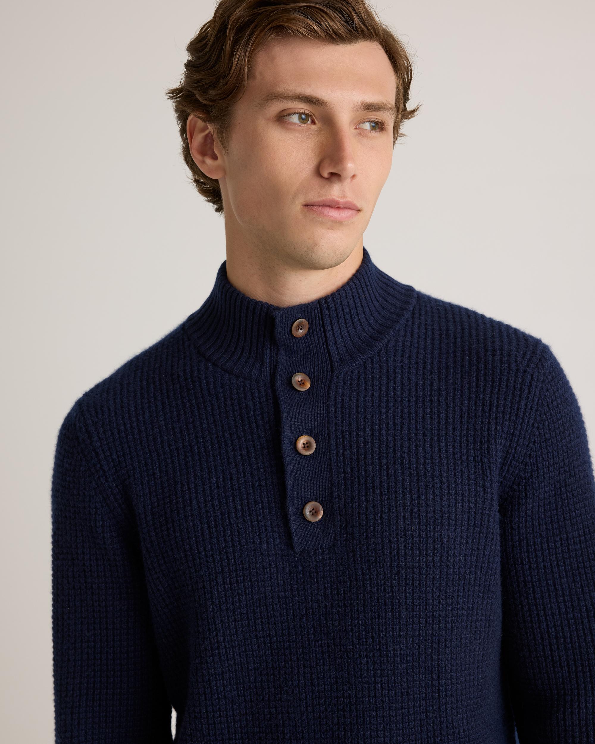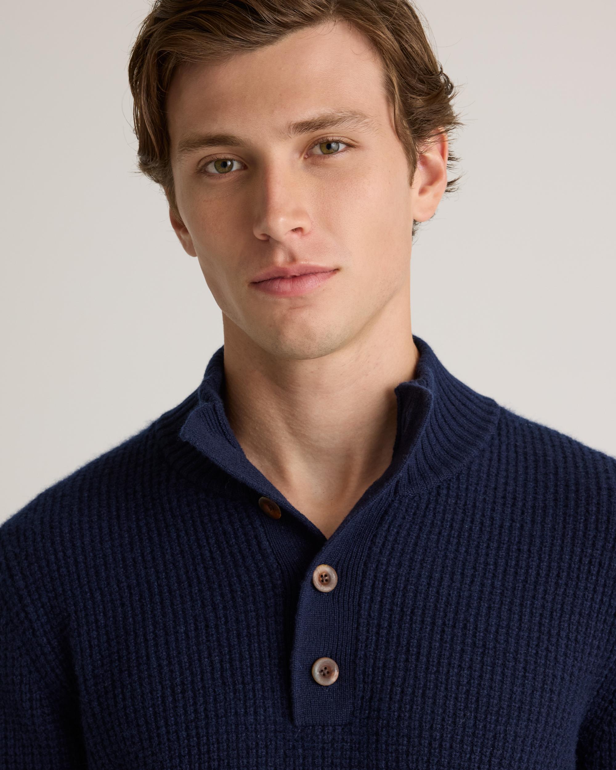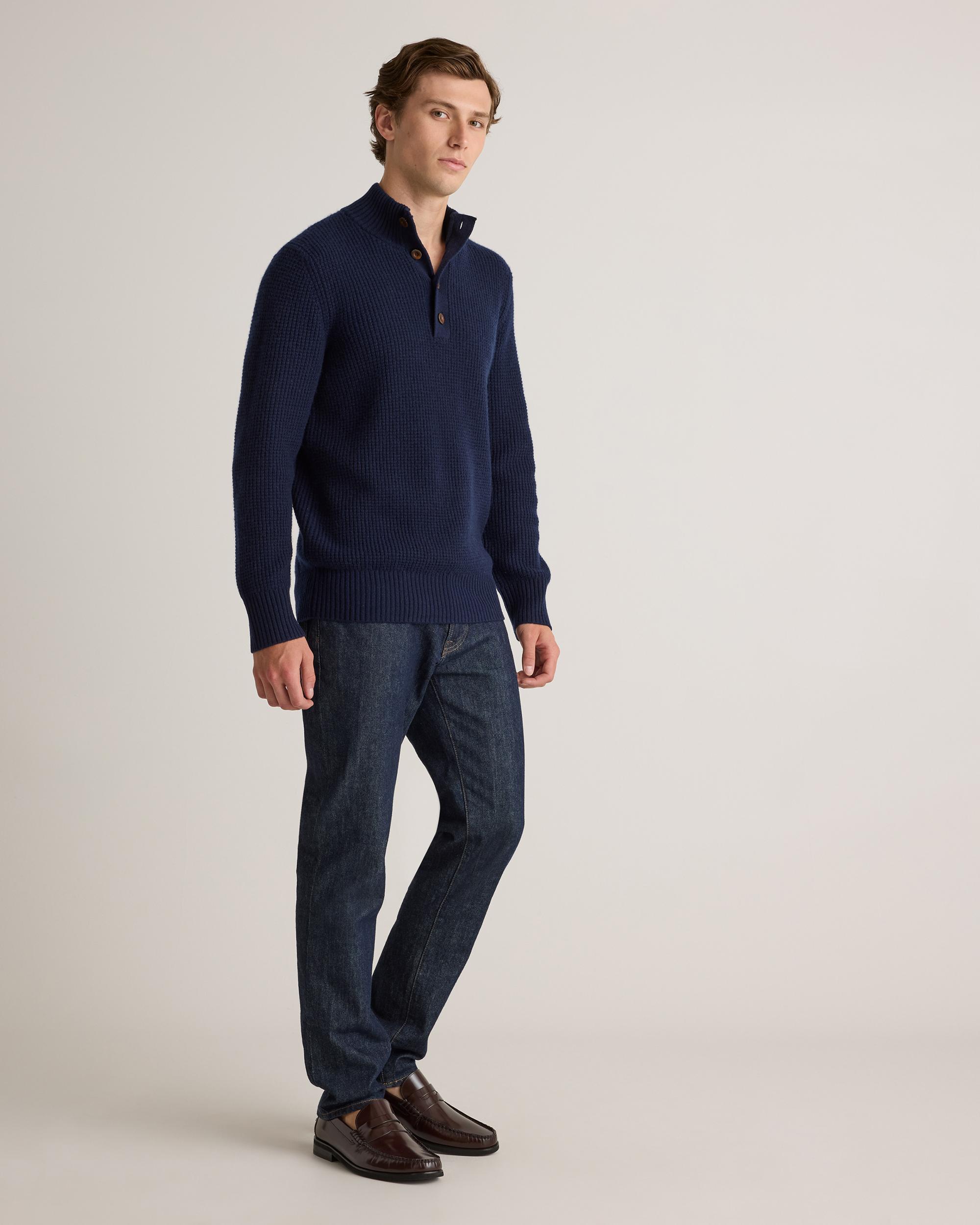 It's giving thermal vibes but way more luxury. Our Mongolian Cashmere Waffle Quarter Button Sweater is ultra soft, cozy, and made to last. Plus, it layers perfectly over your favorite t-shirt or under a jacket when the temperature starts to drop. Crafted with a denser, more substantial knit, our Signature cashmere offers unmatched warmth and softness for cooler weather. Designed to last and feels smoother and richer with every wear. Made of Grade-A cashmere sourced from Mongolia, we dare you to find something softer. | Quince | Men's Mongolian Cashmere Waffle Quarter Button Sweater in True Navy, Size Medium