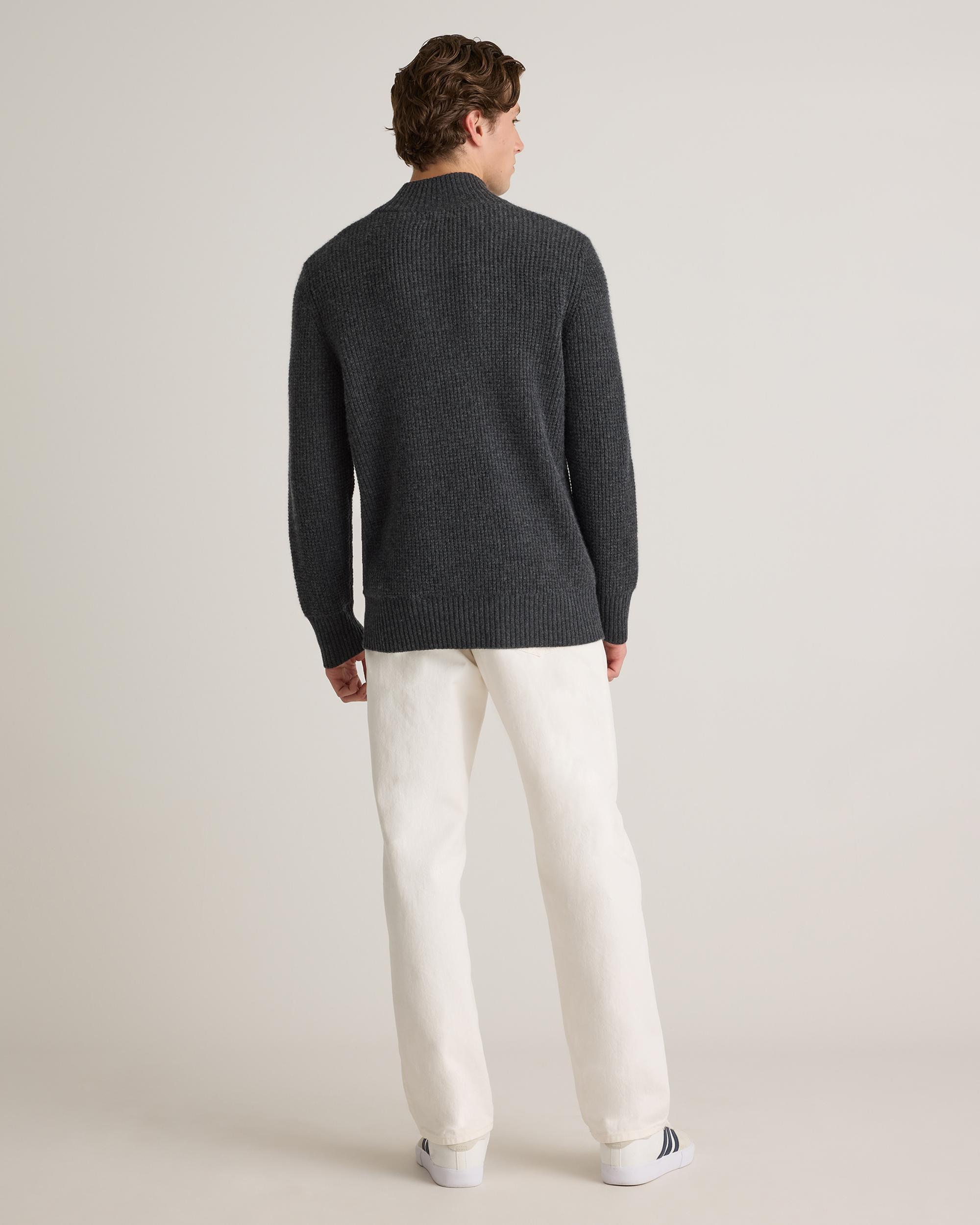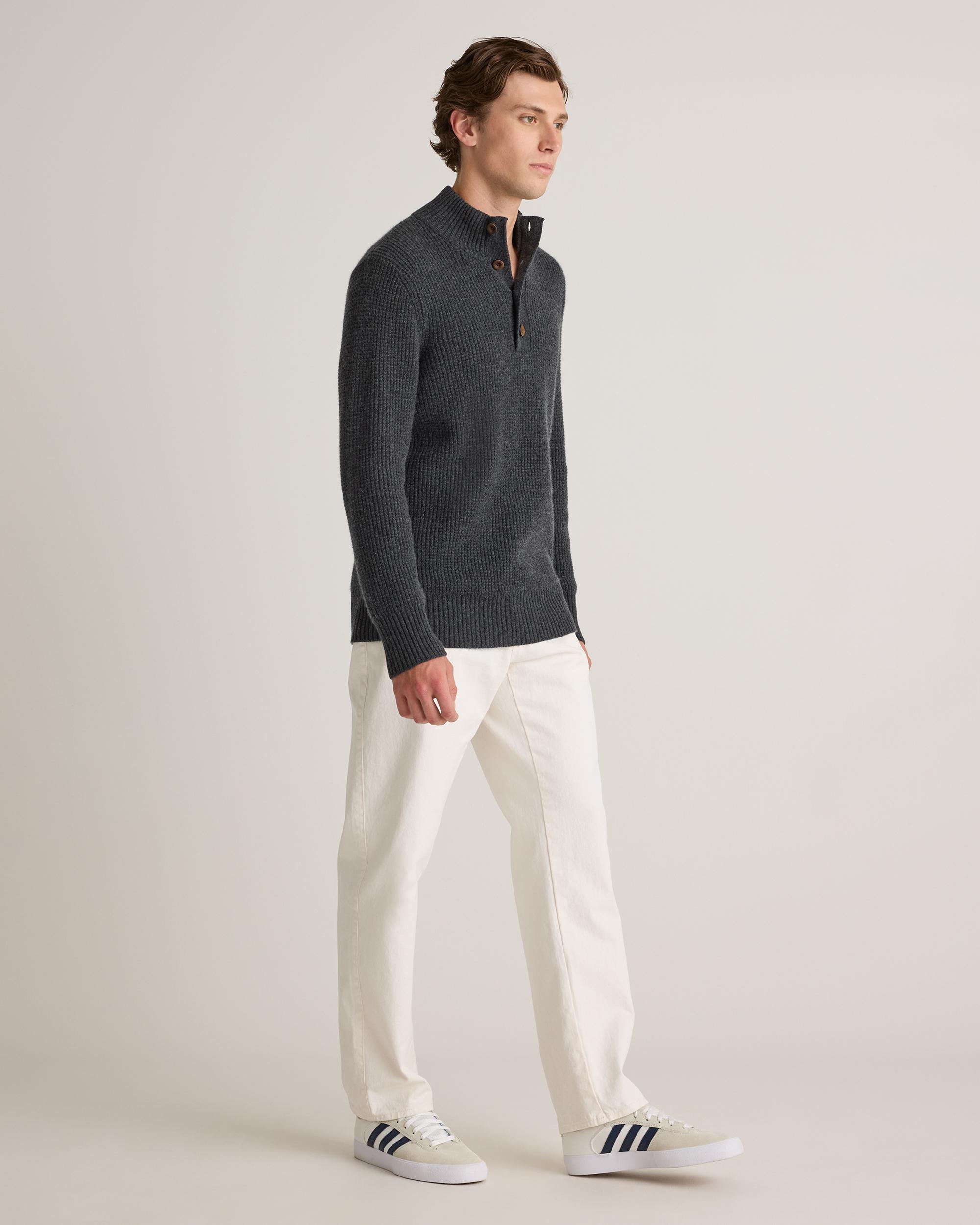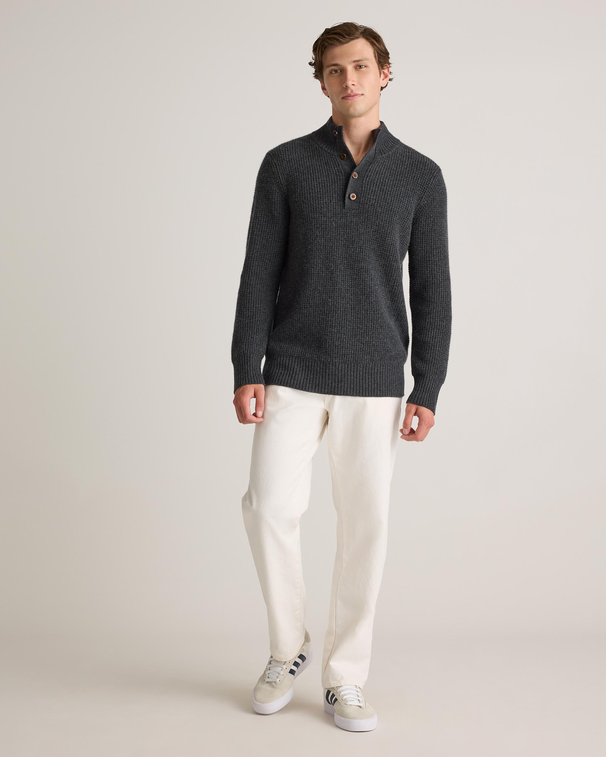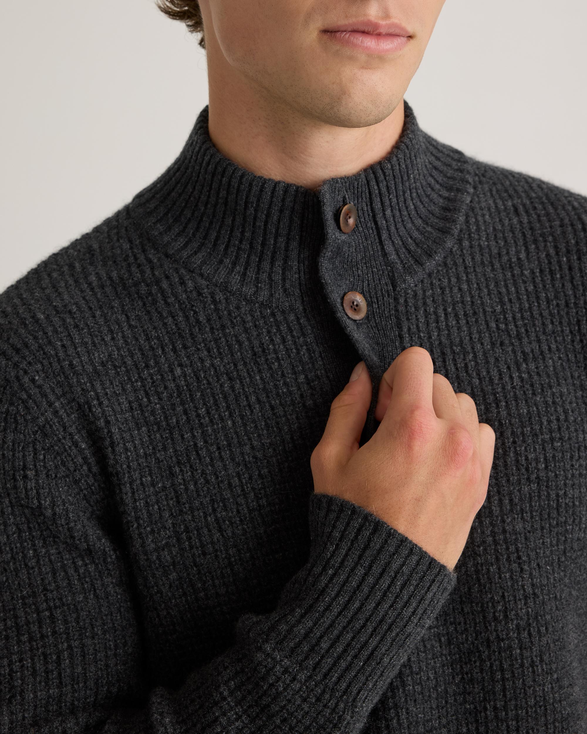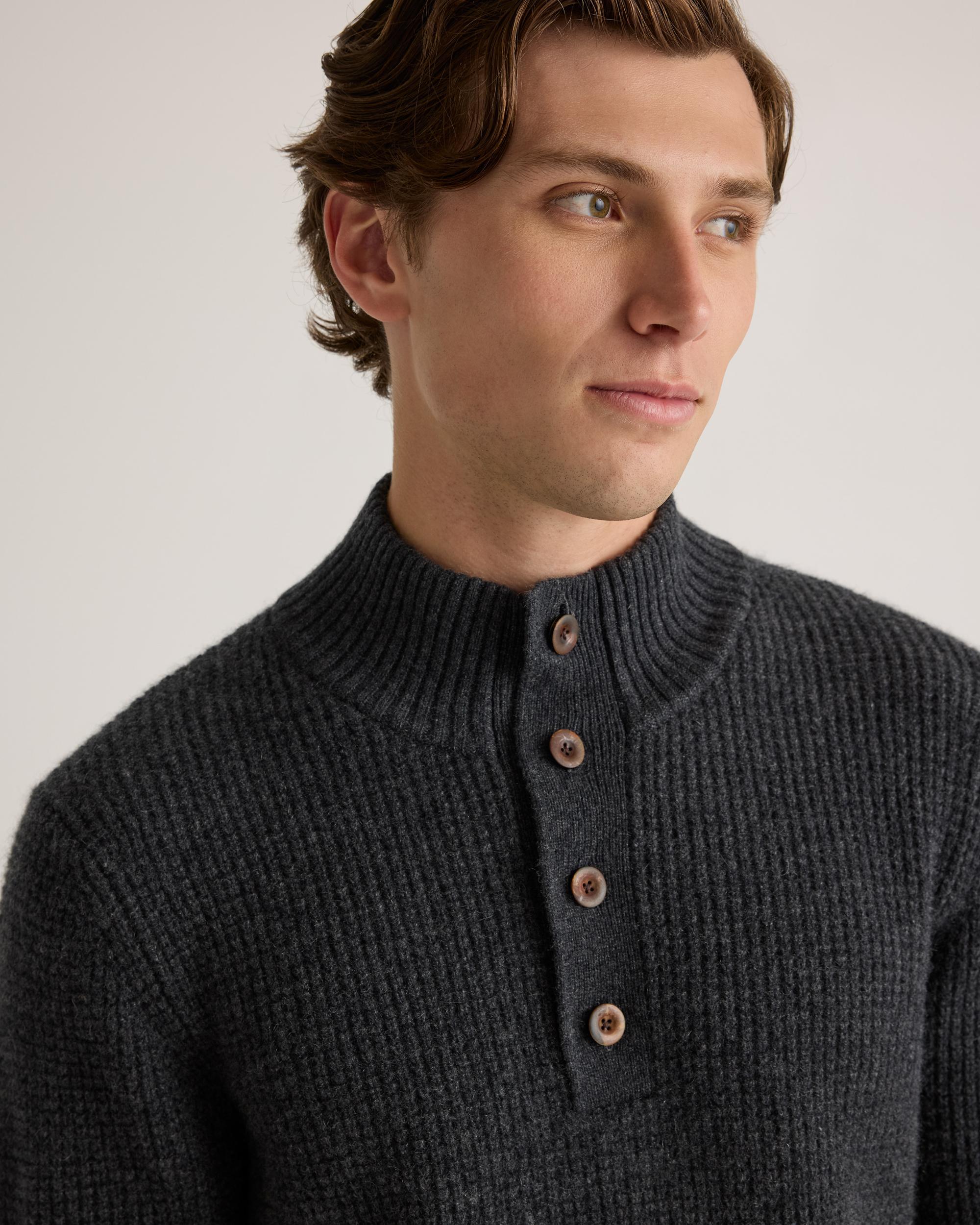 It's giving thermal vibes but way more luxury. Our Mongolian Cashmere Waffle Quarter Button Sweater is ultra soft, cozy, and made to last. Plus, it layers perfectly over your favorite t-shirt or under a jacket when the temperature starts to drop. Crafted with a denser, more substantial knit, our Signature cashmere offers unmatched warmth and softness for cooler weather. Designed to last and feels smoother and richer with every wear. Made of Grade-A cashmere sourced from Mongolia, we dare you to find something softer. | Quince | Men's Mongolian Cashmere Waffle Quarter Button Sweater in Heather Charcoal, Size XL