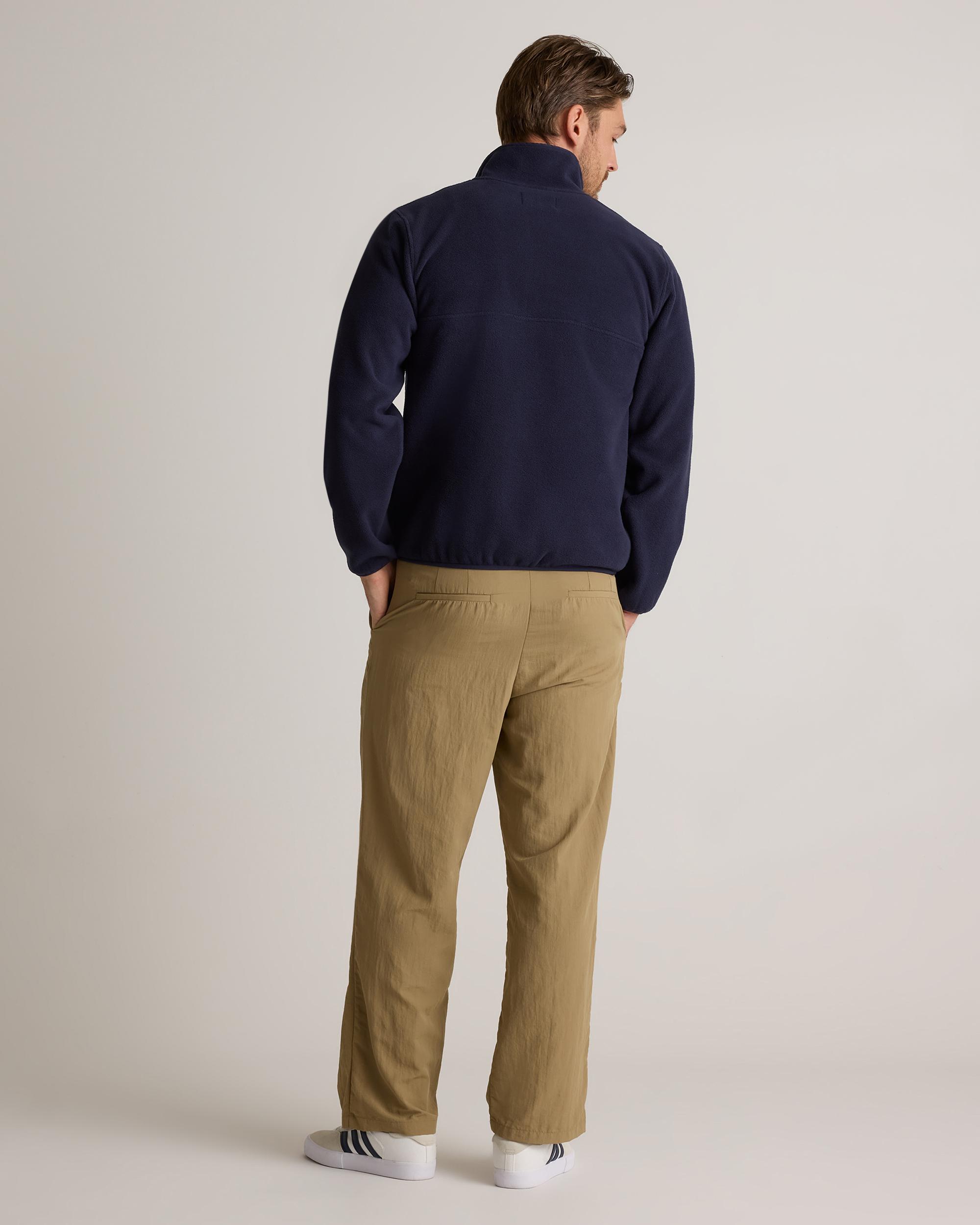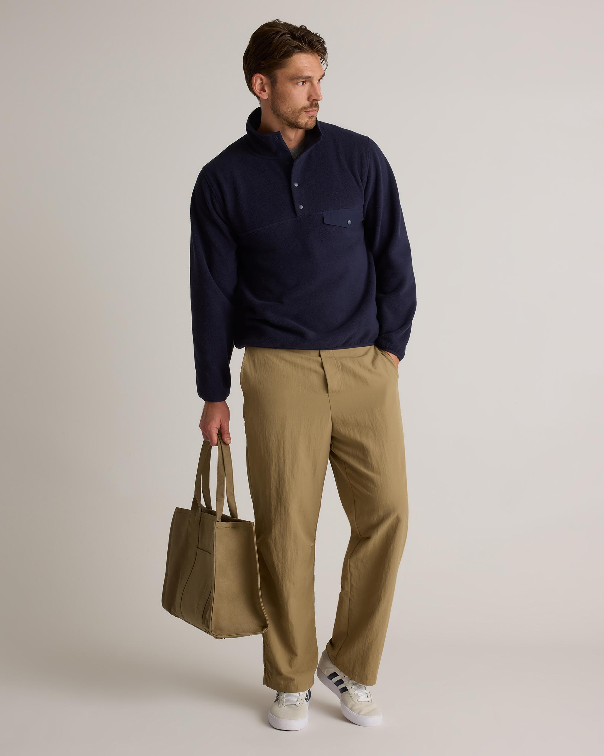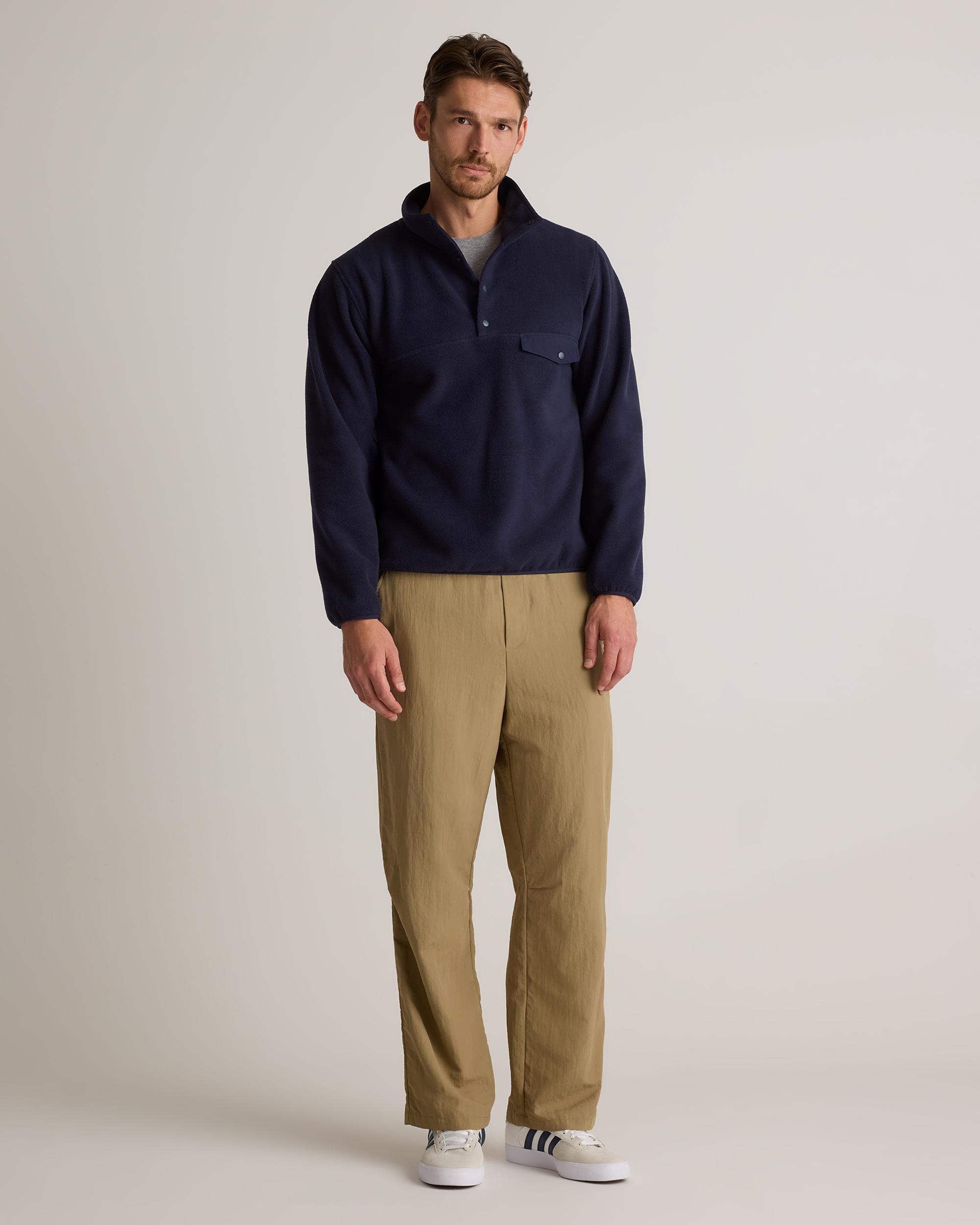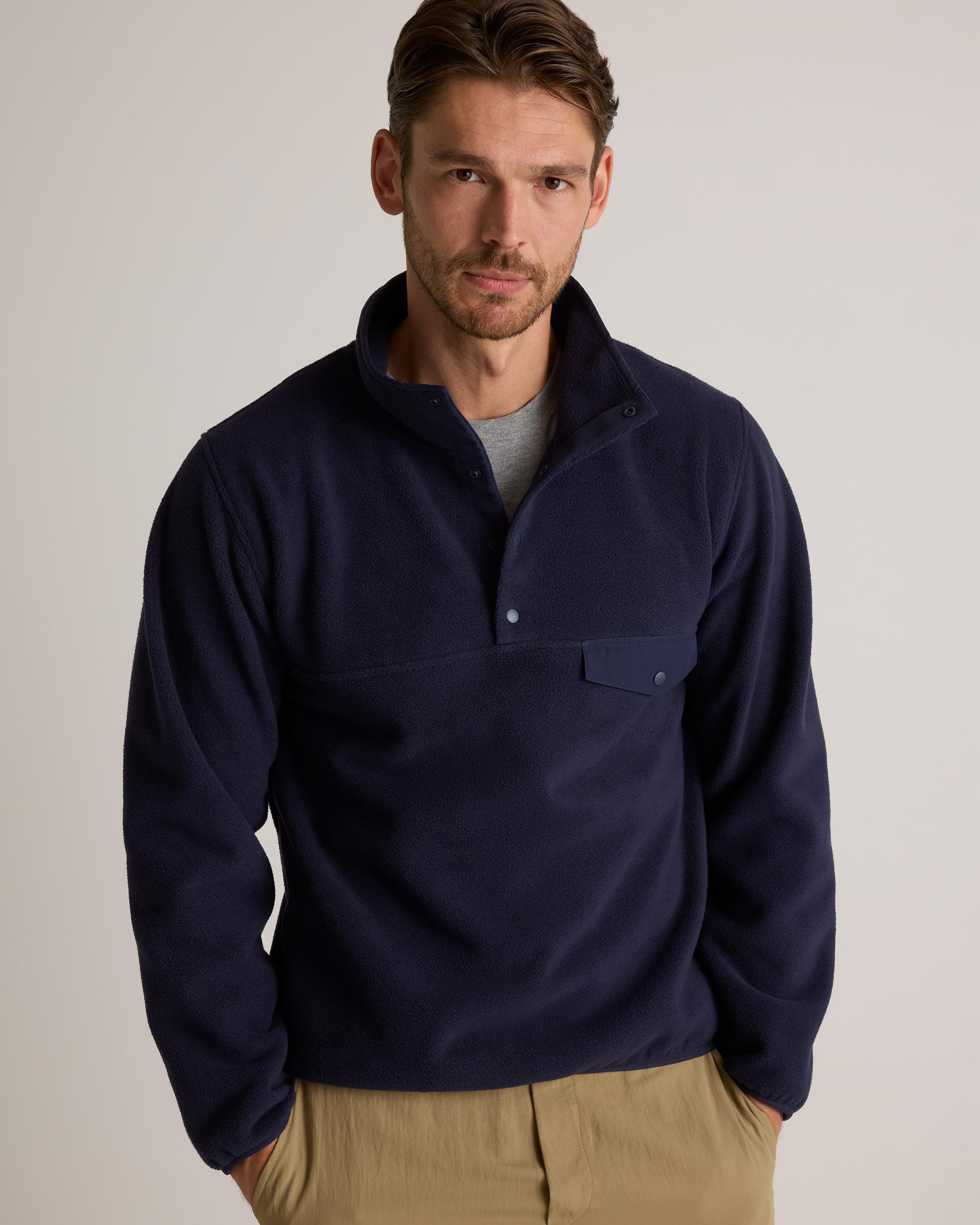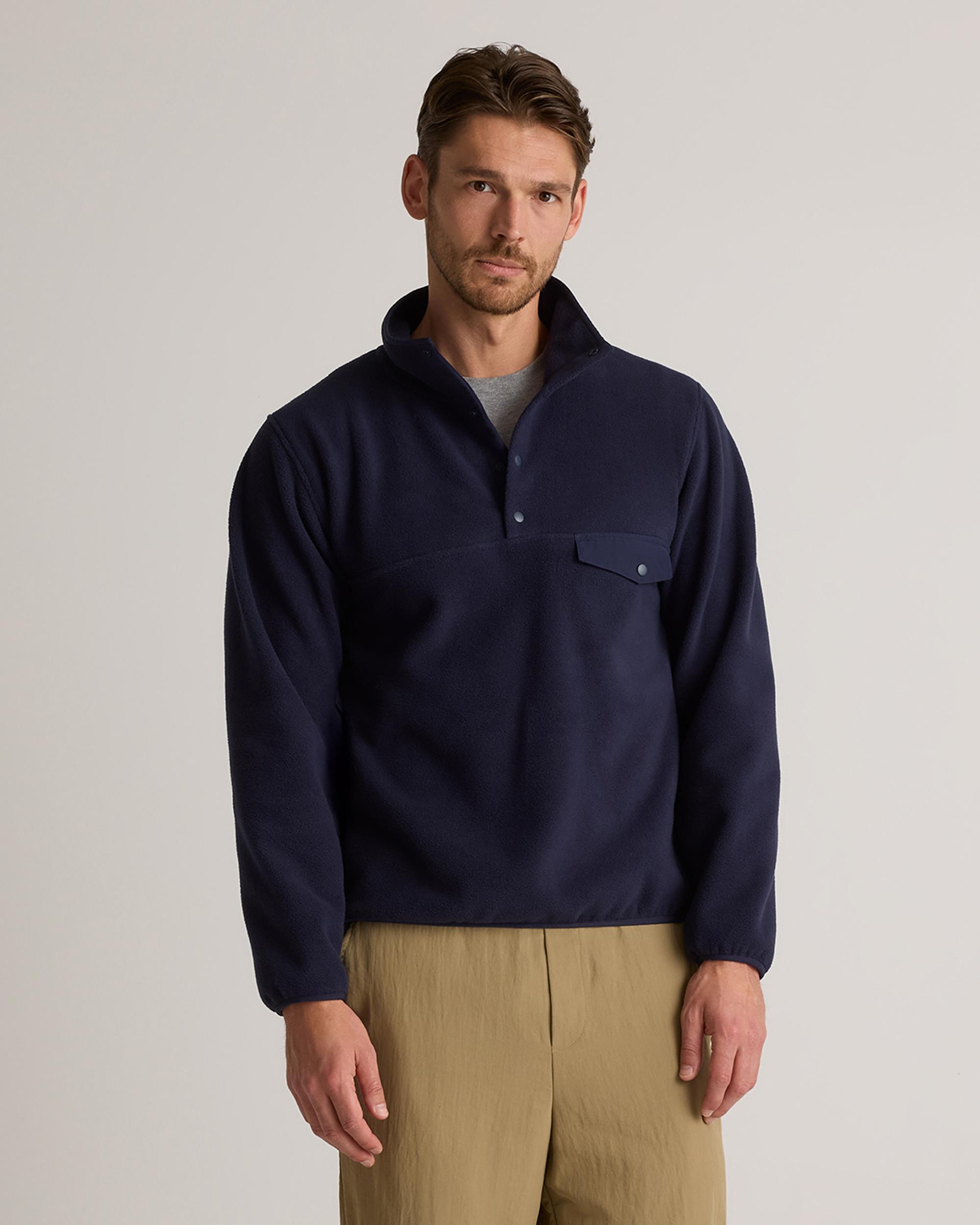 Our Polar Fleece Snap Pullover is sure to be your new go-to for lightweight warmth and effortless style. Crafted from ultra-soft, insulating polar fleece, this pullover brings a cozy layer to cool days. Featuring a high collar with snap-button closure, it offers adjustable comfort and a classic look. The slightly relaxed fit is perfect for layering over your favorite tee or under a jacket. Whether you're hiking the trails or just out and about, this pullover is designed to keep you warm and looking sharp. | Quince | Men's Polar Fleece Snap Pullover in Deep Navy, Size Large, Recycled Polyester