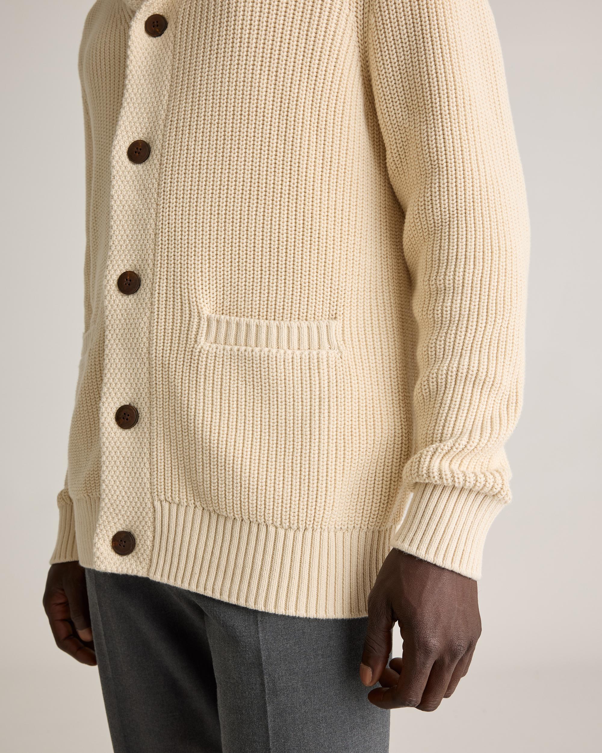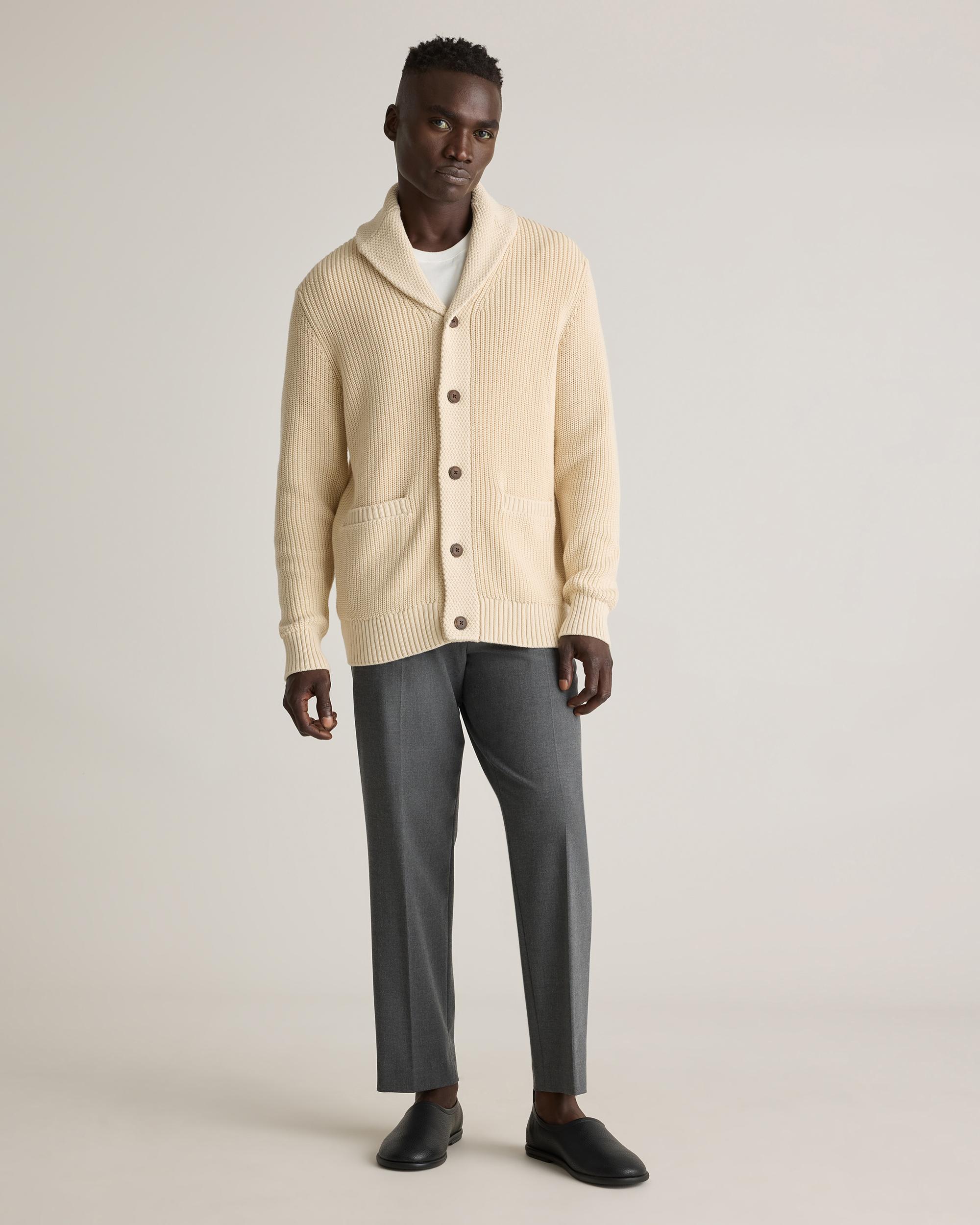 Get all buttoned up in this updated classic. Made of 100% organic cotton, our Organic Cotton Shawl-Collar Cardigan Sweater is soft on your skin and timeless by design. This ribbed cardigan sweater is chunky, cozy, and ideal for a bit of extra warmth on chilly days. Easy to layer, it pairs perfectly over a button-up or your favorite T-shirt. | Quince | Men's Shawl-Collar Cardigan Sweater in Alabaster, Size Large, Organic Cotton