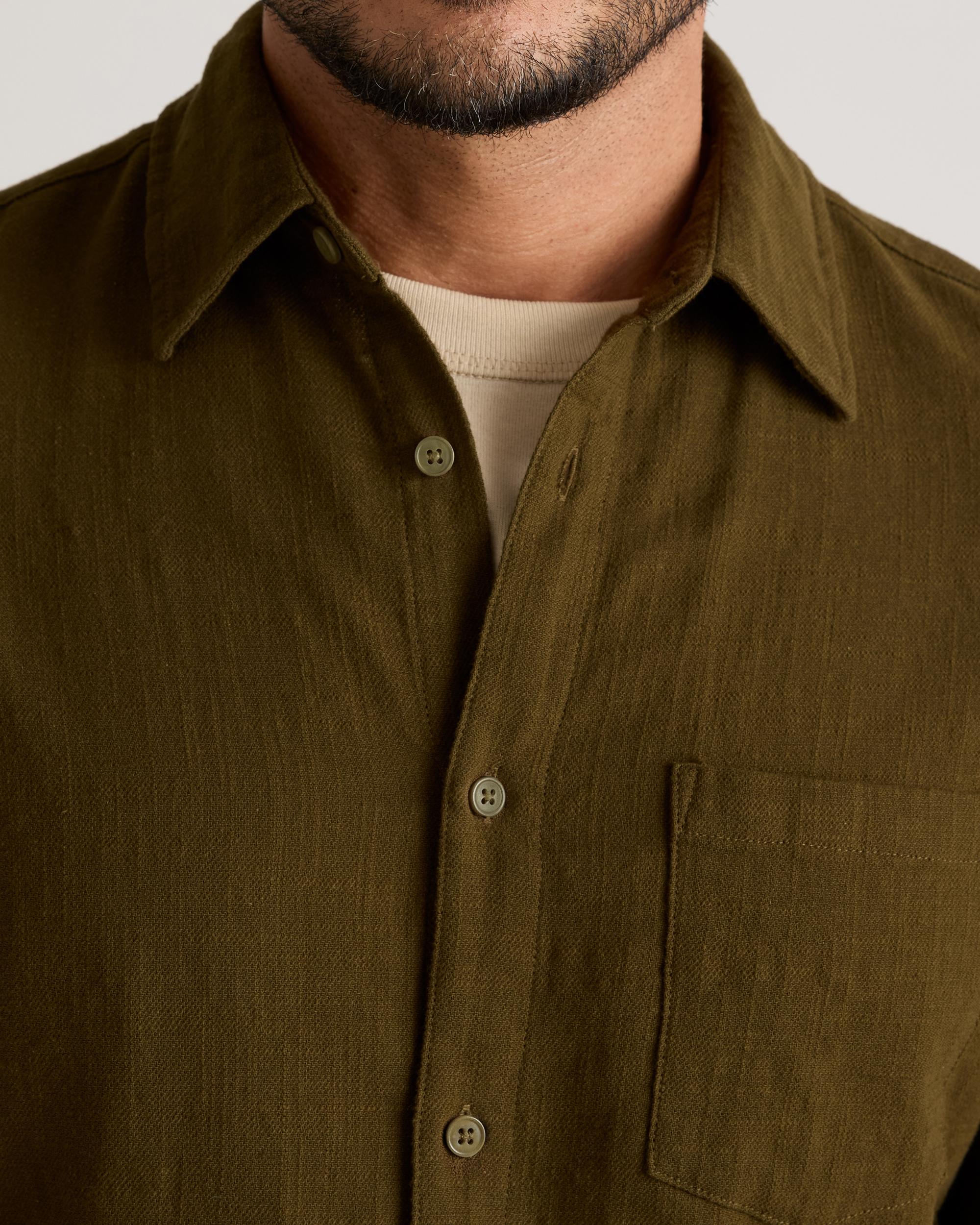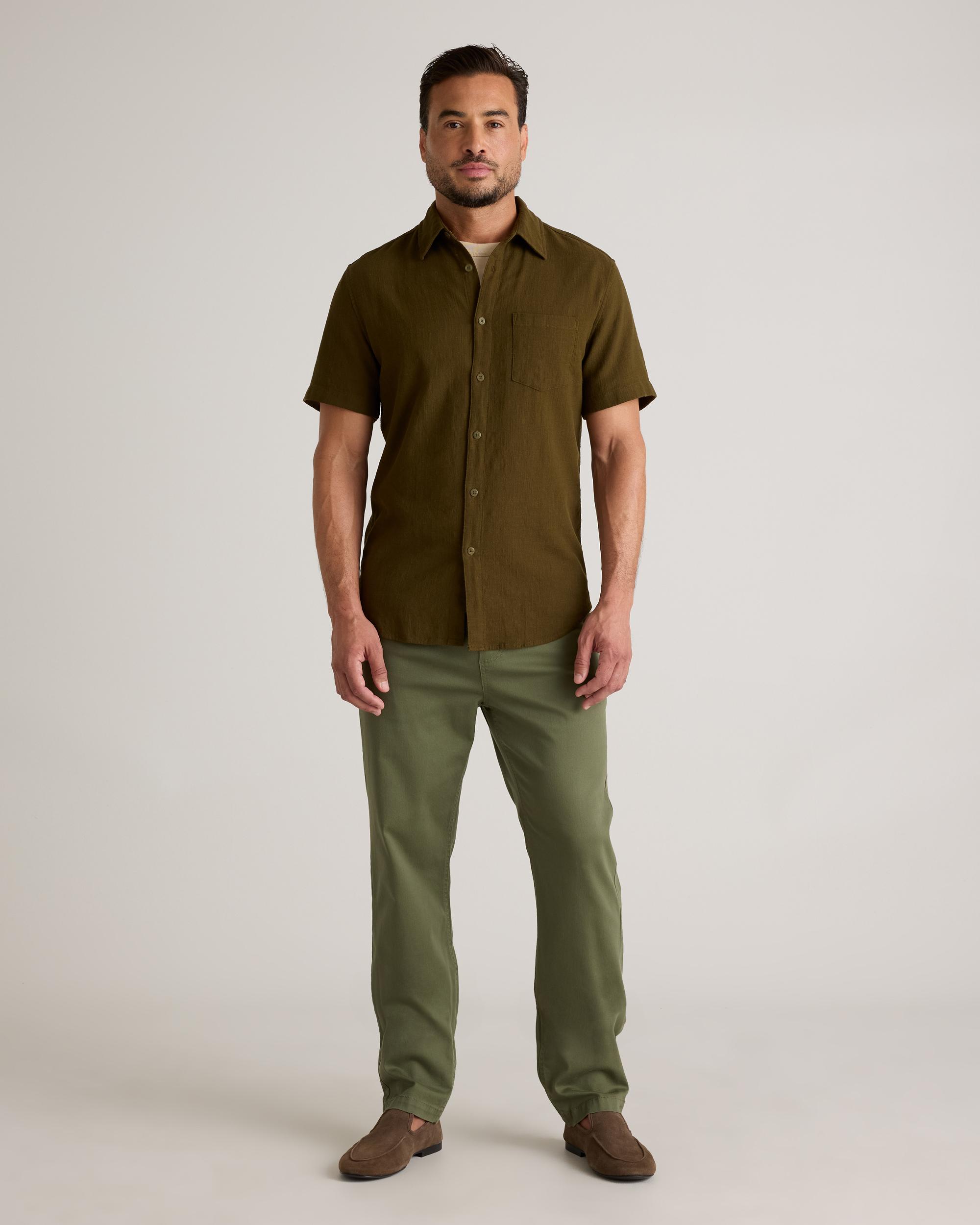 Discover the perfect blend of of comfort, durability and style with the Organic Cotton Stretch Selvage Short Sleeve Shirt. Crafted from premium organic cotton with just a touch of stretch, this shirt is designed to move with you, offering the durability of selvage fabric without sacrificing breathability and comfort. Selvage cotton is produced with a self-finished edge that prevents unraveling and results a clean, textured, polished appearance. The timeless short sleeve design, combined with a selvage finish, ensures it holds up wear after wear, while the soft, stretchy fabric gives you all-day comfort. Whether you're dressing up for a casual outing or keeping it laid-back, this shirt is your go-to for a smart, eco-friendly look that doesn’t compromise on ease. | Quince | Men's Stretch Selvage Short Sleeve Shirt in Olive, Size XL, Organic Cotton
