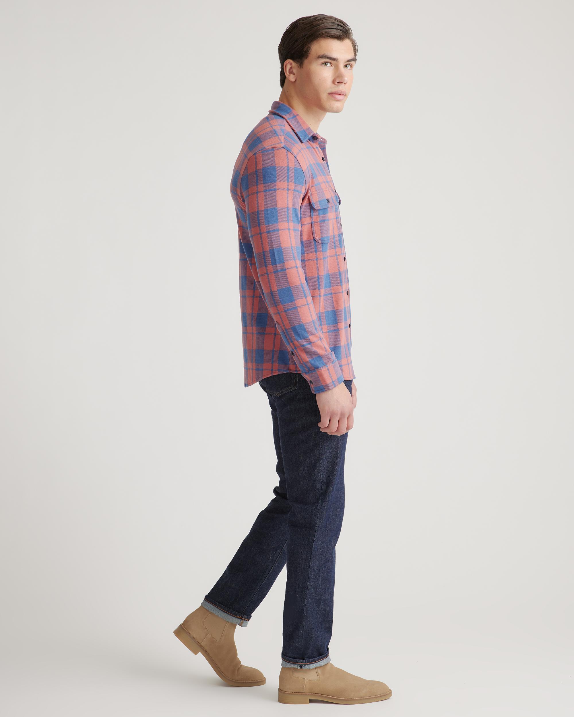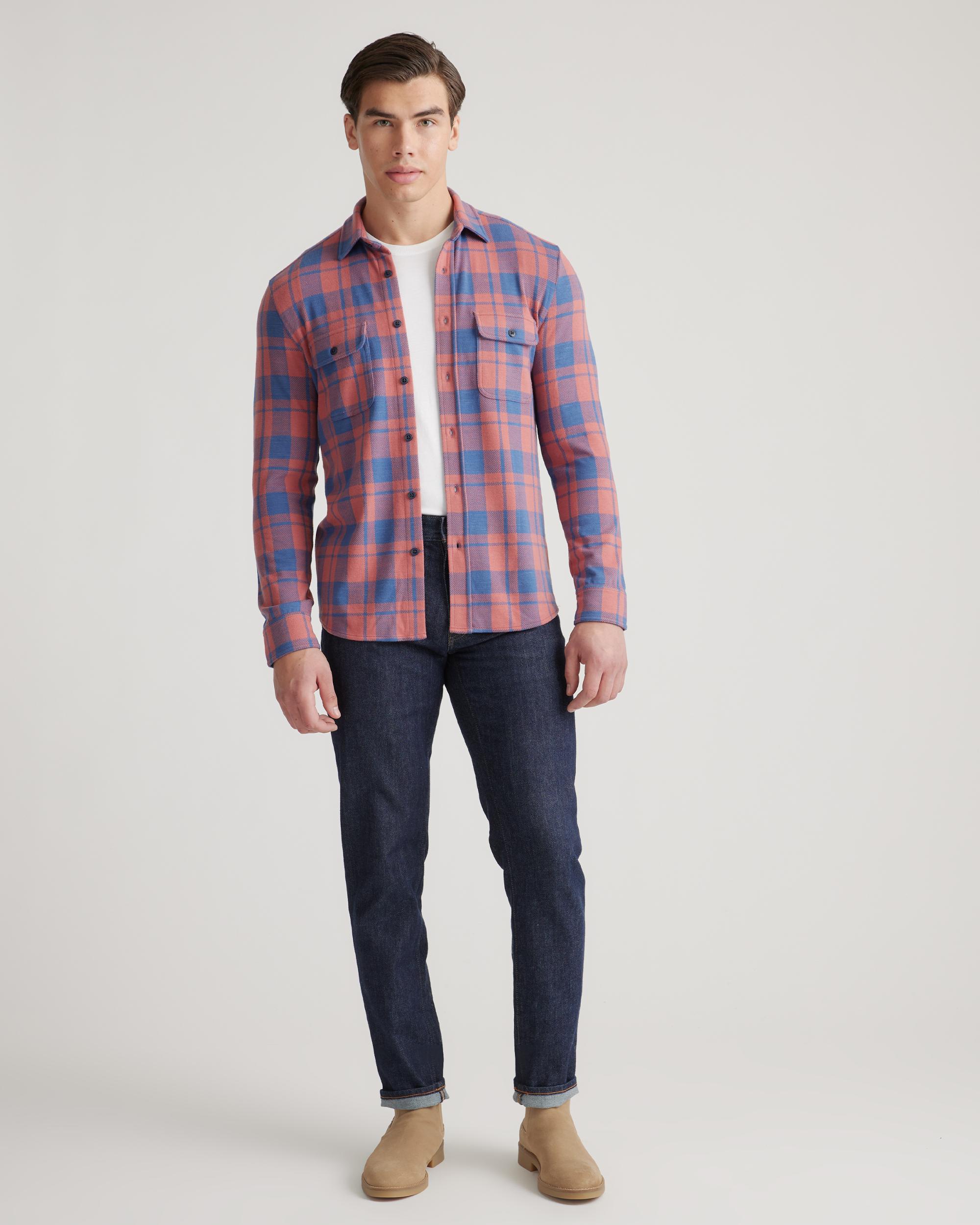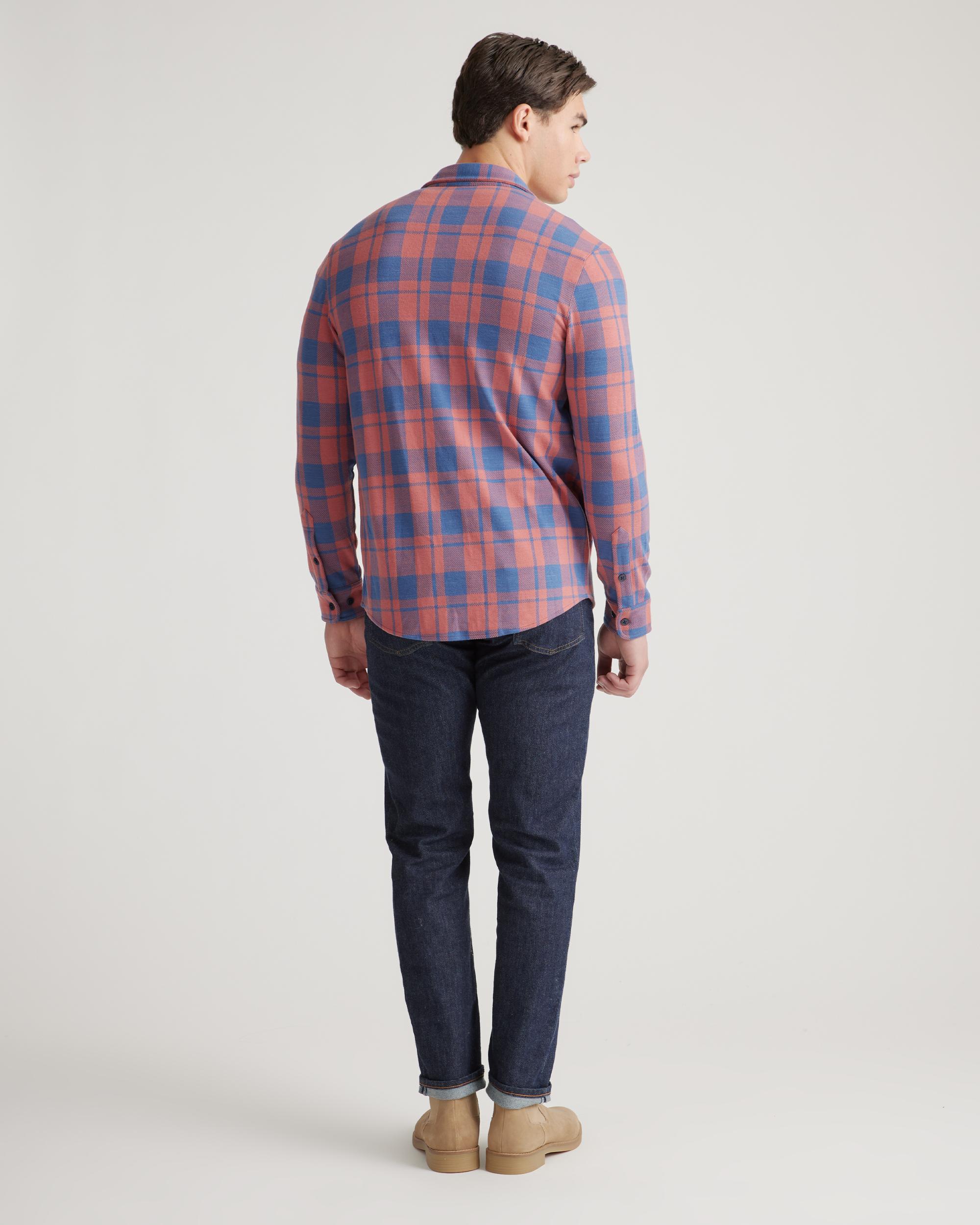 This shirt has a classic, versatile knit look that is perfect for layering. Made with super soft and stretchy fabric, it provides a natural fit on your body. | Quince | Men's Stretch Sweater Fleece Shirt in Red Check, Size XXL, Recycled Polyester