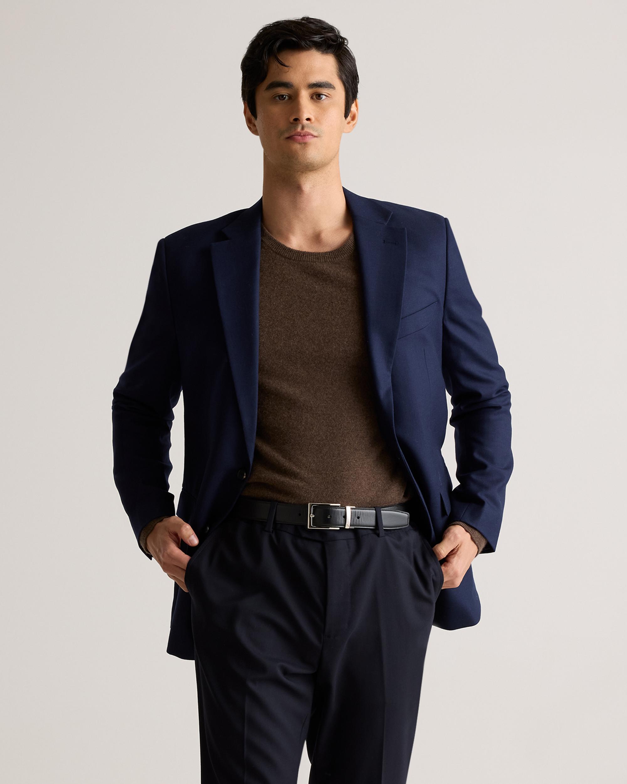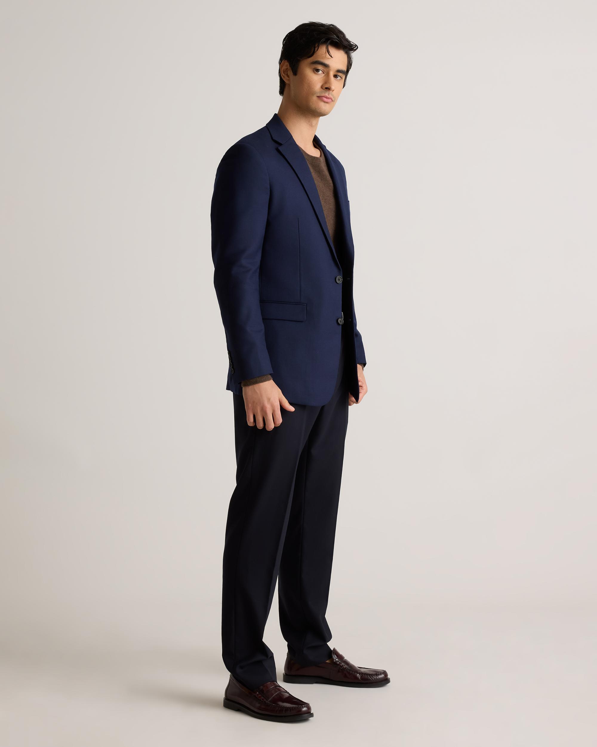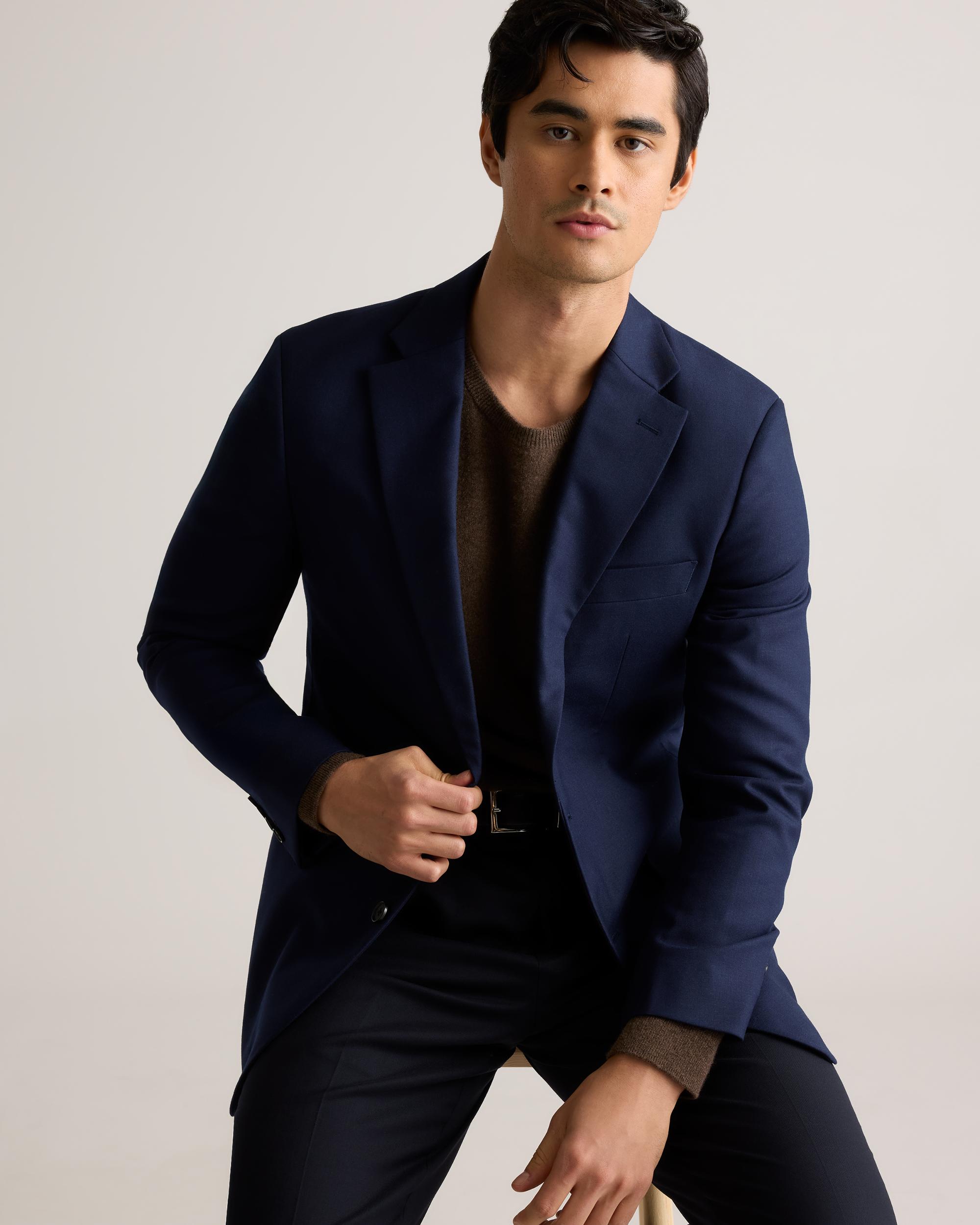 Elevate your wardrobe with our Stretch Wool Blazer, designed for the modern man who values both style and comfort. Its versatile design makes it suitable for various occasions, from formal events to casual gatherings. Pair it with our matching Stretch Wool Dress Pant for a sophisticated look or dress it down with jeans for a smart-casual ensemble. | Quince | Men's Stretch Wool Blazer in Navy, Size XL