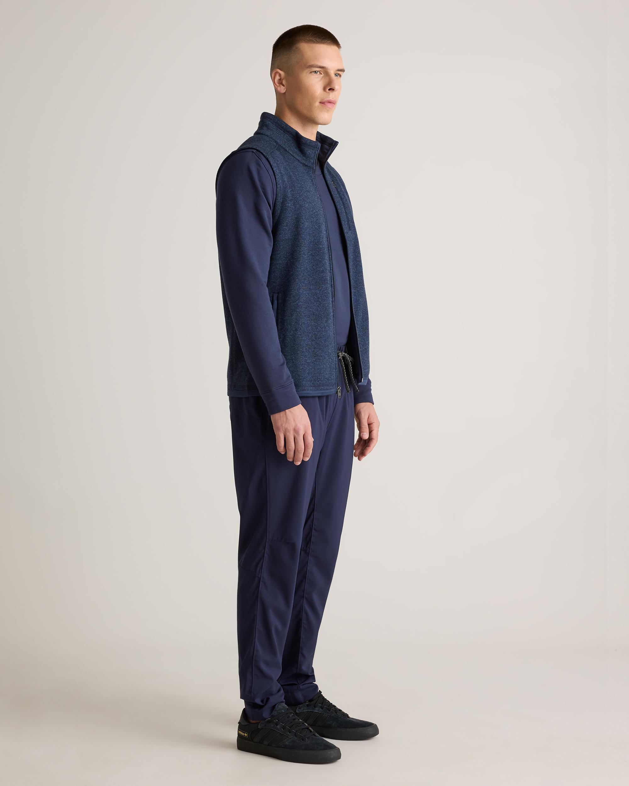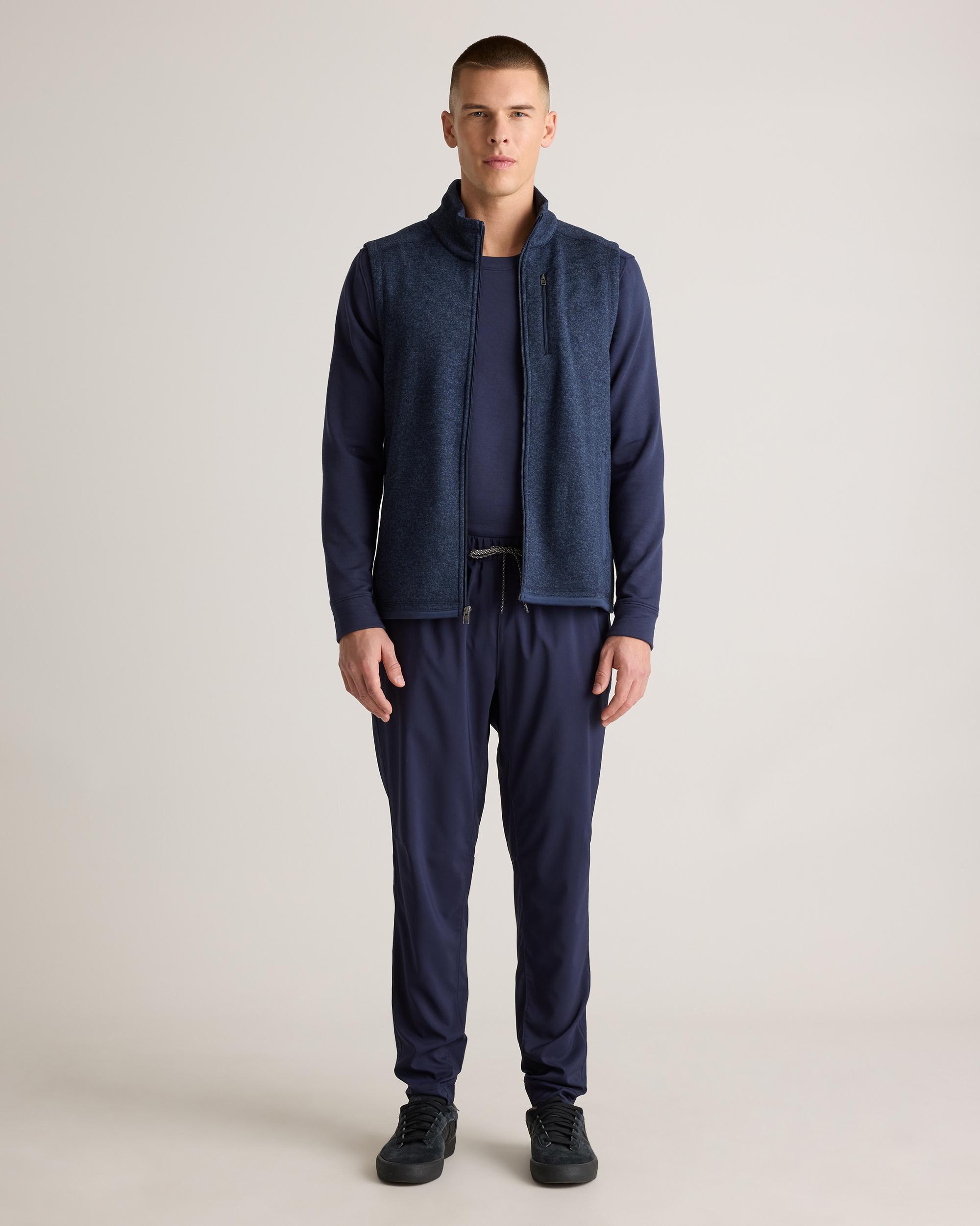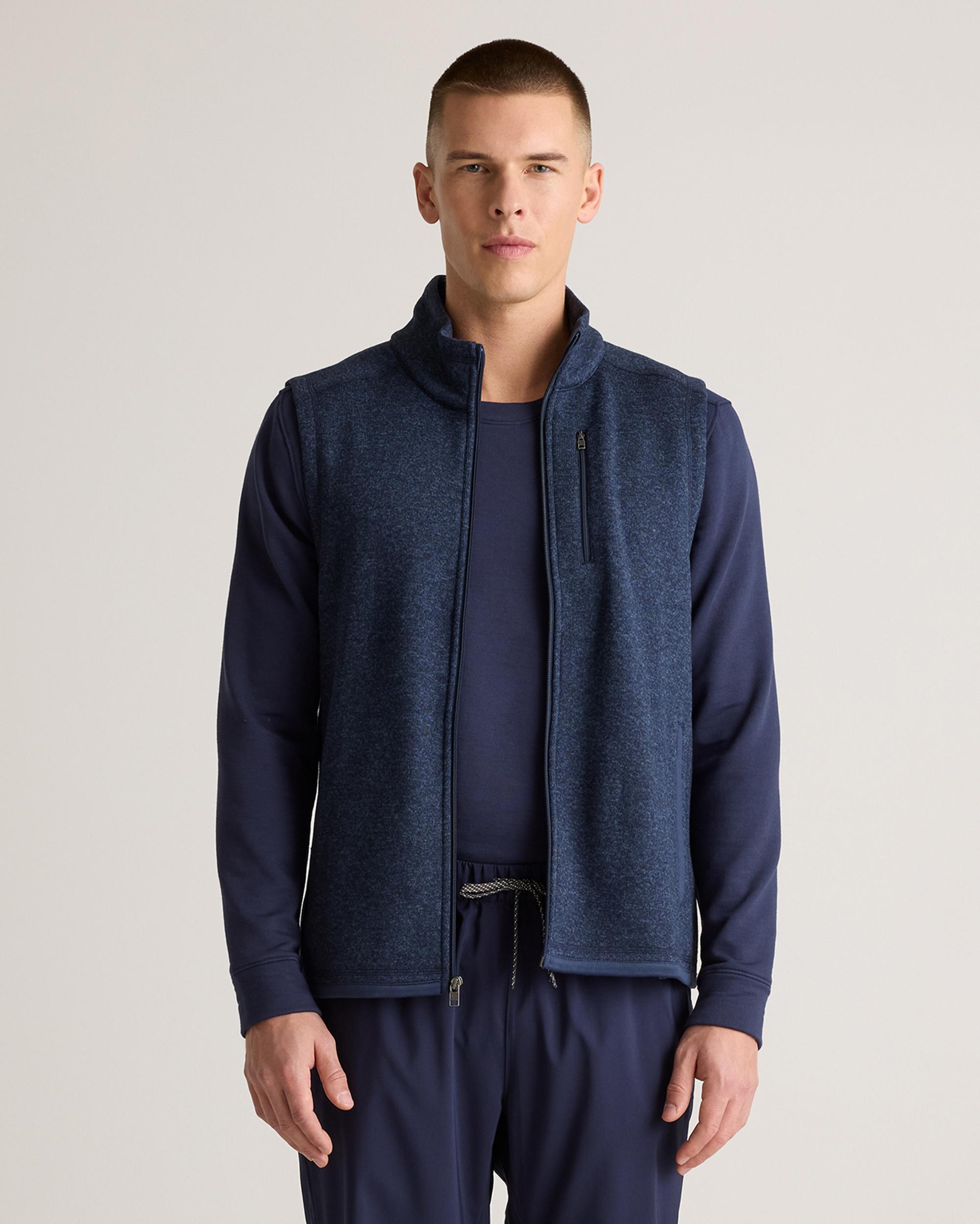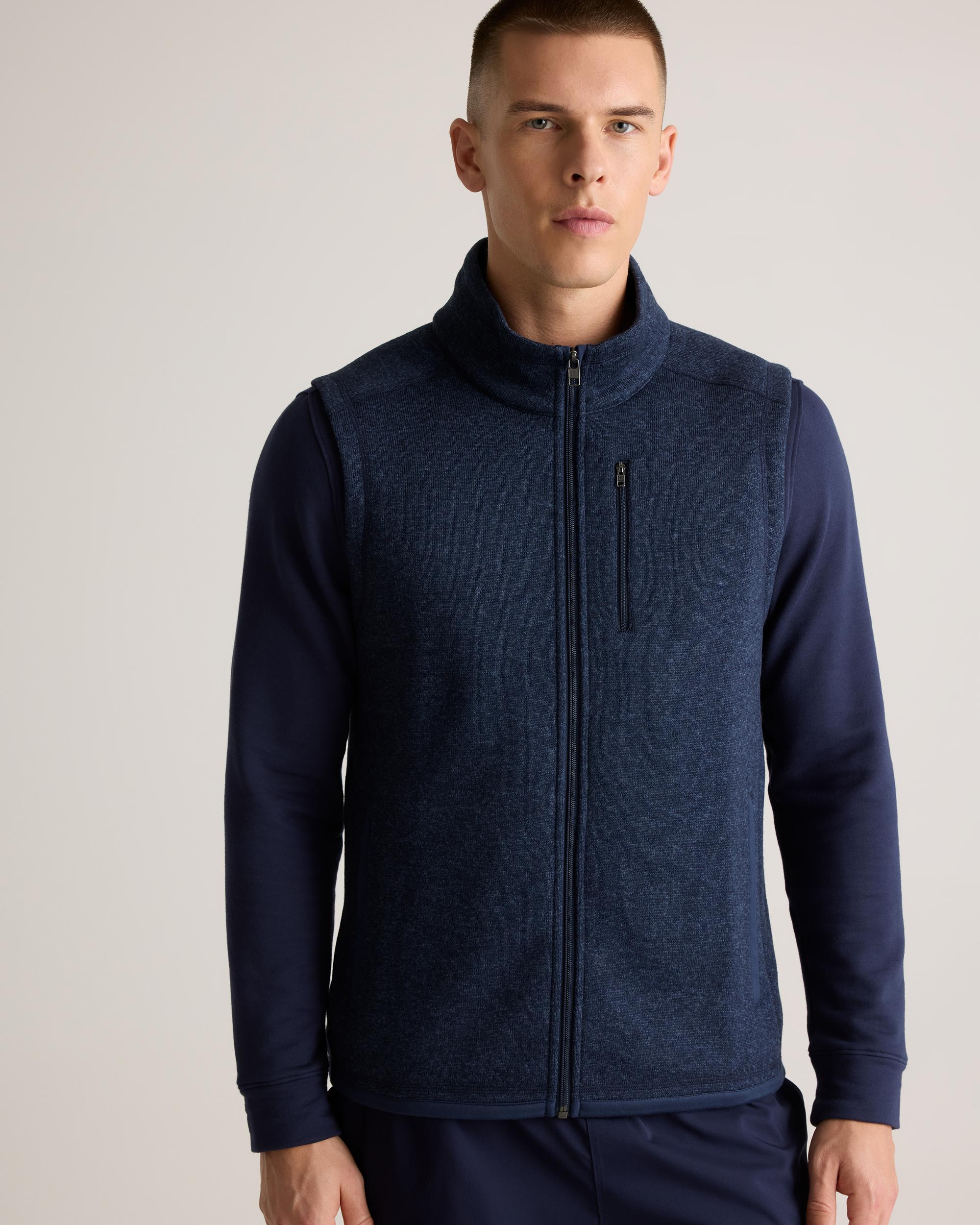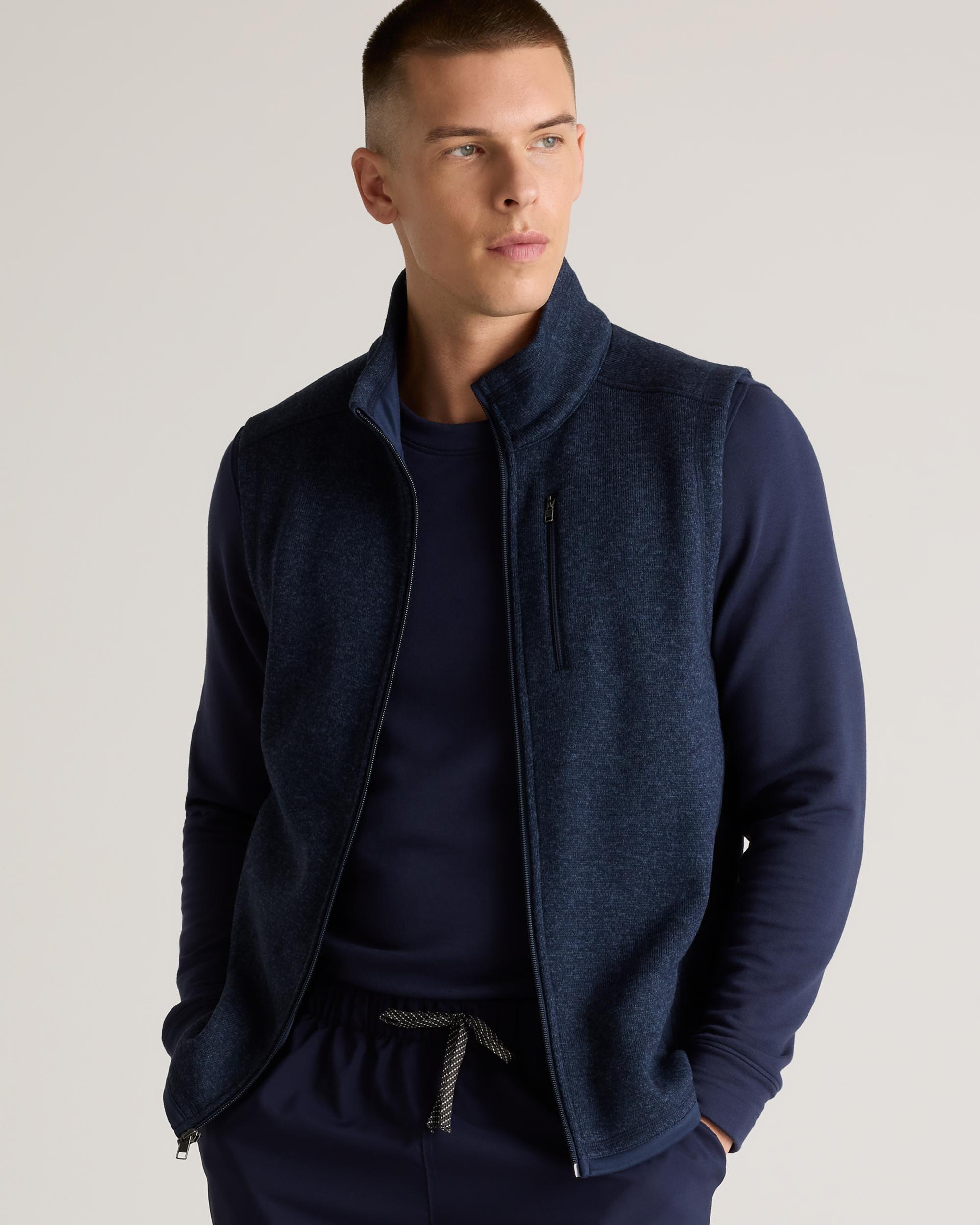 Your next chilly day must-have? This Sweater-Knit Fleece Full-Zip Vest. Whether you're layering up for an outdoor adventure or adding cozy warmth to an everyday outfit, this vest has you covered. The best part (besides the classic style, of course): It's made of 100% recycled materials that keep you warm while keeping plastic bottles out of oceans and landfills. | Quince | Men's Sweater-Knit Fleece Full-Zip Vest in Navy, Size Large, Recycled Polyester