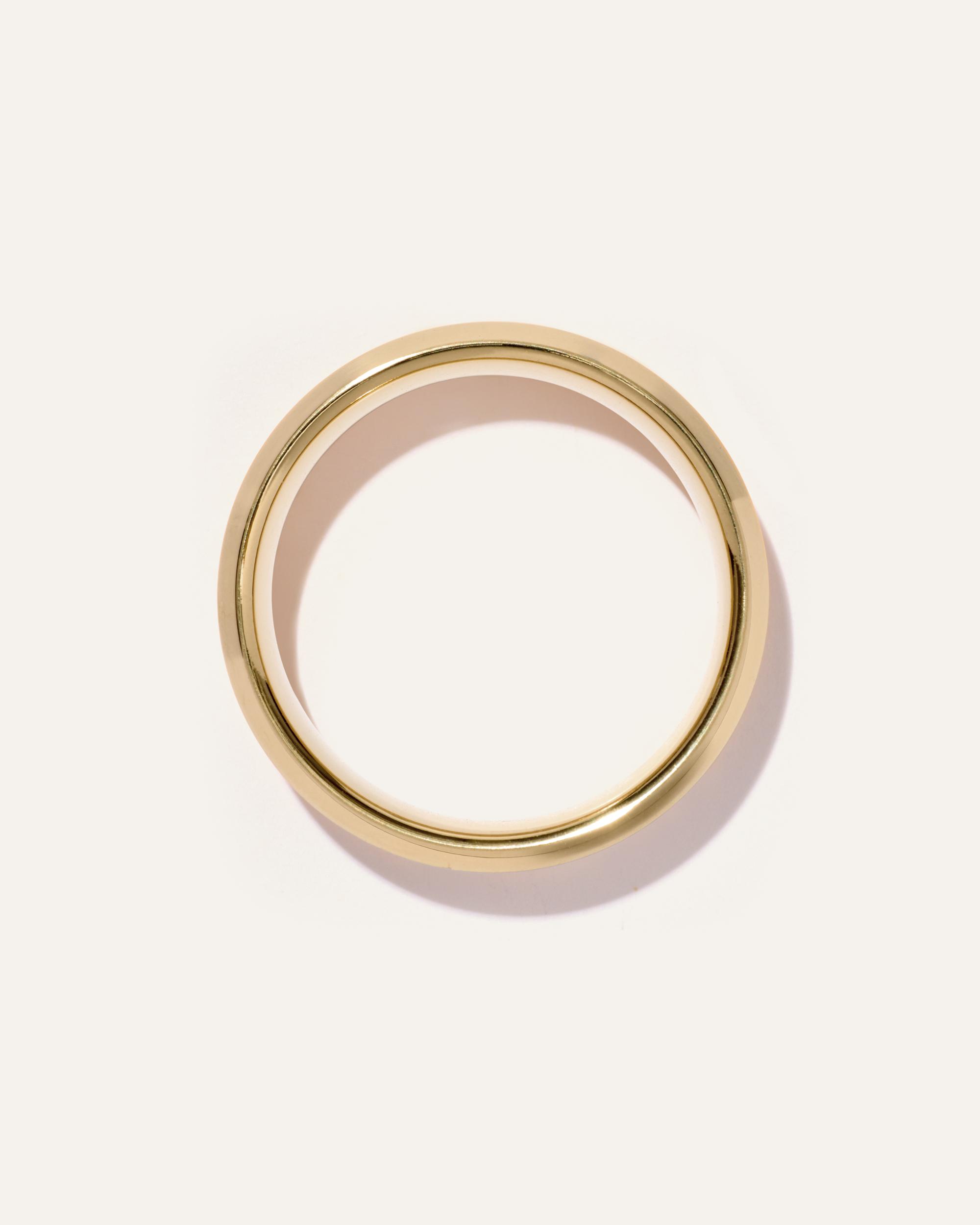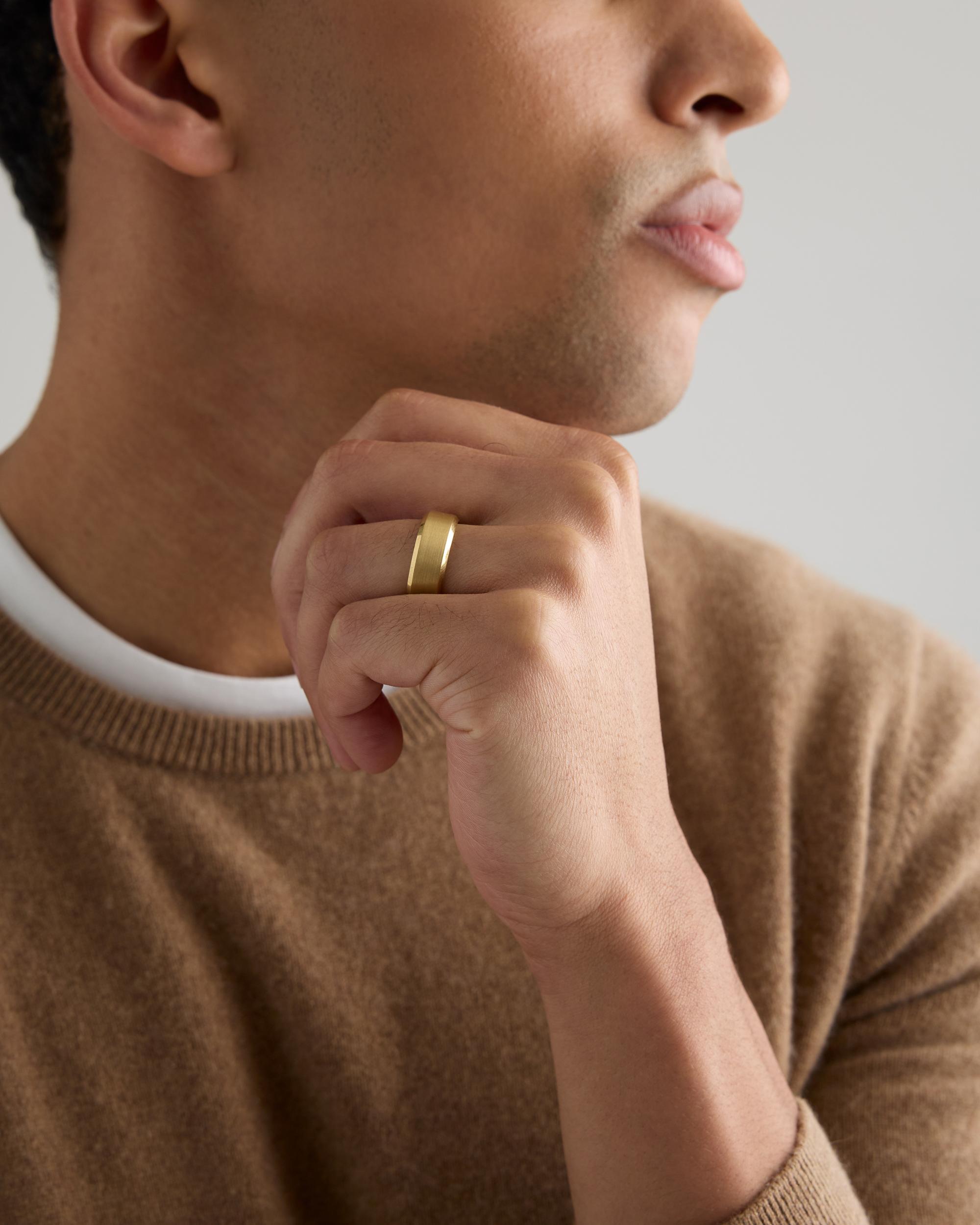 Crafted from durable tungsten carbide, this modern 14K gold plated band features a unique beveled edge design and a brushed finish. Enhanced with advanced nano-coating technology, this ring is exceptionally scratch resistance and perfect for everyday wear. | Quince | Men's Tungsten Carbide Brushed Beveled Edge Band Rings in 14K Gold Plated, Size 7.5