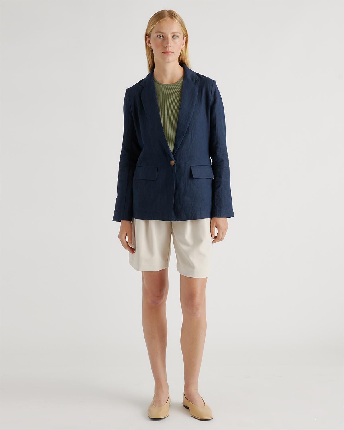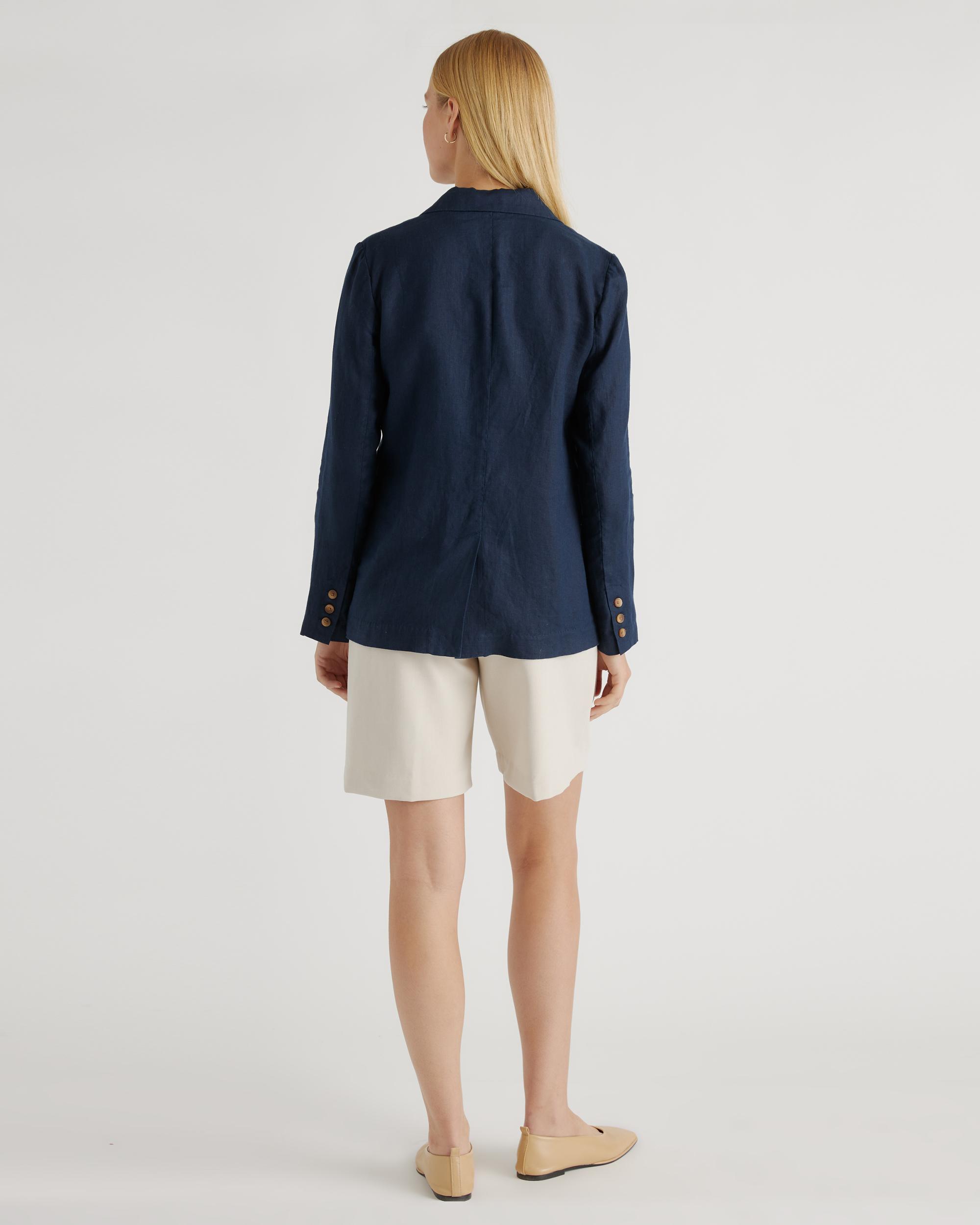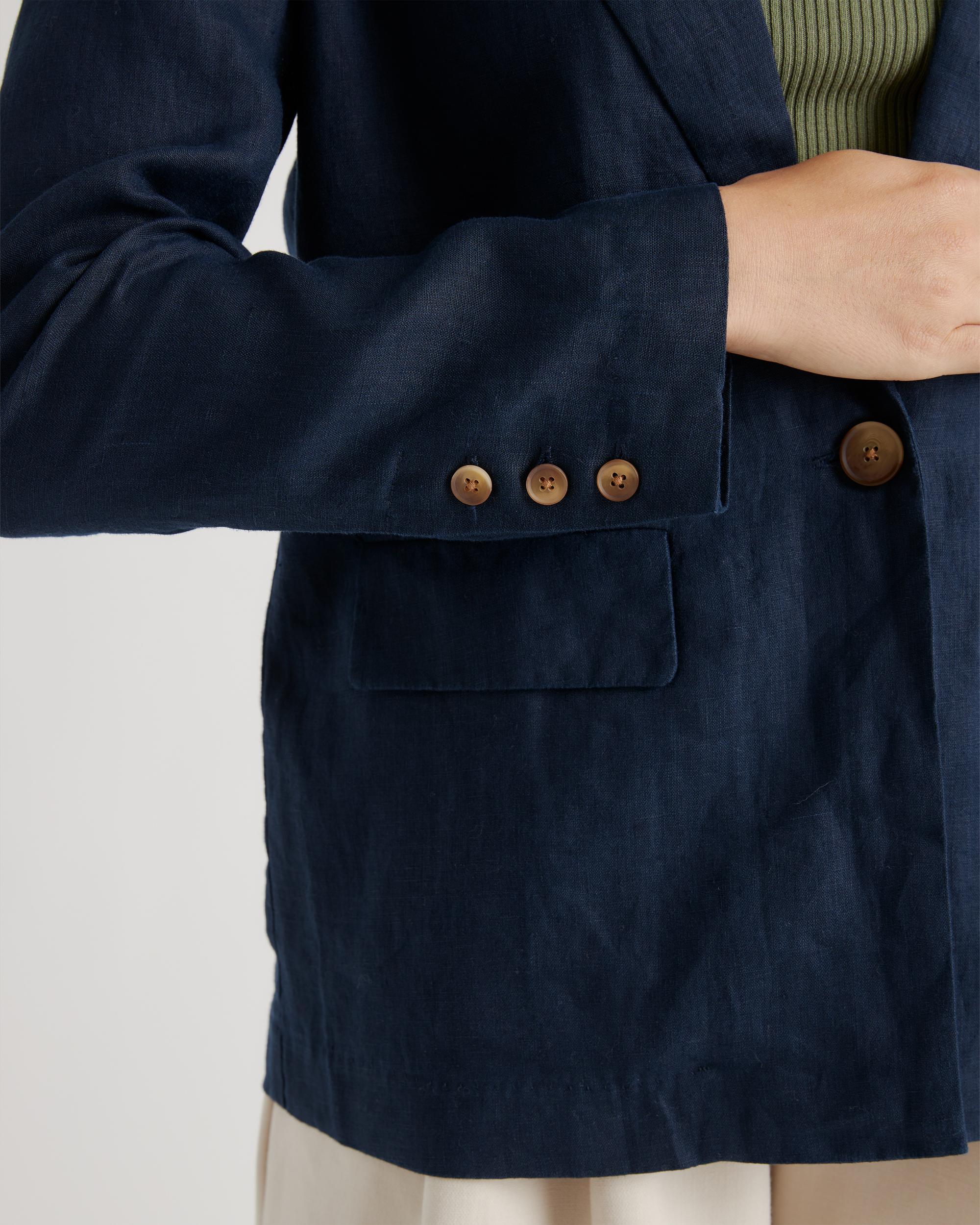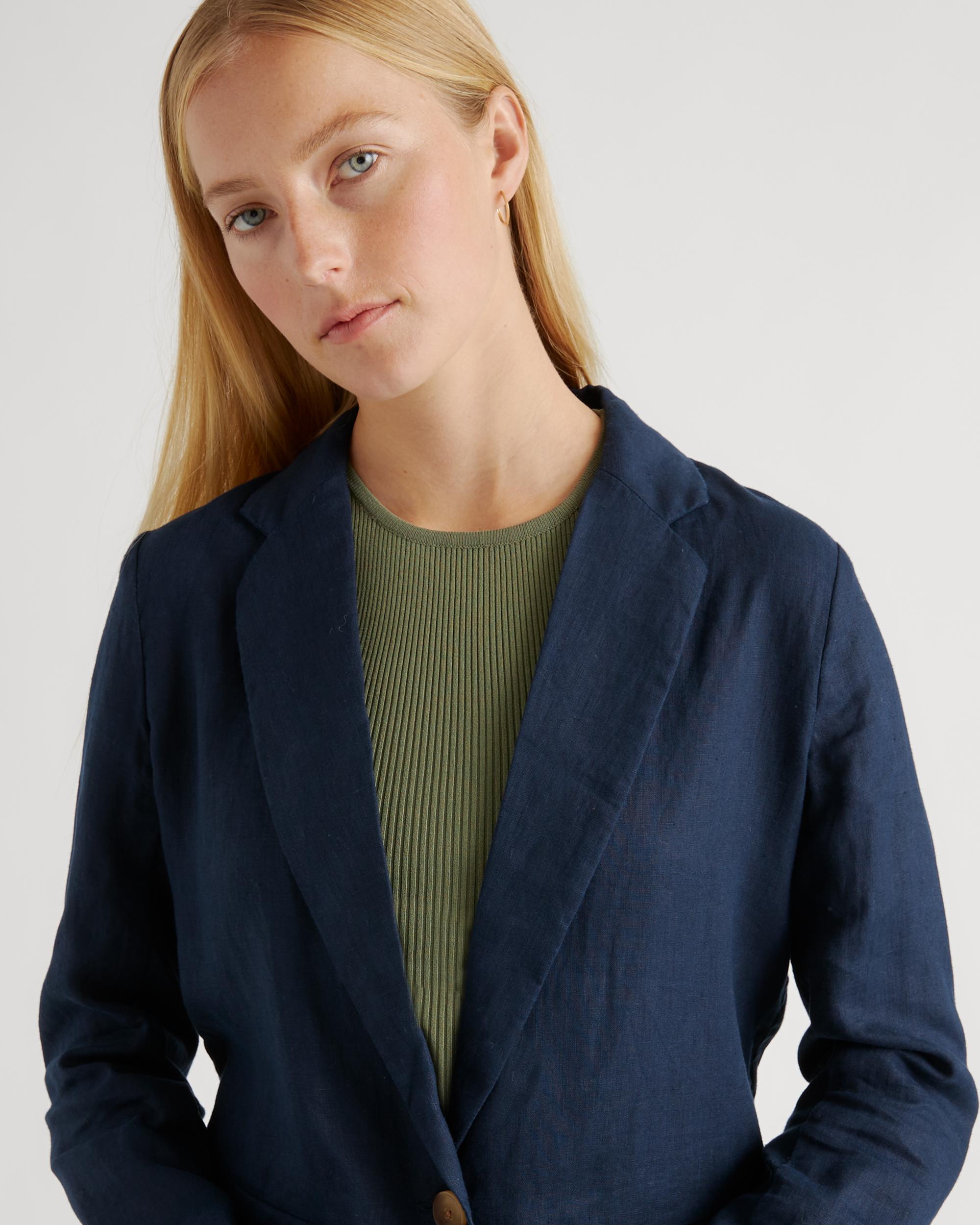 Who doesn't want to throw on the effortless look of linen to top off their outfit? The single-breasted European Linen Blazer is here to do just that. Relaxed fit, functional pockets, breathable, and lightweight. We love her for work, vacation, and weekends—versatile is an understatement. | Quince | Women's 100% European Linen Blazer in Deep Navy, Size XL
