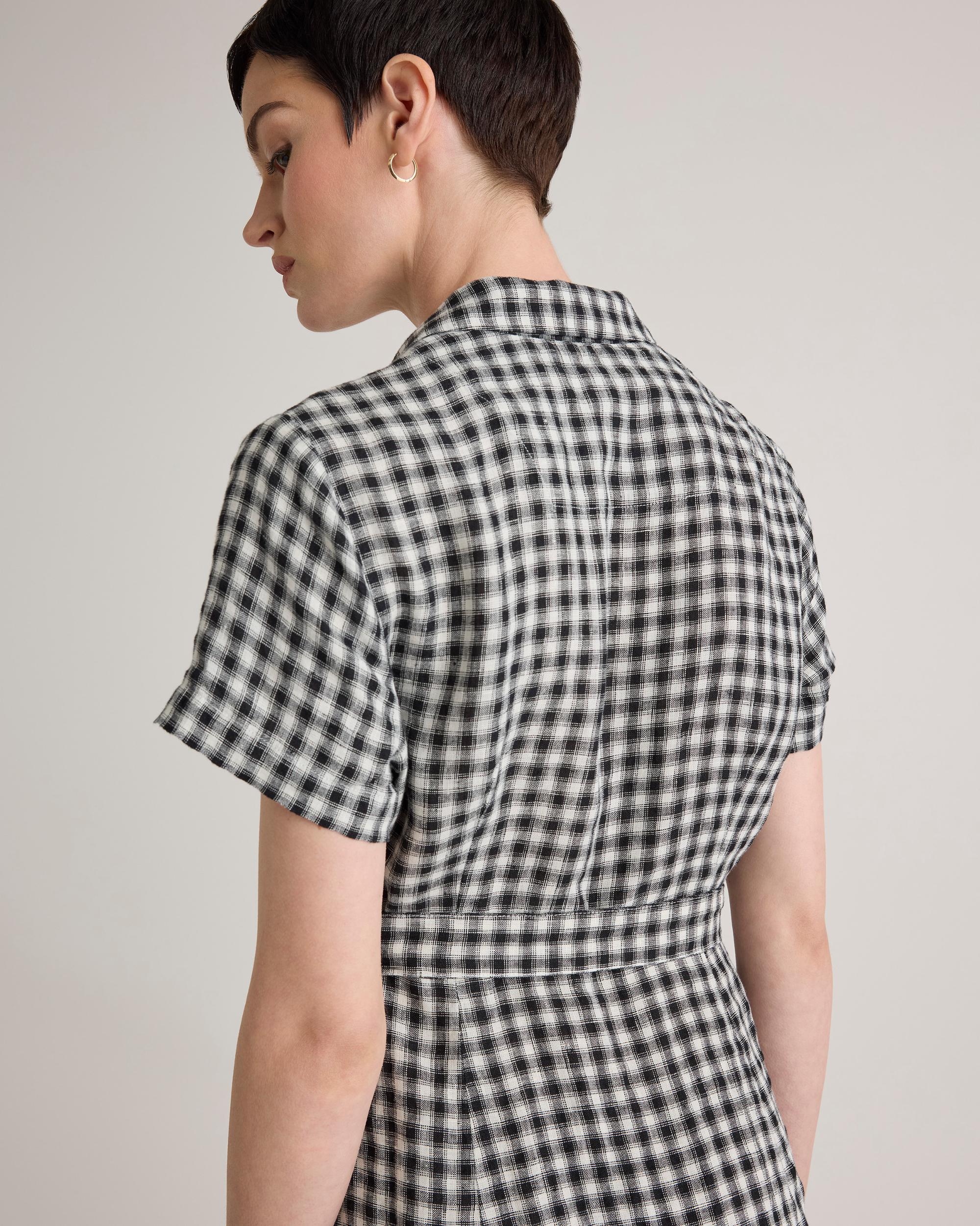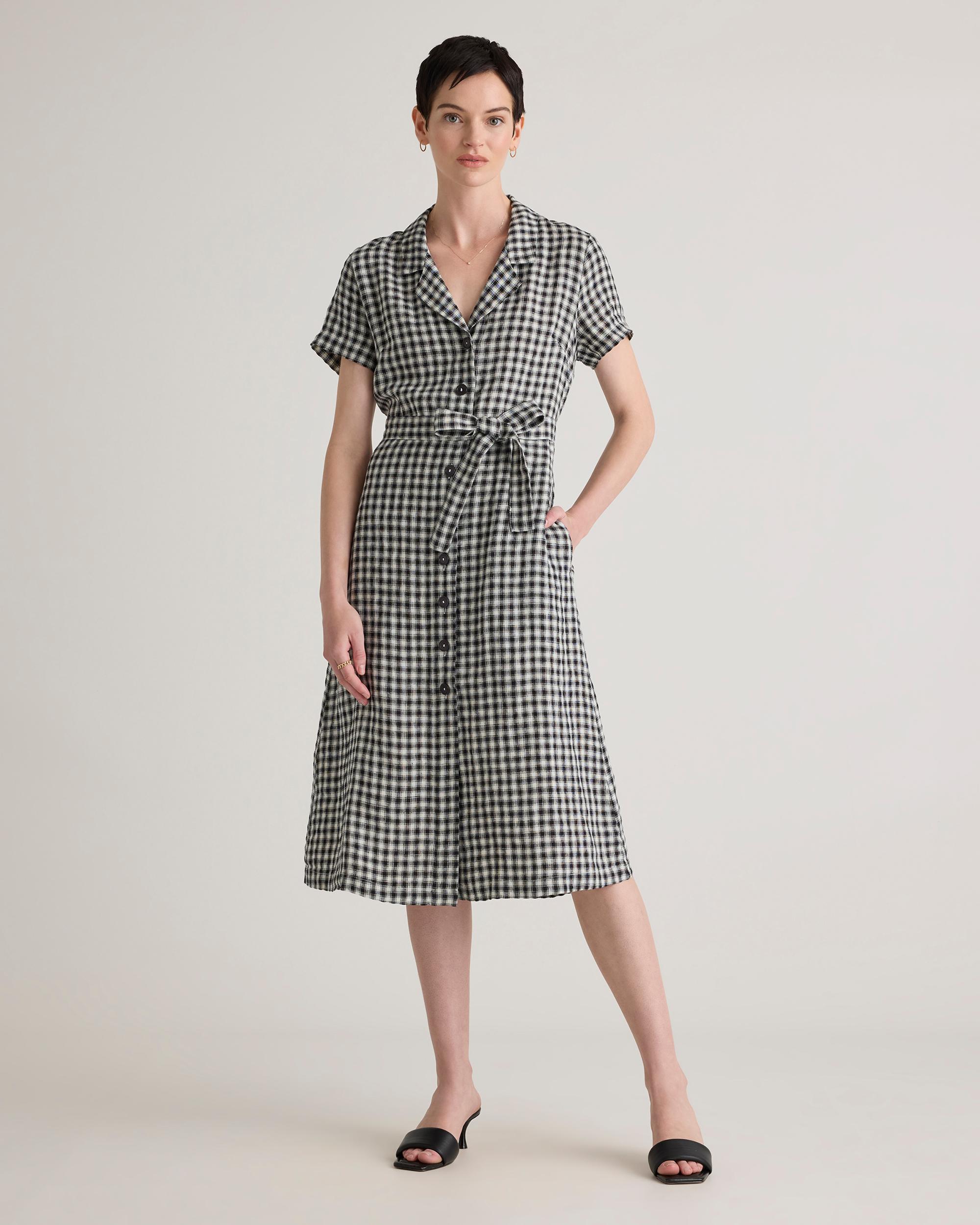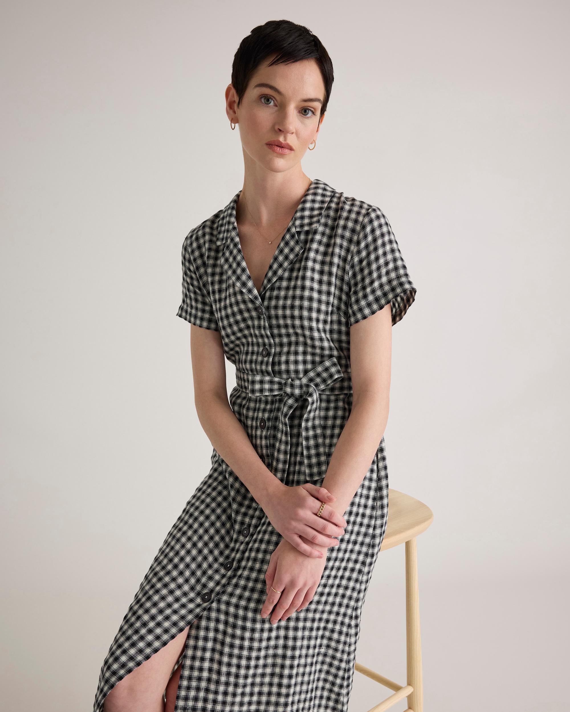 It's got pockets! We never get tired of telling people that, and neither will you. This midi linen button fronted dress is so versatile and cute, the compliments will be rolling in. Linen is the ultimate year-round fabric because it's breathable and naturally heat-regulating. Also offered in sixes 1X-3X. | Quince | Women's 100% European Linen Button Front Dress in Khaki / Black Gingham, Size XS