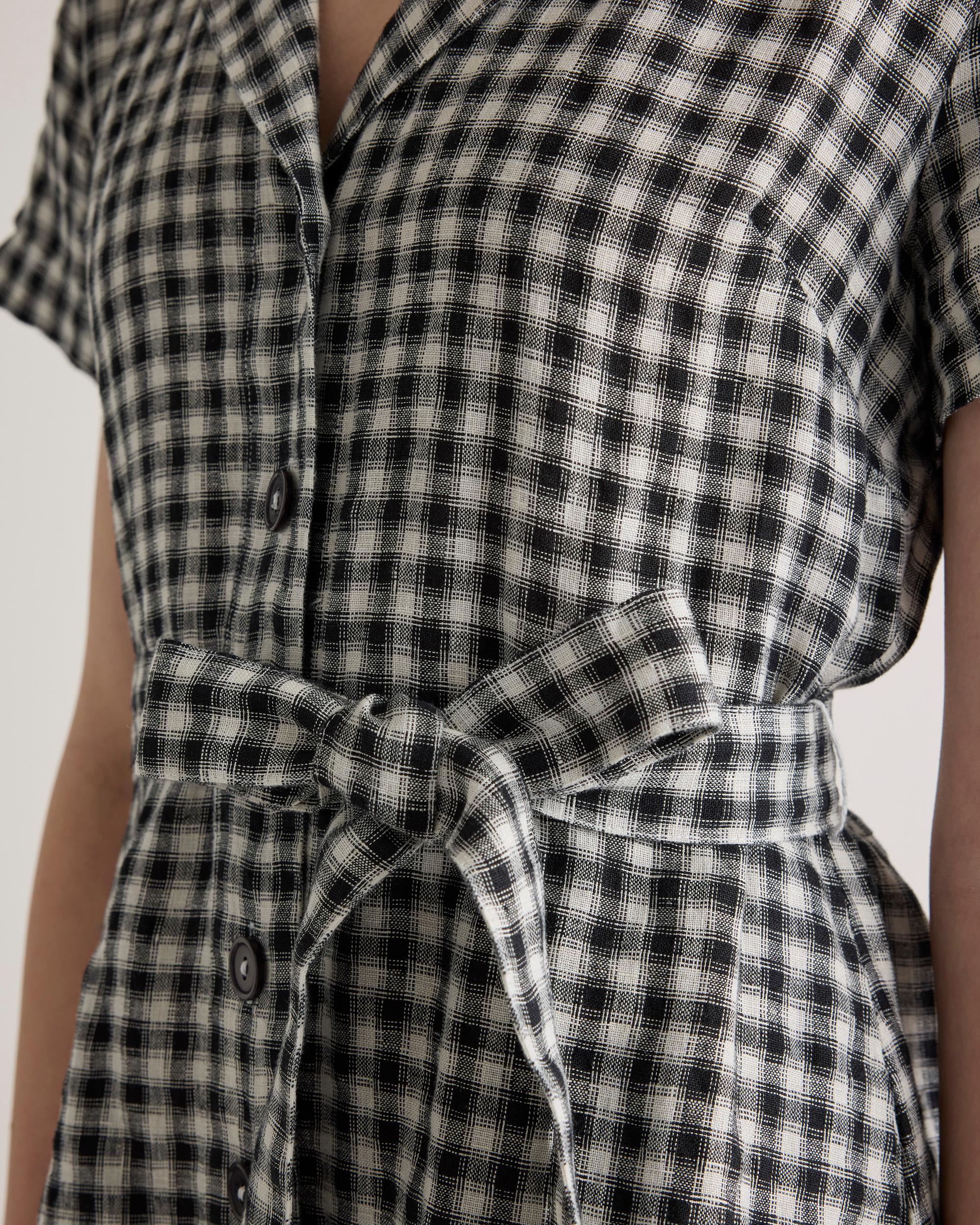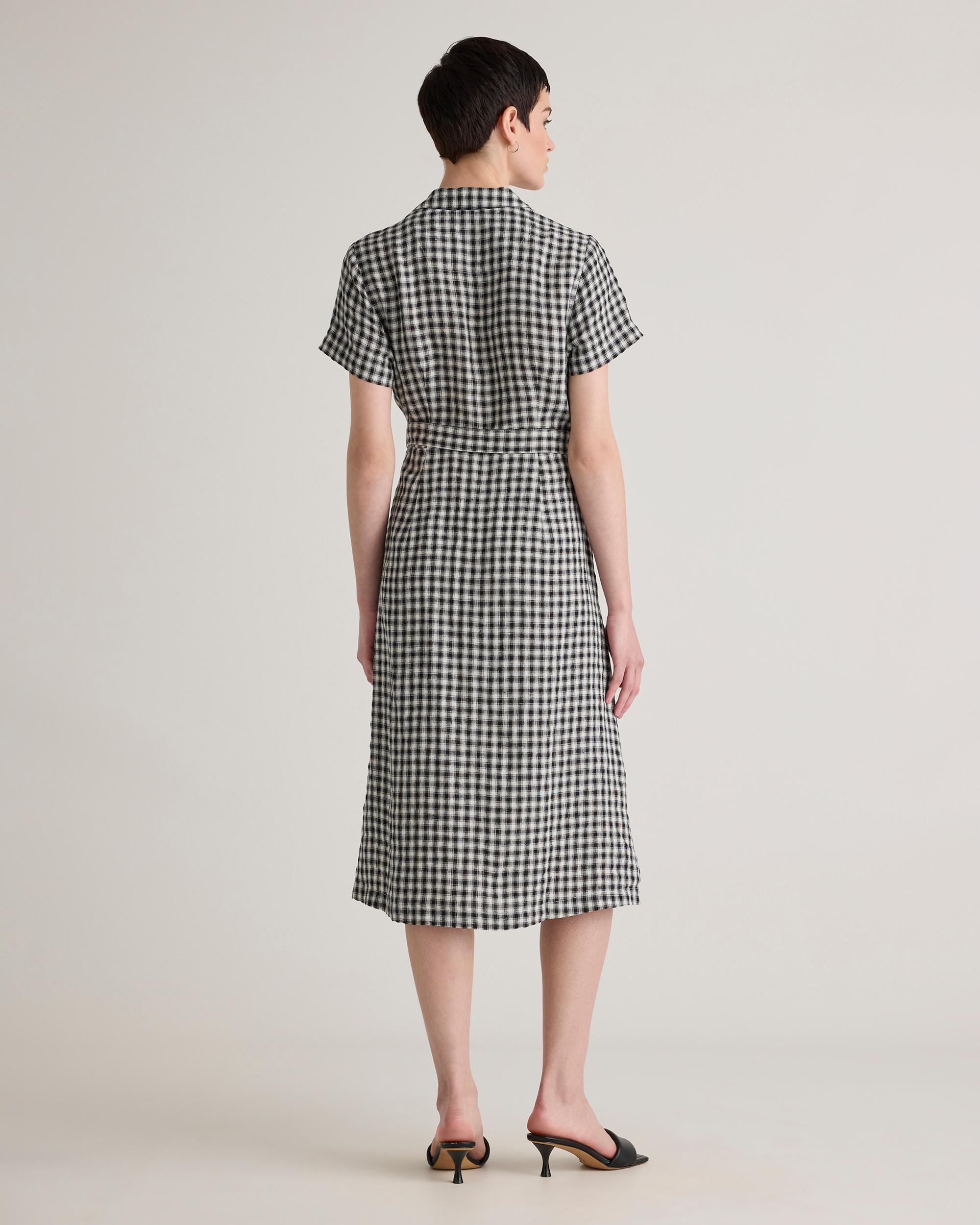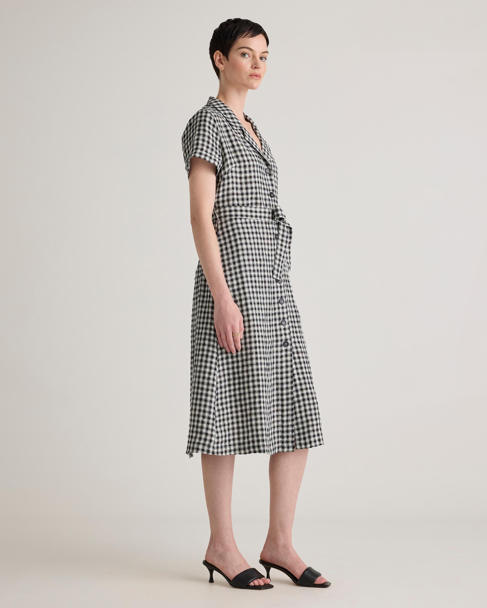 It's got pockets! We never get tired of telling people that, and neither will you. This midi linen button fronted dress is so versatile and cute, the compliments will be rolling in. Linen is the ultimate year-round fabric because it's breathable and naturally heat-regulating. Also offered in sixes 1X-3X. | Quince | Women's 100% European Linen Button Front Dress in Khaki / Black Gingham, Size XS
