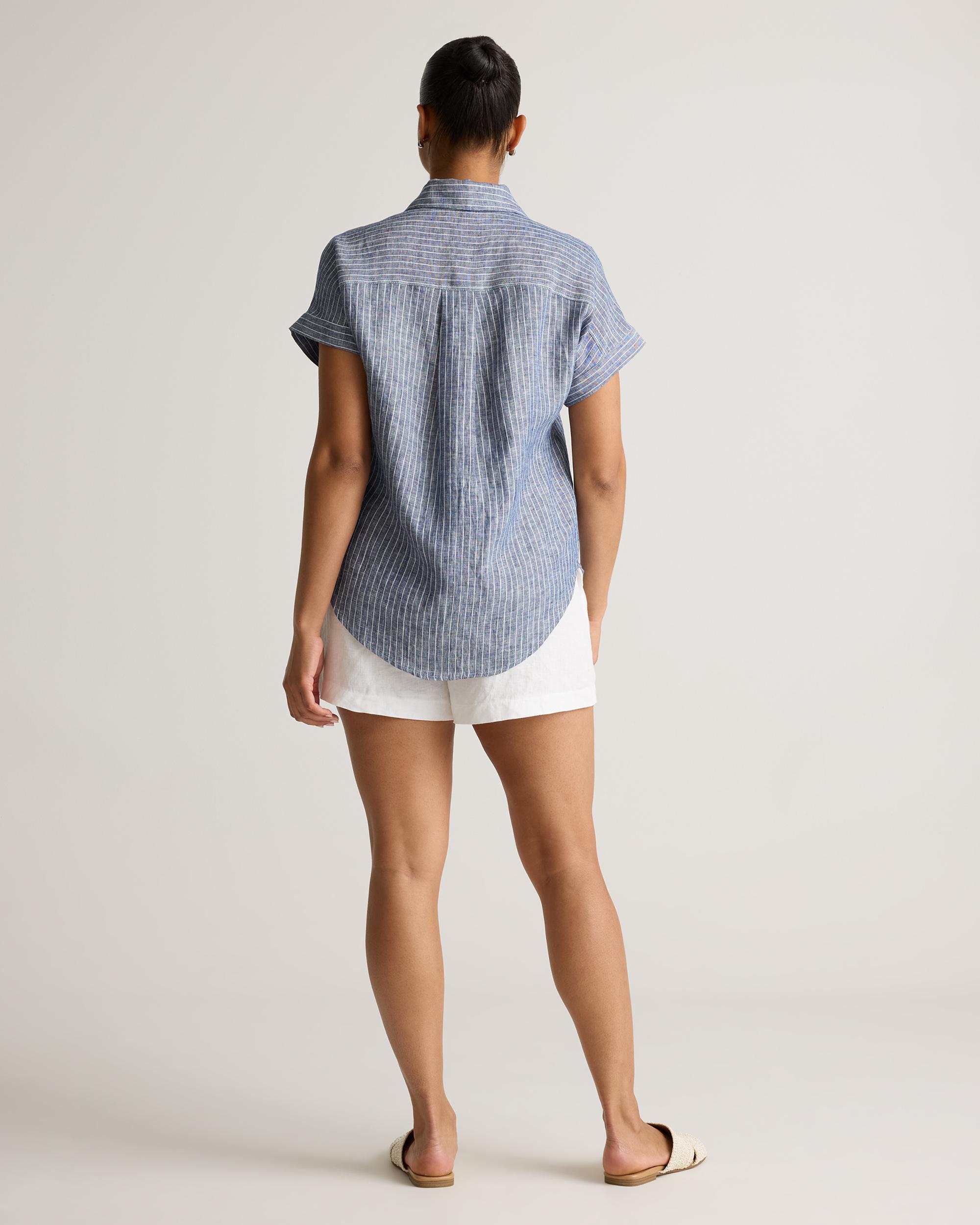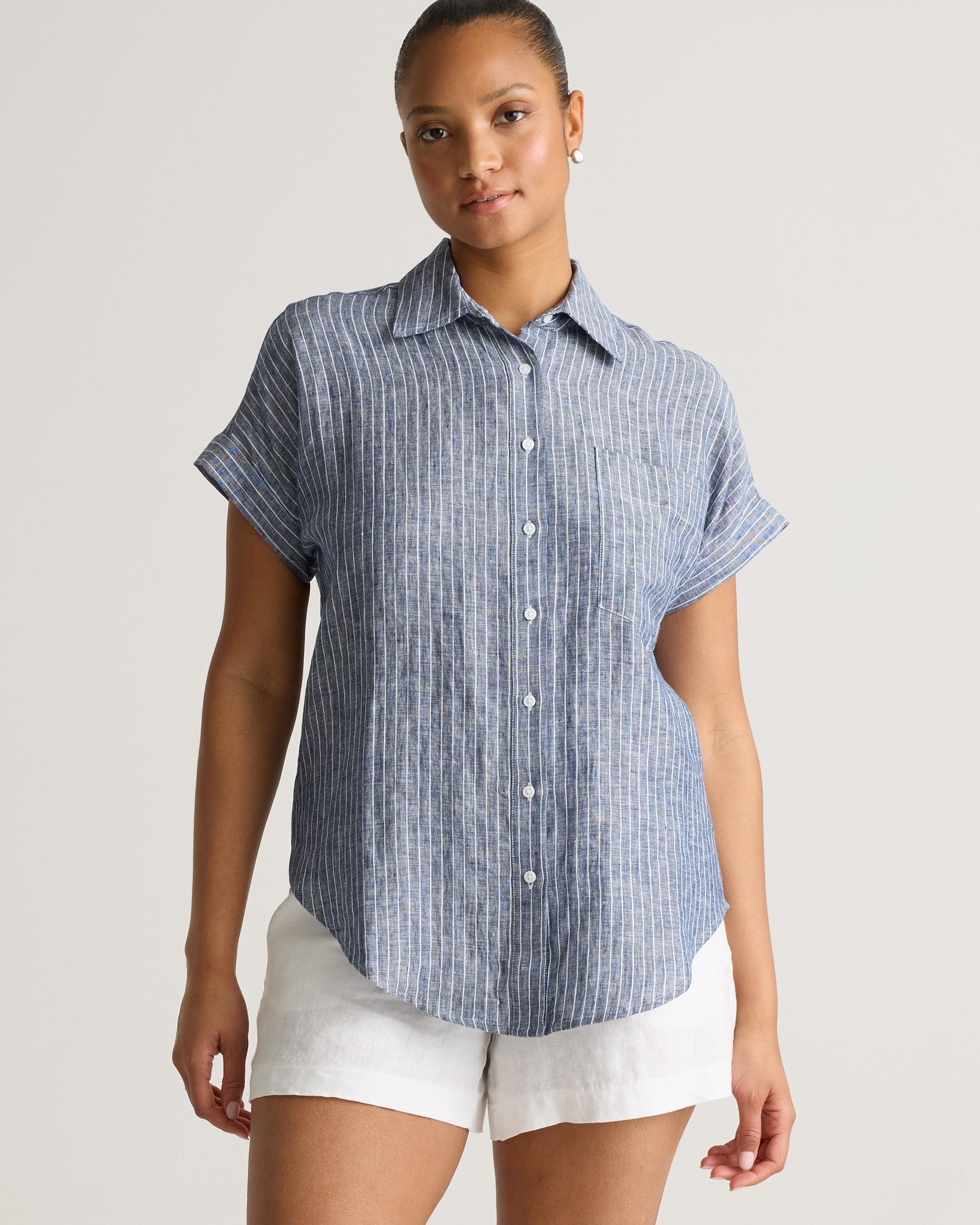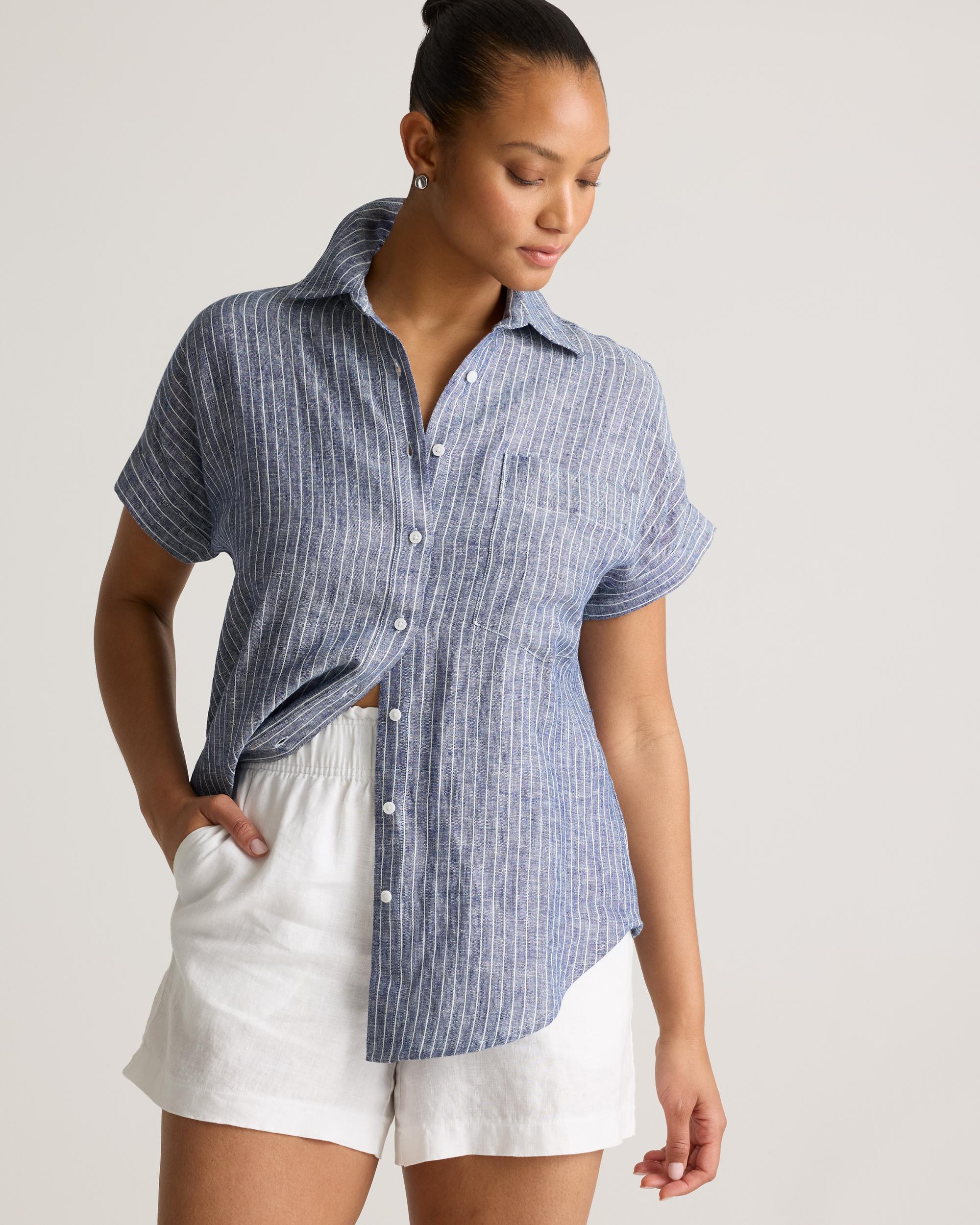 Survive summer without breaking a sweat in our 100% European Linen Camp Shirt. Made from premium European linen, this lightweight, breathable shirt helps keep you cool on those warm, sunny days. With its relaxed fit and classic details, it can flex for both casual outings and more dressed-up occasions. Crafted for durability, this timeless shirt is destined to become a wardrobe essential for years to come. Also offered in maternity. | Quince | Women's 100% European Linen Camp Shirt in Chambray Stripe, Size Medium