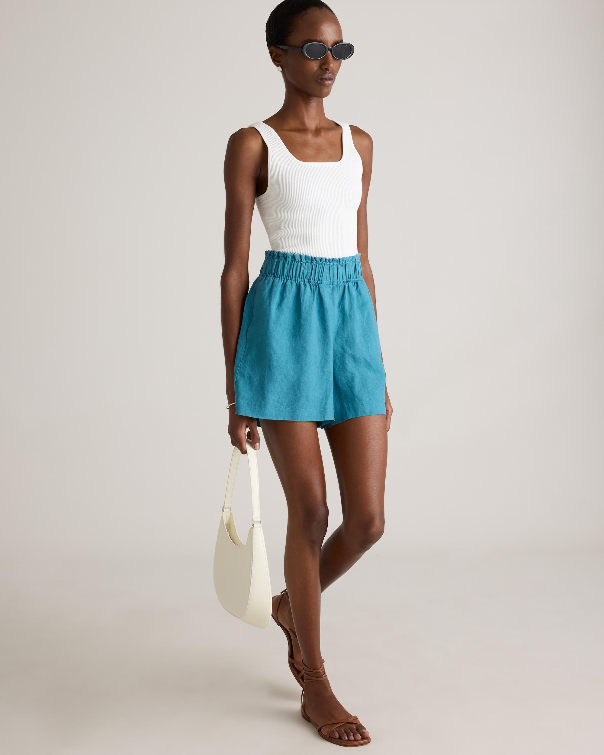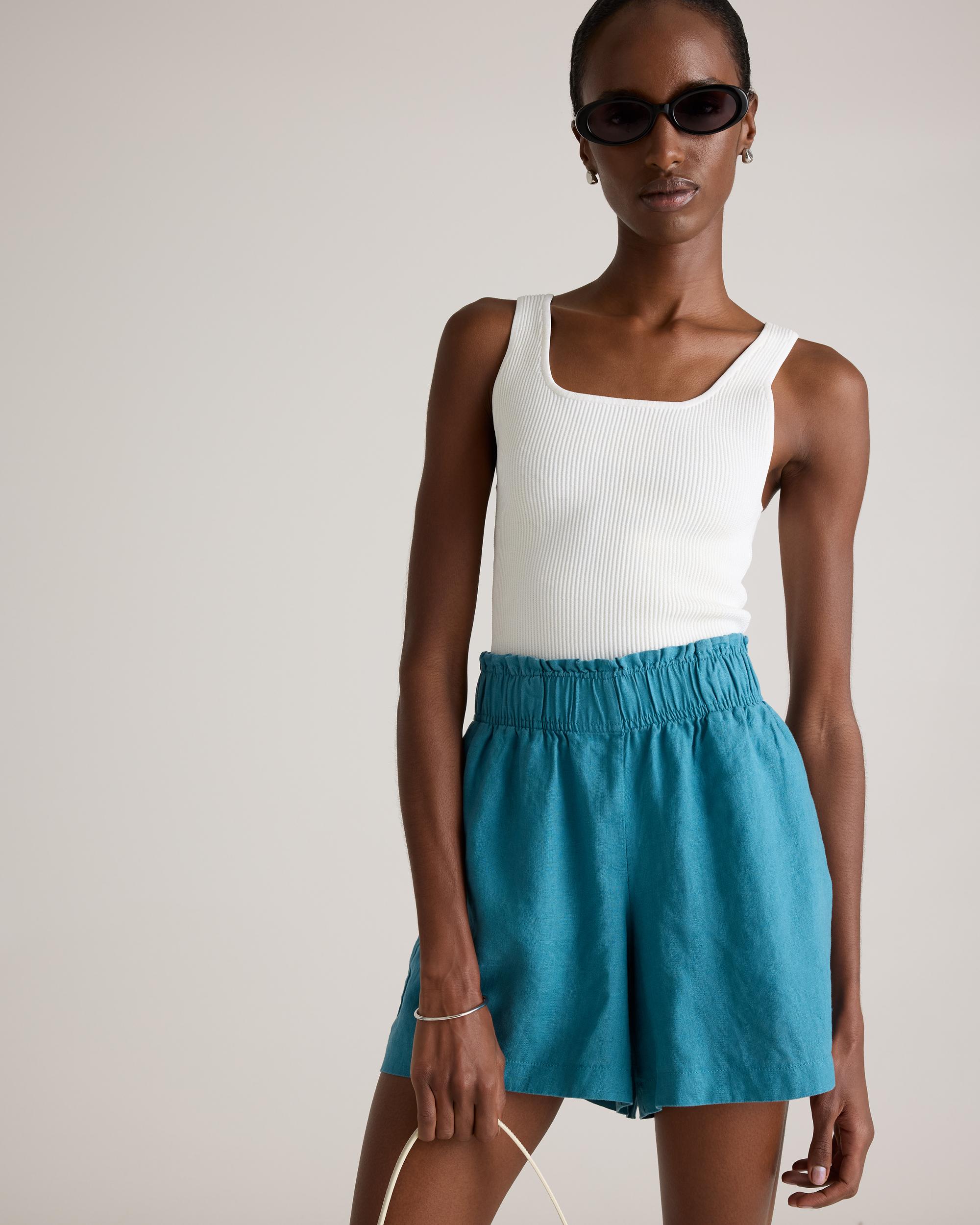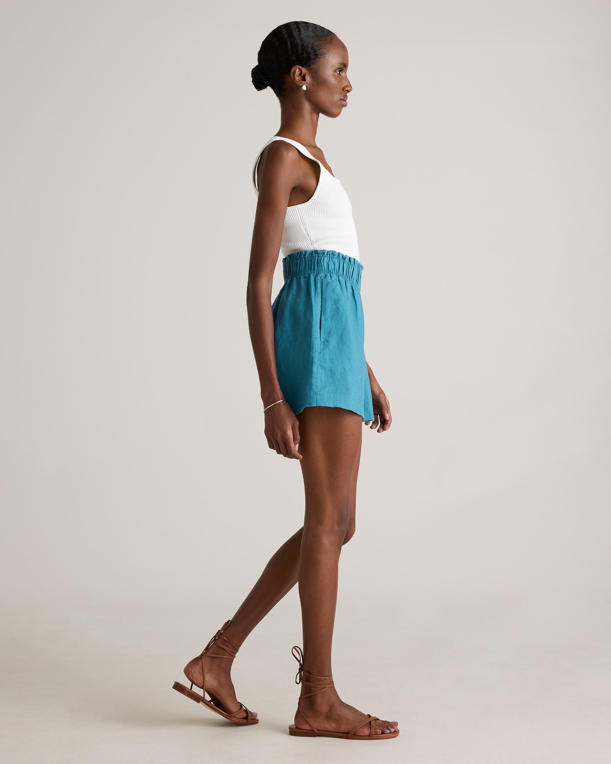 Elevate your summer style with our 100% European Linen High Waisted Shorts. Crafted from premium linen, these shorts offer a luxuriously lightweight and breathable option for warm weather dressing. The high rise silhouette elongates your legs and flatters your figure, while the relaxed fit keeps you comfortable all day long. Featuring a clean, minimalist design, these shorts are perfect for dressing up or down. Whether you're lounging at the beach or exploring a new city, our European Linen High Waisted Short are the ultimate summer essential. | Quince | Women's 100% European Linen High Waisted Shorts in Mineral Blue, Size XL