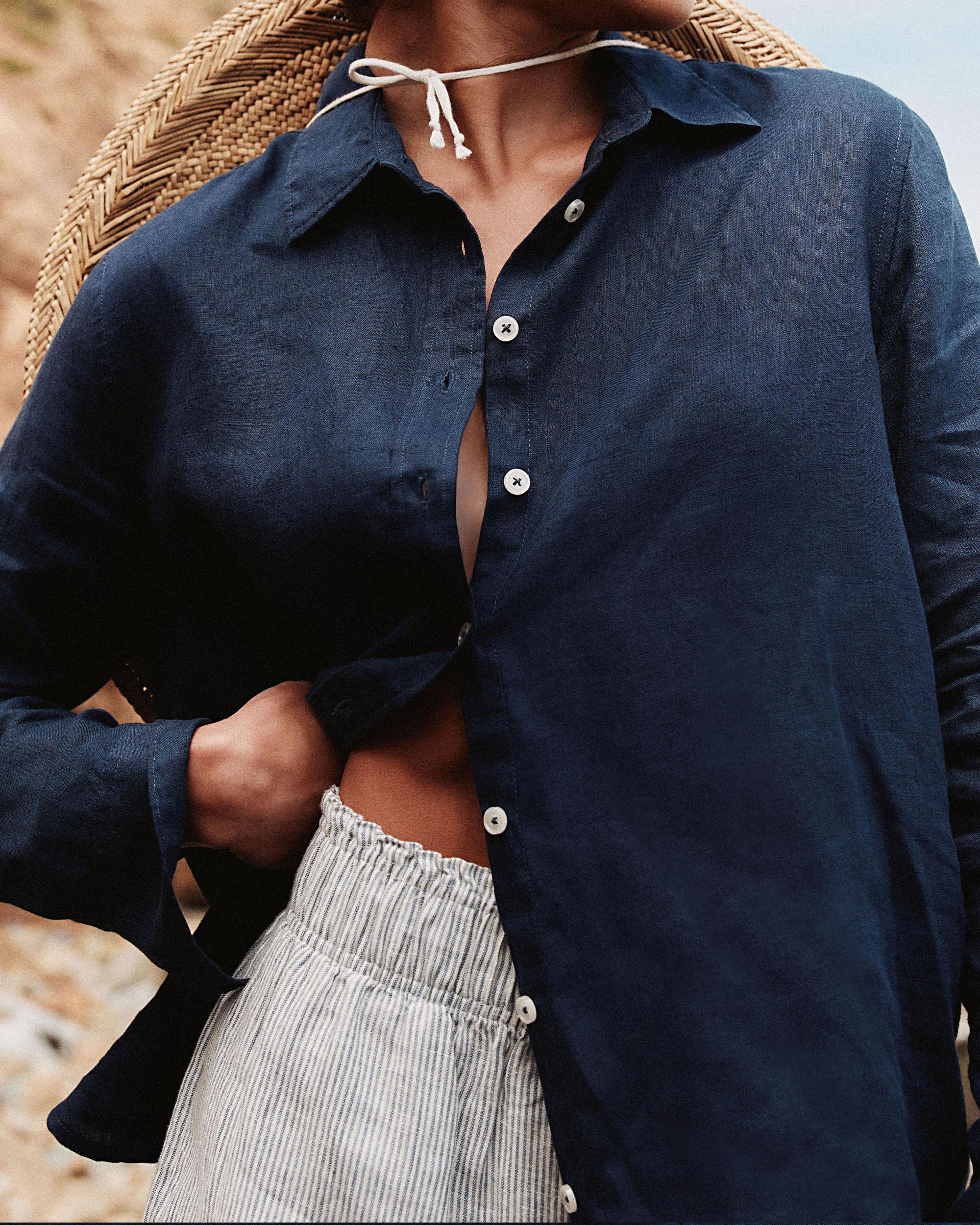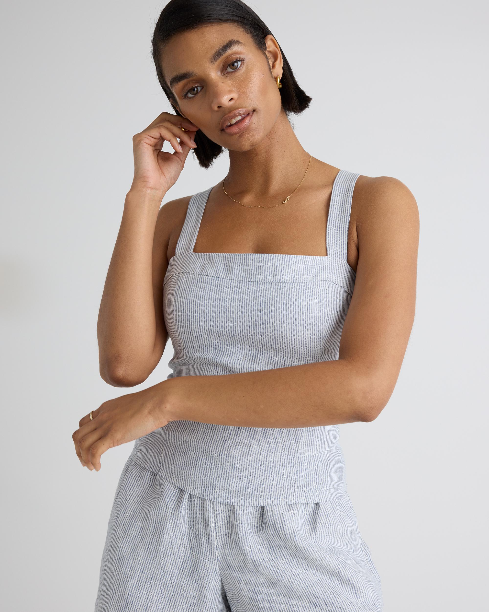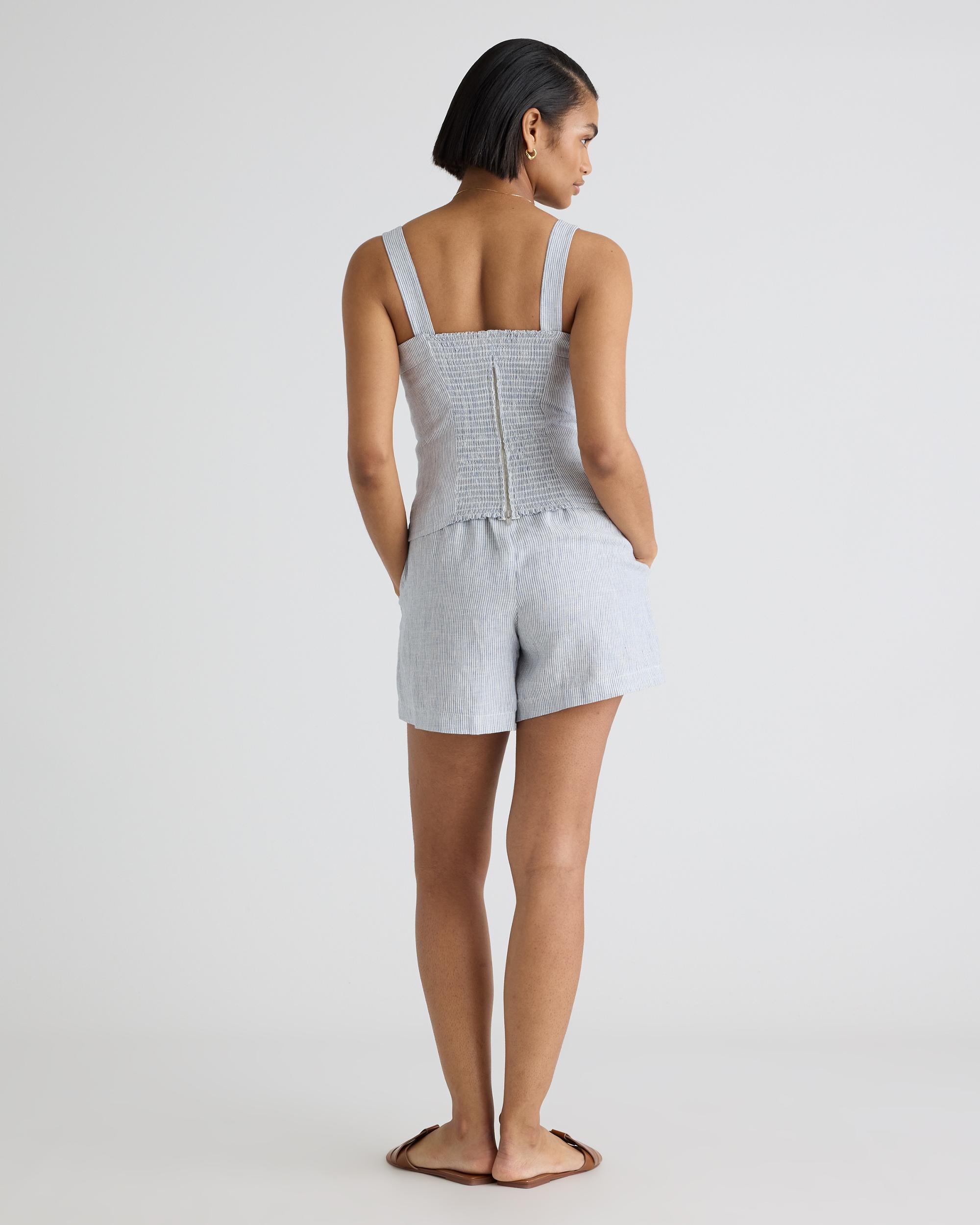 Elevate your summer style with our 100% European Linen High Waisted Shorts. Crafted from premium linen, these shorts offer a luxuriously lightweight and breathable option for warm weather dressing. The high rise silhouette elongates your legs and flatters your figure, while the relaxed fit keeps you comfortable all day long. Featuring a clean, minimalist design, these shorts are perfect for dressing up or down. Whether you're lounging at the beach or exploring a new city, our European Linen High Waisted Short are the ultimate summer essential. | Quince | Women's 100% European Linen High Waisted Shorts in Blue Pinstripe, Size Large