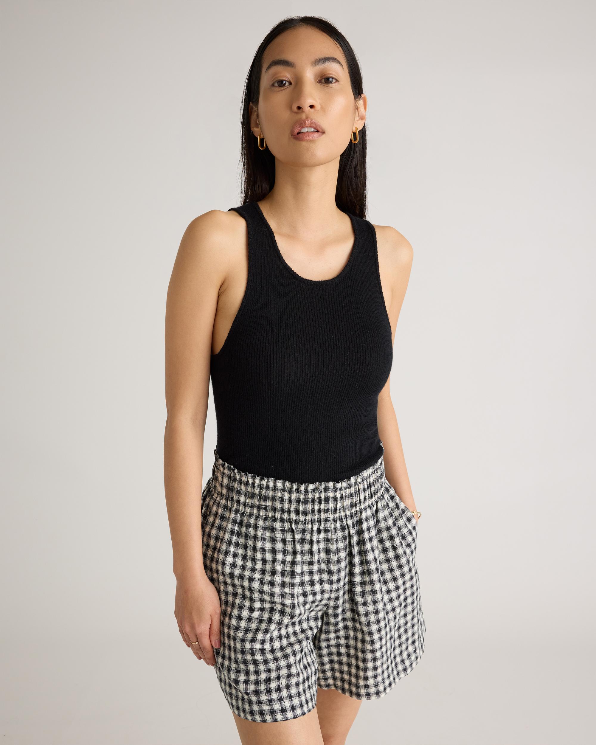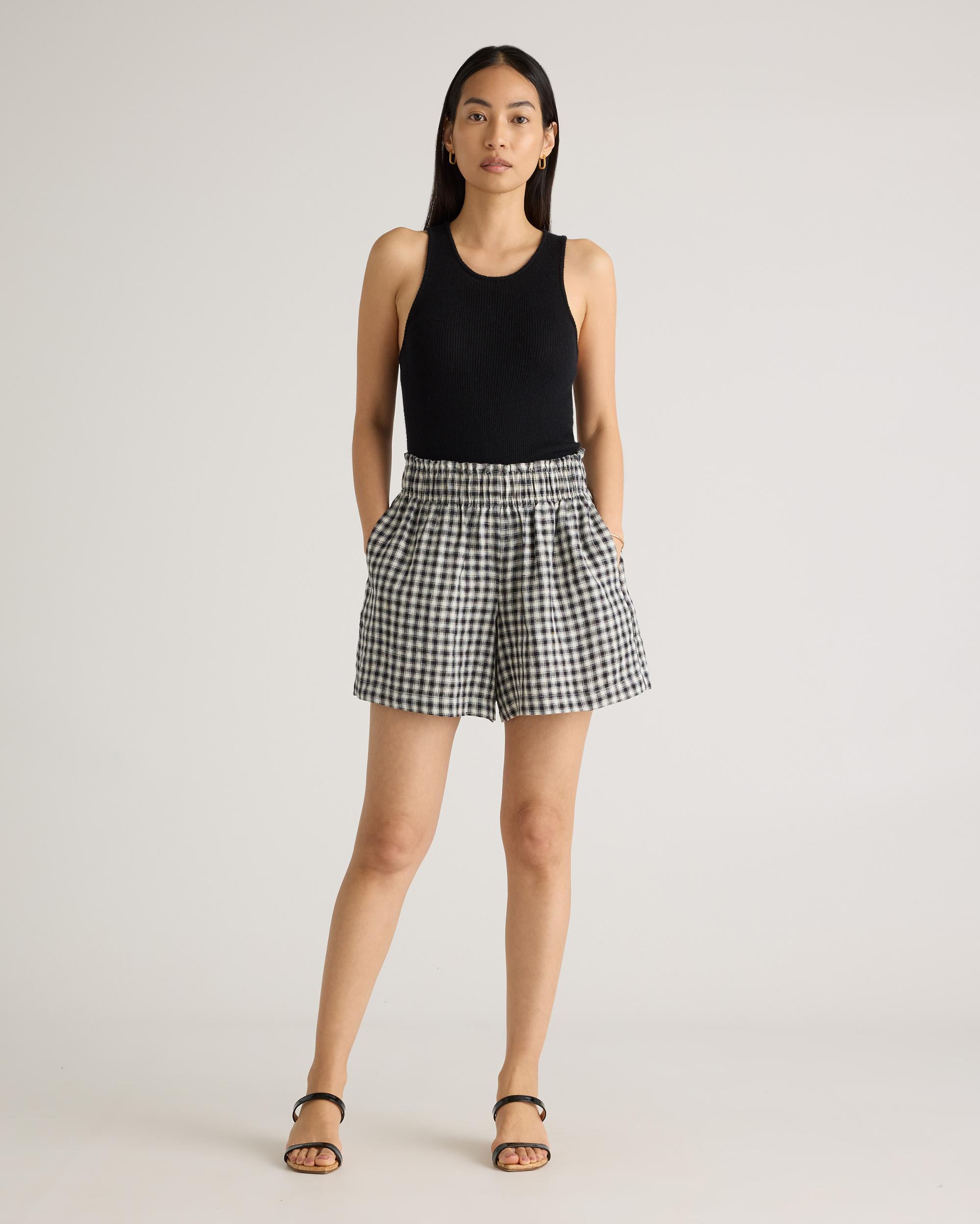 Elevate your summer style with our 100% European Linen High Waisted Shorts. Crafted from premium linen, these shorts offer a luxuriously lightweight and breathable option for warm weather dressing. The high rise silhouette elongates your legs and flatters your figure, while the relaxed fit keeps you comfortable all day long. Featuring a clean, minimalist design, these shorts are perfect for dressing up or down. Whether you're lounging at the beach or exploring a new city, our European Linen High Waisted Short are the ultimate summer essential. | Quince | Women's 100% European Linen High Waisted Shorts in Khaki / Black Gingham, Size Large