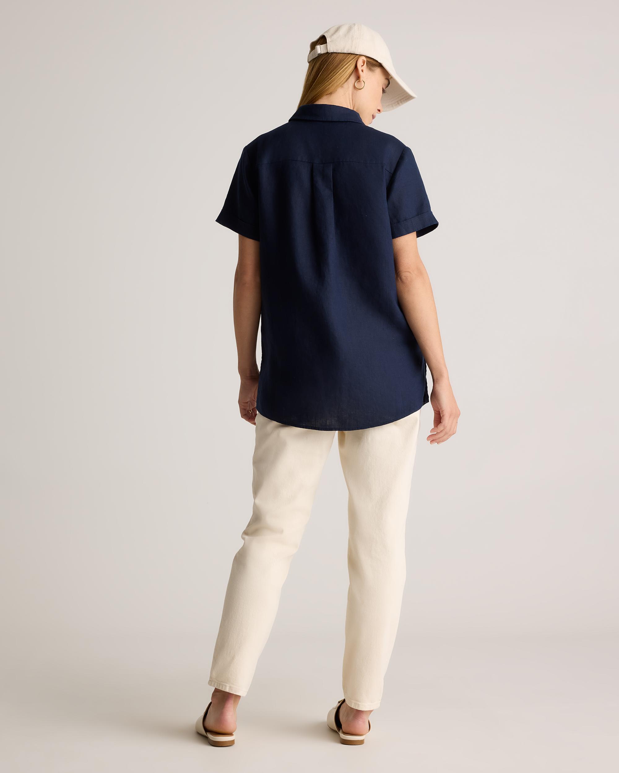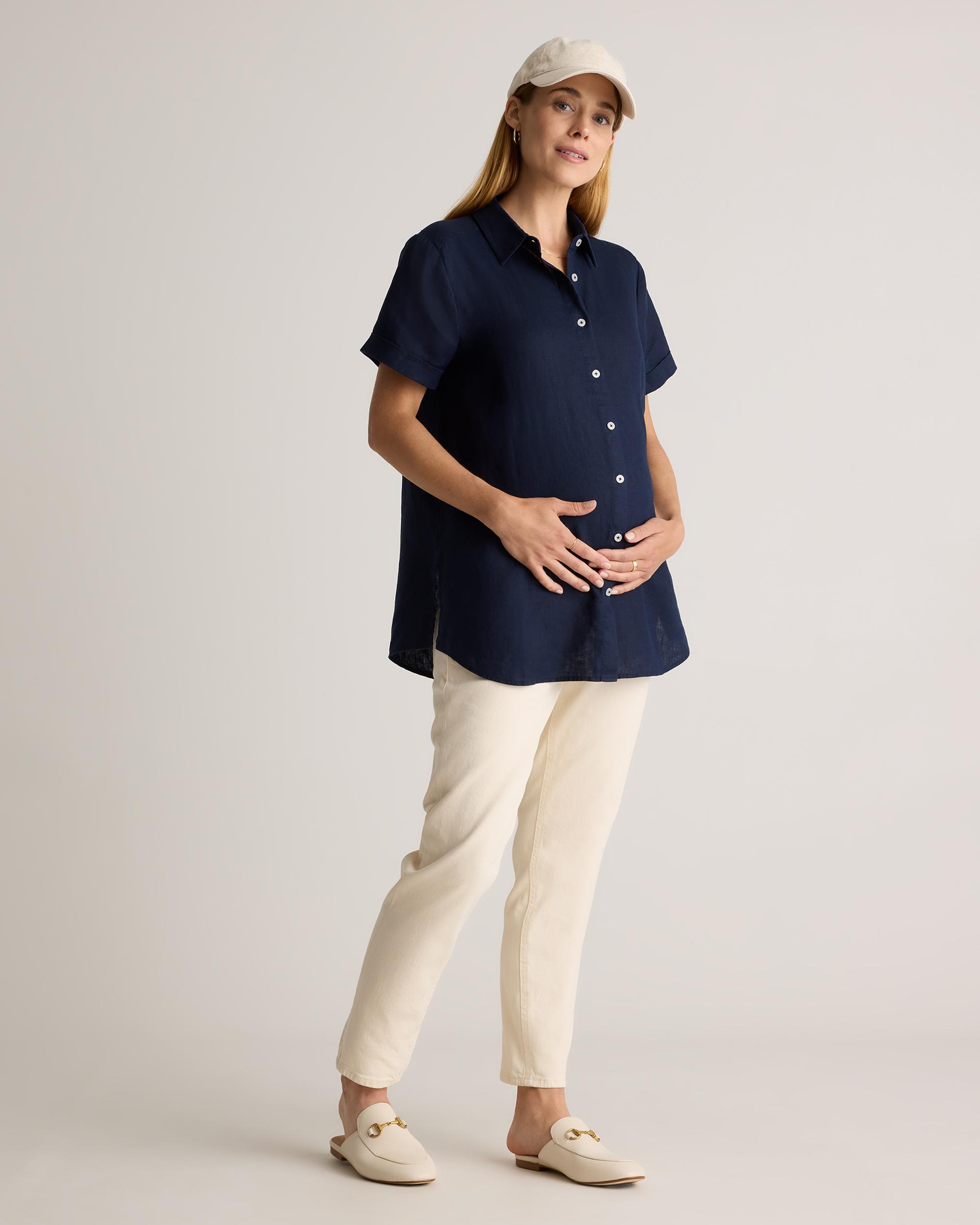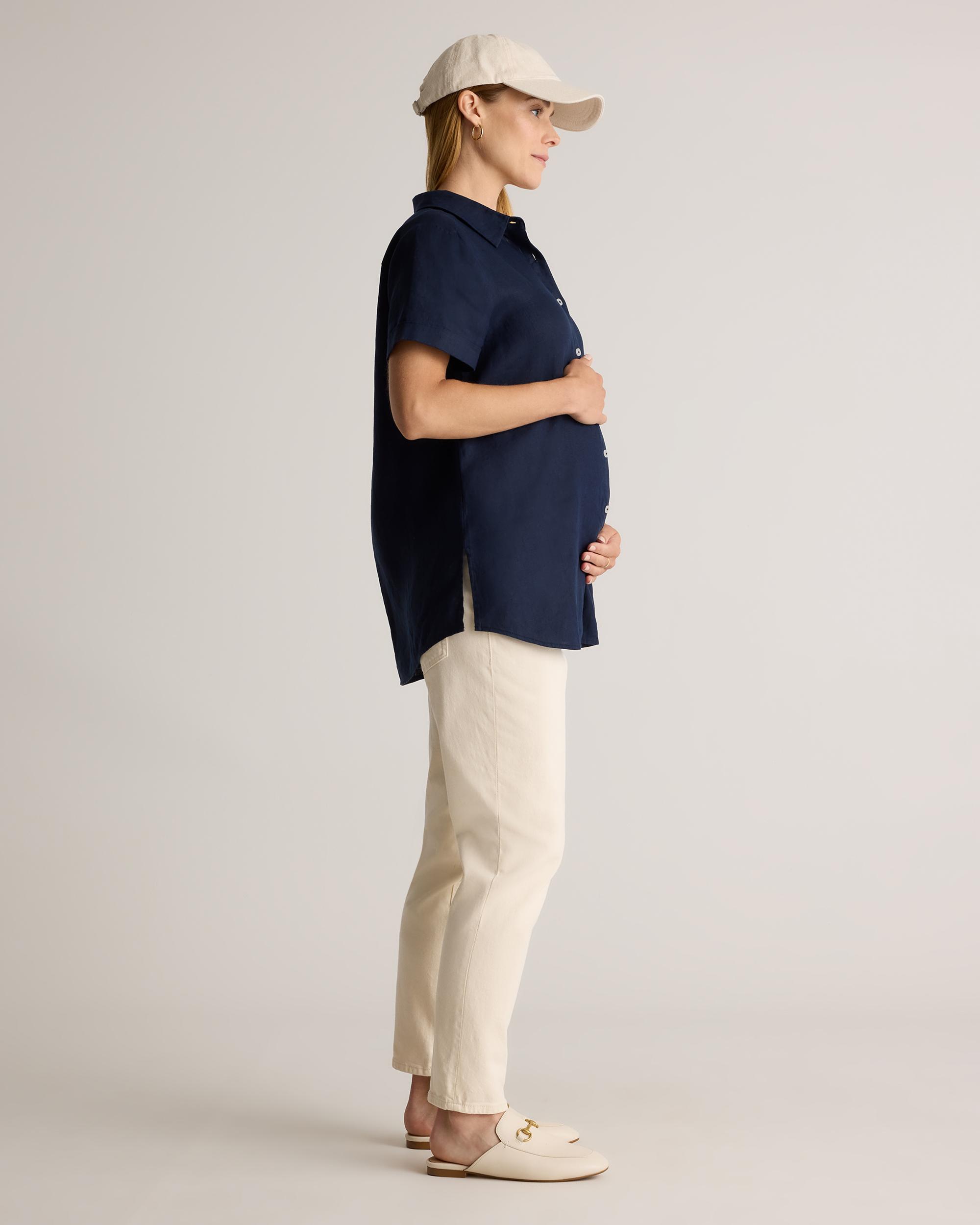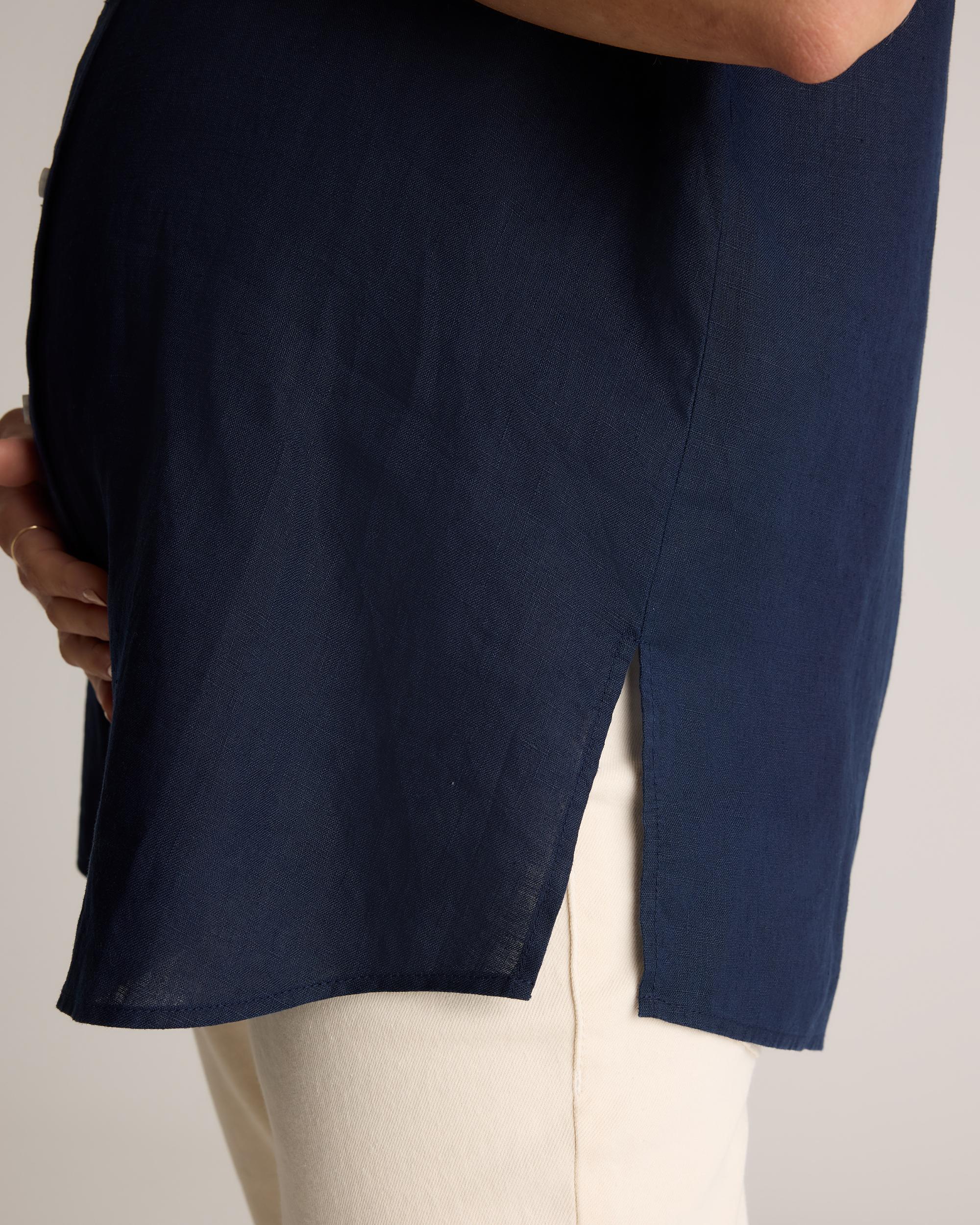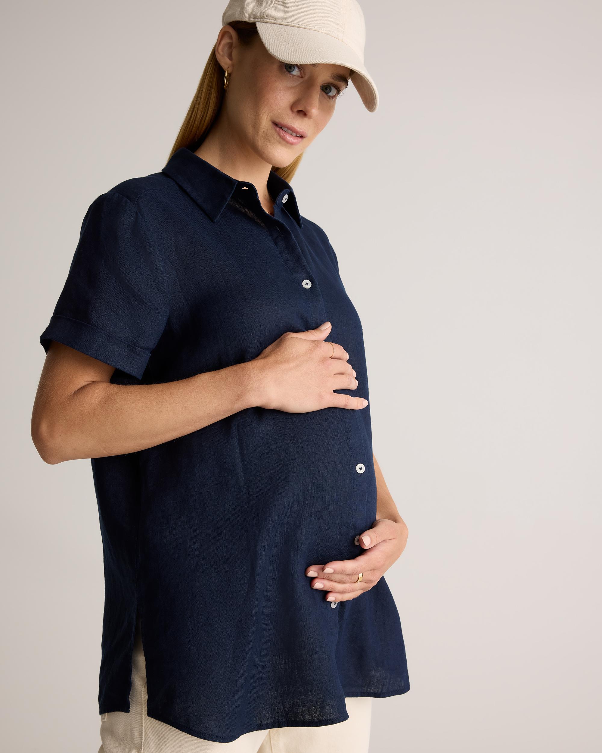 Survive summer without breaking a sweat in our 100% European Linen Maternity Camp Shirt. Made from premium European linen, this lightweight, breathable shirt helps keep you cool on those warm, sunny days. Thoughtfully designed to fit and flatter your changing body, this shirt offers a relaxed silhouette with room to grow during pregnancy, and the button-front style makes nursing simple once baby arrives. Dress it up or down—this is one piece you'll reach for again and again. | Quince | Women's 100% European Linen Maternity Camp Shirt in Deep Navy, Size XS