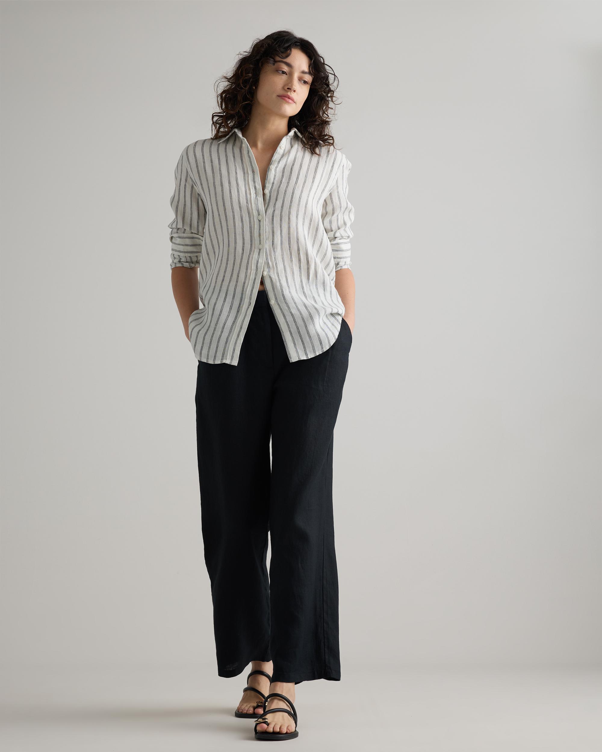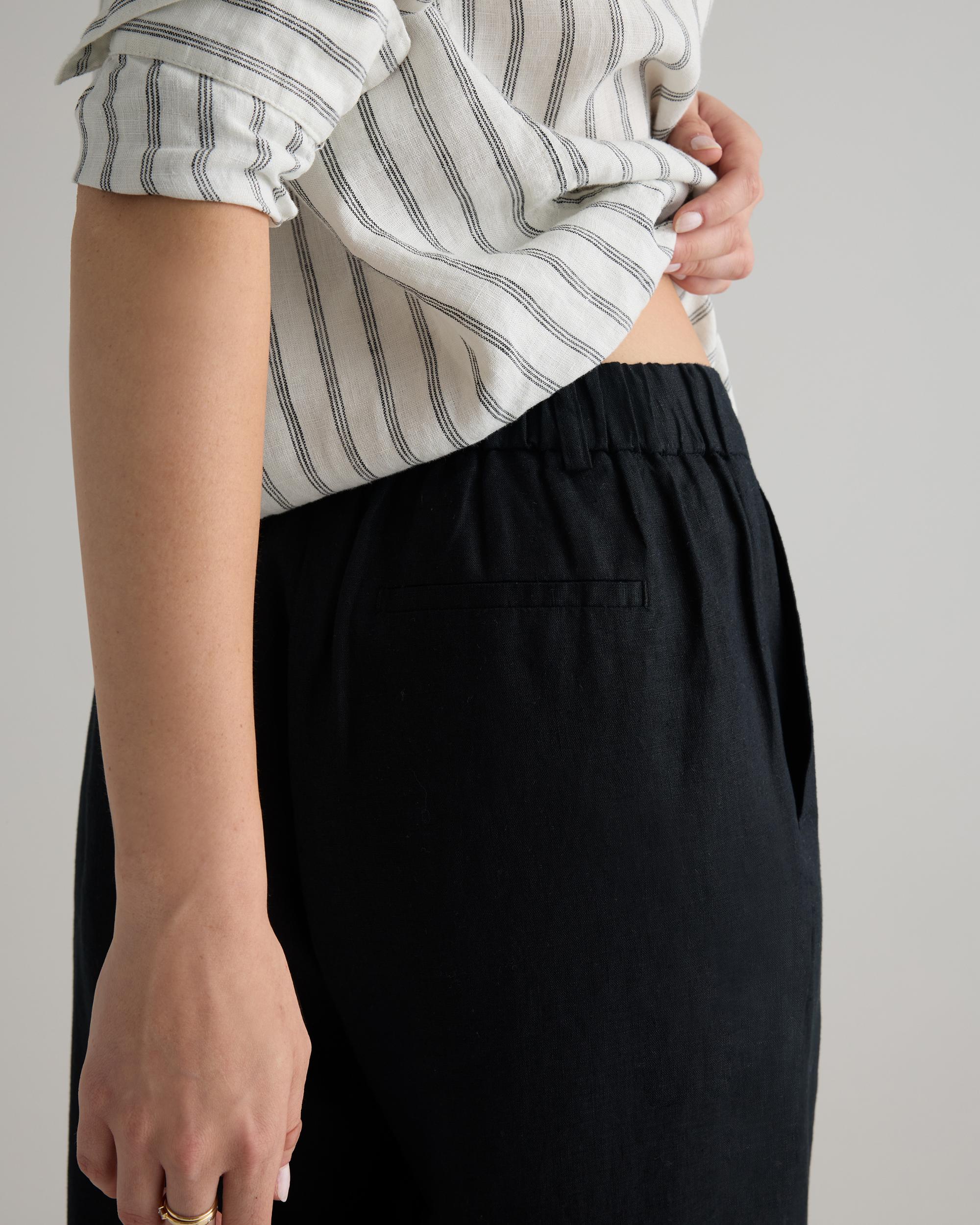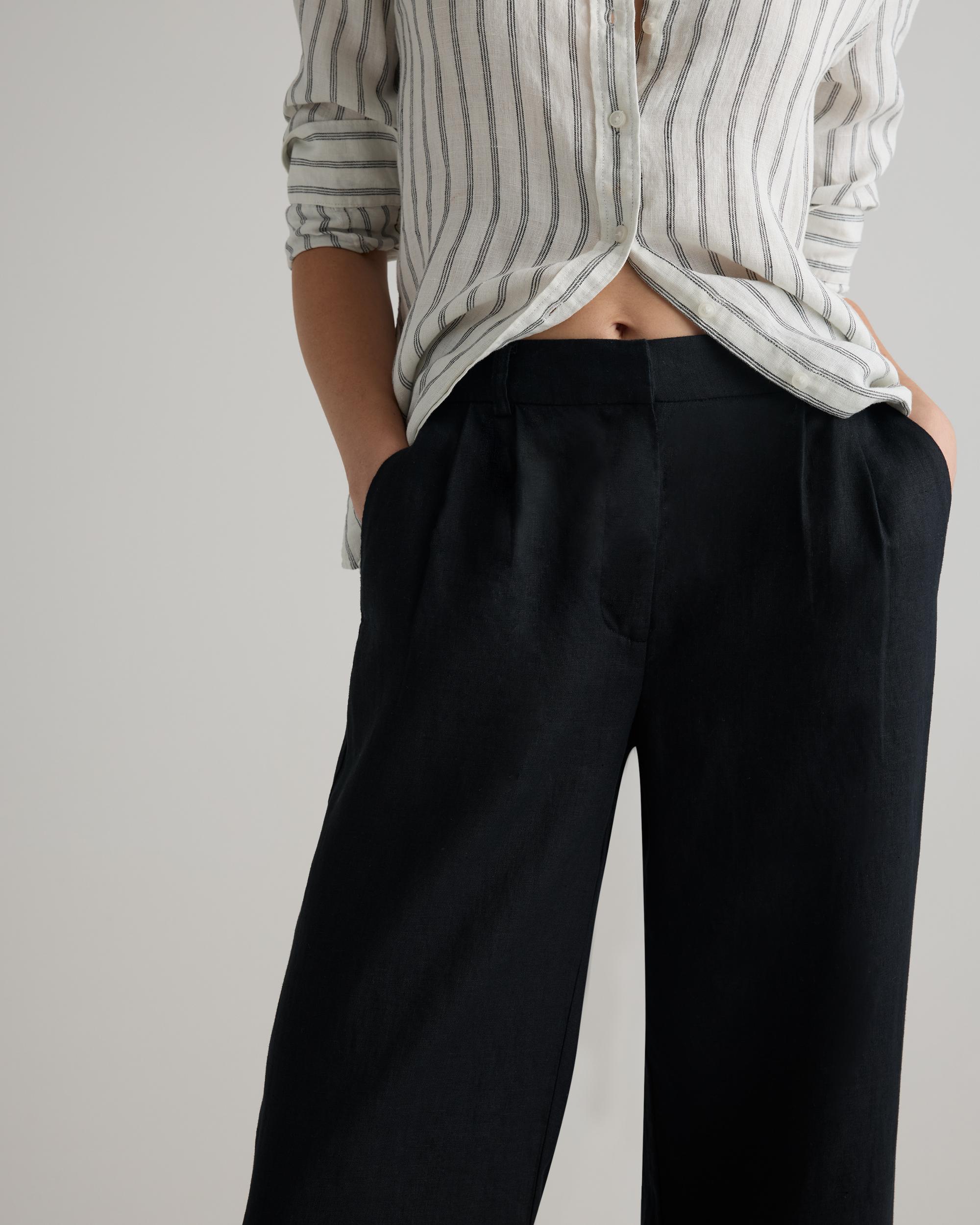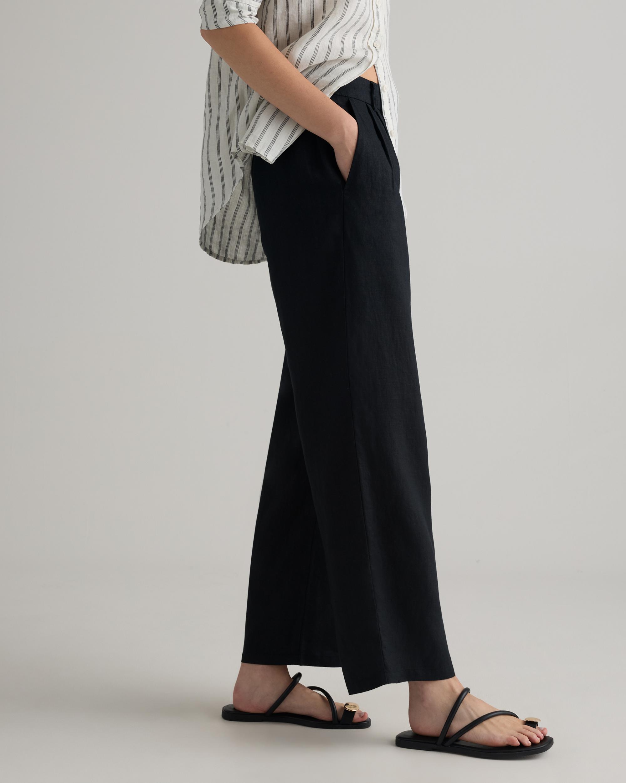 Pleated trouser, laid-back luxe edition. Made from 100% European linen, these pants are elevated, airy, and effortless. Featuring an elastic waistband at the back and traditional pleated details at the front, they keep it classic and comfy at the same time. Our linen is made from 100% European flax, making it breathable, sustainable, and the perfect year-round layer. | Quince | Women's 100% European Linen Pleated Trouser in Black, Size 12