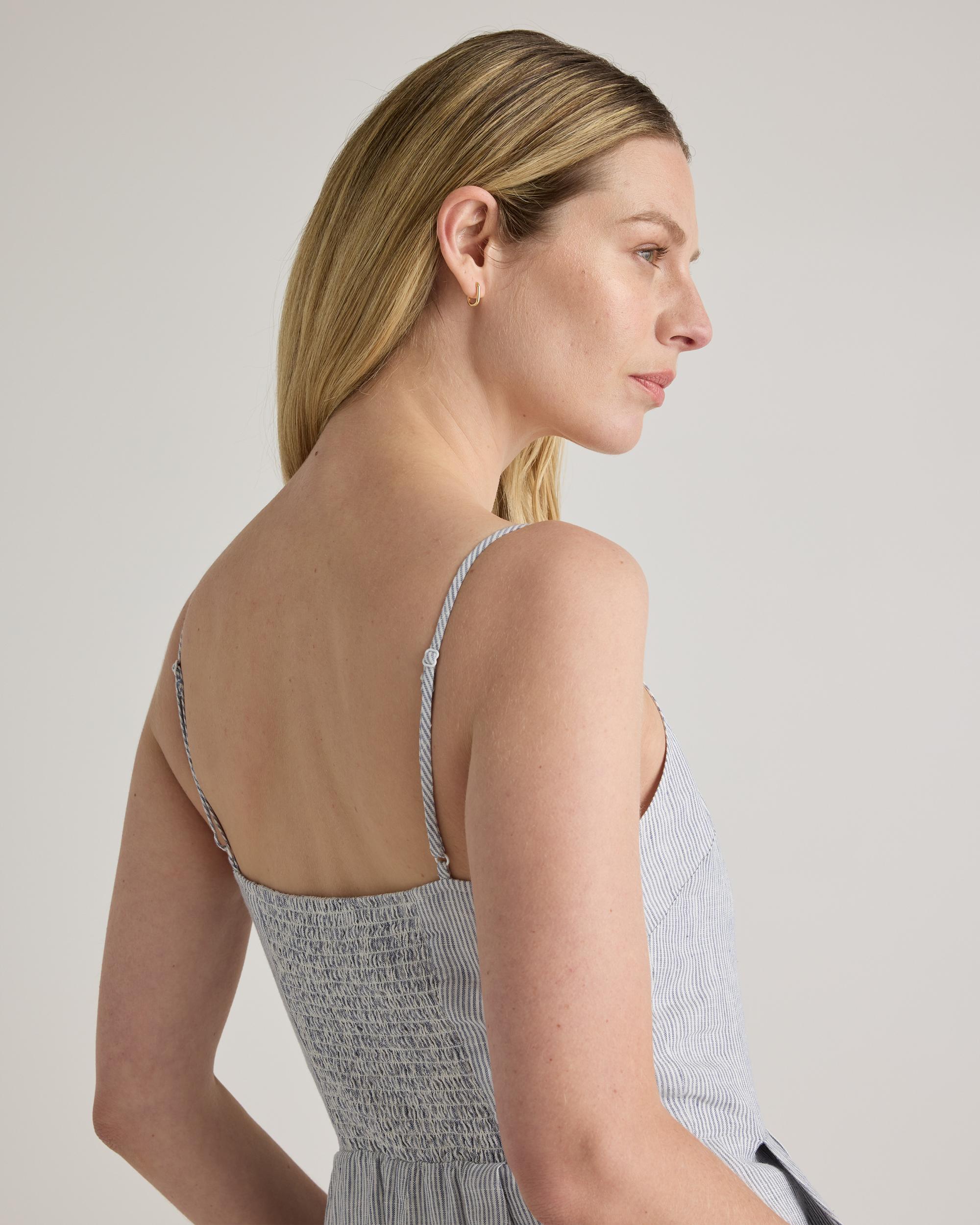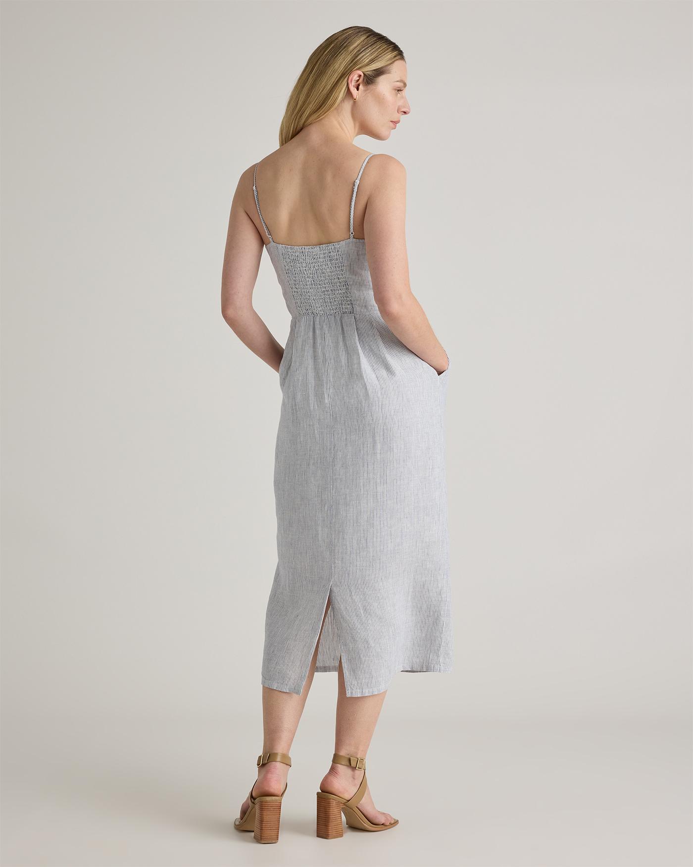 Crafted from the finest quality linen sourced from Europe, our 100% European Linen Scoop Neck Midi Dress is soft, breathable, and lightweight, making it the perfect choice for warm weather. The elegant scoop neck and midi length of the dress make it a versatile addition to any wardrobe. Whether you're dressing it up for a special occasion or keeping it casual for a day out, this dress is sure to turn heads. | Quince | Women's 100% European Linen Scoop Neck Midi Dress in Blue Pinstripe, Size Large
