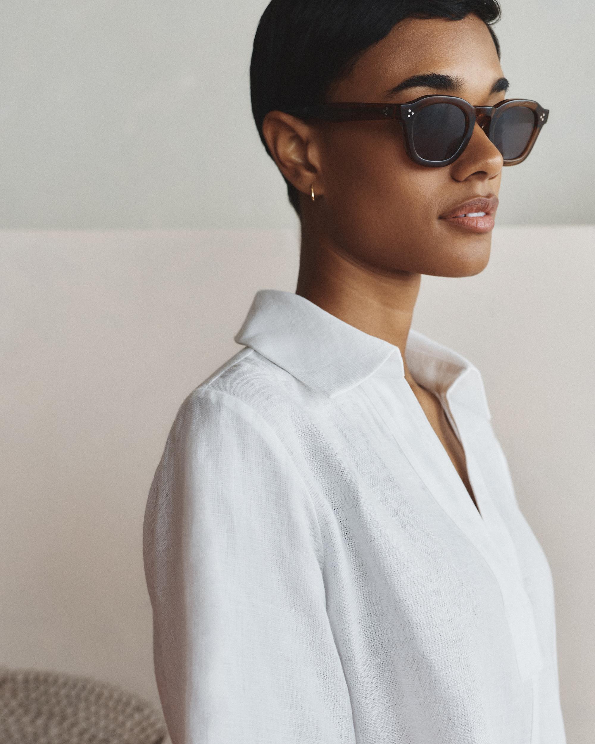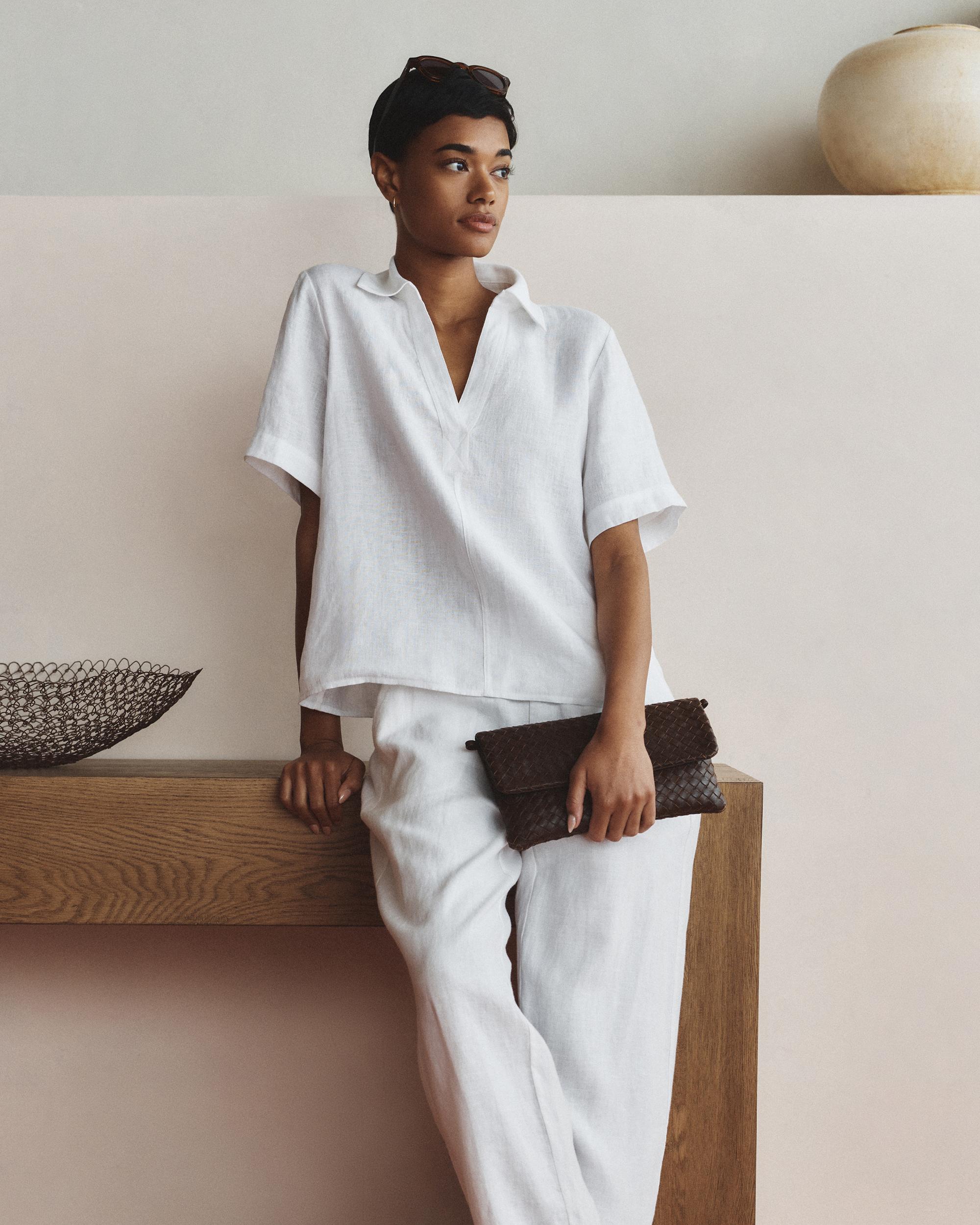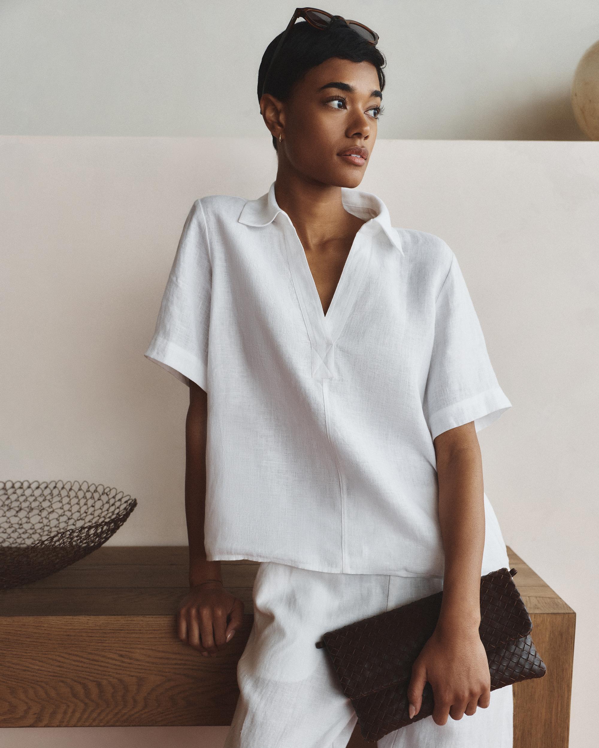Breezy and breathable with an effortlessly polished look, this short sleeve popover top is crafted from 100% European linen for lightweight comfort. Featuring a classic collared neckline and a modern open placket, it blends timeless styling with warm-weather dressing. | Quince | Women's 100% European Linen Short Sleeve Popover Top in White, Size Small