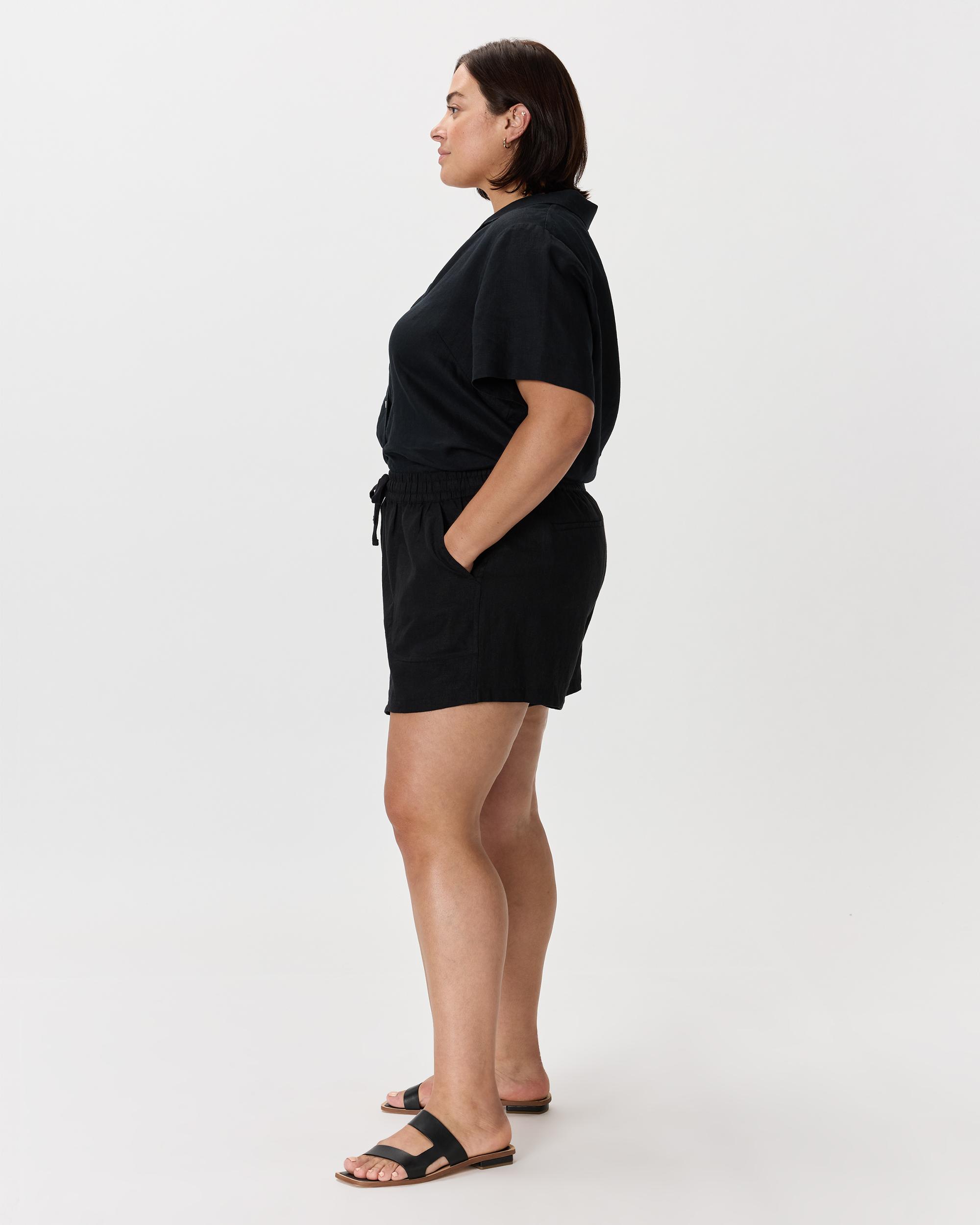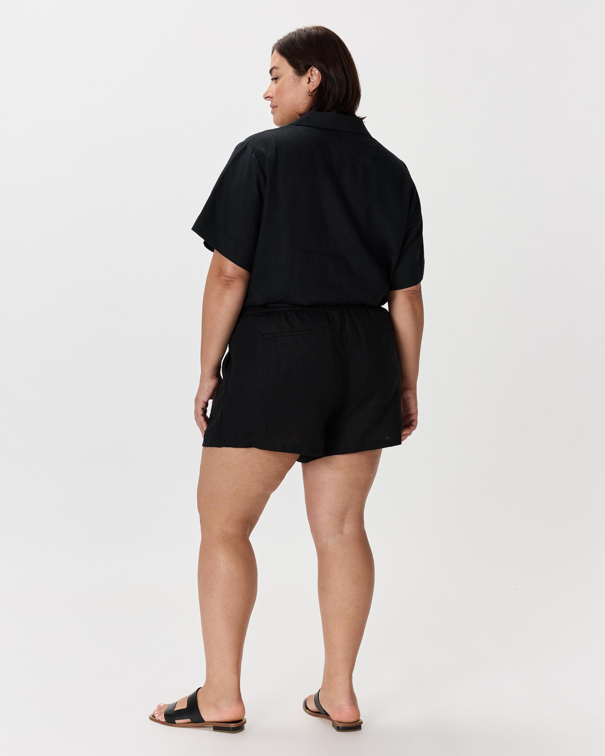These cute and comfy linen shorts are a summer staple in our wardrobes. Easy to wear for that laidback aesthetic, with a drawstring waist and pockets. Our linen is made from 100% European flax, which is more sustainable and less resource-intensive to grow. Linen is the ultimate temperature-proof fabric because it's breathable and naturally heat-regulating. Also offered in sizes XS-XL. | Quince | Women's 100% European Linen Shorts in Black, Size 1X