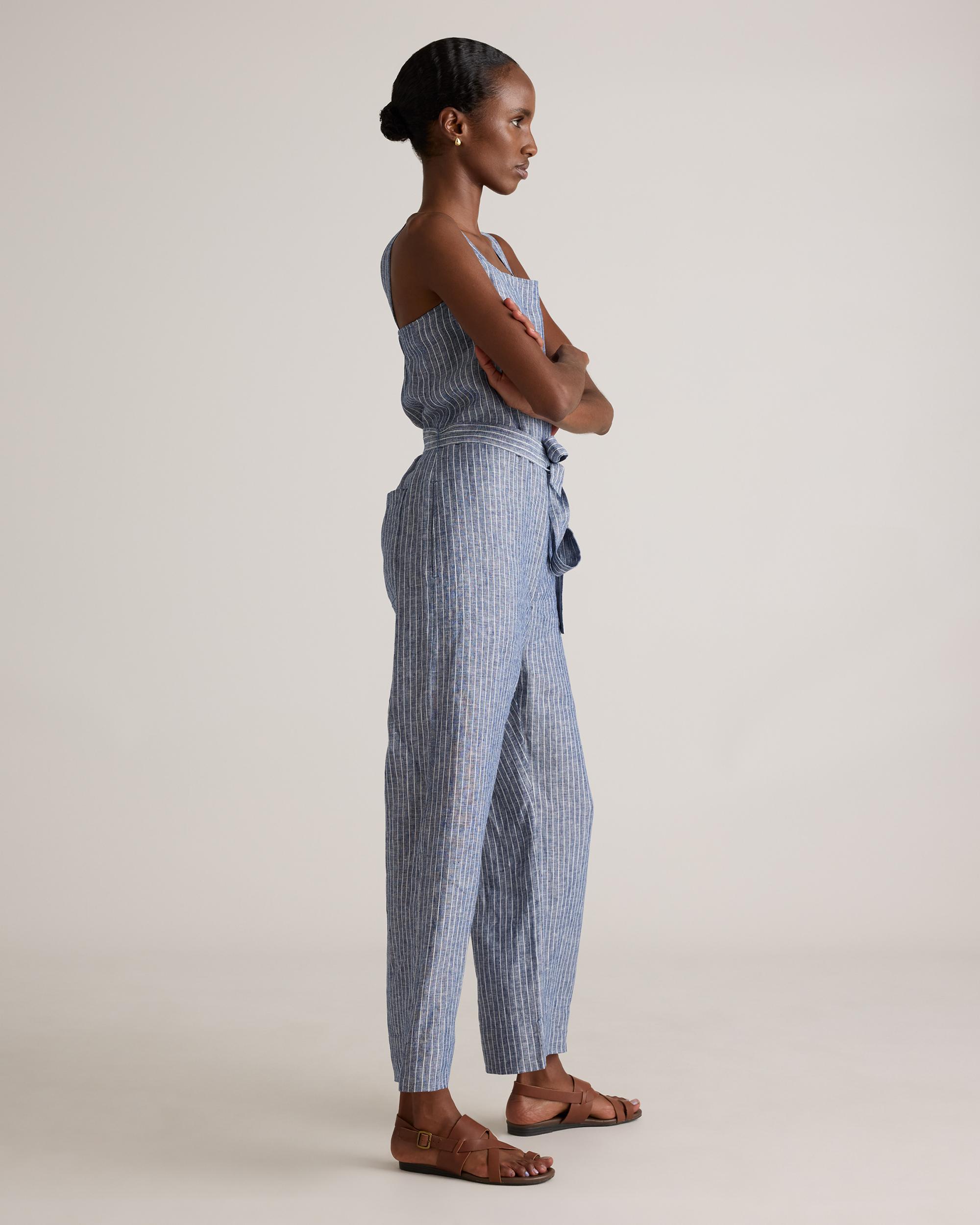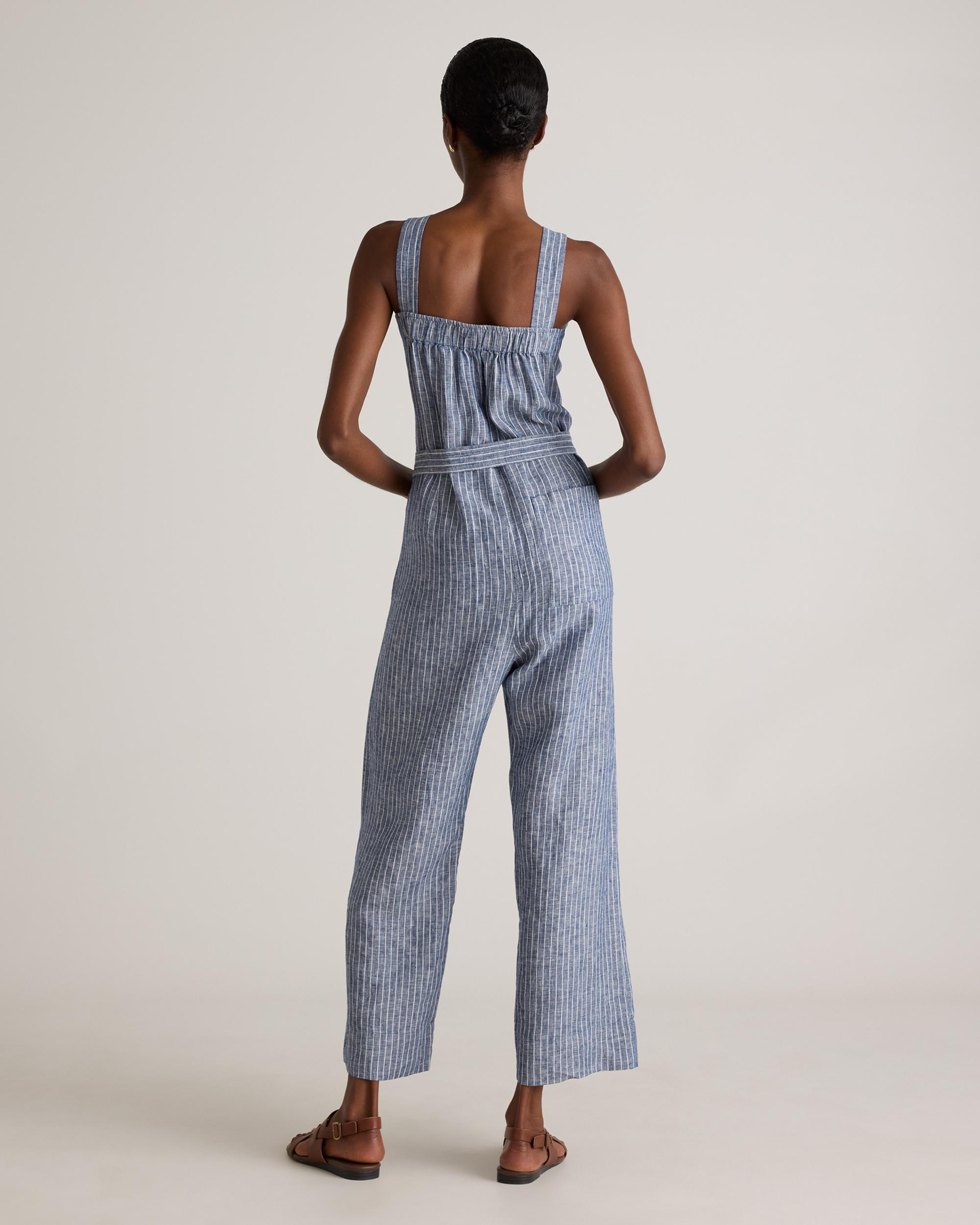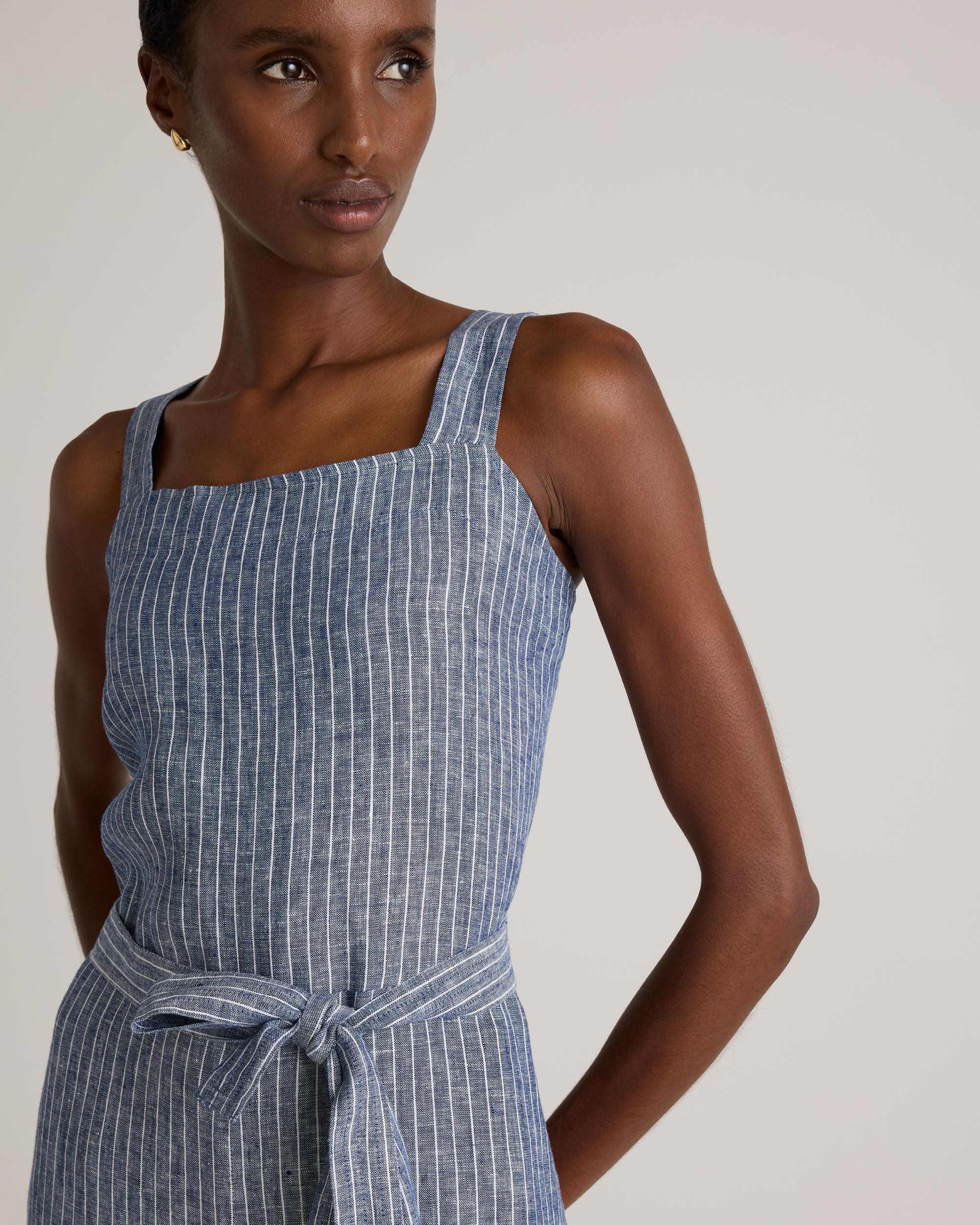One and done. Just add accessories for an effortlessly cool utilitarian-chic look. Our square-neck linen jumpsuit from our best-selling European linen collection couldn’t be simpler with adjustable shoulder straps and self-tie belt for a perfect fit. Did we mention it’s also super comfy, breathable, and lightweight? | Quince | Women's 100% European Linen Square Neck Jumpsuit in Chambray Stripe, Size Large