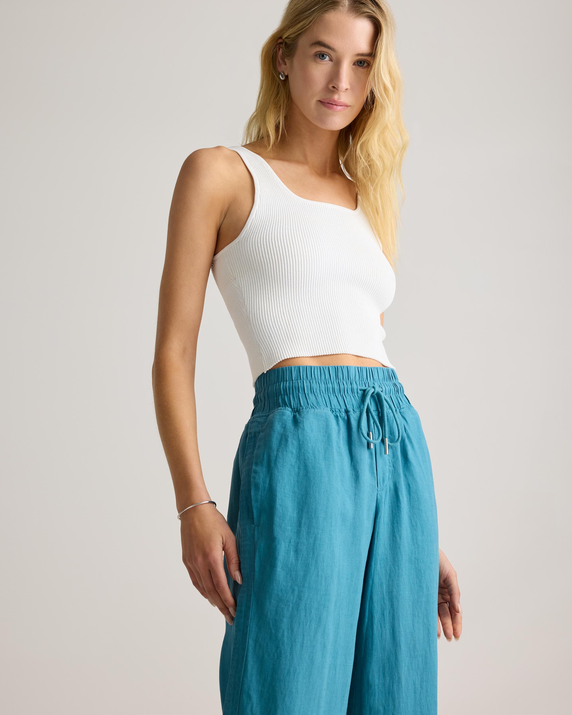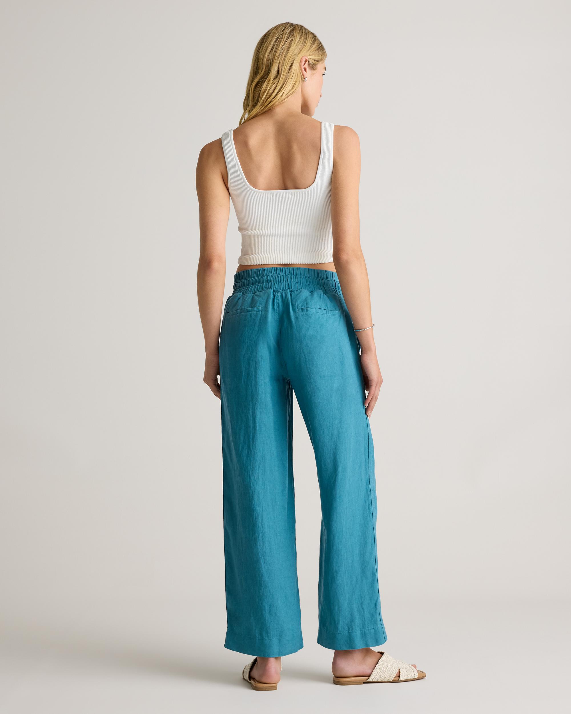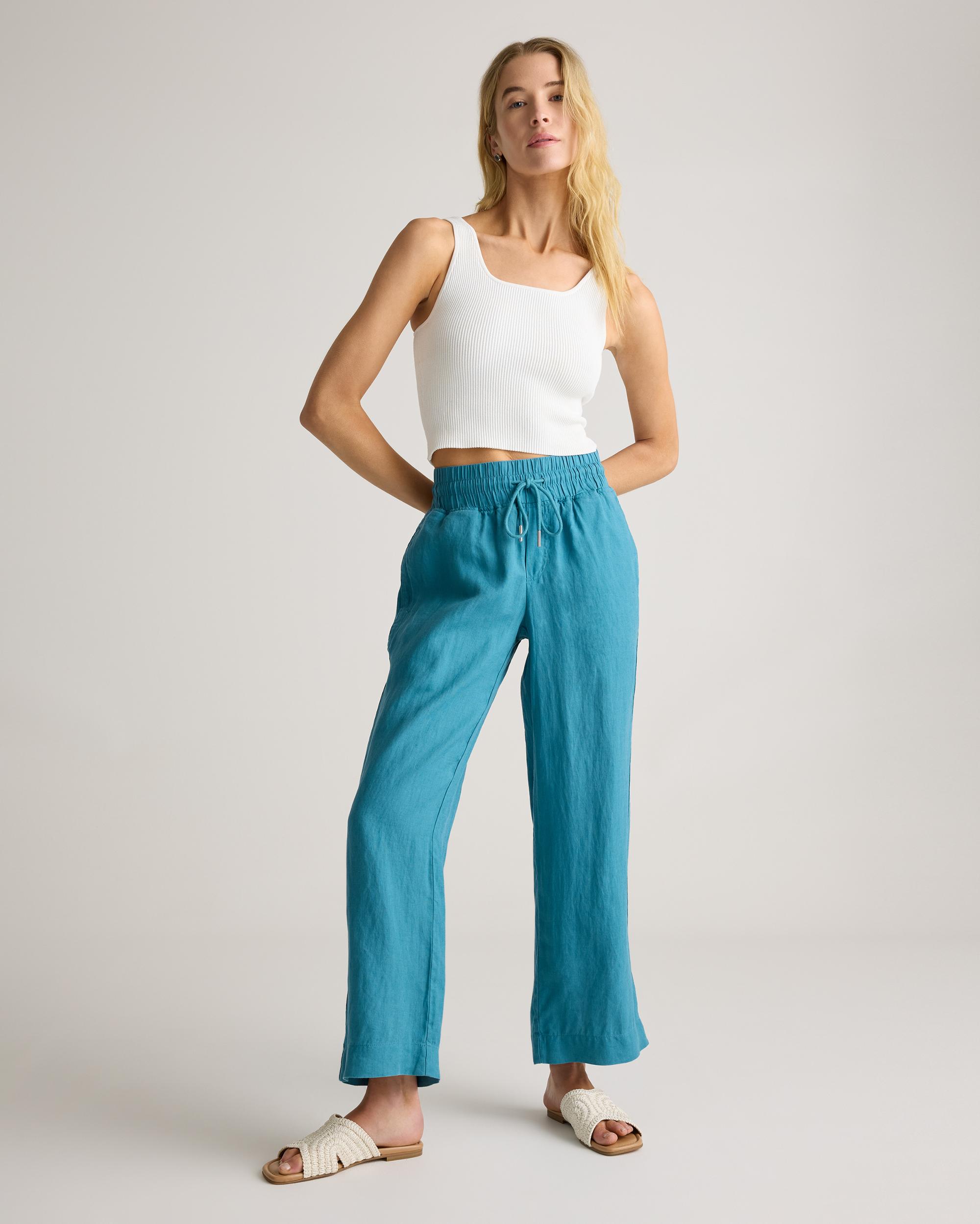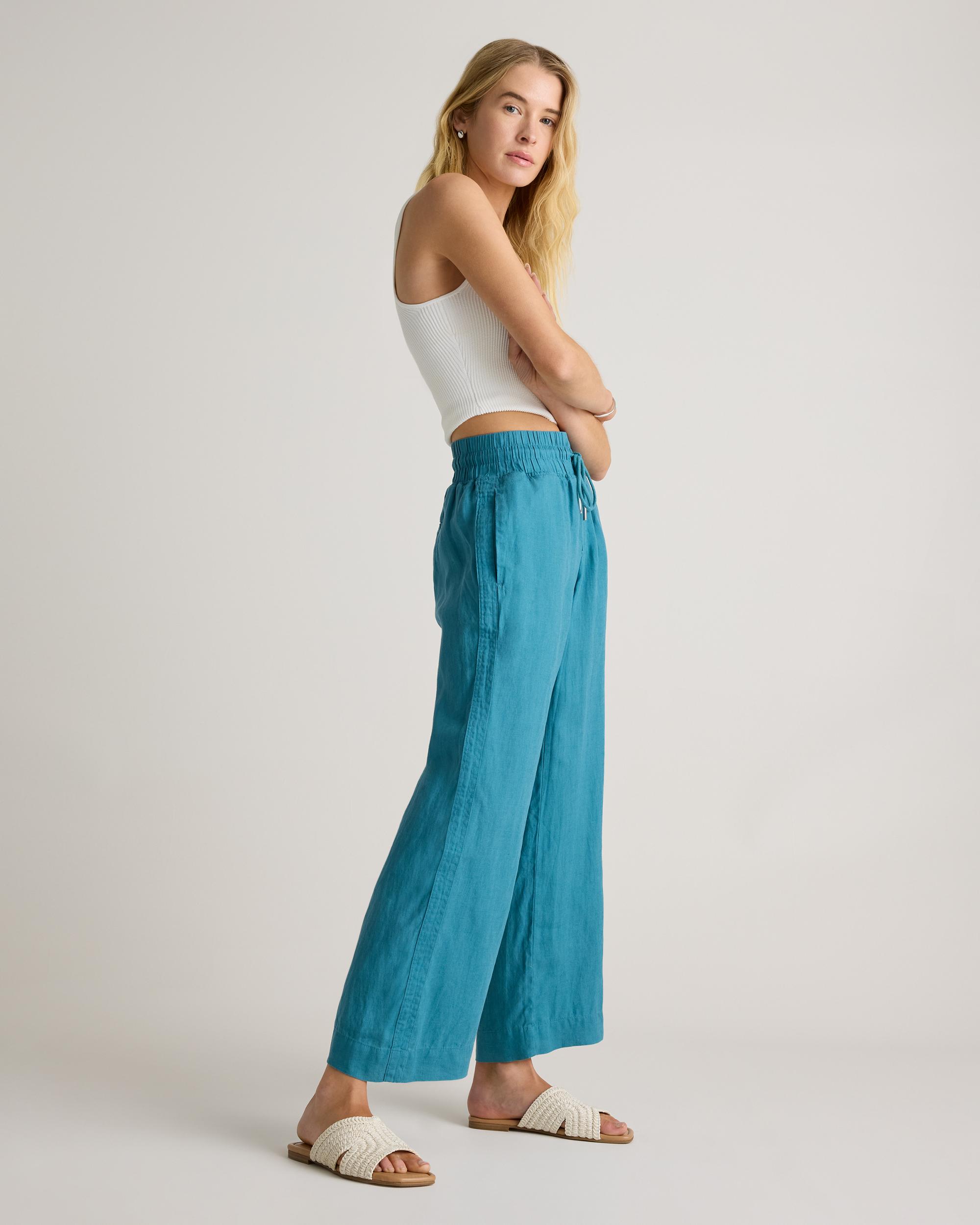 Looks like effortless style. Feels like pajamas. We love these wide-leg linen lounge pants from our best-selling European linen collection for casual work days, lazy weekends, and vacation vibes. Relaxed fit, elastic waistband, drawstring, and functional front pockets. | Quince | Women's 100% European Linen Wide Leg Pants in Mineral Blue, Size XS