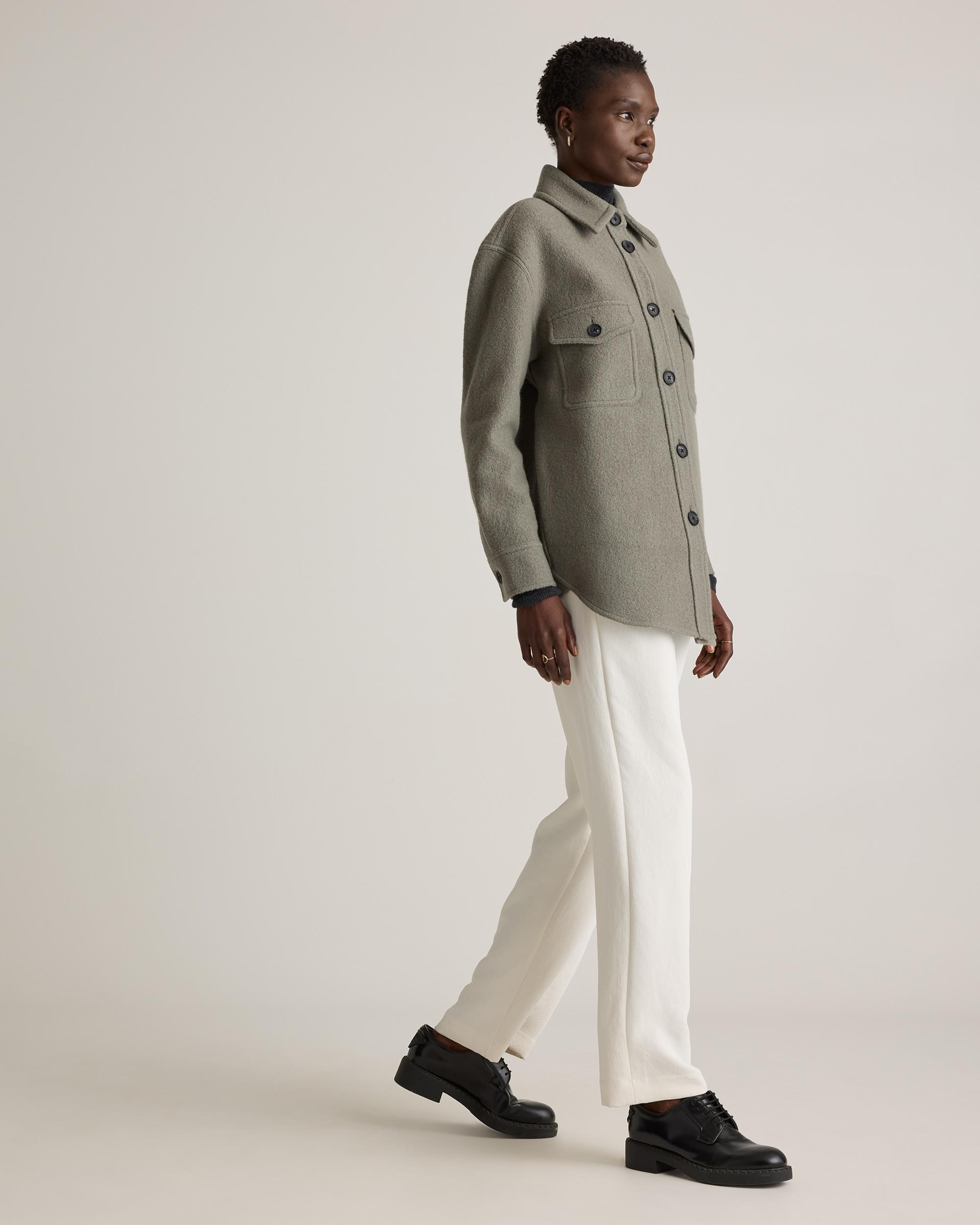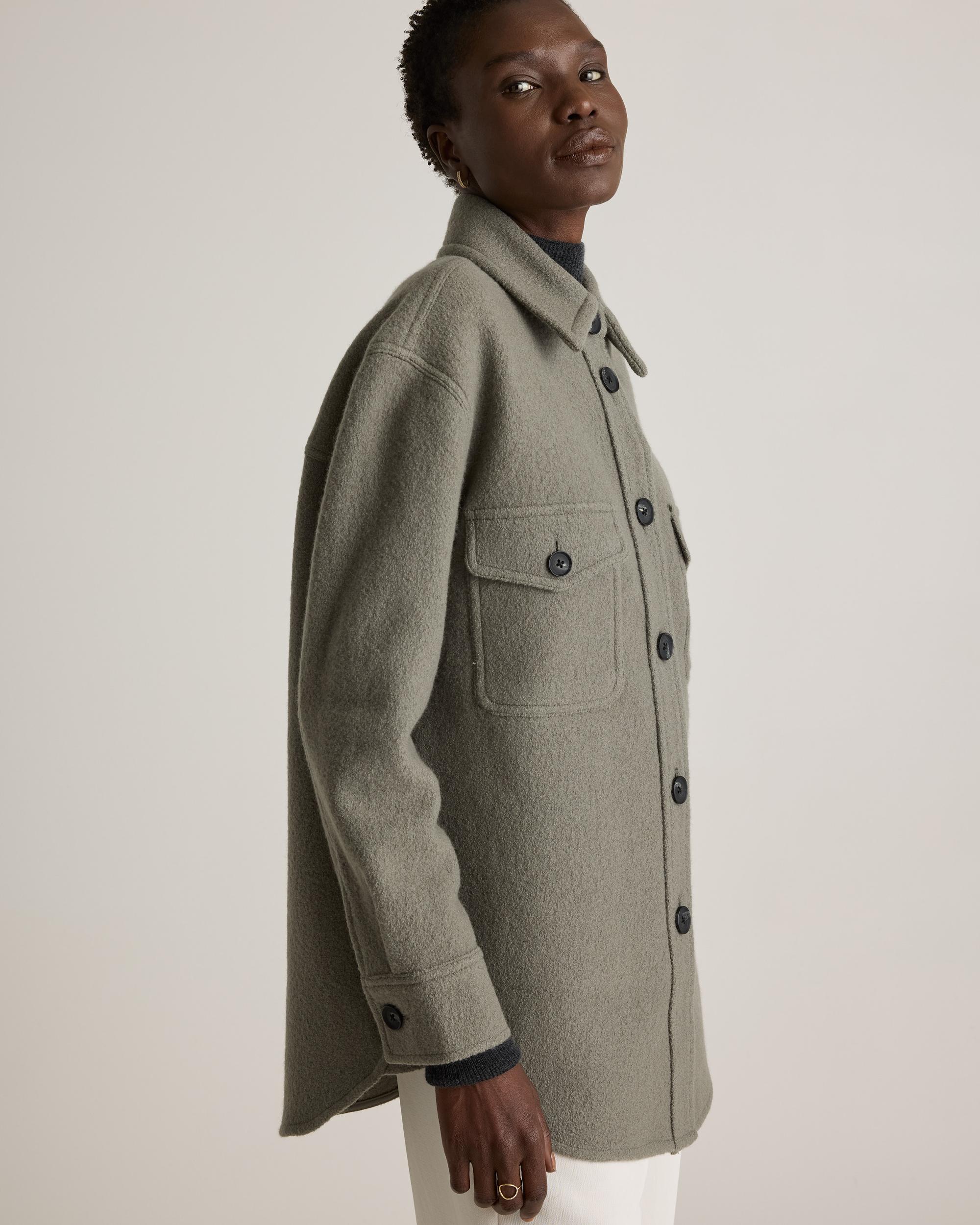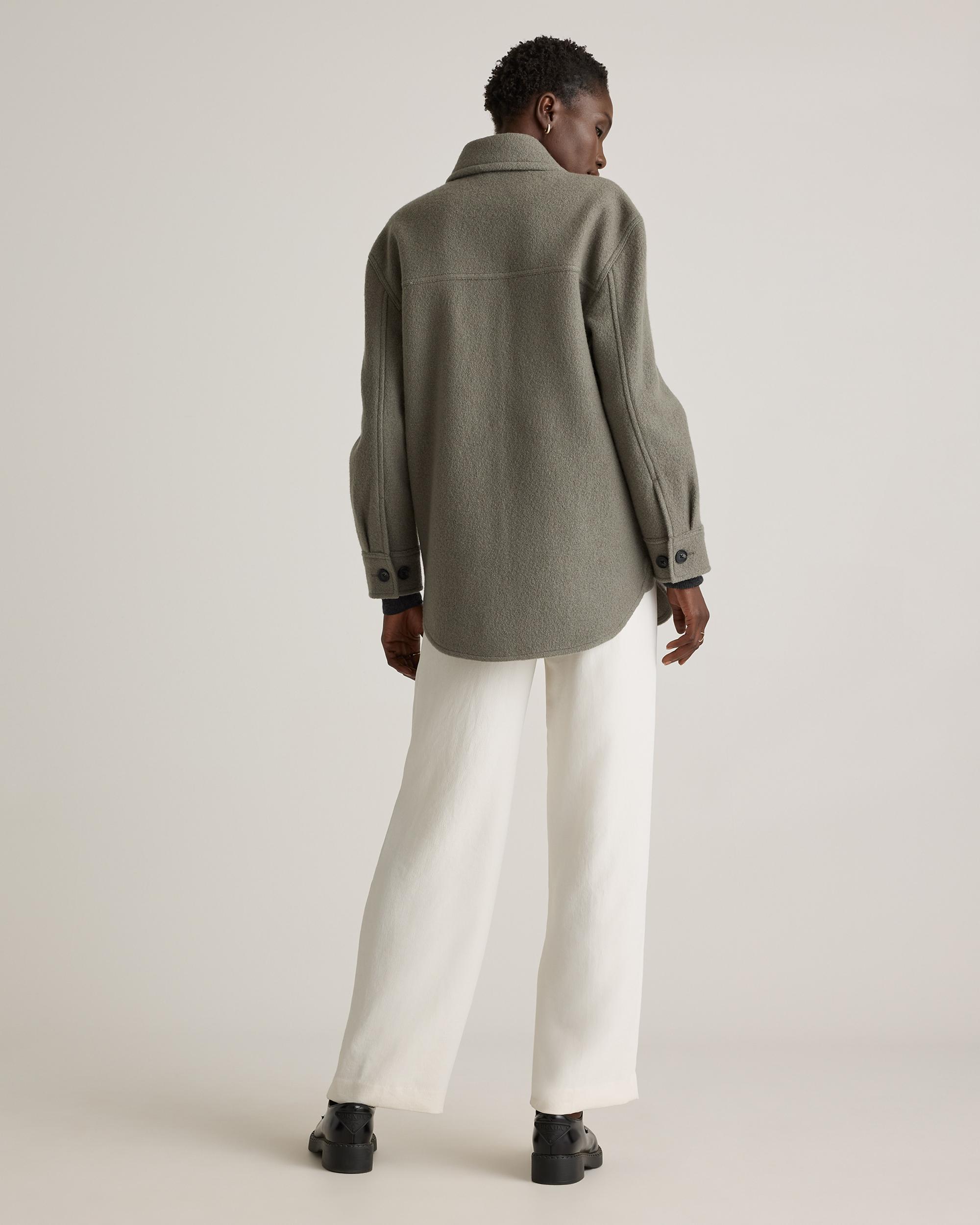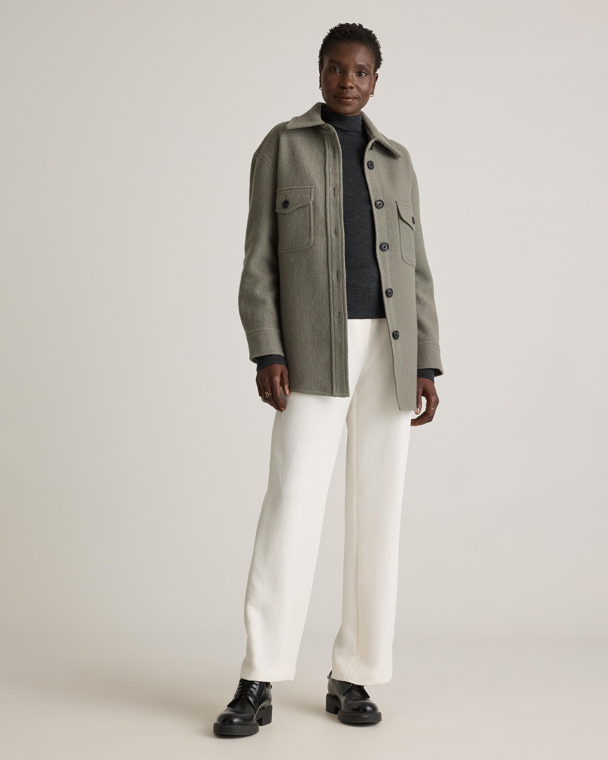 Our 100% Merino Wool Shirt Jacket is your perfect go-to style as the temperature starts to drop. Expertly tailored with boiled merino wool, this shirt jacket - shacket - has the relaxed silhouette of a shirt, but provides the warmth of a jacket. With an intentionally oversized look, it's perfect for layering and made to throw on over any outfit with ease. | Quince | Women's 100% Merino Wool Shirt Jacket in Olive, Size Small