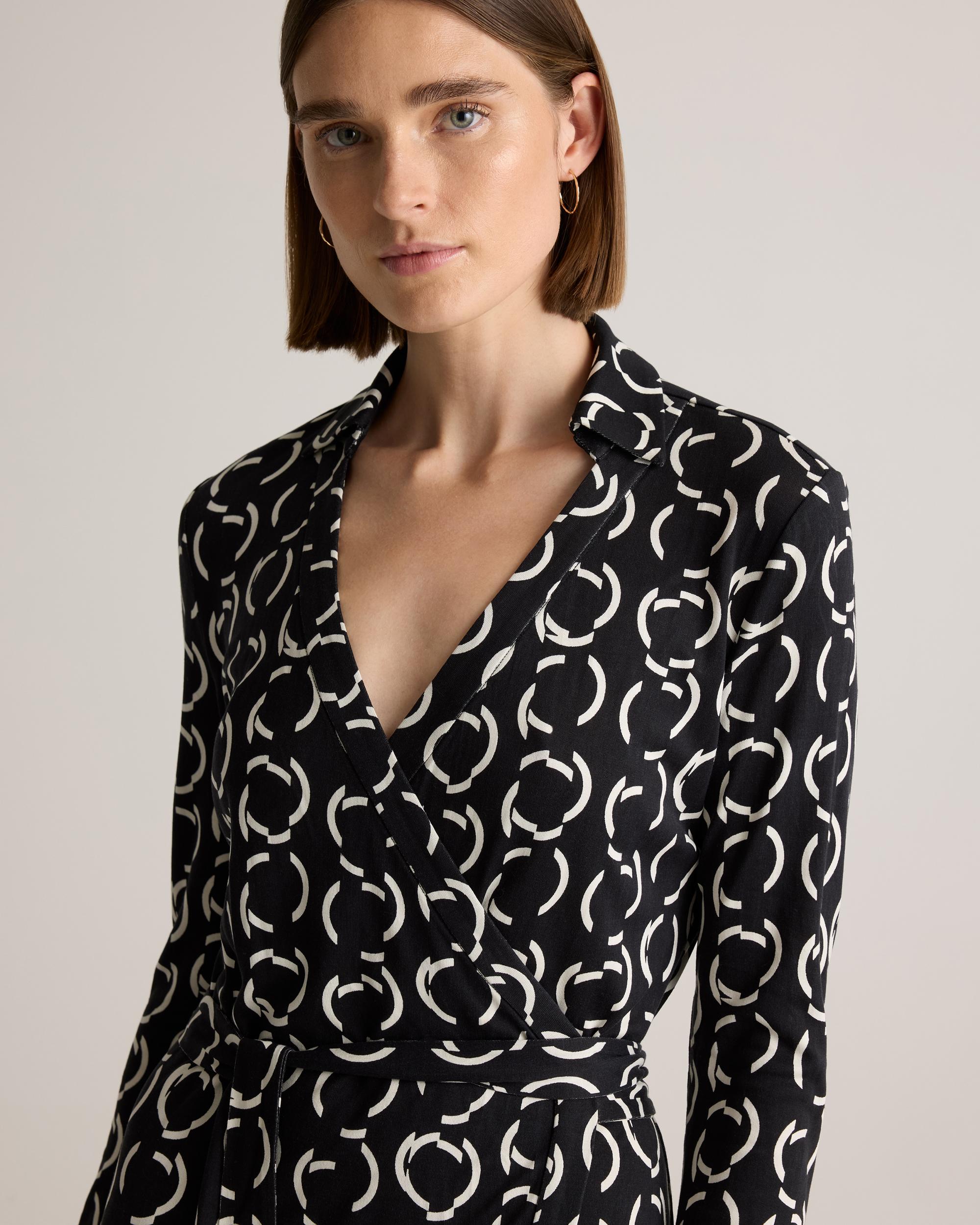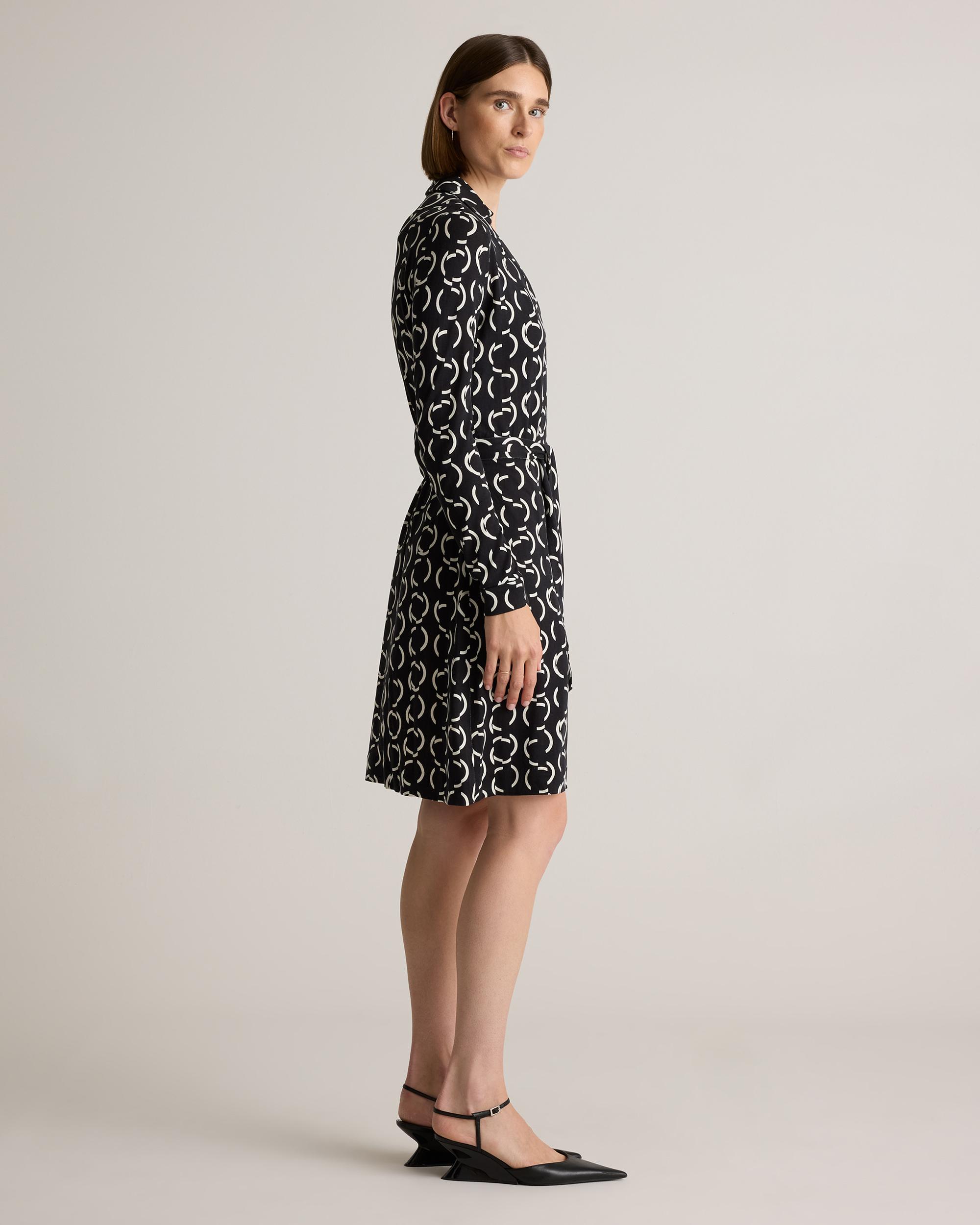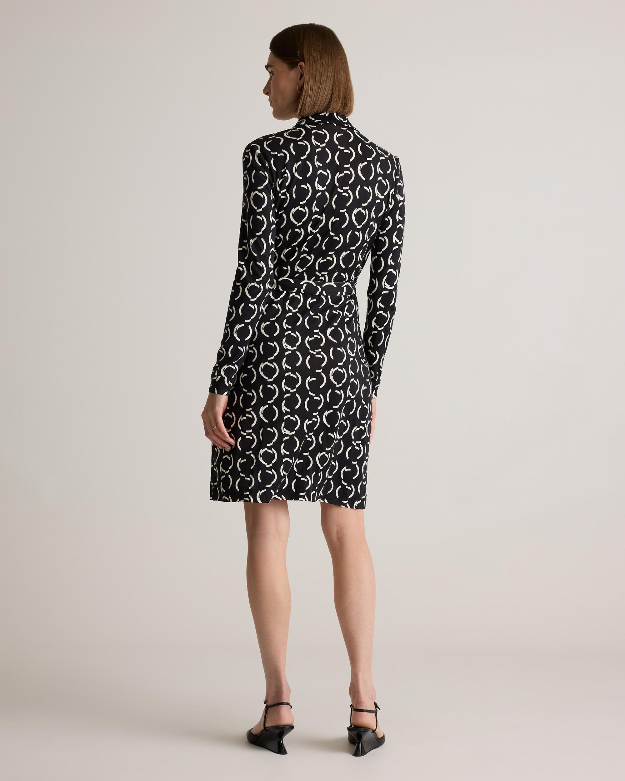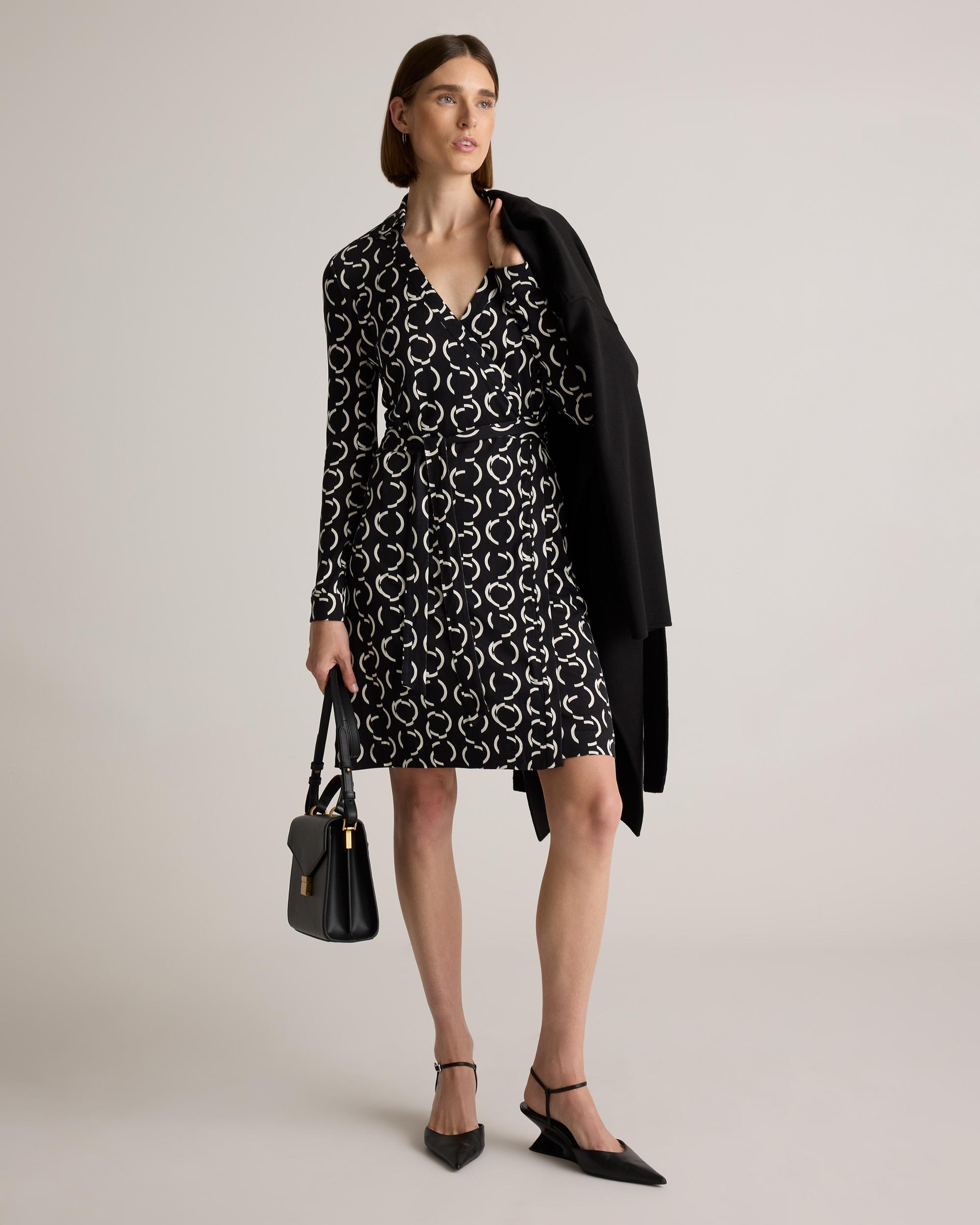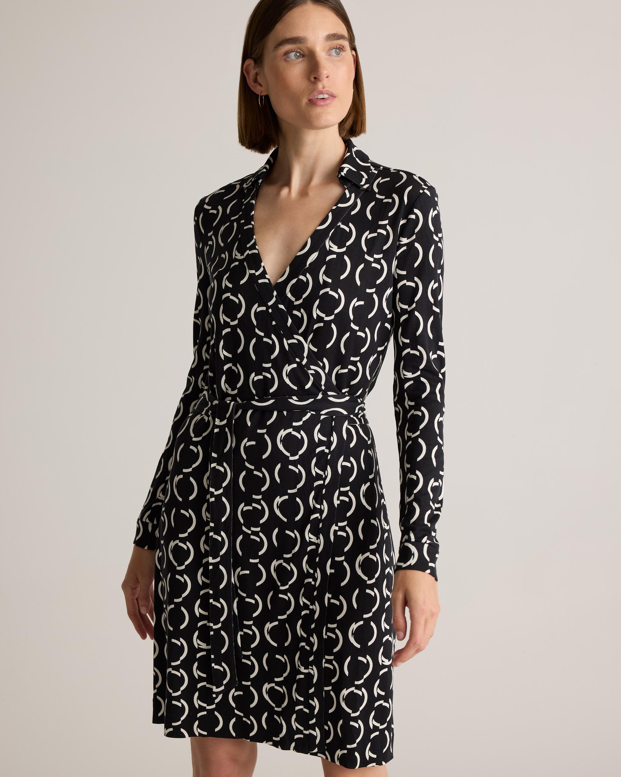She’s always there for you and never goes out of style. From trusted travel companion (read: wrinkle resistant) to date night classic, our long-sleeve wrap dress in drapey silk jersey is a true wardrobe essential. Did we mention she takes any look up a notch to perfection? | Quince | Women's 100% Silk Jersey Mini Wrap Dress in Circular Contrast, Size Medium
