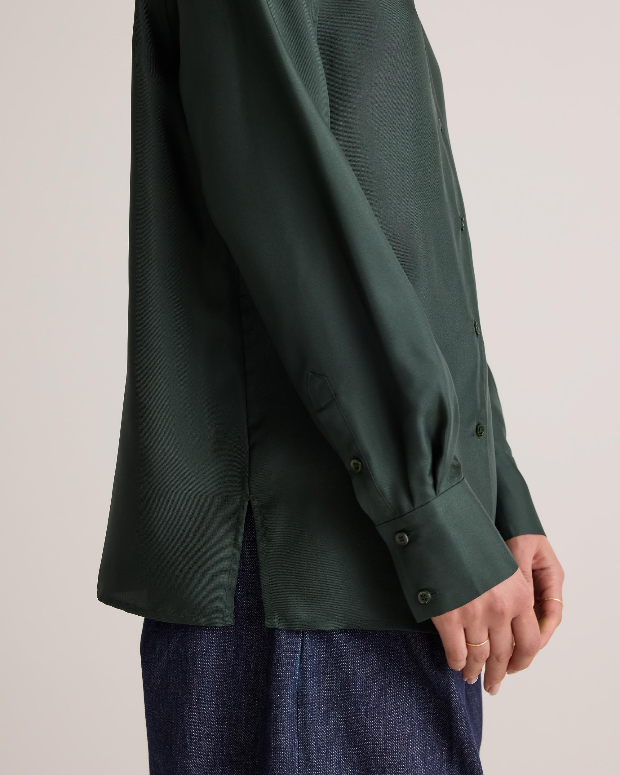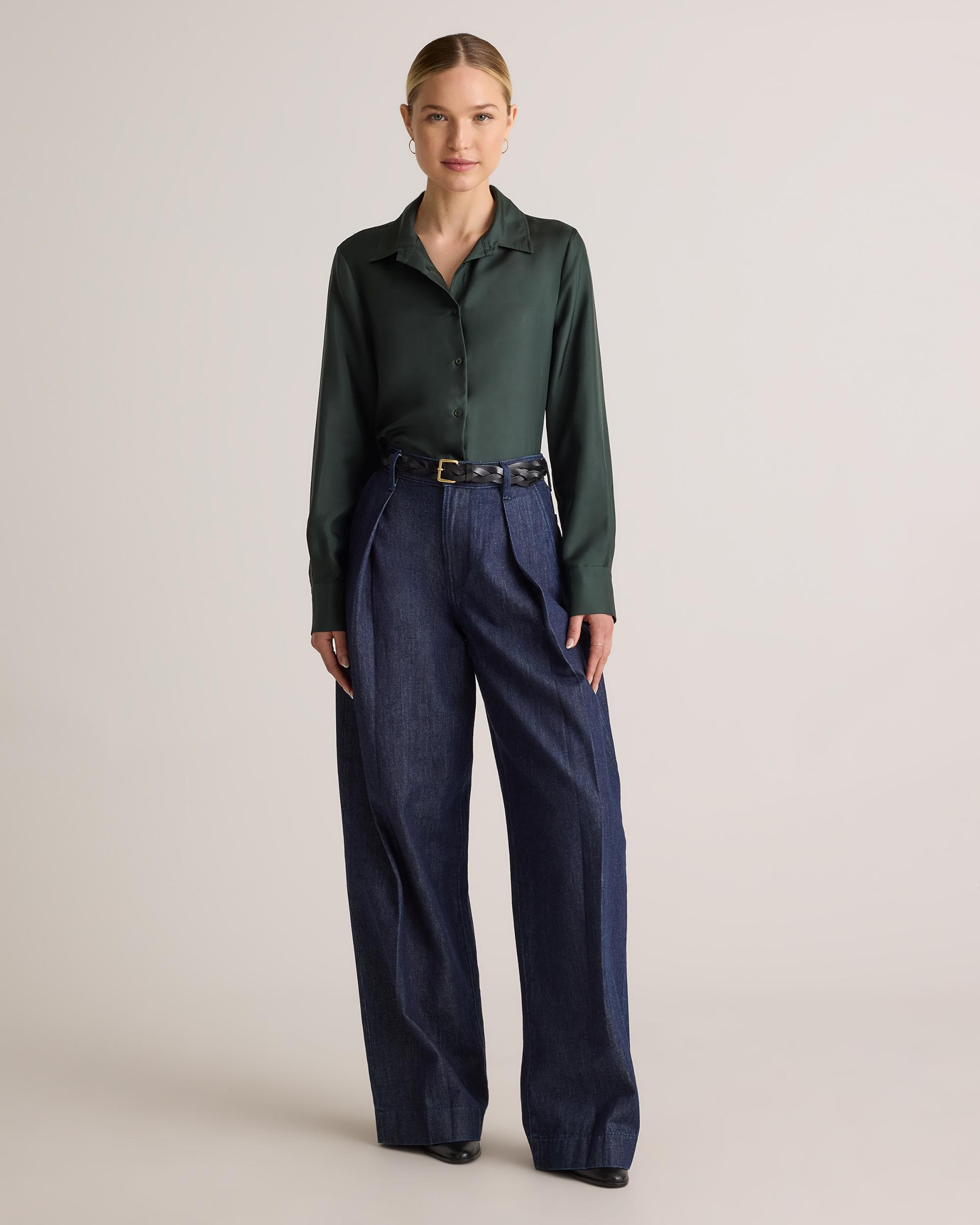 Designed with a refined collar and classic cuffs, this 100% Silk Twill Blouse adds a timeless tailored style. Pair it with sleek trousers for the office or your favorite denim for an elevated everyday look. It’s also washable, making it a luxe layer that’s both easy to wear & easy to style. | Quince | Women's 100% Silk Twill Blouse in Forest Green, Size Medium