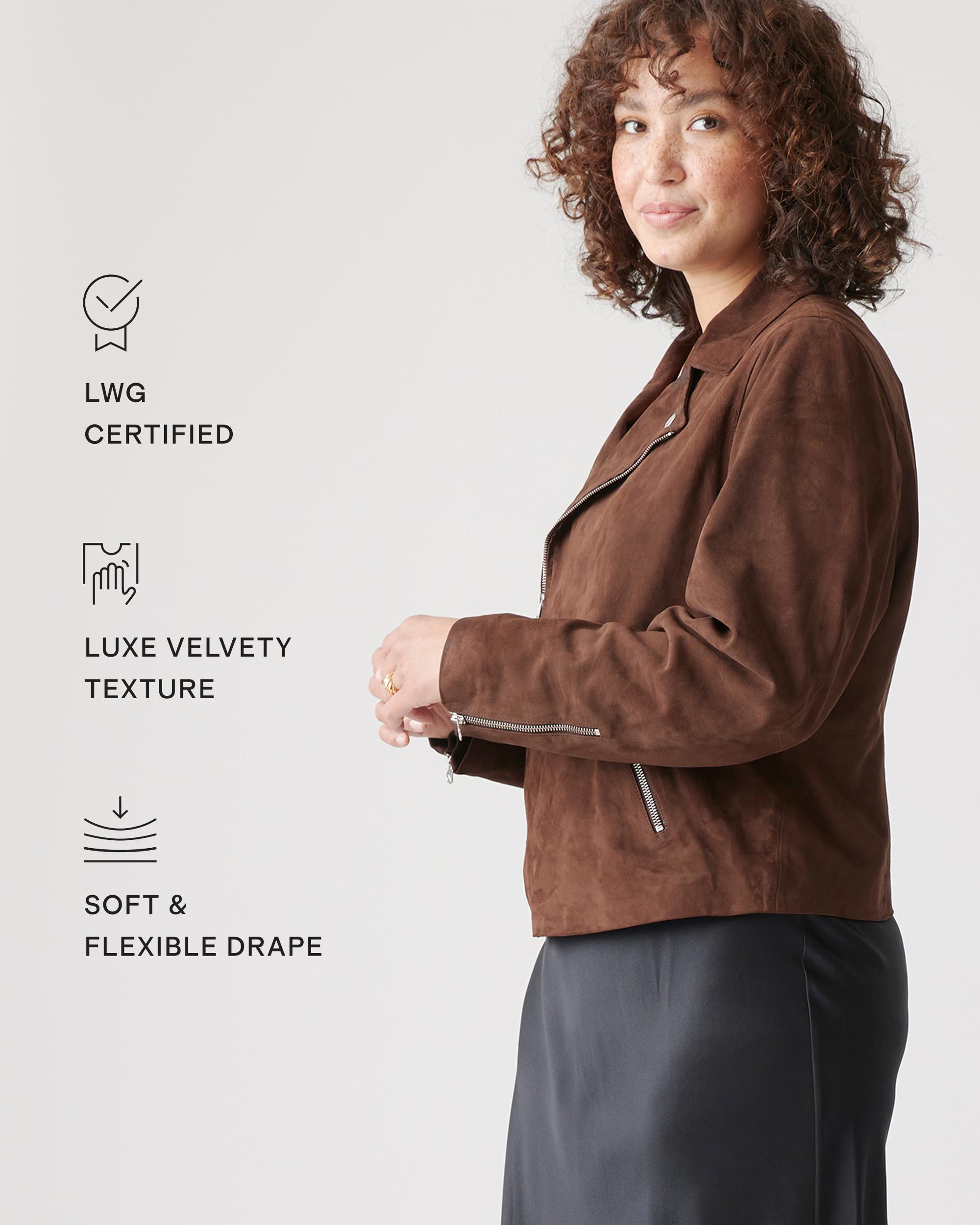 Made from 100% suede, this biker jacket comes in a classic, timeless design. So comfortable and stylish, you'll be happy wearing it again and again. Read more about what makes our leather special in our Leather 101 guide. | Quince | Women's 100% Suede Biker Jacket in Brown, Size Small, Leather