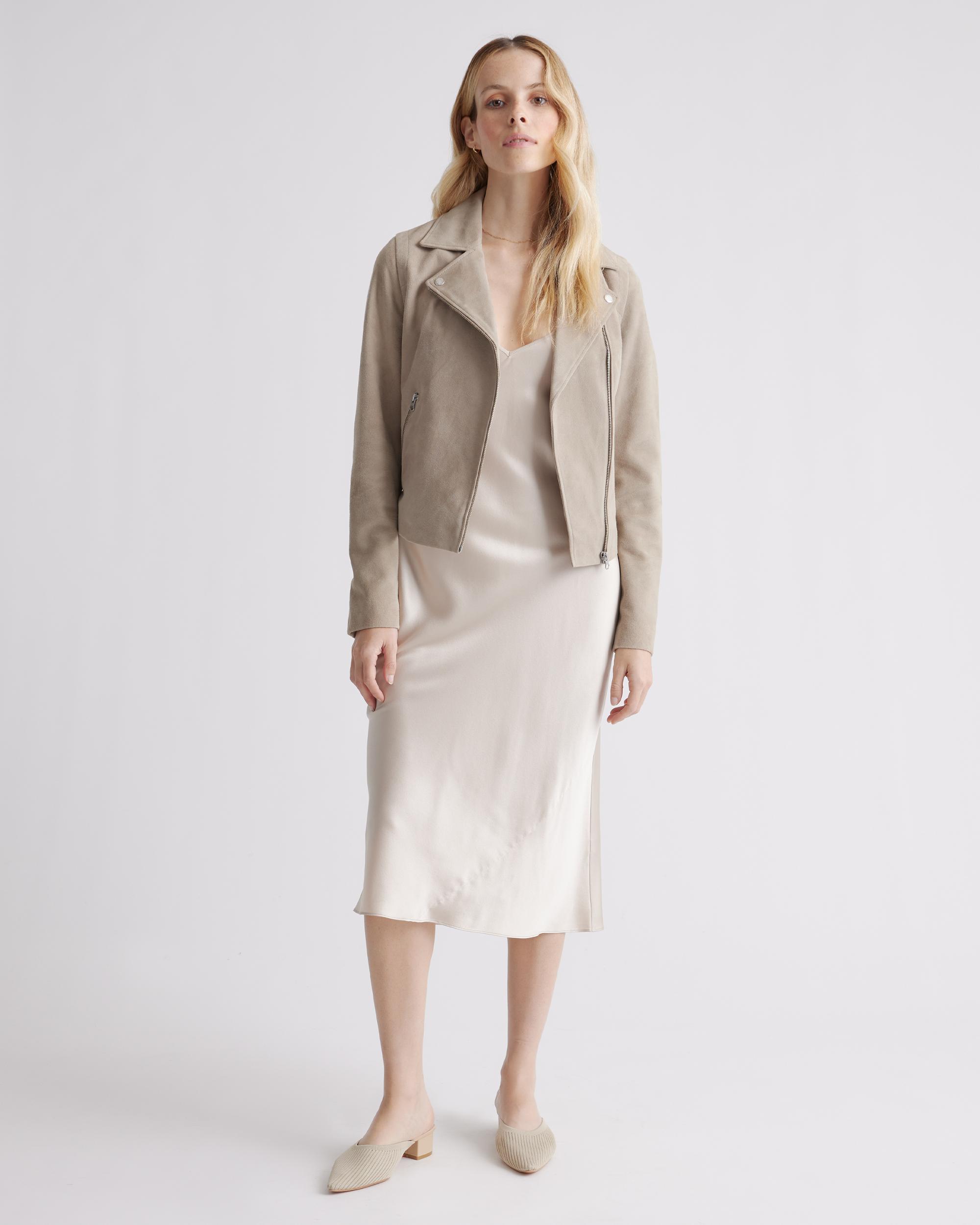 We love the midi length and bias cut of this dress! This super flattering fit is made from 100% mulberry silk, in a satin finish. The kicker? Our silk is washable. Easy to style, easy to wash for low-maintenance luxe. Plus, silk fiber contains 18 kinds of amino acids that make it amazing for skin nourishment, hypo-allergenic, and naturally thermoregulating to help maintain body temperature. Also offered in sizes 1X-3X. | Quince | Women's 100% Washable Silk Slip Dress in Champagne, Size Large