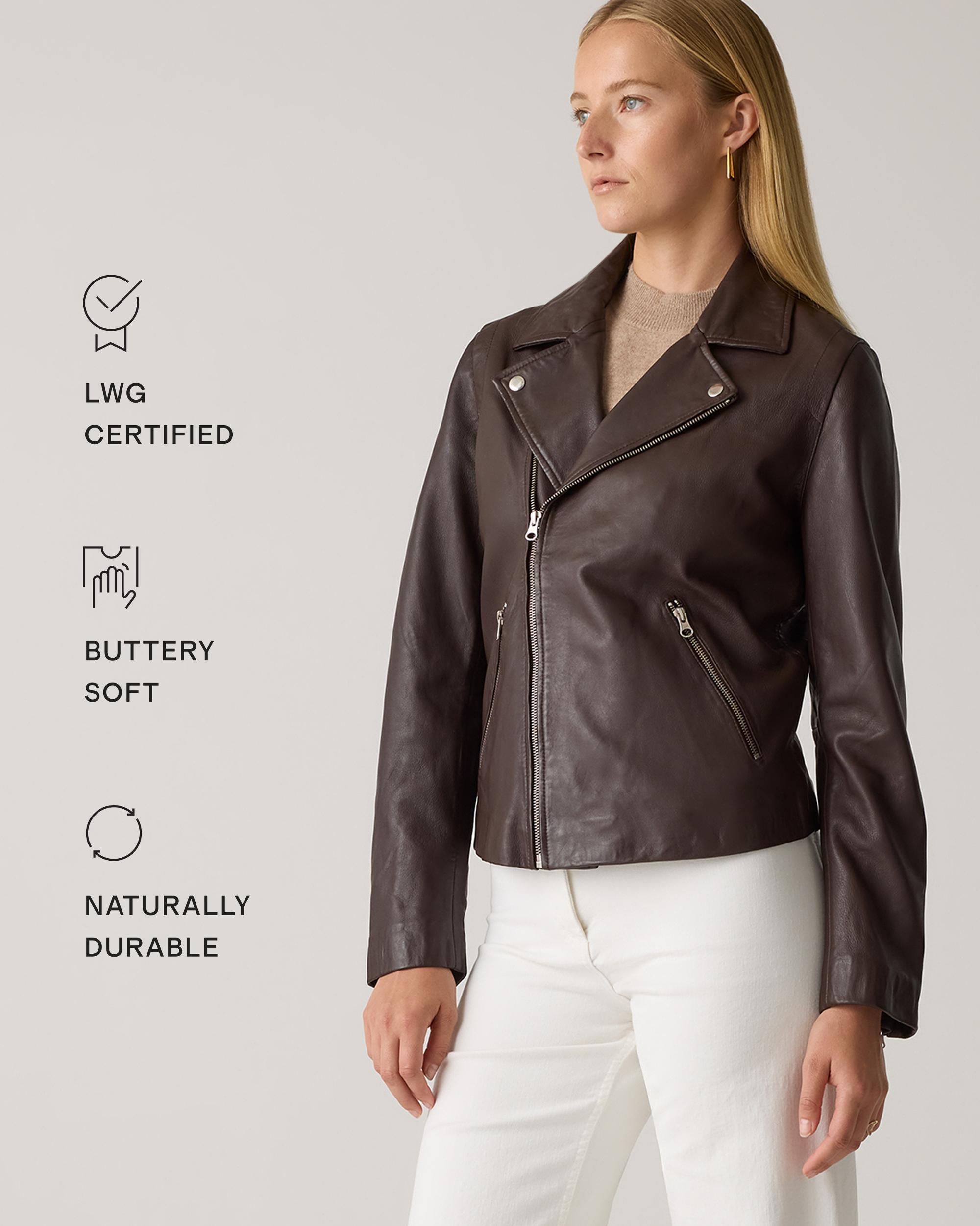 Biker chic incoming. Exquisitely crafted in buttery-soft, 100% top grain leather, our washed detailing gives this classic motorcycle jacket the perfectly broken-in, vintage look. Silver hardware, like our robust zip details on the sleeves and pockets, and snap button lapels give this jacket a stylish edge. It's a timeless investment piece (minus the investment). Read more about what makes our leather special in our Leather 101 guide. Also offered in sizes 1X - 3X. | Quince | Women's 100% Washed Leather Biker Jacket in Brown, Size Medium
