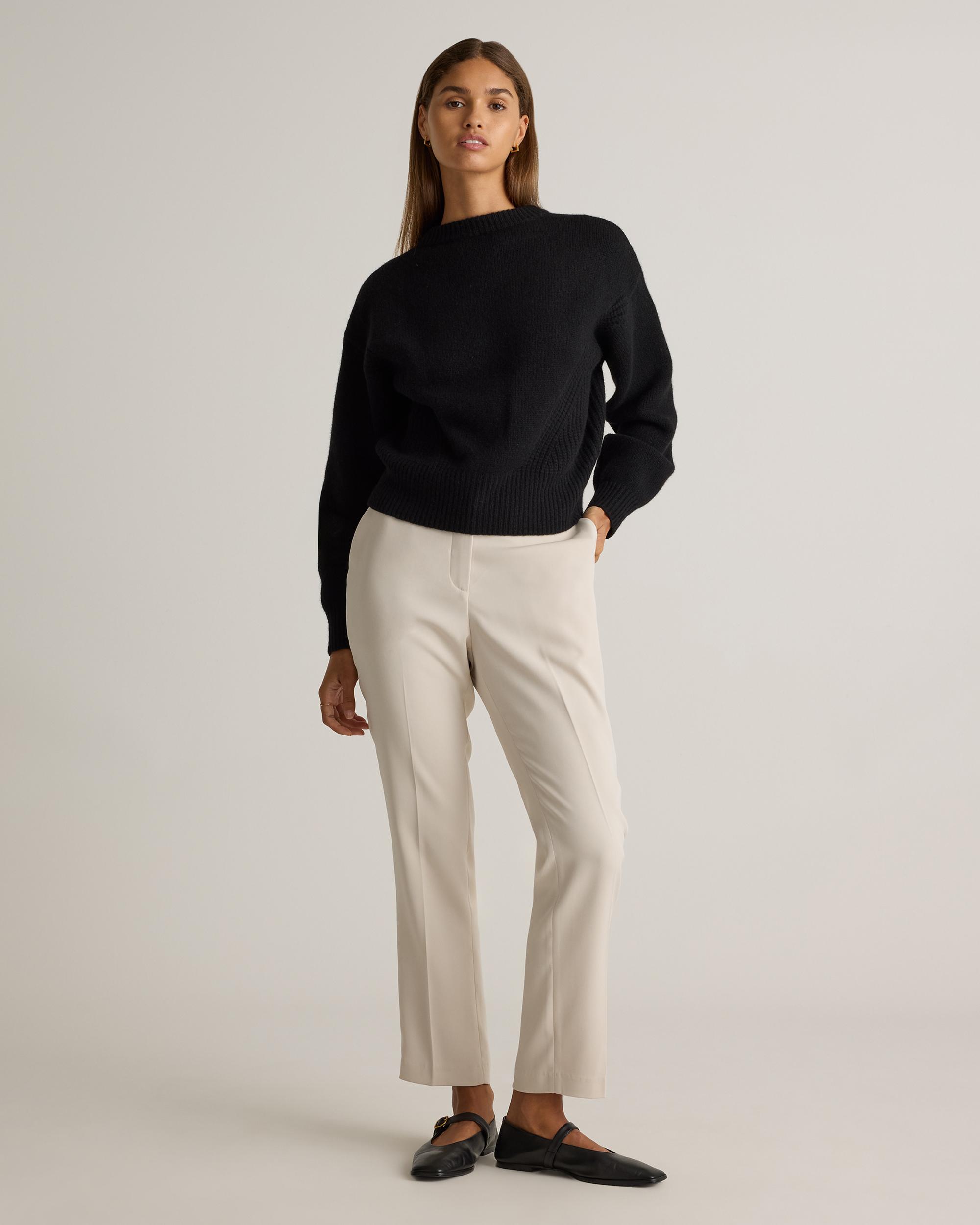 100% Yak Wool Pointelle Detail Relaxed Crew – a luxurious knit crafted for both comfort and elegance. The subtle openwork pattern enhances breathability while offering a feminine, stylish accent. Perfect for layering or wearing on its own, this piece transitions seamlessly from day to night. Yak wool is warmer yet more breathable than cashmere, with naturally thermoregulating and moisture-wicking properties to keep you comfortable without overheating. | Quince | Women's 100% Yak Wool Pointelle Detail Relaxed Crew Neck Alpaca Sweater in Black, Size XS