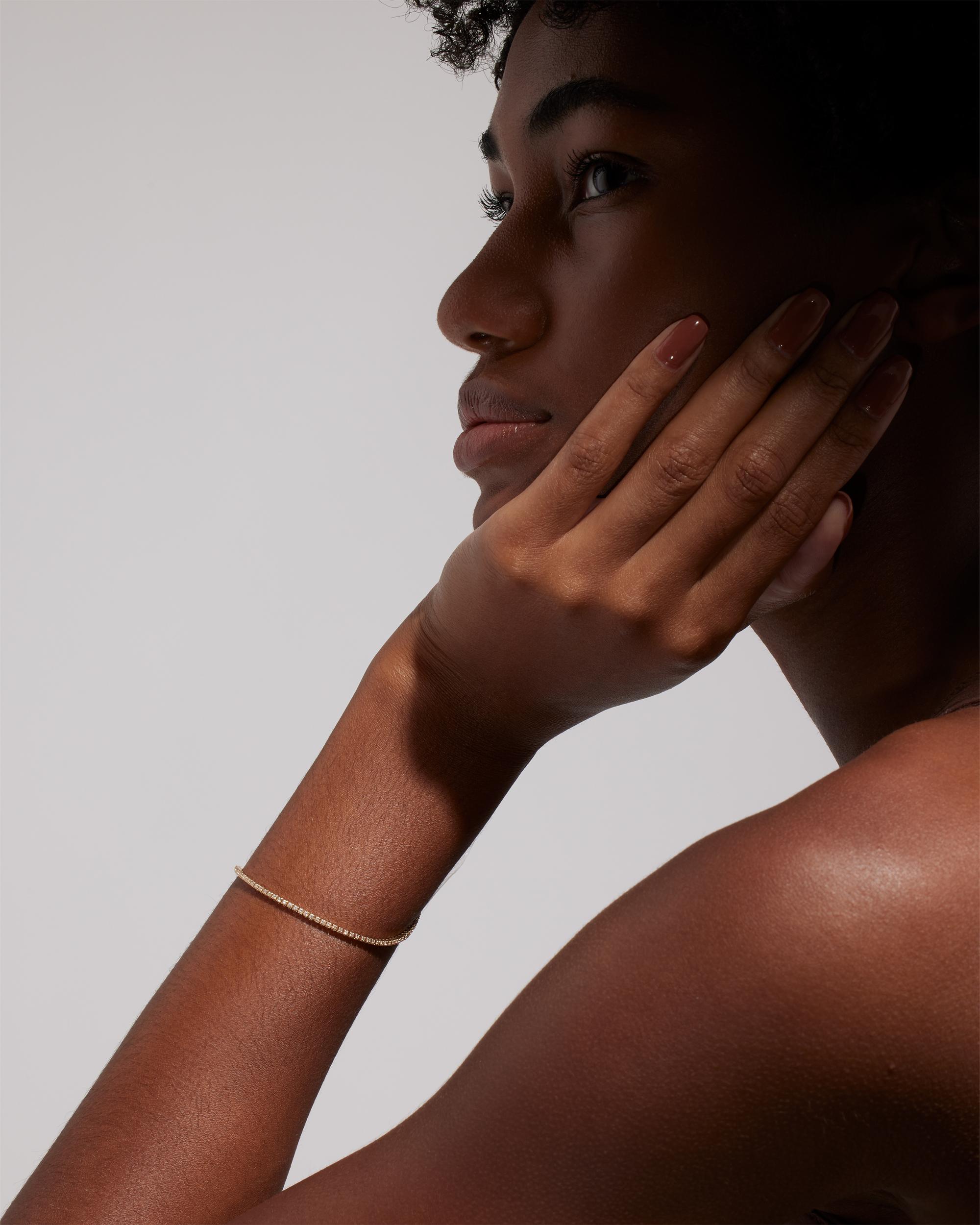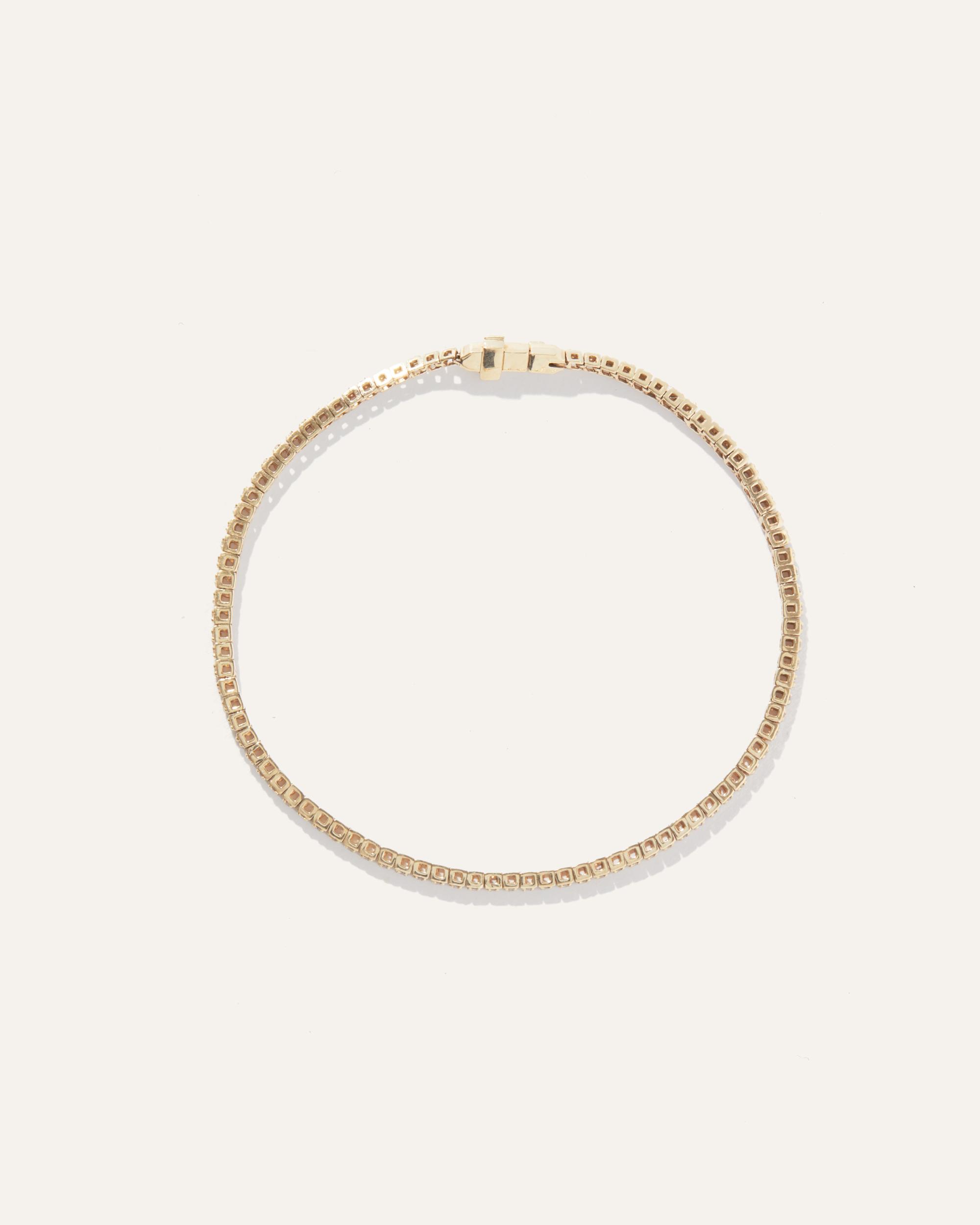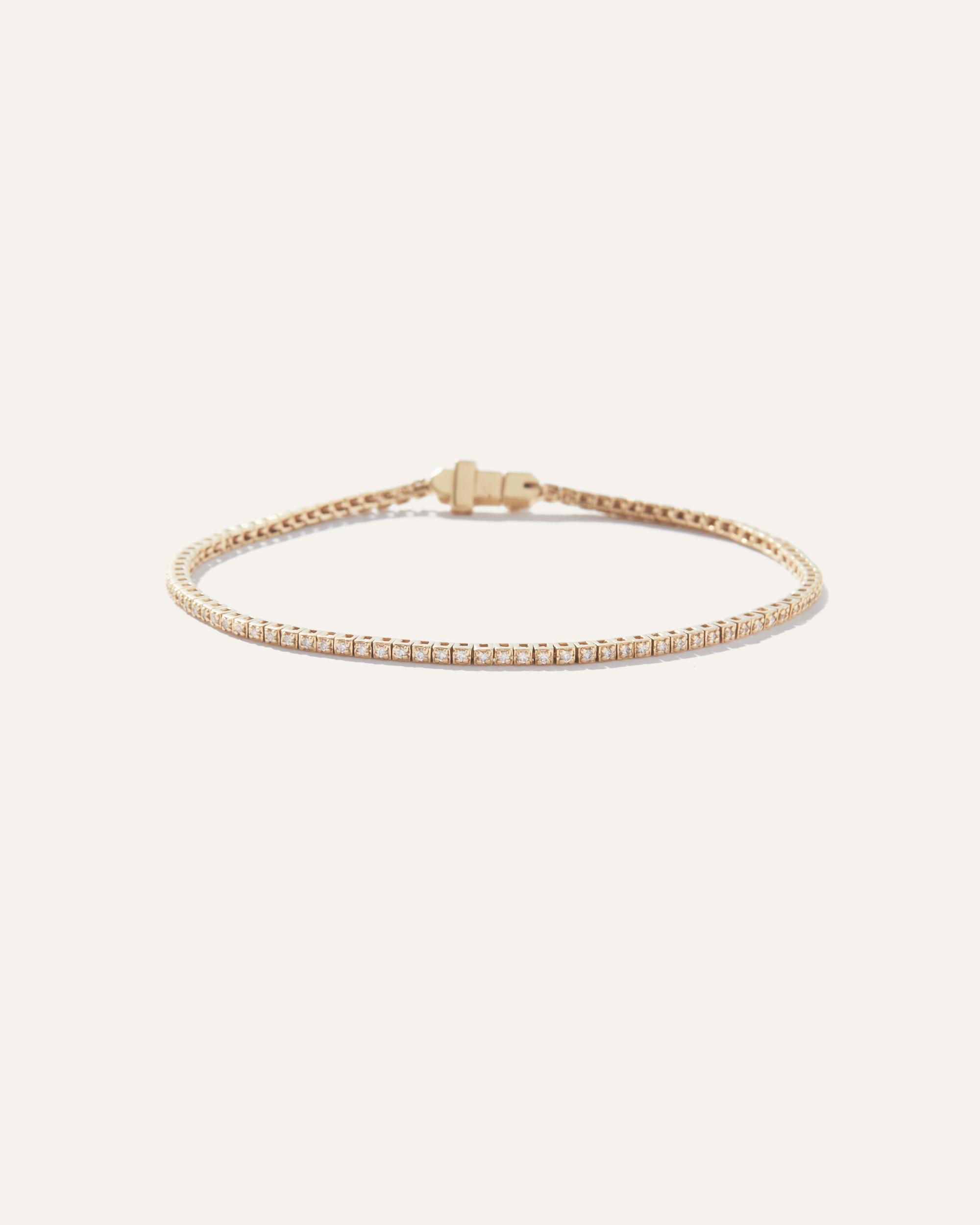 Crafted with care and precision, this delicate tennis bracelet design is sure to complement any outfit or occasion. The secure clasp with discreet gold button ensures that the bracelet stays on with style, providing peace of mind and allowing you to wear it with confidence. Style solo for a minimalist aesthetic or layer up with other bracelets for the perfect stack. | Quince | Women's 14K Gold Diamond Tennis Bracelet in Yellow Gold, Size 6.5"