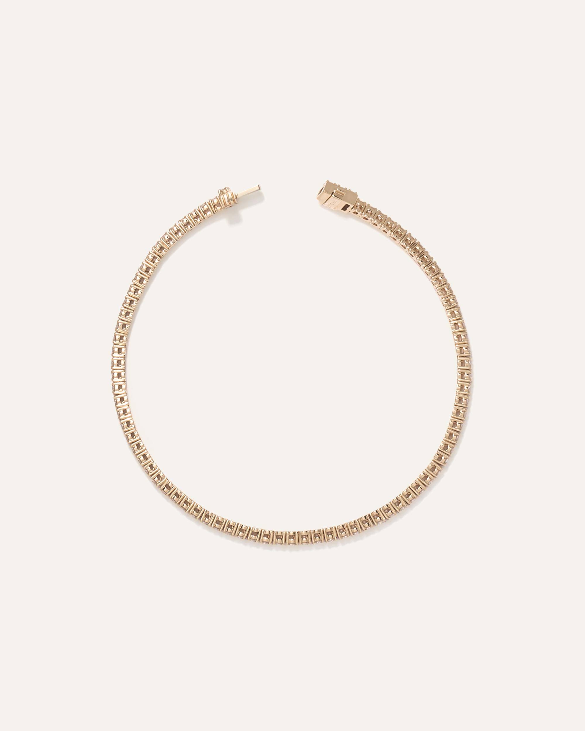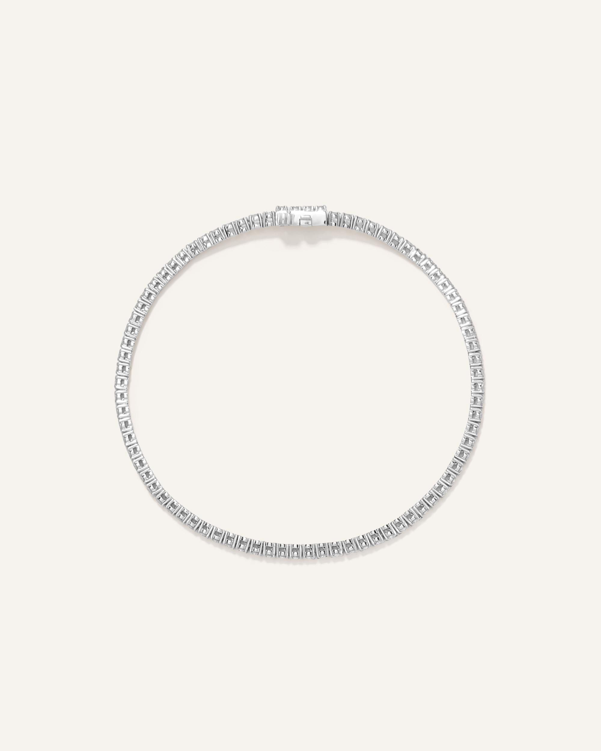 Elevate your everyday elegance with our stunning lab grown diamond tennis bracelet, featuring a classic 4-prong design that showcases each stone's brilliance. Available in two lengths and five different total carat weight options, this bracelet allows you to customize your perfect fit and desired level of sparkle. The secure box clasp with safety closure ensures your precious piece stays firmly in place, making it ideal for daily wear without worry. | Quince | Women's 14K Gold Lab Grown Diamond Tennis Bracelet in White Gold, Size 8"